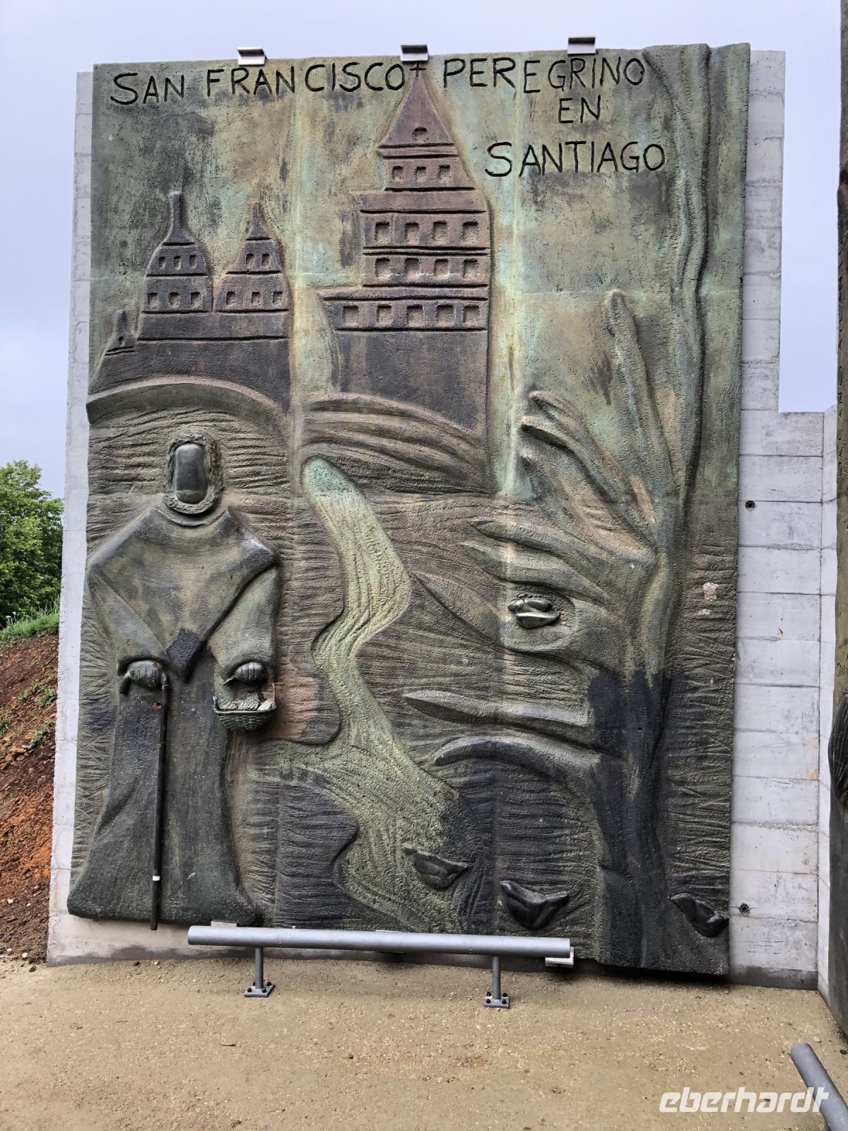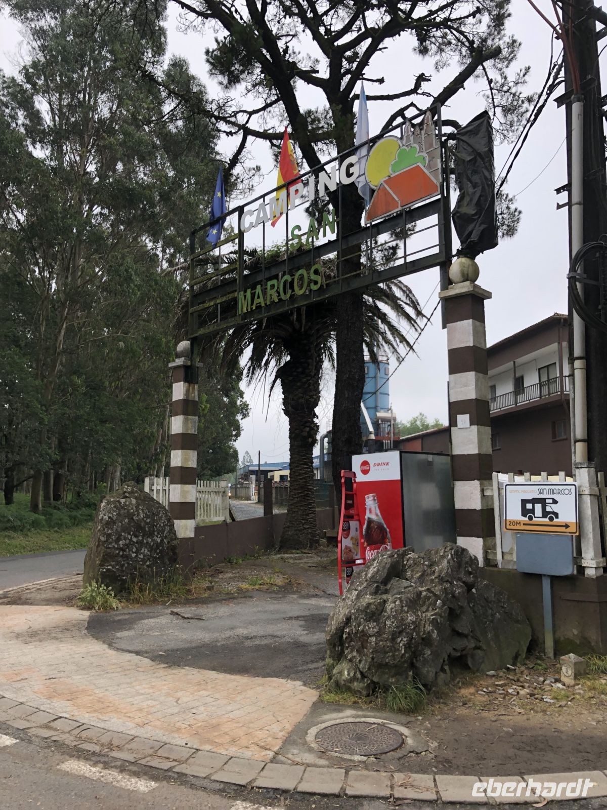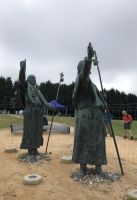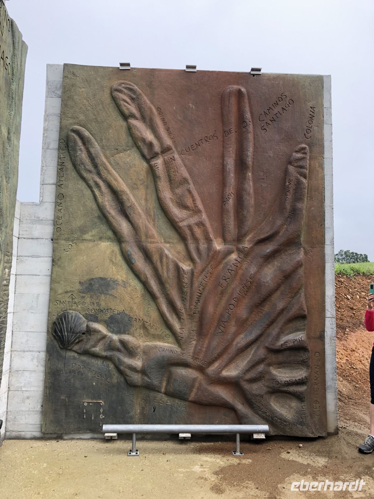 Dem Körper gönnten wir auch heut keine Pause. Wieder mit den Wanderschuhen ausgerüstet, fuhren wir bis zum Campingplatz in San Marco einige Kilometer vor dem Berg der Freude, dem Monte do Gozo von wo wir die letzte, jedoch kurze Etappe nach Santiago de Compostela laufen wollten. Nur der Berg der Freude rüstete sich an diesem Tag für andere Freuden. Ein Musikfestival wurde vorbereitet, alles zugestellt mit Gerüsten, Containern und mietbaren Zelten. Selbst das Monument des Pilgers blieb nicht verschont und wurde eingerüstet. Einen kurzen Moment verharrten die Arbeiter, gaben uns einen Augenblick, um zu fotografiern und schon verschwand alles hinter Bauzäunen. Wir zogen uns an einen ruhigen Ort zurück, und Sabine zauberte Jakobsmuscheln aus ihrem Rucksack, die ein jeder als Zeichen des Pilgers erhielt. Mit Gesang und unserem Innehalten schien die Zeit für einen Moment still zu stehen.
