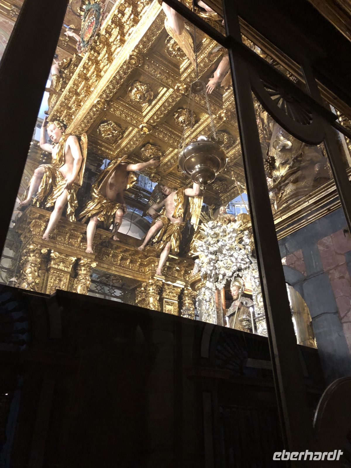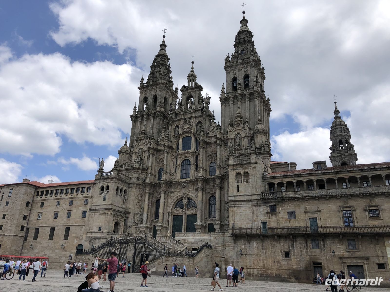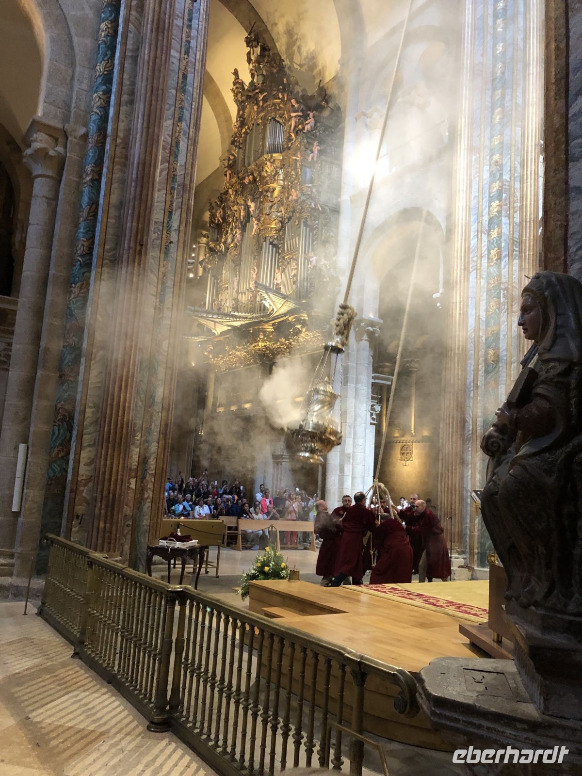 Über den Plaza Obradoiro flitzten wir in Eile, nur einen kurzen Blick auf die Obradoiro-Fassade der Kathedrale werfend. Wir schafften es gerade noch pünktlich zur 12 Uhr Messe. Und dann hörten wir den Anfang der Messe und eine Danksagung an Pilger aus Florida. Das bedeutete wohl Glück, oder? So gern hätten wir den Botafumeiro durch das Querschiff schwingen sehen. Würde es heute klappen? Früher konnte man den Botafumeiro der Kathedrale von Santiago fast jeden Tag in Betrieb sehen. Allerdings zeigten Restaurationsarbeiten im Jahr 2006, den Verschleiß des Seils und des Weihrauchfasses und der tägliche Gebrauch des riesigen Pendels wurde beträchtlich eingeschränkt. Somit wird der große Weihrauchkessel nur an 12 wichtigen Kirchentagen in Betrieb genommen oder … wenn jemand bezahlt... Und welch eine Freude – am Schluss der Messe zogen 8 Kirchenmänner bedächtig und kraftvoll an dem Seil, welches den Botafumeiro mit 65 km/h hin und her schwenken lies.