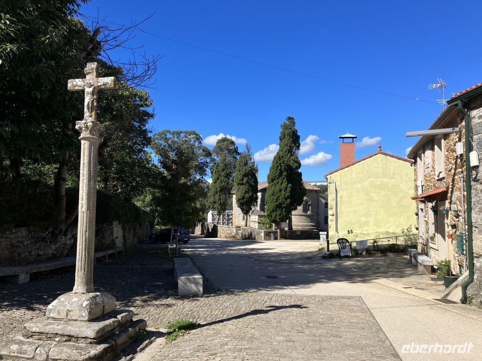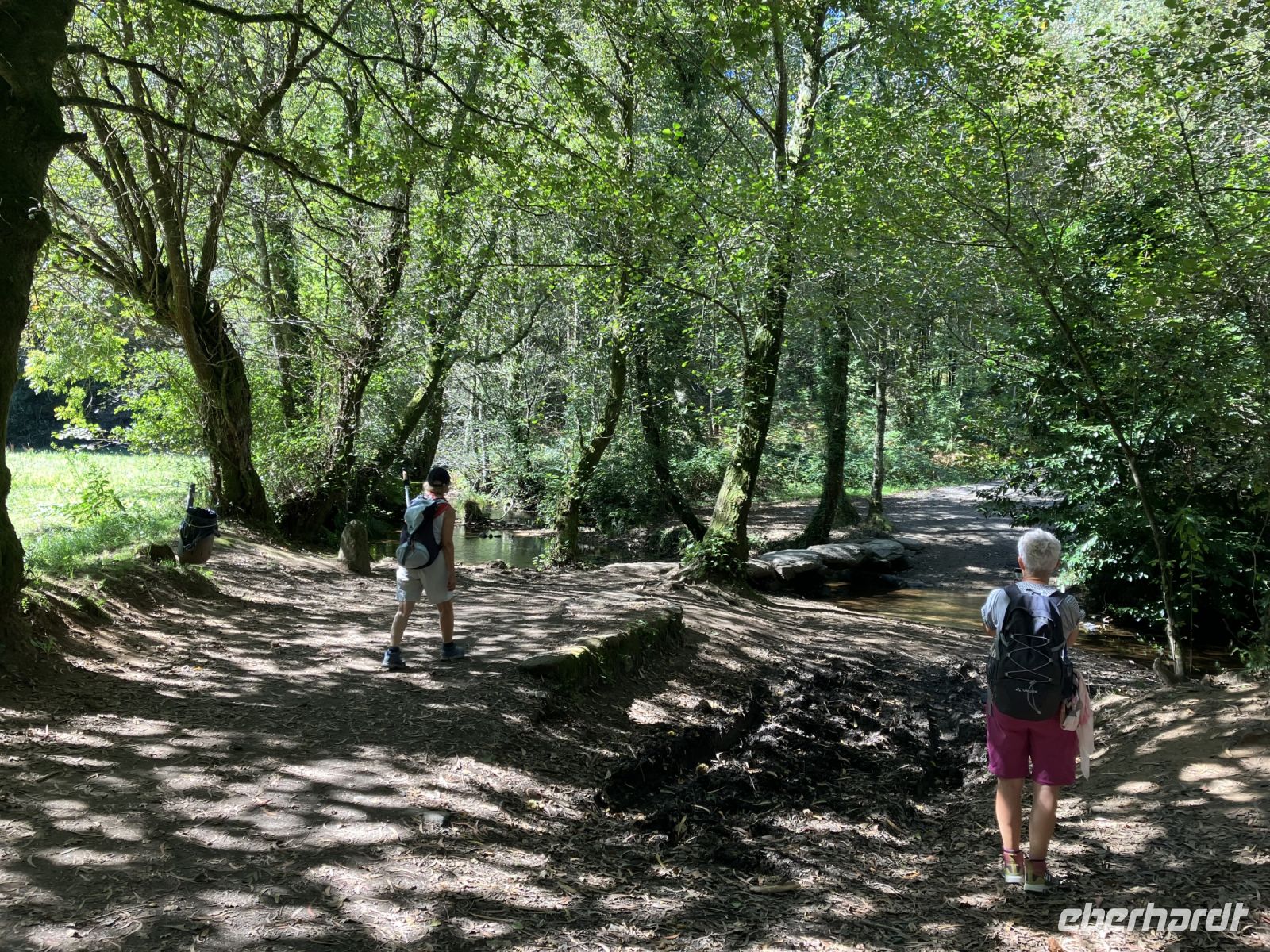 Doch nun fehlten noch 14 km Weg, die gegangen werden wollten. Über römische Brücken, durch schattige Wälder, an Flüsschen entlang, spürte so Mancher den Charme des Pilgerns. Die tolle Eberhardt-Wandergruppe, die sich hier gefunden hatte, trug sicherlich noch dazu bei. Im Ort Boente fotografierten manche den Brunnen mit vier Ausflussrohren und das Wegkreuz in der Nähe der Kirche. Von hier aus gelangten wir über eine Brücke, die den Fluss Iso überspannt nach Ribadiso. Dort befindet sich eine der schönsten Pilgerherberge auf dem Camino Francés. Wir sorgten für eine andere erfrischende Abwechslung bevor wir den letzten Anstieg nach Arzúa in Angriff nahmen – wir kehrten ein. Doch abgeholt wurden wir von dort leider nicht, deshalb huckelten wir die Rucksäcke auf und der alte Pilgerweg führte uns über die Landstraße bis zum Städtchen Arzúa – Ultreia!