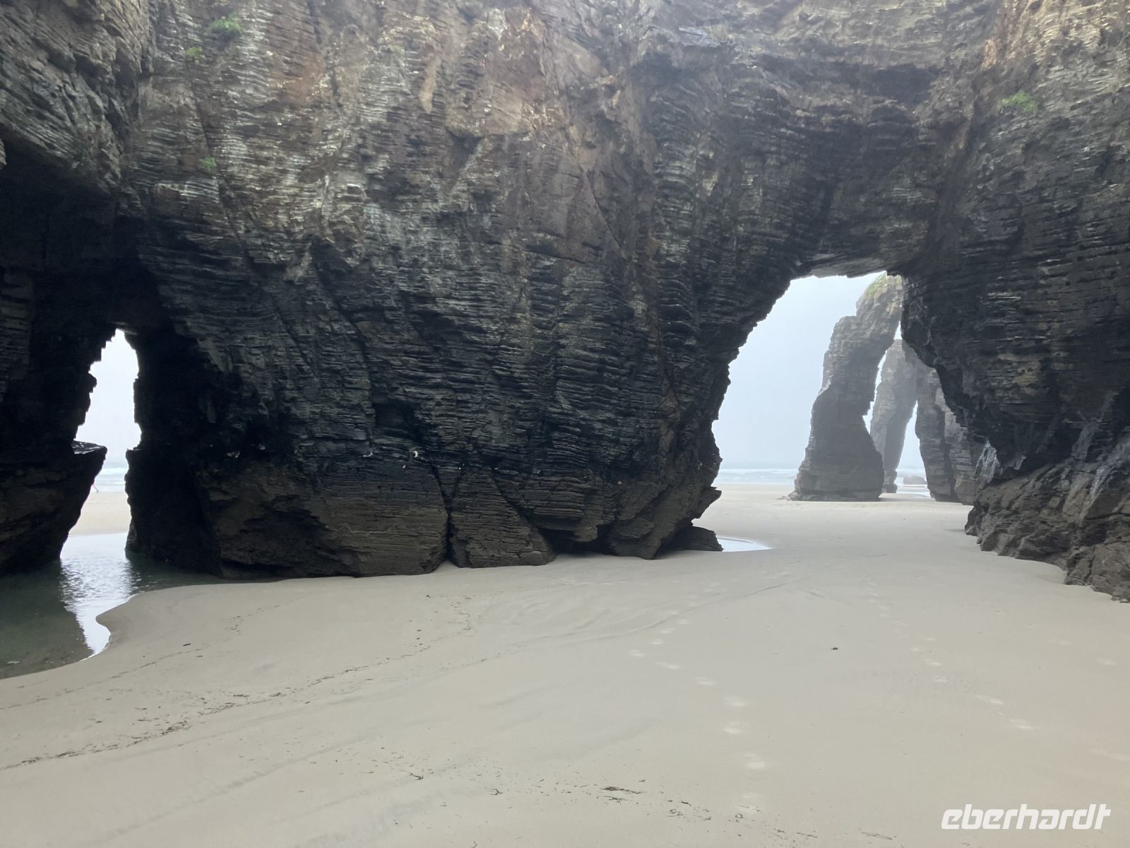 Nach einem spanischen, eher spartanischen Frühstück erreichten wir bei Nieselregen Ribadeo und den Kathedralenstrand. Die volle Schönheit dieses Strandes kann man nur bei Ebbe sehen. Der tiefste Punkt der Tide war noch nicht erreicht, doch die Felsformationen lagen einsam auf uns wartend vor uns. Die Praia das Catedrais; was für ein Strand – und heute nur für uns allein! Was für eine Seltenheit. An diesem Naturdenkmal mit übernatürlichen Dimensionen tummeln sich sonst täglich bei Ebbe hunderte Touristen. Manche zogen die Schuhe aus, liefen durch den Sand, kletterten über kleine Felsformationen und trotz der Regentropfen fühlte sich der ein oder andere ein bisschen wie im Paradies! Da tauchten 30 Meter hohe Pfeiler vor uns auf, Meereshöhlen luden den Abenteurer in uns zum Besuch ein. Für eine Weile befanden wir uns in einer Kathedrale des Ozeans.