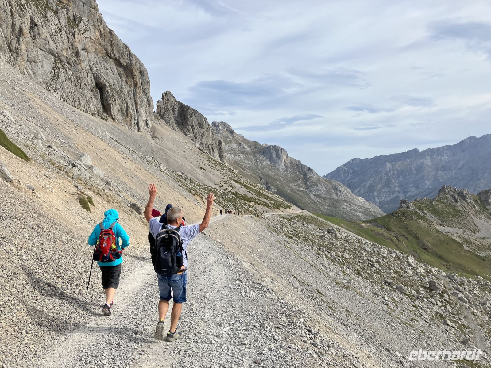 Nach einem stärkenden Frühstück verließen wir unser Hotel in Potes, um tiefer und höher in die Picos de Europa einzutauchen. Das erste Ziel war die Seilbahn in Fuente Dé, die uns in weniger als 4 Minuten in eine schwindelerregende Höhe von 1823 Meter mitten hinein ins Herz der Picos de Europa befördern sollte. Leider standen wir mit vielen Wanderfreunden in der Warteschlange, ohne das sich auch nur eine Seilbahnkabine bewegte. Was war nur passiert? Vom Personal erfuhren wir endlich, dass am heutigen Tag sehr starke Windböen durch die Berge der Picos de Europa bliesen, die genau beobachtet werden müssten. Kurz vor der Gipfelstation schwankte unsere Kabine so, dass wir dem Bodenpersonal für ihre Vorsicht sehr dankbar waren. Doch anschließend wurden wir mit einem grandiosen Ausblick auf den Peña Vieja im Macizo Central belohnt.