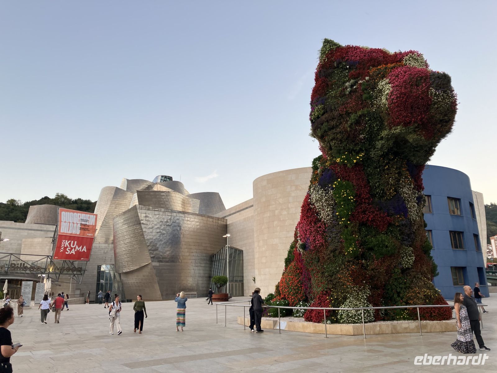 An der Küstenstrasse entlang fuhren wir wieder Richtung Bilbao. Am Abend statteten wir natürlich auch noch Puppy, dem beliebten West-Highland-Terrier einen Besuch ab: Dieser von Jeff Koons geschaffene riesige blumenübersäte Hundewelpe aus (oder auf) einer Stahlkonstruktion wurde 1997 vom Guggenheim-Museums Bilbao erworben und erhielt rechtzeitig zur Eröffnung des Museums, einen festen Platz vor dem Museumsgebäude. Anschließend noch ein kleiner Rundgang rund um das spektakuläre Bauwerk. Von unserem Ausgangspunkt aus gelangten wir über eine breite Treppe zum Nervión-Fluss, wo das Museum eigentlich steht. Frank Gehry, der Architekt, schuf ein spektakuläres Bauwerk, um das wir teilweise herumgingen und die verschiedenen Perspektiven und Materialen bewunderten.