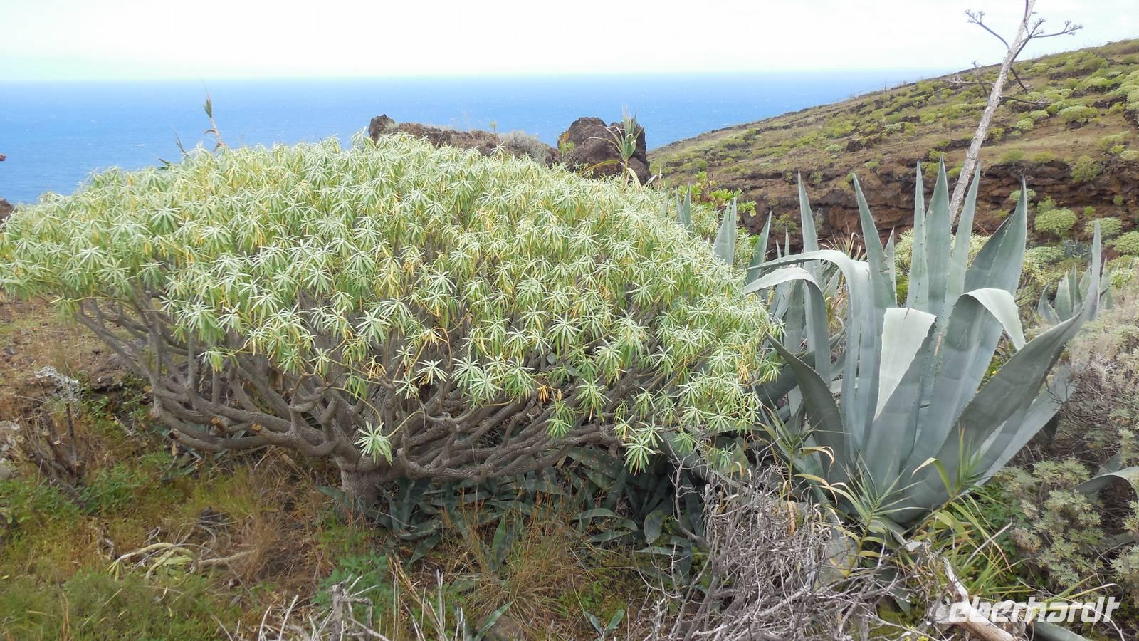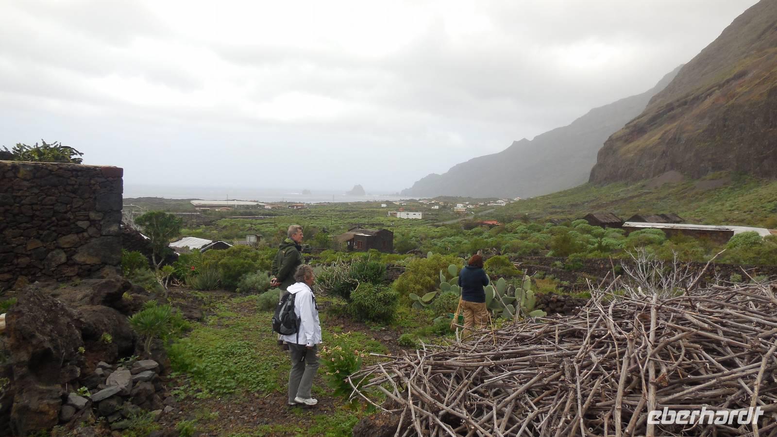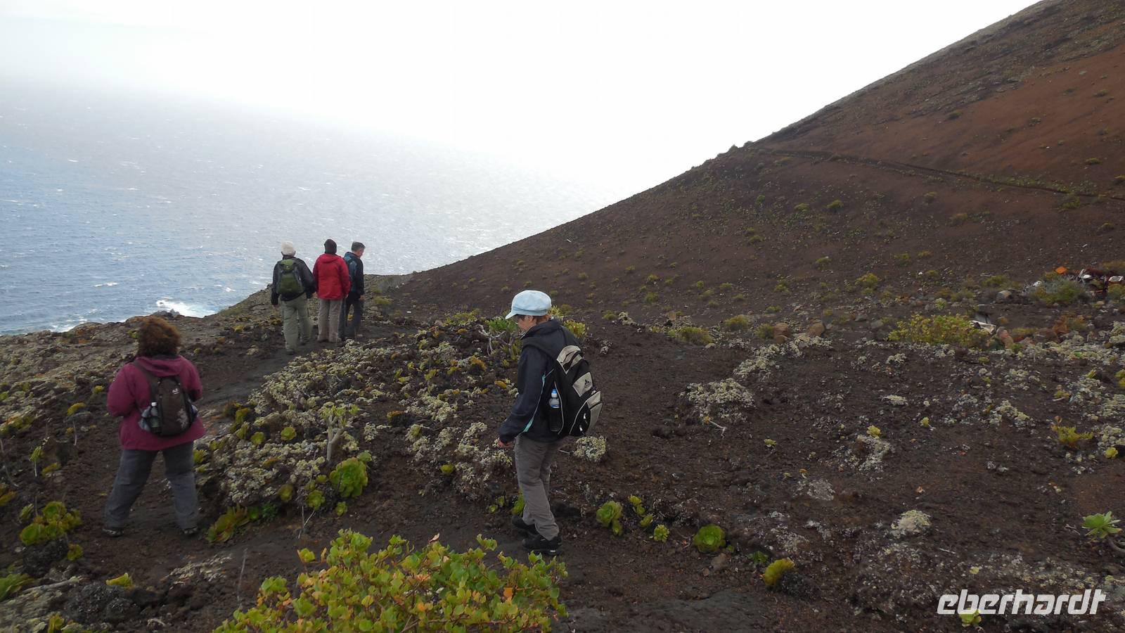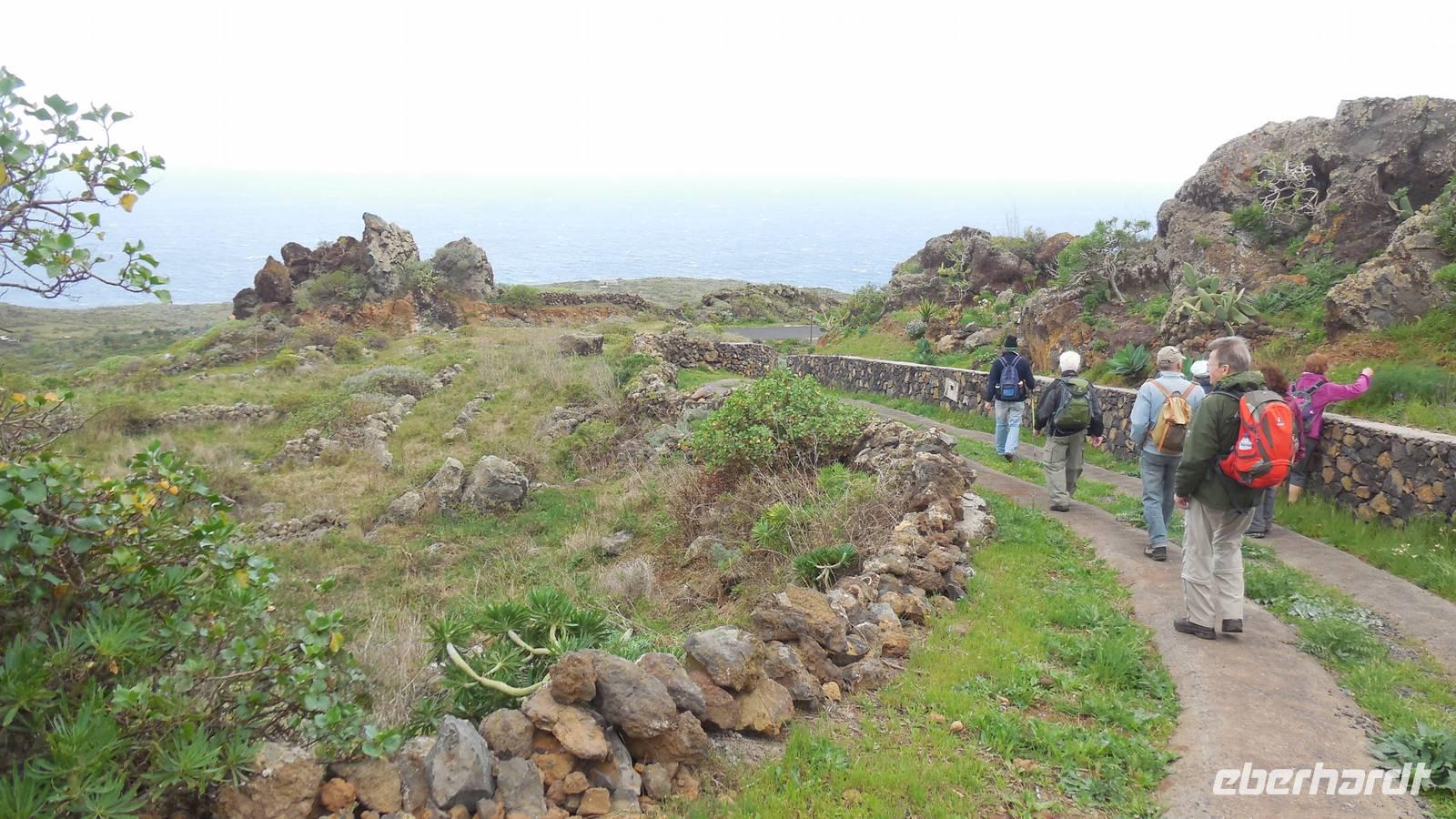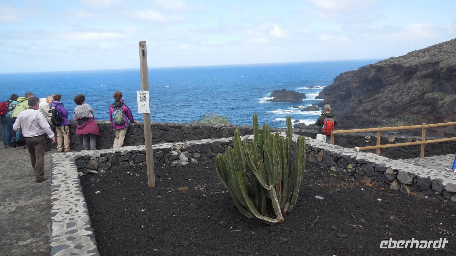 Nach einem leckeren Frühstück starten wir heute etwas später gen Küste, denn wir wollen ins Tal bis an die Badestelle bei La Caleta wandern. Heute gibt es außnahmsweise mal keinen dichten Nebel, dafür aber einen ziemlich starken Wind. Unser Weg führt uns zunächst ins idyllische Dörfchen Echedo, welches aufgrund seiner günstigen Lage und seiner fruchtbaren Erde bei Einsiedlern besonders beliebt ist. Nach einer kleinen Rast auf dem Dorfplatz an der Dorfkirche, an dem auch die Dorffeste stattfinden, geht es weiter durch die Weinterrassen in das Lavagebiet. Viele verlassene Häuschen stehen hier. Diese wurden oft von früheren Einwohnern, welche nach Venezuela ausgewandert sind, zurückgelassen. Außer Wein und Steinrosen gedeiht hier auf dem Lavagestein nicht viel. Immer tiefer kommen wir in das Lavagebiet und bald besteht unser Weg noch aus Geröll und schönen grünen Steinrosen. Wir finden hübsche Lavasteine, mitunter blau-lila-rot gefärbt. Gut aufpassen müssen wir hier, denn als wir den Bergkamm entlang gehen, gähnt links neben uns sogleich der Abgrund. El Hierro ist eine sehr steile Insel, wie wir heute deutlich bemerken. Wir haben die ganze Zeit das blaue Meer im Blick, zwischendurch sehen wir von weiten sogar die Spitze des Teide über den Wolken. Eine Mittagsrast legen wir an der Wegkreuzung zwischen Malpaso, Valverde, Echedo und Valverde ein. Hier haben wir einen tollen Blick auf das untenliegende Dörfchen Tamaduste und den Flughafen von El Hierro. Wir verschnaufen eine Weile und lassen die Aussicht auf uns wirken. Dann geht es weiter hinunter ins Tal, vorbei oberhalb von Tamaguste am Berg entlang nach La Caleta. Reiseleiter Ralf zeigt uns interessante Gewächse, wie die Wolfsmilchbäume. Merkwürdigerweise finden wir auf dieser Strecke, hoch oben auch Muscheln und große Schneckengehäuse.