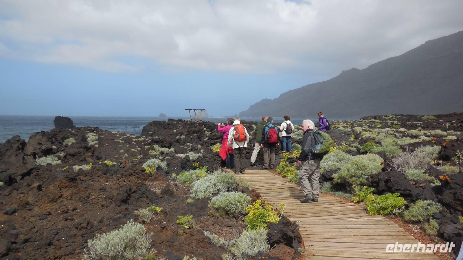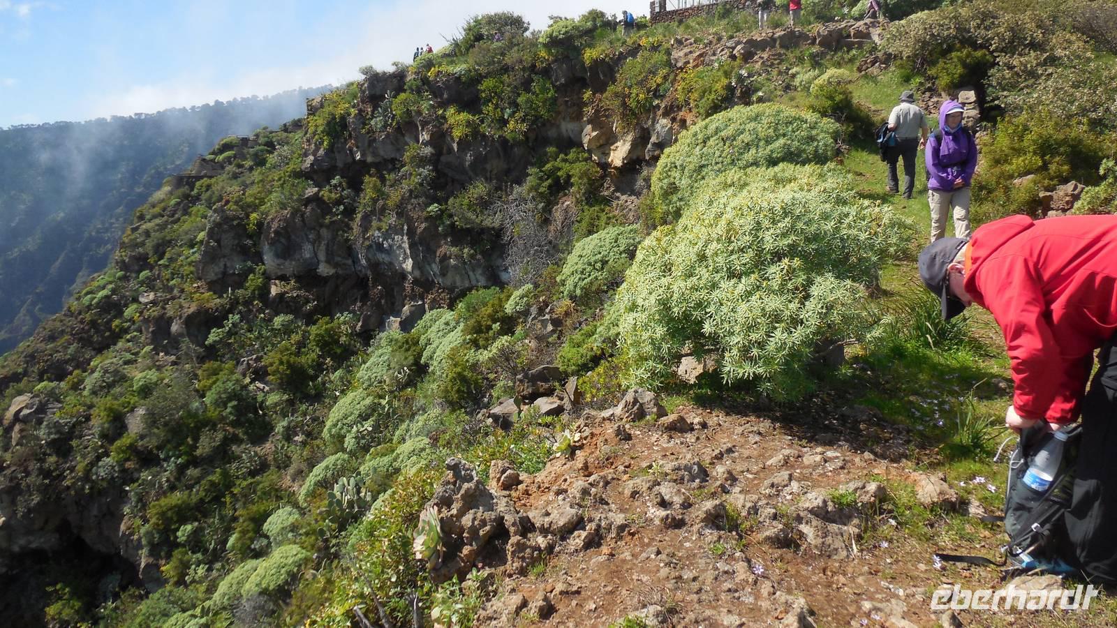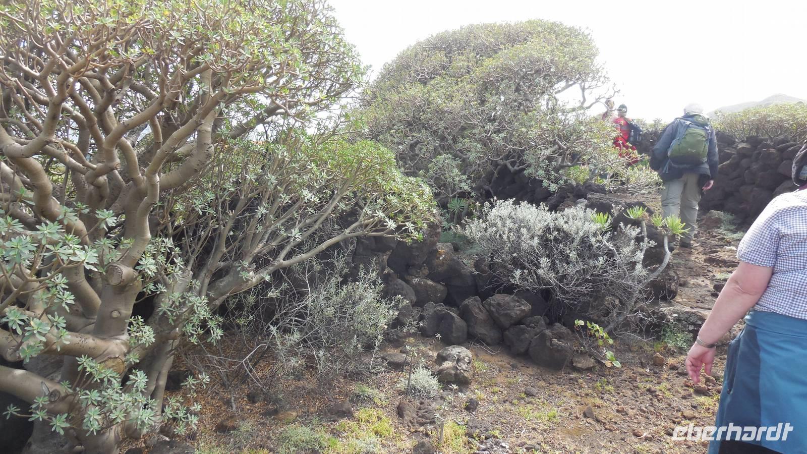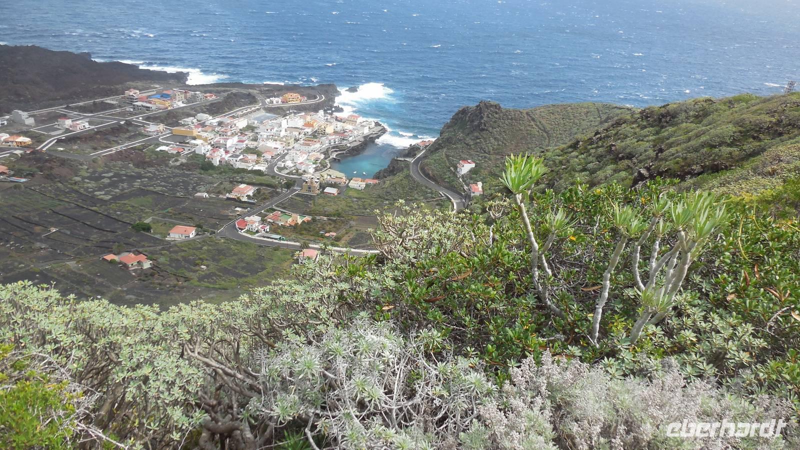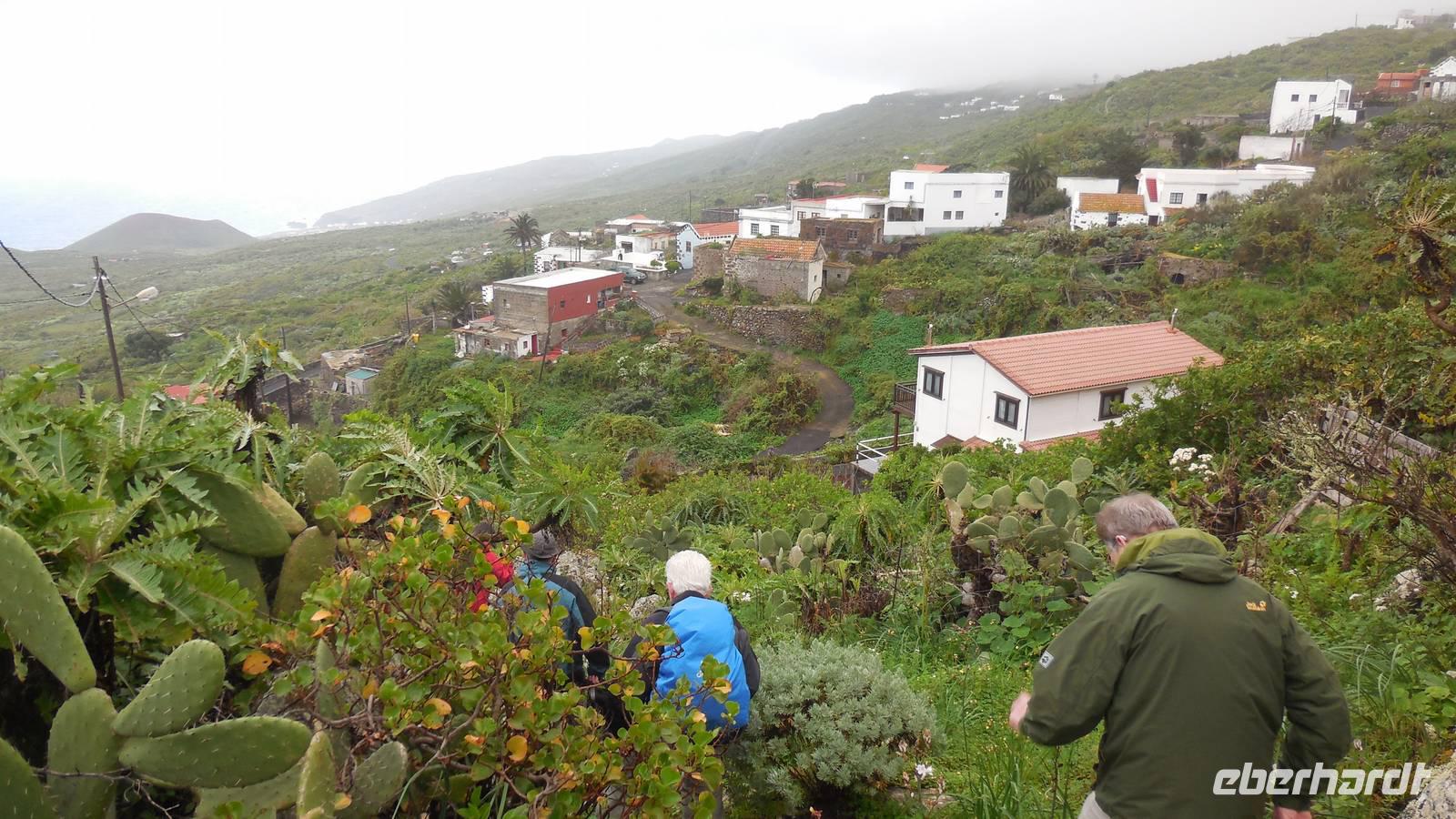 Nach einem leckeren Frühstück starten wir heute etwas später gen Küste, denn wir wollen ins Tal bis an die Badestelle bei La Caleta wandern. Heute gibt es außnahmsweise mal keinen dichten Nebel, dafür aber einen ziemlich starken Wind. Unser Weg führt uns zunächst ins idyllische Dörfchen Echedo, welches aufgrund seiner günstigen Lage und seiner fruchtbaren Erde bei Einsiedlern besonders beliebt ist. Nach einer kleinen Rast auf dem Dorfplatz an der Dorfkirche, an dem auch die Dorffeste stattfinden, geht es weiter durch die Weinterrassen in das Lavagebiet. Viele verlassene Häuschen stehen hier. Diese wurden oft von früheren Einwohnern, welche nach Venezuela ausgewandert sind, zurückgelassen. Außer Wein und Steinrosen gedeiht hier auf dem Lavagestein nicht viel. Immer tiefer kommen wir in das Lavagebiet und bald besteht unser Weg noch aus Geröll und schönen grünen Steinrosen. Wir finden hübsche Lavasteine, mitunter blau-lila-rot gefärbt. Gut aufpassen müssen wir hier, denn als wir den Bergkamm entlang gehen, gähnt links neben uns sogleich der Abgrund. El Hierro ist eine sehr steile Insel, wie wir heute deutlich bemerken. Wir haben die ganze Zeit das blaue Meer im Blick, zwischendurch sehen wir von weiten sogar die Spitze des Teide über den Wolken. Eine Mittagsrast legen wir an der Wegkreuzung zwischen Malpaso, Valverde, Echedo und Valverde ein. Hier haben wir einen tollen Blick auf das untenliegende Dörfchen Tamaduste und den Flughafen von El Hierro. Wir verschnaufen eine Weile und lassen die Aussicht auf uns wirken. Dann geht es weiter hinunter ins Tal, vorbei oberhalb von Tamaguste am Berg entlang nach La Caleta. Reiseleiter Ralf zeigt uns interessante Gewächse, wie die Wolfsmilchbäume. Merkwürdigerweise finden wir auf dieser Strecke, hoch oben auch Muscheln und große Schneckengehäuse.