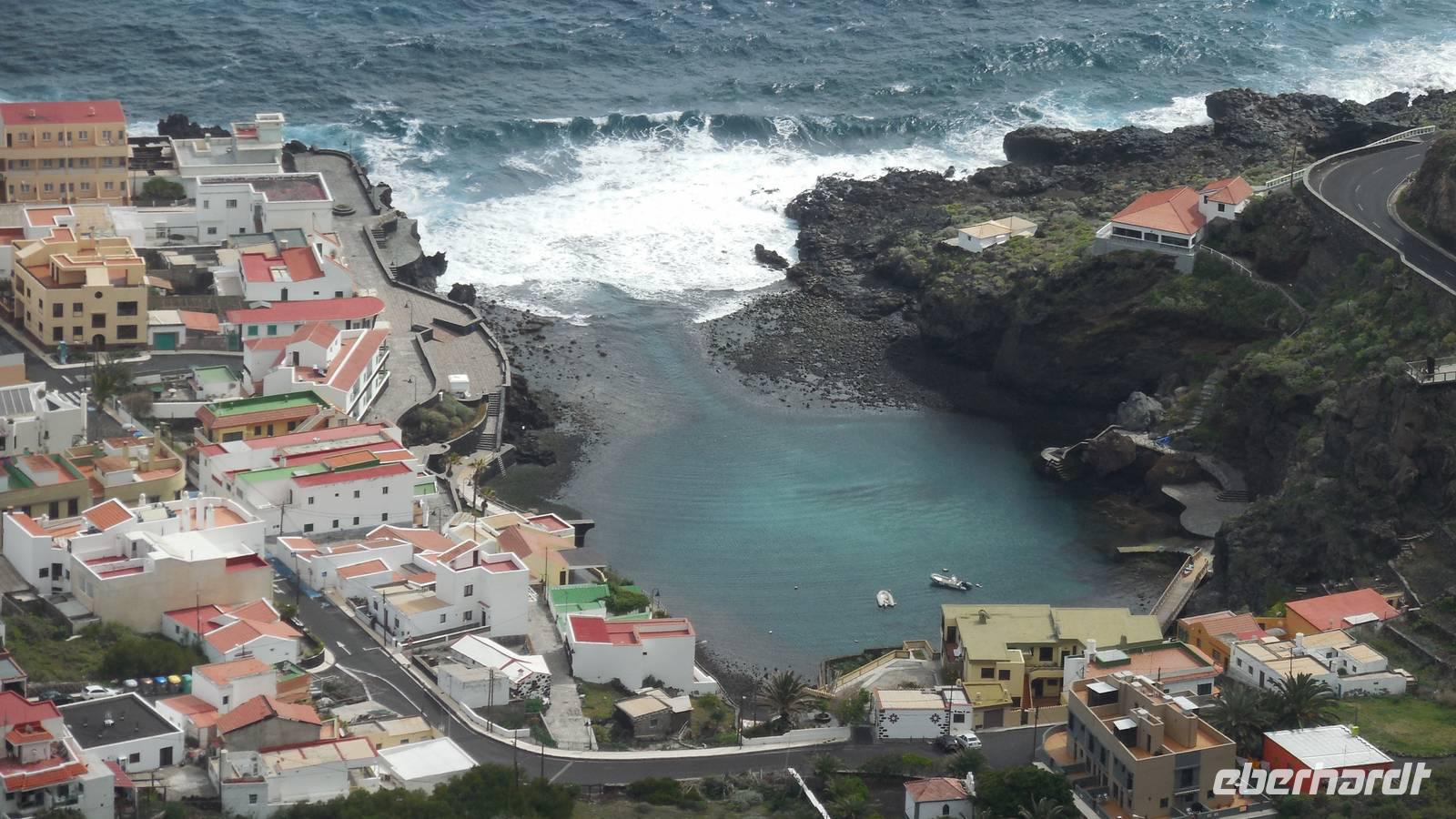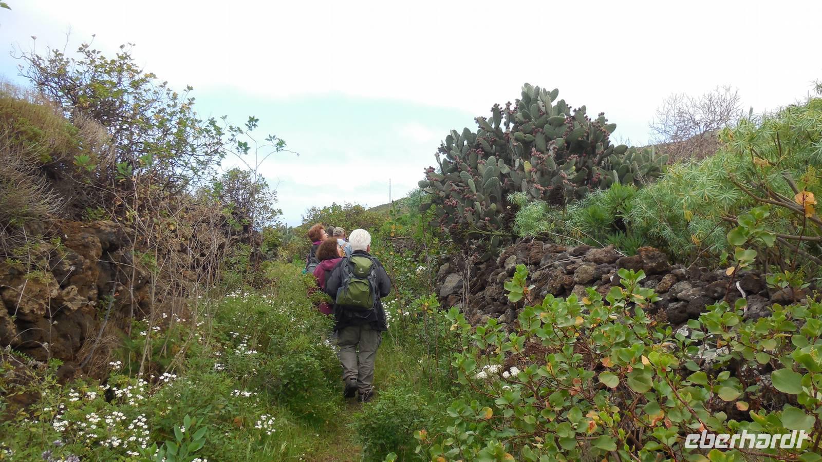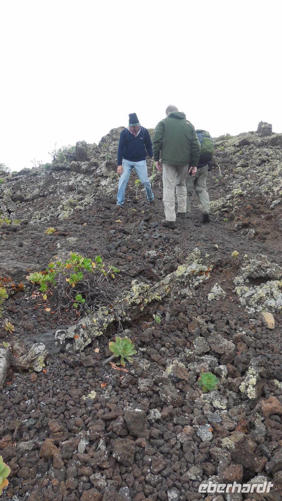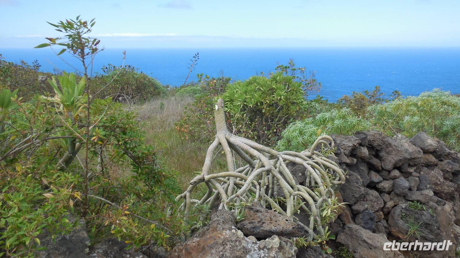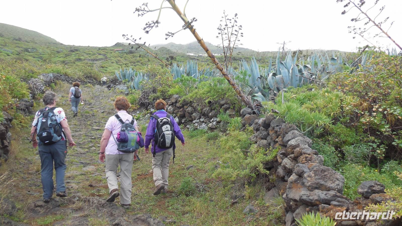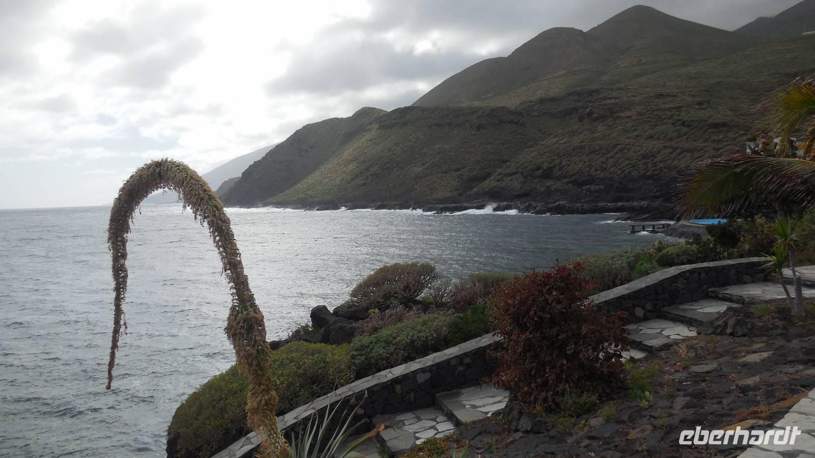 Nach einem leckeren Frühstück starten wir heute etwas später gen Küste, denn wir wollen ins Tal bis an die Badestelle bei La Caleta wandern. Heute gibt es außnahmsweise mal keinen dichten Nebel, dafür aber einen ziemlich starken Wind. Unser Weg führt uns zunächst ins idyllische Dörfchen Echedo, welches aufgrund seiner günstigen Lage und seiner fruchtbaren Erde bei Einsiedlern besonders beliebt ist. Nach einer kleinen Rast auf dem Dorfplatz an der Dorfkirche, an dem auch die Dorffeste stattfinden, geht es weiter durch die Weinterrassen in das Lavagebiet. Viele verlassene Häuschen stehen hier. Diese wurden oft von früheren Einwohnern, welche nach Venezuela ausgewandert sind, zurückgelassen. Außer Wein und Steinrosen gedeiht hier auf dem Lavagestein nicht viel. Immer tiefer kommen wir in das Lavagebiet und bald besteht unser Weg noch aus Geröll und schönen grünen Steinrosen. Wir finden hübsche Lavasteine, mitunter blau-lila-rot gefärbt. Gut aufpassen müssen wir hier, denn als wir den Bergkamm entlang gehen, gähnt links neben uns sogleich der Abgrund. El Hierro ist eine sehr steile Insel, wie wir heute deutlich bemerken. Wir haben die ganze Zeit das blaue Meer im Blick, zwischendurch sehen wir von weiten sogar die Spitze des Teide über den Wolken. Eine Mittagsrast legen wir an der Wegkreuzung zwischen Malpaso, Valverde, Echedo und Valverde ein. Hier haben wir einen tollen Blick auf das untenliegende Dörfchen Tamaduste und den Flughafen von El Hierro. Wir verschnaufen eine Weile und lassen die Aussicht auf uns wirken. Dann geht es weiter hinunter ins Tal, vorbei oberhalb von Tamaguste am Berg entlang nach La Caleta. Reiseleiter Ralf zeigt uns interessante Gewächse, wie die Wolfsmilchbäume. Merkwürdigerweise finden wir auf dieser Strecke, hoch oben auch Muscheln und große Schneckengehäuse.