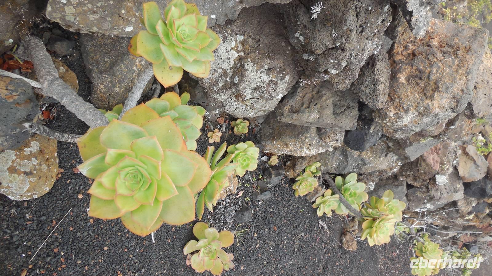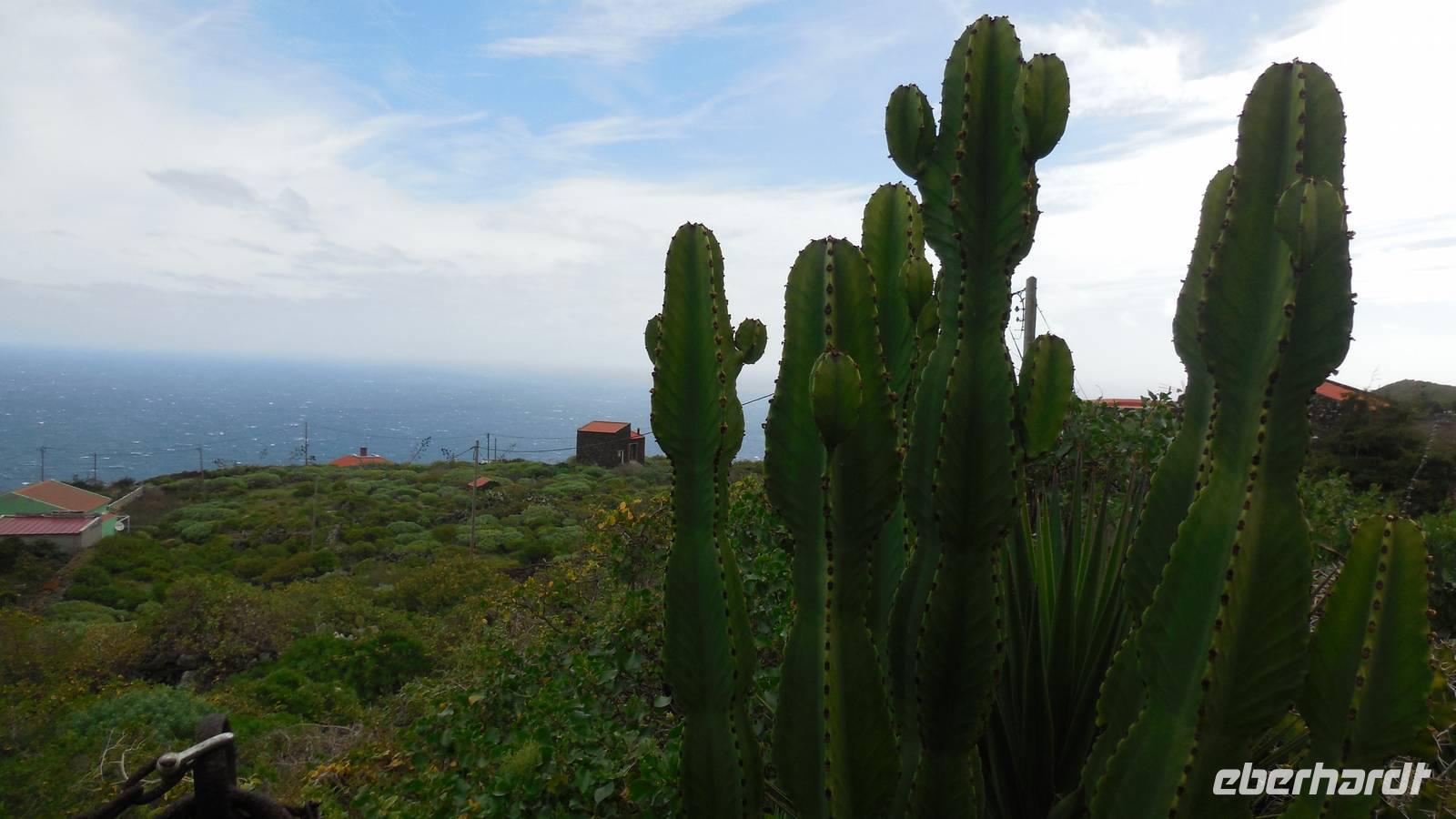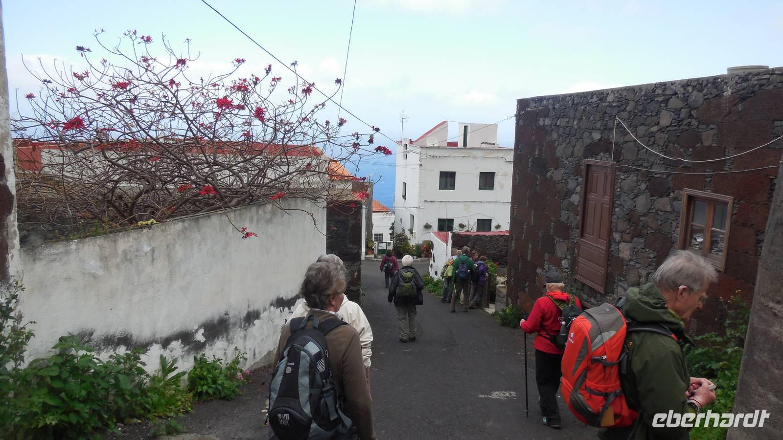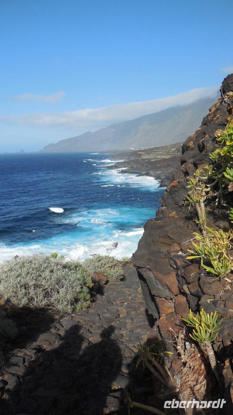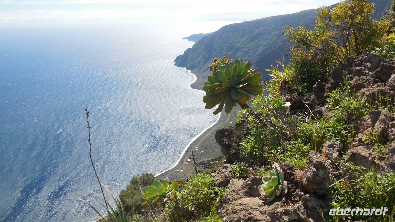 Nach einem leckeren Frühstück starten wir heute etwas später gen Küste, denn wir wollen ins Tal bis an die Badestelle bei La Caleta wandern. Heute gibt es außnahmsweise mal keinen dichten Nebel, dafür aber einen ziemlich starken Wind. Unser Weg führt uns zunächst ins idyllische Dörfchen Echedo, welches aufgrund seiner günstigen Lage und seiner fruchtbaren Erde bei Einsiedlern besonders beliebt ist. Nach einer kleinen Rast auf dem Dorfplatz an der Dorfkirche, an dem auch die Dorffeste stattfinden, geht es weiter durch die Weinterrassen in das Lavagebiet. Viele verlassene Häuschen stehen hier. Diese wurden oft von früheren Einwohnern, welche nach Venezuela ausgewandert sind, zurückgelassen. Außer Wein und Steinrosen gedeiht hier auf dem Lavagestein nicht viel. Immer tiefer kommen wir in das Lavagebiet und bald besteht unser Weg noch aus Geröll und schönen grünen Steinrosen. Wir finden hübsche Lavasteine, mitunter blau-lila-rot gefärbt. Gut aufpassen müssen wir hier, denn als wir den Bergkamm entlang gehen, gähnt links neben uns sogleich der Abgrund. El Hierro ist eine sehr steile Insel, wie wir heute deutlich bemerken. Wir haben die ganze Zeit das blaue Meer im Blick, zwischendurch sehen wir von weiten sogar die Spitze des Teide über den Wolken. Eine Mittagsrast legen wir an der Wegkreuzung zwischen Malpaso, Valverde, Echedo und Valverde ein. Hier haben wir einen tollen Blick auf das untenliegende Dörfchen Tamaduste und den Flughafen von El Hierro. Wir verschnaufen eine Weile und lassen die Aussicht auf uns wirken. Dann geht es weiter hinunter ins Tal, vorbei oberhalb von Tamaguste am Berg entlang nach La Caleta. Reiseleiter Ralf zeigt uns interessante Gewächse, wie die Wolfsmilchbäume. Merkwürdigerweise finden wir auf dieser Strecke, hoch oben auch Muscheln und große Schneckengehäuse.