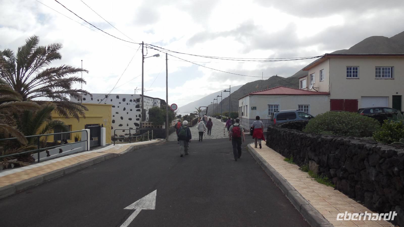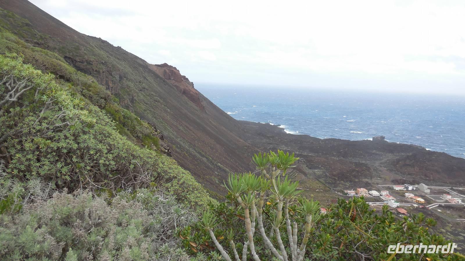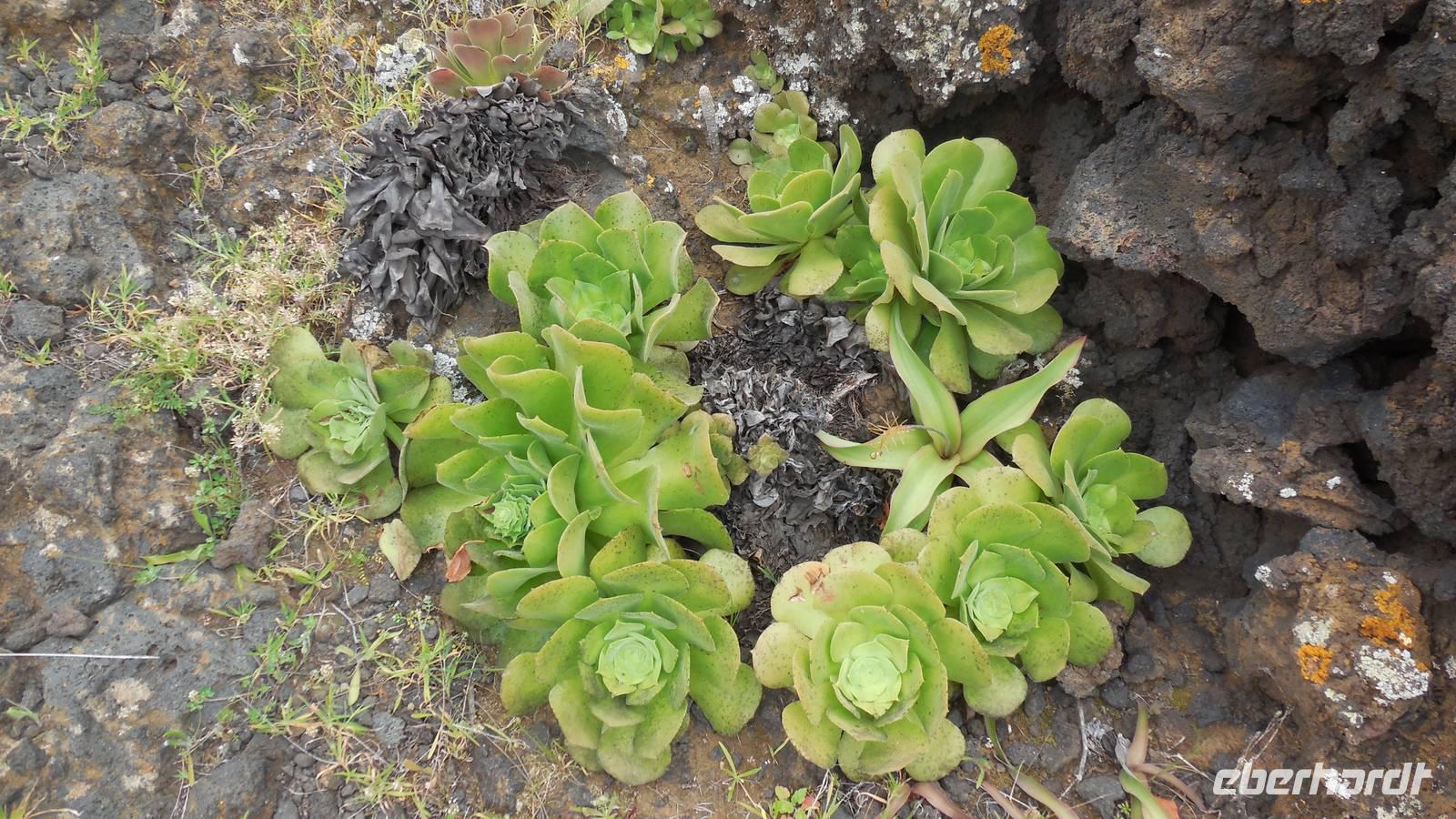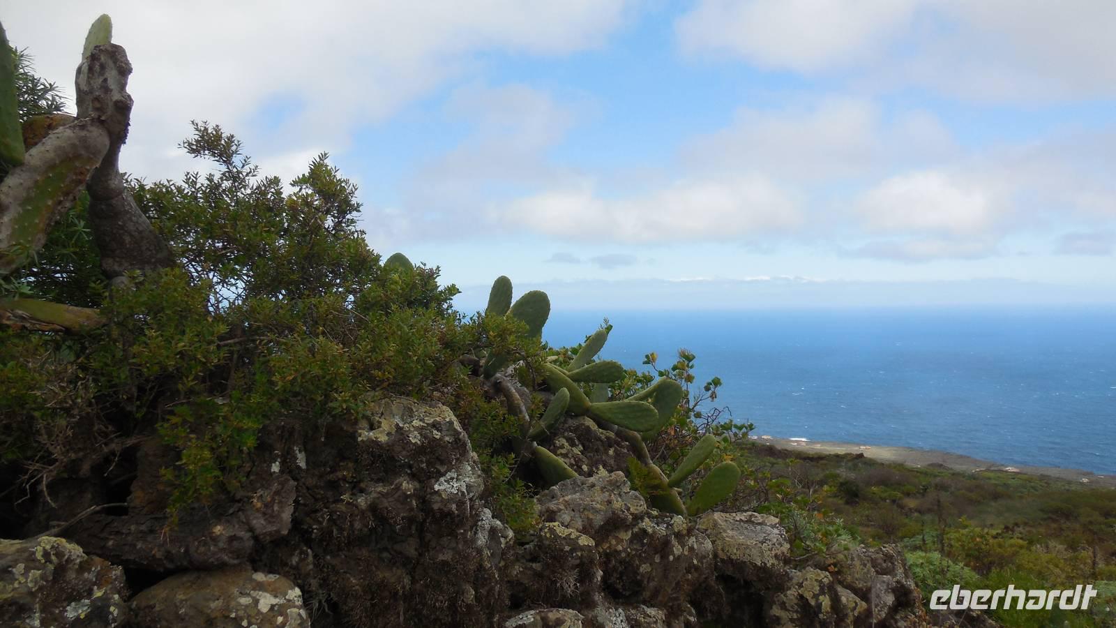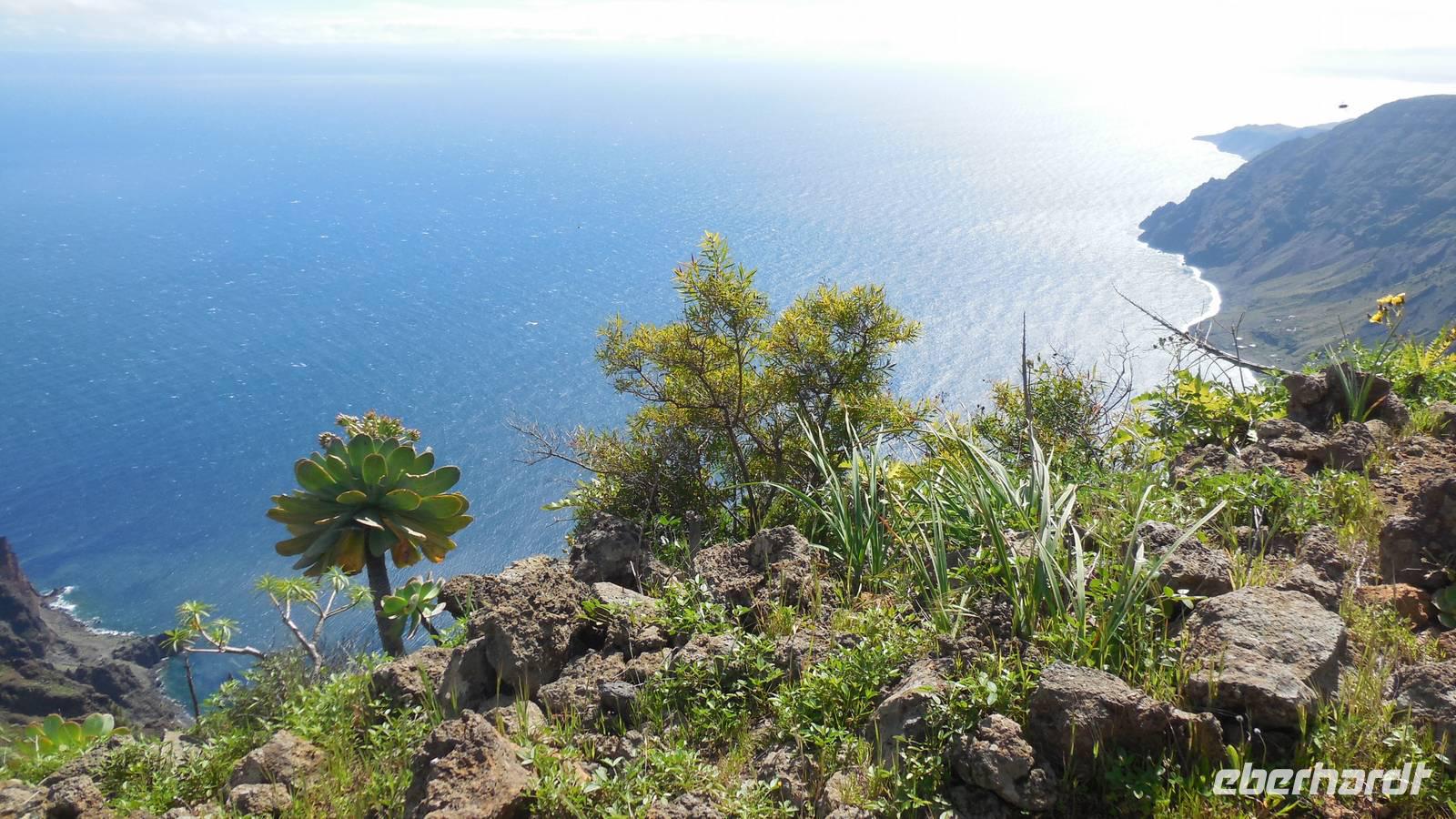 Nach einem leckeren Frühstück starten wir heute etwas später gen Küste, denn wir wollen ins Tal bis an die Badestelle bei La Caleta wandern. Heute gibt es außnahmsweise mal keinen dichten Nebel, dafür aber einen ziemlich starken Wind. Unser Weg führt uns zunächst ins idyllische Dörfchen Echedo, welches aufgrund seiner günstigen Lage und seiner fruchtbaren Erde bei Einsiedlern besonders beliebt ist. Nach einer kleinen Rast auf dem Dorfplatz an der Dorfkirche, an dem auch die Dorffeste stattfinden, geht es weiter durch die Weinterrassen in das Lavagebiet. Viele verlassene Häuschen stehen hier. Diese wurden oft von früheren Einwohnern, welche nach Venezuela ausgewandert sind, zurückgelassen. Außer Wein und Steinrosen gedeiht hier auf dem Lavagestein nicht viel. Immer tiefer kommen wir in das Lavagebiet und bald besteht unser Weg noch aus Geröll und schönen grünen Steinrosen. Wir finden hübsche Lavasteine, mitunter blau-lila-rot gefärbt. Gut aufpassen müssen wir hier, denn als wir den Bergkamm entlang gehen, gähnt links neben uns sogleich der Abgrund. El Hierro ist eine sehr steile Insel, wie wir heute deutlich bemerken. Wir haben die ganze Zeit das blaue Meer im Blick, zwischendurch sehen wir von weiten sogar die Spitze des Teide über den Wolken. Eine Mittagsrast legen wir an der Wegkreuzung zwischen Malpaso, Valverde, Echedo und Valverde ein. Hier haben wir einen tollen Blick auf das untenliegende Dörfchen Tamaduste und den Flughafen von El Hierro. Wir verschnaufen eine Weile und lassen die Aussicht auf uns wirken. Dann geht es weiter hinunter ins Tal, vorbei oberhalb von Tamaguste am Berg entlang nach La Caleta. Reiseleiter Ralf zeigt uns interessante Gewächse, wie die Wolfsmilchbäume. Merkwürdigerweise finden wir auf dieser Strecke, hoch oben auch Muscheln und große Schneckengehäuse.