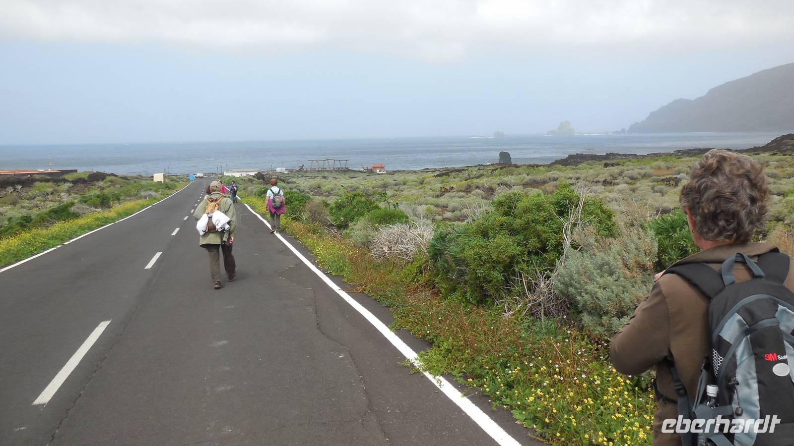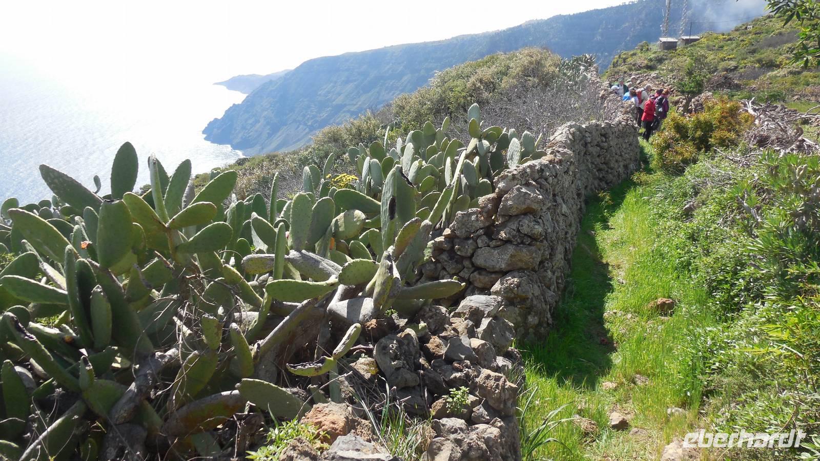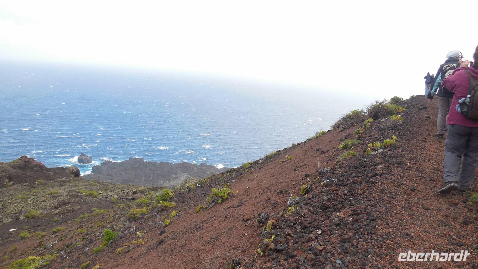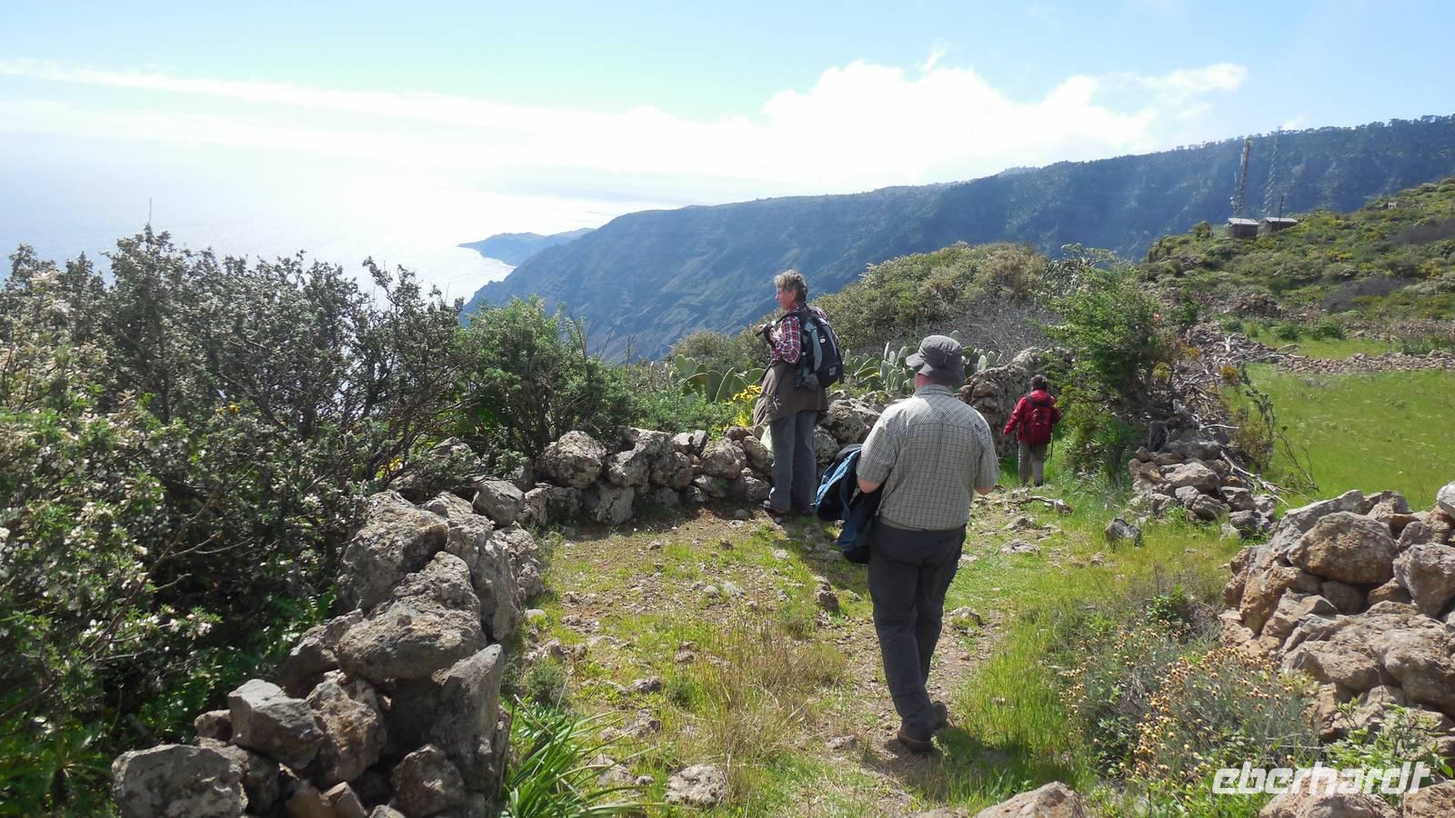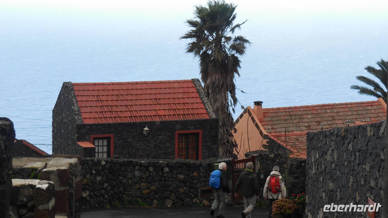 Nach einem leckeren Frühstück starten wir heute etwas später gen Küste, denn wir wollen ins Tal bis an die Badestelle bei La Caleta wandern. Heute gibt es außnahmsweise mal keinen dichten Nebel, dafür aber einen ziemlich starken Wind. Unser Weg führt uns zunächst ins idyllische Dörfchen Echedo, welches aufgrund seiner günstigen Lage und seiner fruchtbaren Erde bei Einsiedlern besonders beliebt ist. Nach einer kleinen Rast auf dem Dorfplatz an der Dorfkirche, an dem auch die Dorffeste stattfinden, geht es weiter durch die Weinterrassen in das Lavagebiet. Viele verlassene Häuschen stehen hier. Diese wurden oft von früheren Einwohnern, welche nach Venezuela ausgewandert sind, zurückgelassen. Außer Wein und Steinrosen gedeiht hier auf dem Lavagestein nicht viel. Immer tiefer kommen wir in das Lavagebiet und bald besteht unser Weg noch aus Geröll und schönen grünen Steinrosen. Wir finden hübsche Lavasteine, mitunter blau-lila-rot gefärbt. Gut aufpassen müssen wir hier, denn als wir den Bergkamm entlang gehen, gähnt links neben uns sogleich der Abgrund. El Hierro ist eine sehr steile Insel, wie wir heute deutlich bemerken. Wir haben die ganze Zeit das blaue Meer im Blick, zwischendurch sehen wir von weiten sogar die Spitze des Teide über den Wolken. Eine Mittagsrast legen wir an der Wegkreuzung zwischen Malpaso, Valverde, Echedo und Valverde ein. Hier haben wir einen tollen Blick auf das untenliegende Dörfchen Tamaduste und den Flughafen von El Hierro. Wir verschnaufen eine Weile und lassen die Aussicht auf uns wirken. Dann geht es weiter hinunter ins Tal, vorbei oberhalb von Tamaguste am Berg entlang nach La Caleta. Reiseleiter Ralf zeigt uns interessante Gewächse, wie die Wolfsmilchbäume. Merkwürdigerweise finden wir auf dieser Strecke, hoch oben auch Muscheln und große Schneckengehäuse.