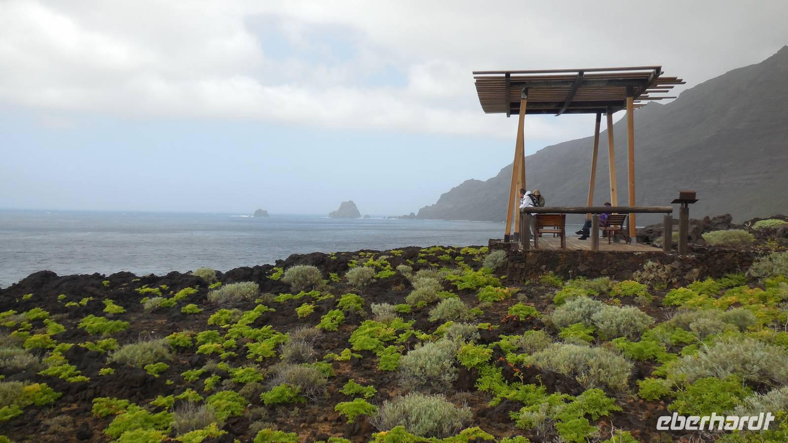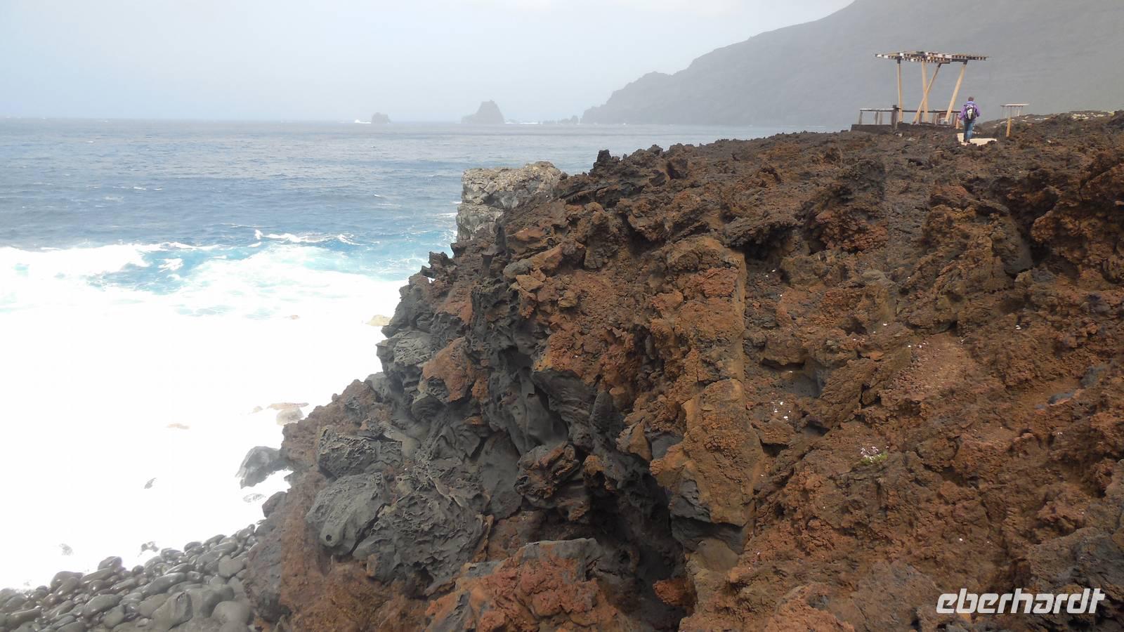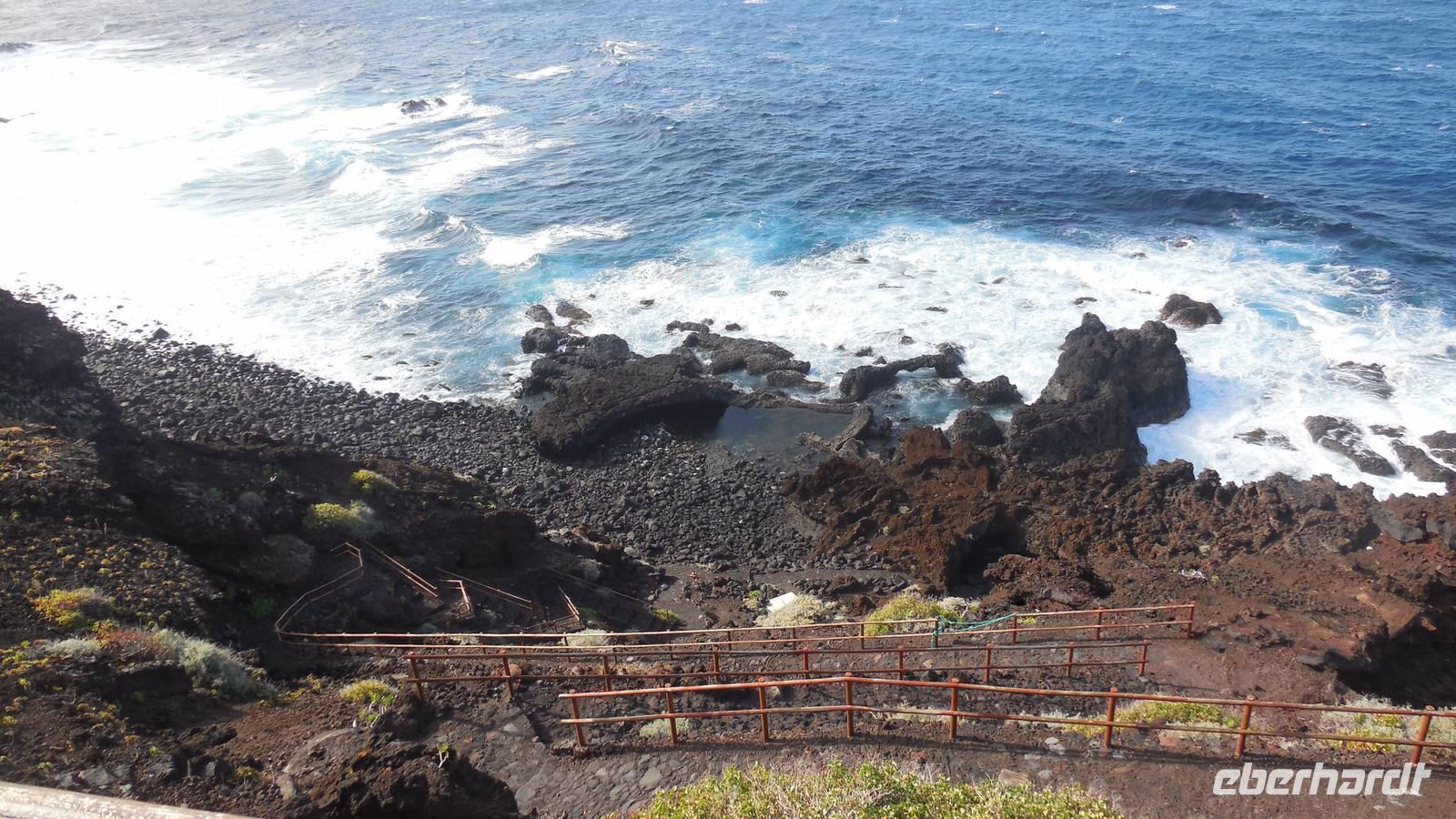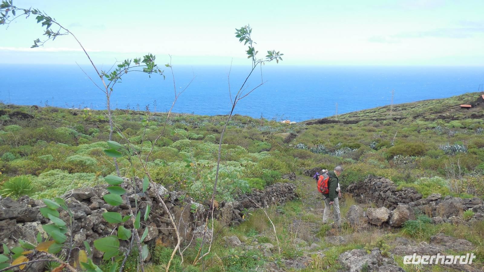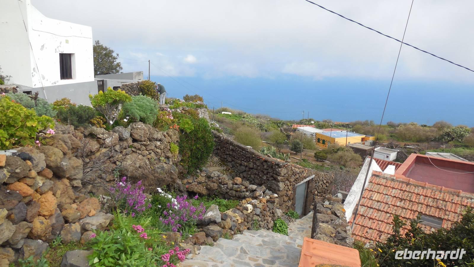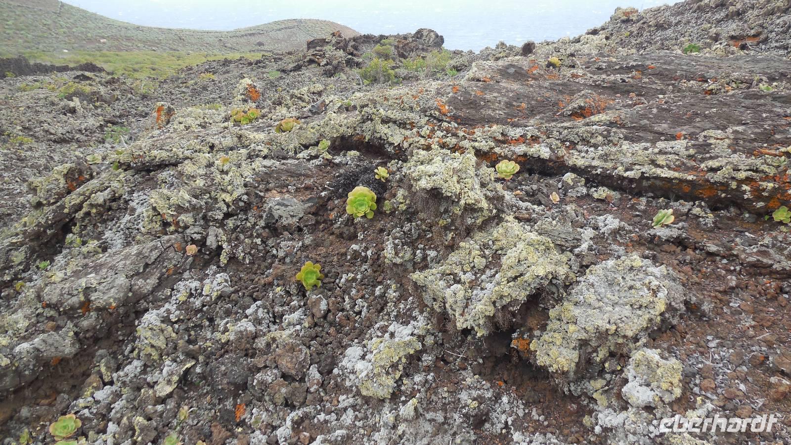Nach einem leckeren Frühstück starten wir heute etwas später gen Küste, denn wir wollen ins Tal bis an die Badestelle bei La Caleta wandern. Heute gibt es außnahmsweise mal keinen dichten Nebel, dafür aber einen ziemlich starken Wind. Unser Weg führt uns zunächst ins idyllische Dörfchen Echedo, welches aufgrund seiner günstigen Lage und seiner fruchtbaren Erde bei Einsiedlern besonders beliebt ist. Nach einer kleinen Rast auf dem Dorfplatz an der Dorfkirche, an dem auch die Dorffeste stattfinden, geht es weiter durch die Weinterrassen in das Lavagebiet. Viele verlassene Häuschen stehen hier. Diese wurden oft von früheren Einwohnern, welche nach Venezuela ausgewandert sind, zurückgelassen. Außer Wein und Steinrosen gedeiht hier auf dem Lavagestein nicht viel. Immer tiefer kommen wir in das Lavagebiet und bald besteht unser Weg noch aus Geröll und schönen grünen Steinrosen. Wir finden hübsche Lavasteine, mitunter blau-lila-rot gefärbt. Gut aufpassen müssen wir hier, denn als wir den Bergkamm entlang gehen, gähnt links neben uns sogleich der Abgrund. El Hierro ist eine sehr steile Insel, wie wir heute deutlich bemerken. Wir haben die ganze Zeit das blaue Meer im Blick, zwischendurch sehen wir von weiten sogar die Spitze des Teide über den Wolken. Eine Mittagsrast legen wir an der Wegkreuzung zwischen Malpaso, Valverde, Echedo und Valverde ein. Hier haben wir einen tollen Blick auf das untenliegende Dörfchen Tamaduste und den Flughafen von El Hierro. Wir verschnaufen eine Weile und lassen die Aussicht auf uns wirken. Dann geht es weiter hinunter ins Tal, vorbei oberhalb von Tamaguste am Berg entlang nach La Caleta. Reiseleiter Ralf zeigt uns interessante Gewächse, wie die Wolfsmilchbäume. Merkwürdigerweise finden wir auf dieser Strecke, hoch oben auch Muscheln und große Schneckengehäuse.