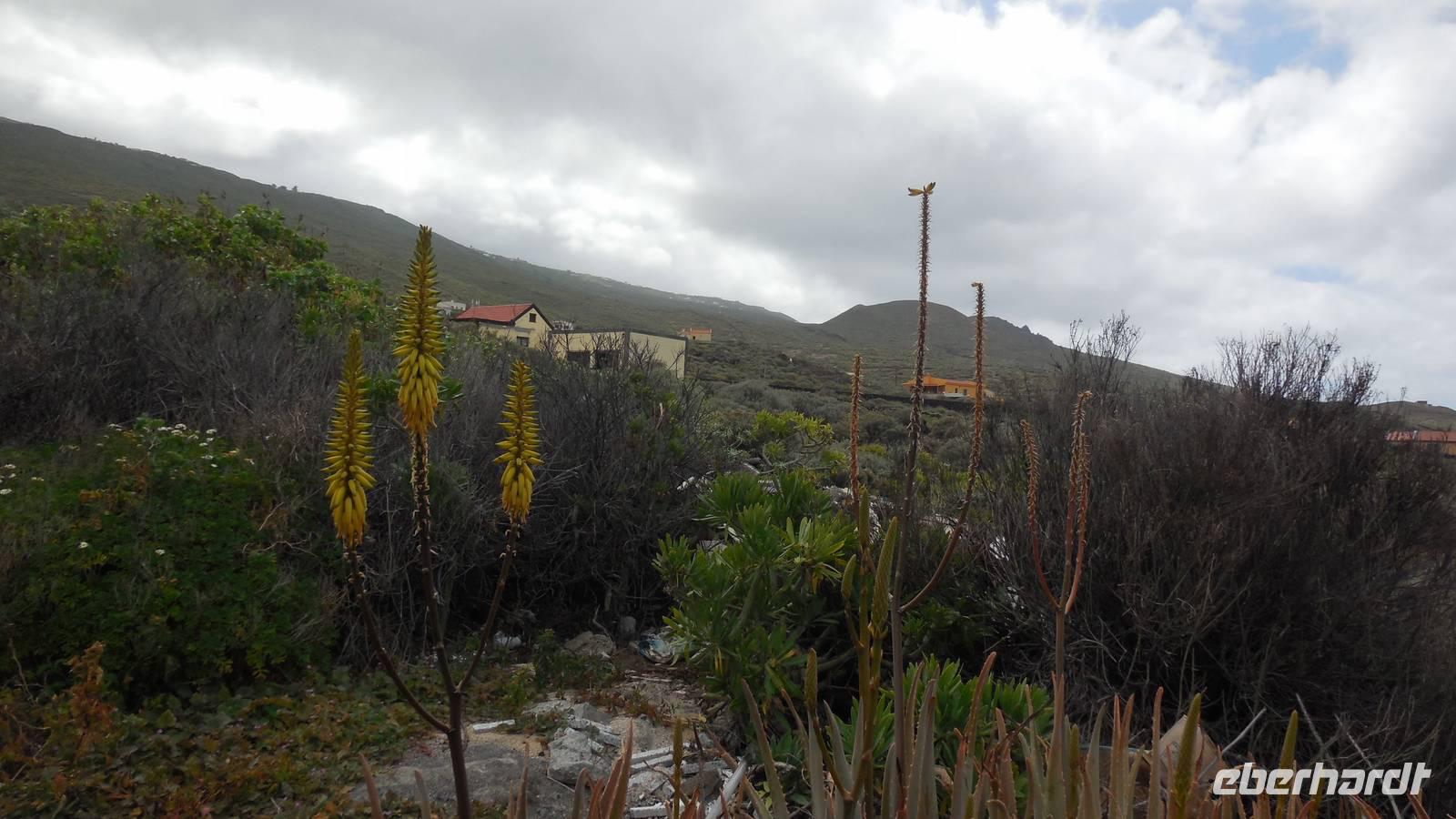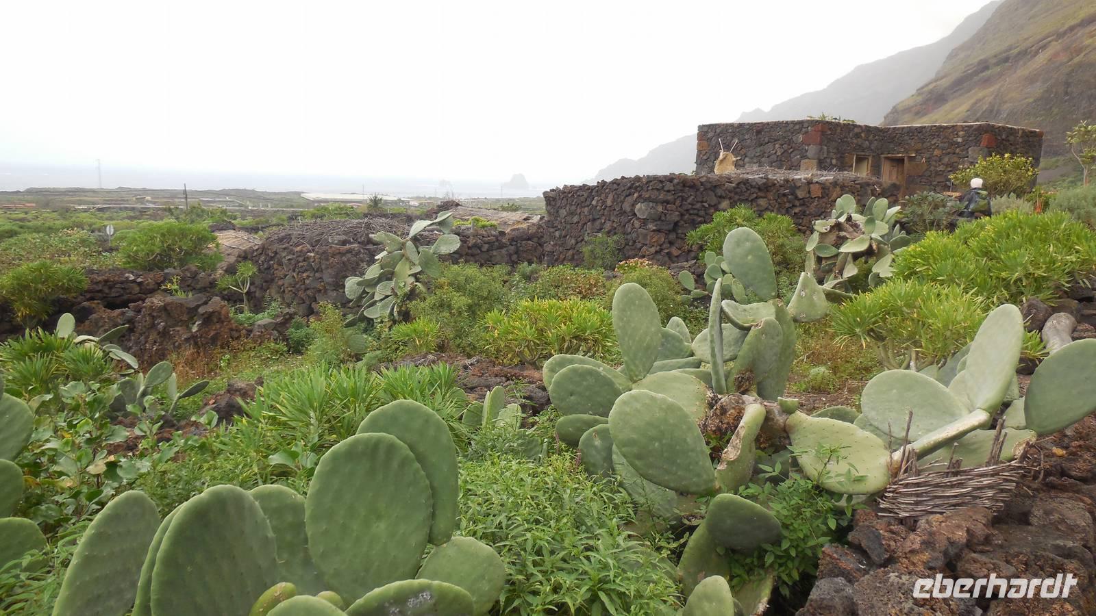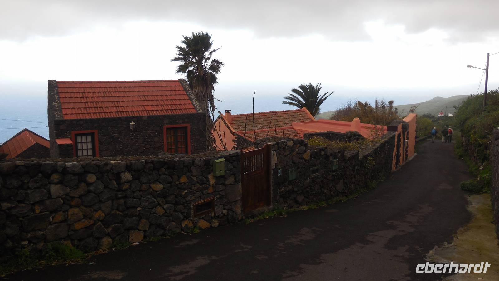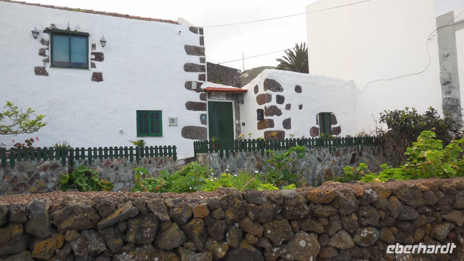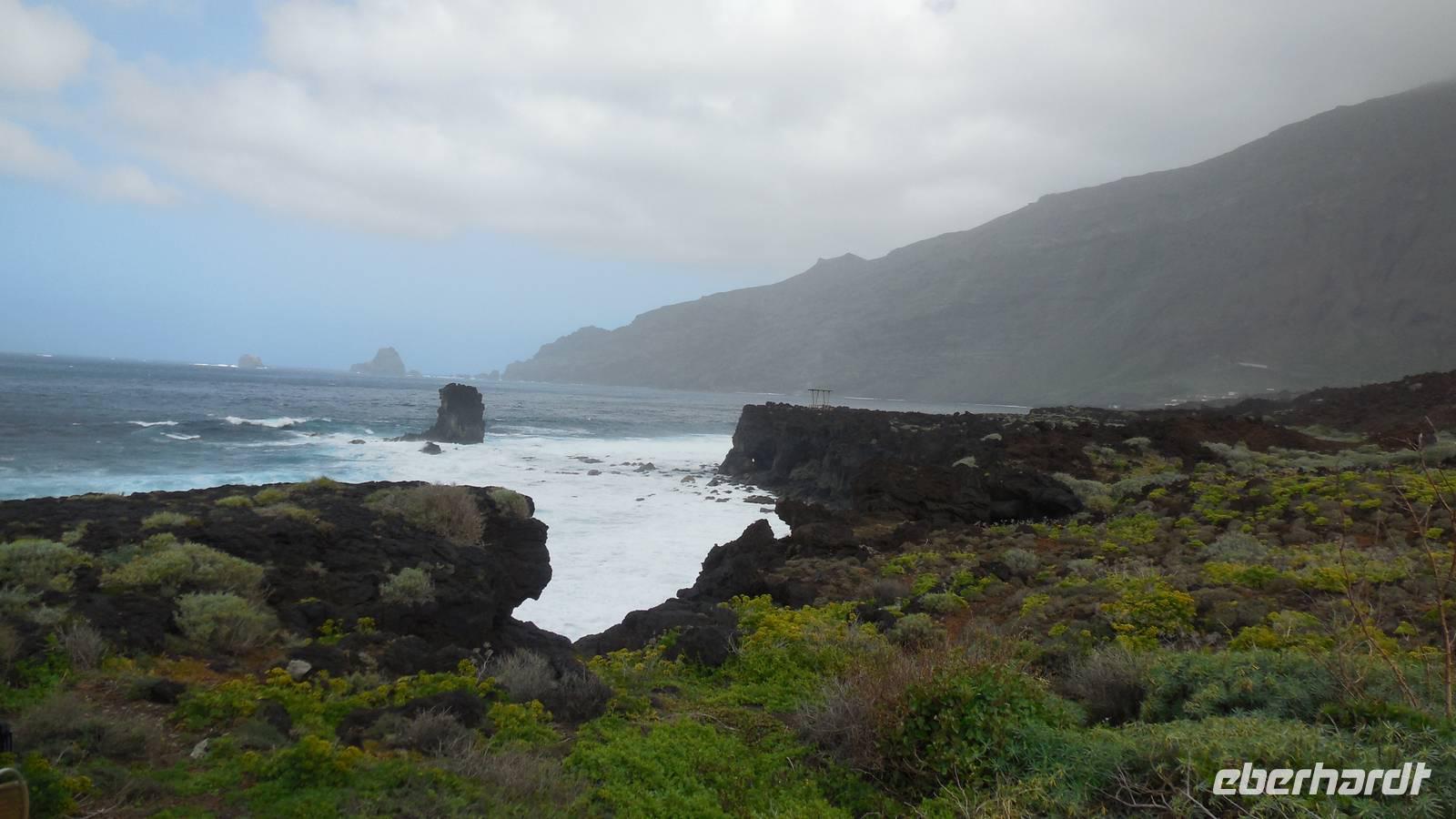 Nach einem leckeren Frühstück starten wir heute etwas später gen Küste, denn wir wollen ins Tal bis an die Badestelle bei La Caleta wandern. Heute gibt es außnahmsweise mal keinen dichten Nebel, dafür aber einen ziemlich starken Wind. Unser Weg führt uns zunächst ins idyllische Dörfchen Echedo, welches aufgrund seiner günstigen Lage und seiner fruchtbaren Erde bei Einsiedlern besonders beliebt ist. Nach einer kleinen Rast auf dem Dorfplatz an der Dorfkirche, an dem auch die Dorffeste stattfinden, geht es weiter durch die Weinterrassen in das Lavagebiet. Viele verlassene Häuschen stehen hier. Diese wurden oft von früheren Einwohnern, welche nach Venezuela ausgewandert sind, zurückgelassen. Außer Wein und Steinrosen gedeiht hier auf dem Lavagestein nicht viel. Immer tiefer kommen wir in das Lavagebiet und bald besteht unser Weg noch aus Geröll und schönen grünen Steinrosen. Wir finden hübsche Lavasteine, mitunter blau-lila-rot gefärbt. Gut aufpassen müssen wir hier, denn als wir den Bergkamm entlang gehen, gähnt links neben uns sogleich der Abgrund. El Hierro ist eine sehr steile Insel, wie wir heute deutlich bemerken. Wir haben die ganze Zeit das blaue Meer im Blick, zwischendurch sehen wir von weiten sogar die Spitze des Teide über den Wolken. Eine Mittagsrast legen wir an der Wegkreuzung zwischen Malpaso, Valverde, Echedo und Valverde ein. Hier haben wir einen tollen Blick auf das untenliegende Dörfchen Tamaduste und den Flughafen von El Hierro. Wir verschnaufen eine Weile und lassen die Aussicht auf uns wirken. Dann geht es weiter hinunter ins Tal, vorbei oberhalb von Tamaguste am Berg entlang nach La Caleta. Reiseleiter Ralf zeigt uns interessante Gewächse, wie die Wolfsmilchbäume. Merkwürdigerweise finden wir auf dieser Strecke, hoch oben auch Muscheln und große Schneckengehäuse.