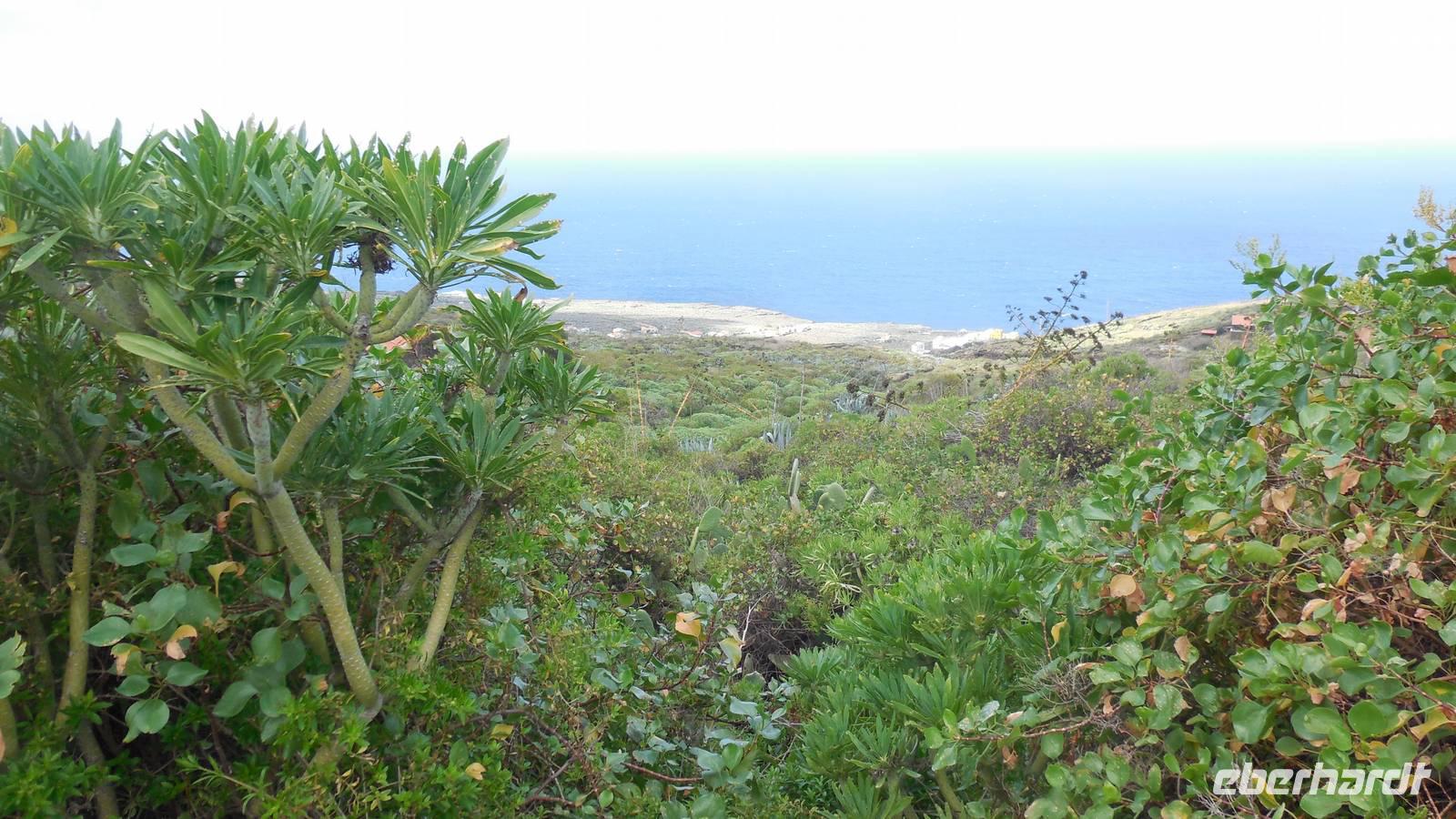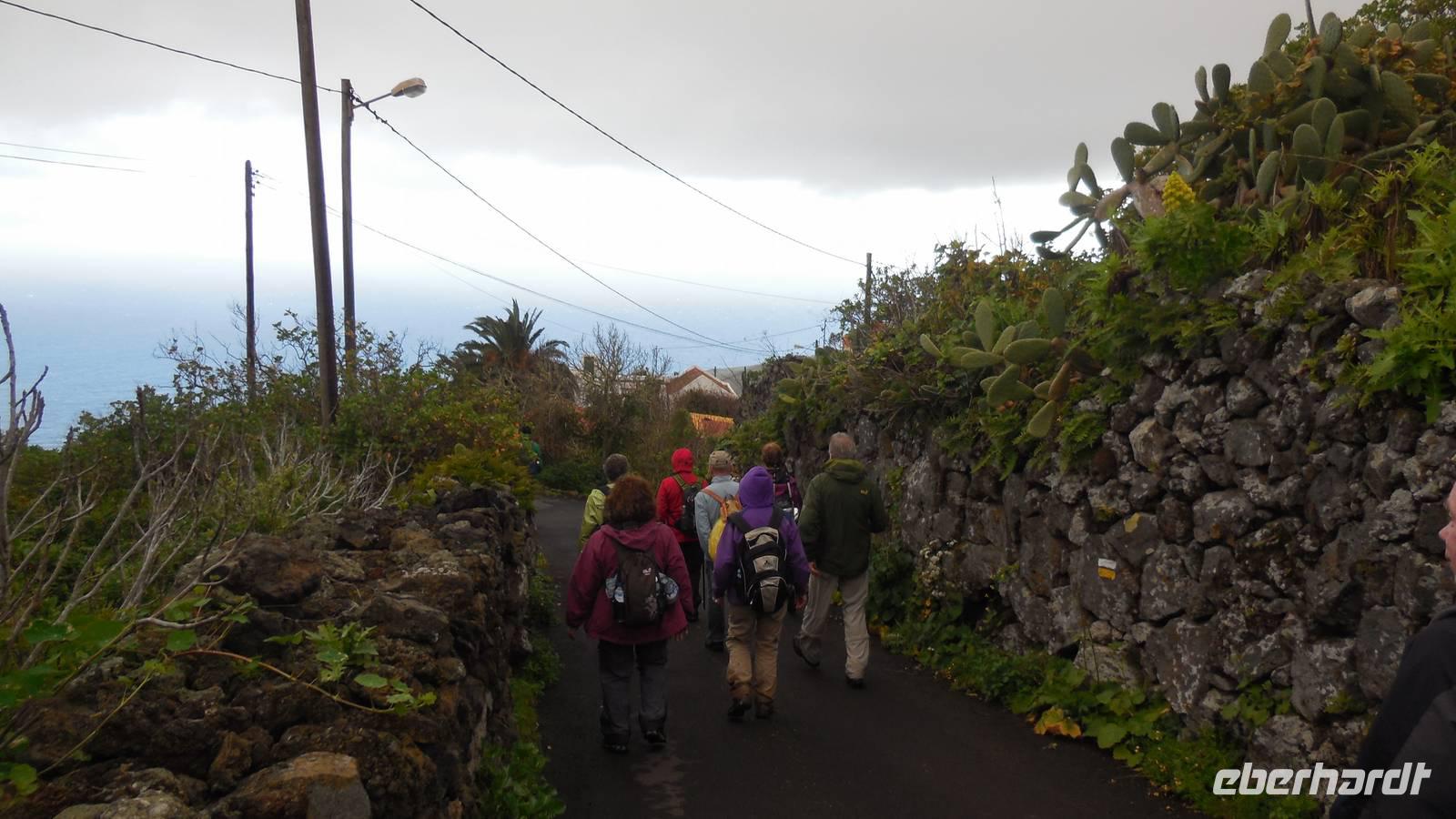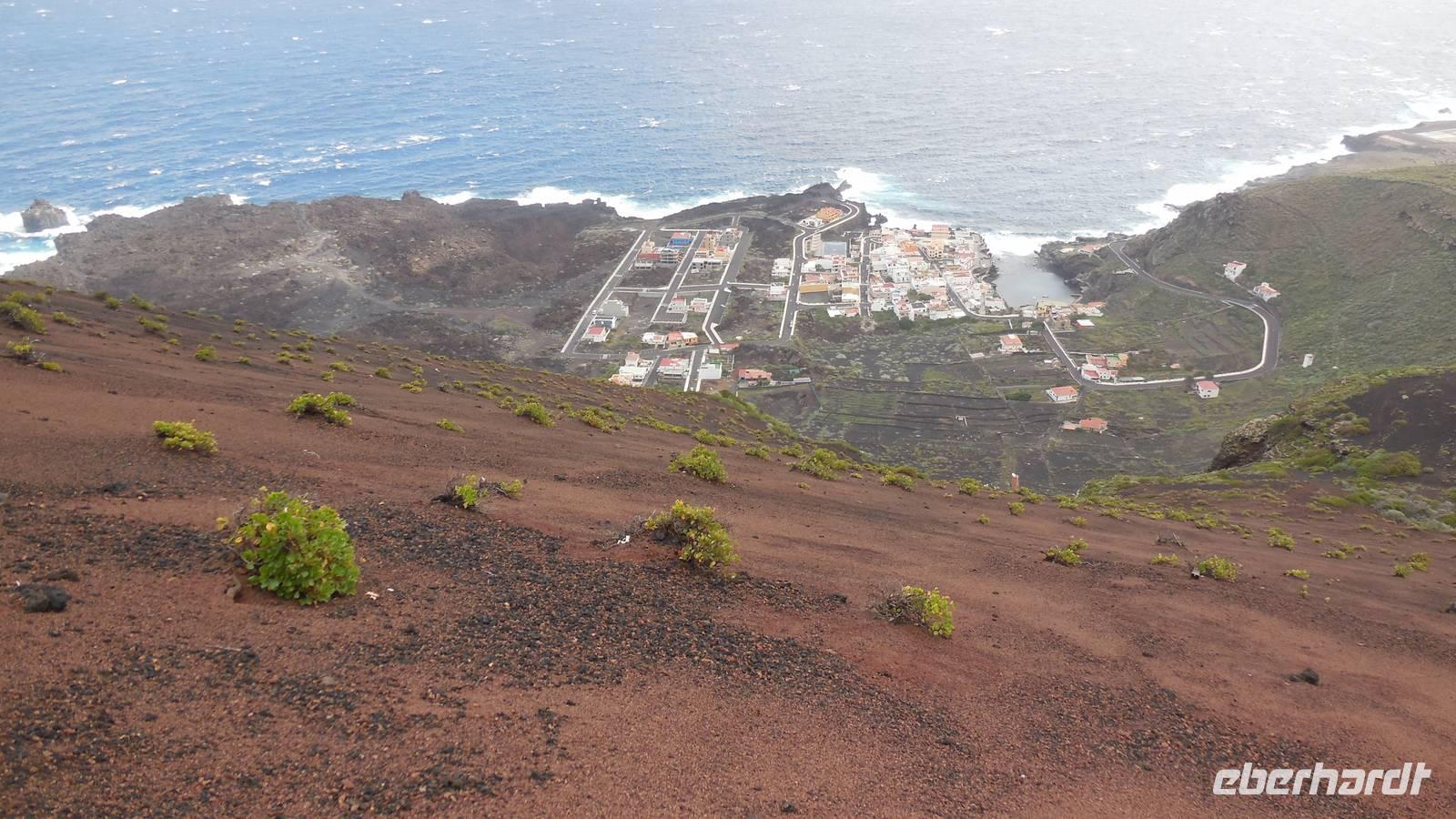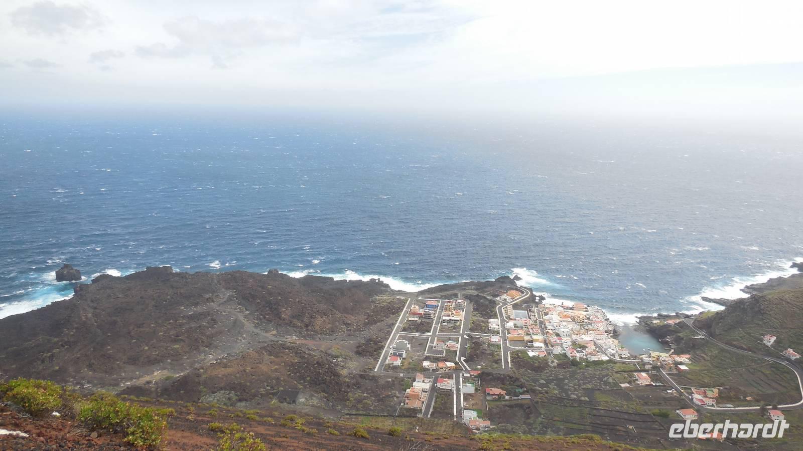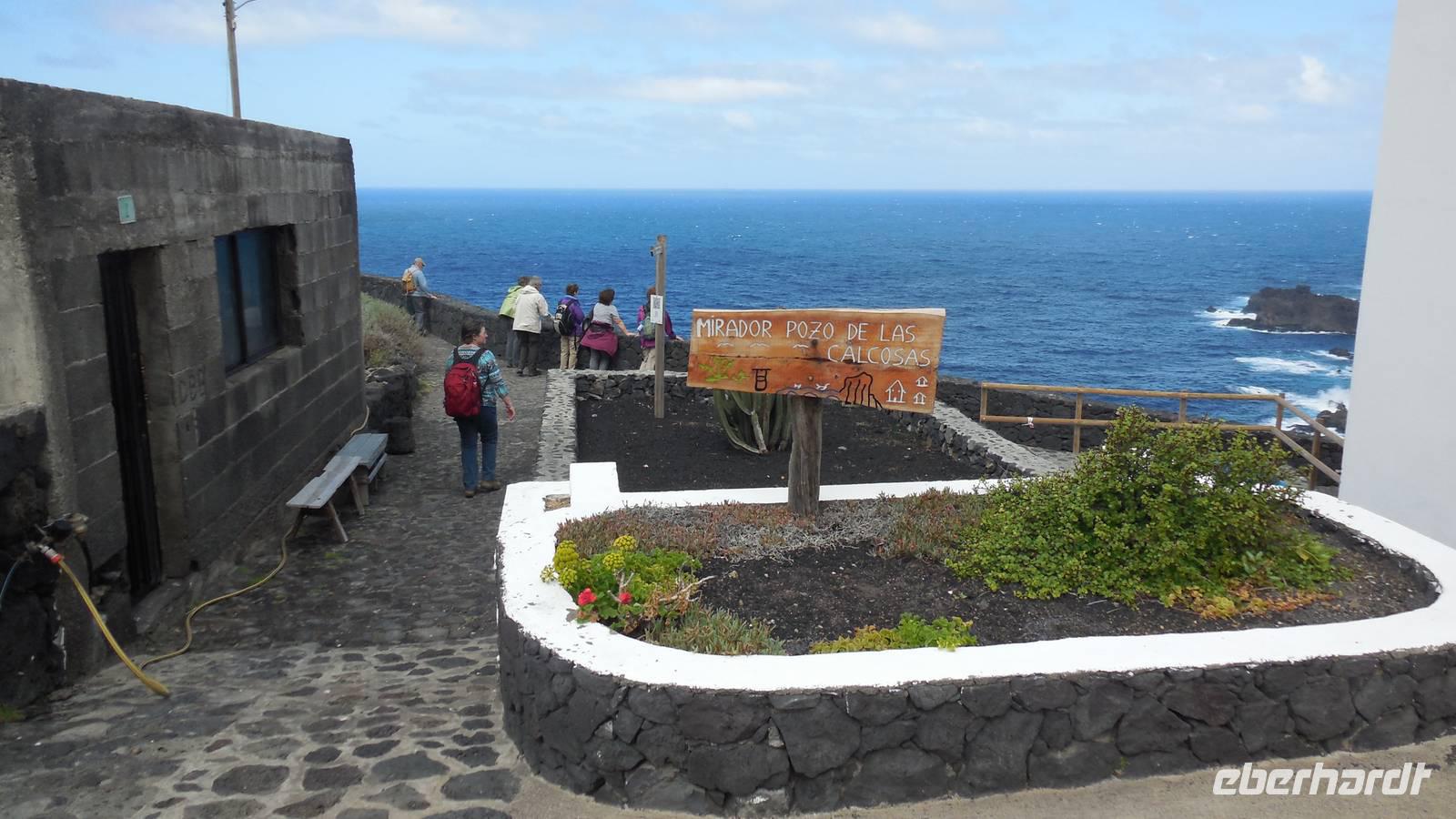 Nach einem leckeren Frühstück starten wir heute etwas später gen Küste, denn wir wollen ins Tal bis an die Badestelle bei La Caleta wandern. Heute gibt es außnahmsweise mal keinen dichten Nebel, dafür aber einen ziemlich starken Wind. Unser Weg führt uns zunächst ins idyllische Dörfchen Echedo, welches aufgrund seiner günstigen Lage und seiner fruchtbaren Erde bei Einsiedlern besonders beliebt ist. Nach einer kleinen Rast auf dem Dorfplatz an der Dorfkirche, an dem auch die Dorffeste stattfinden, geht es weiter durch die Weinterrassen in das Lavagebiet. Viele verlassene Häuschen stehen hier. Diese wurden oft von früheren Einwohnern, welche nach Venezuela ausgewandert sind, zurückgelassen. Außer Wein und Steinrosen gedeiht hier auf dem Lavagestein nicht viel. Immer tiefer kommen wir in das Lavagebiet und bald besteht unser Weg noch aus Geröll und schönen grünen Steinrosen. Wir finden hübsche Lavasteine, mitunter blau-lila-rot gefärbt. Gut aufpassen müssen wir hier, denn als wir den Bergkamm entlang gehen, gähnt links neben uns sogleich der Abgrund. El Hierro ist eine sehr steile Insel, wie wir heute deutlich bemerken. Wir haben die ganze Zeit das blaue Meer im Blick, zwischendurch sehen wir von weiten sogar die Spitze des Teide über den Wolken. Eine Mittagsrast legen wir an der Wegkreuzung zwischen Malpaso, Valverde, Echedo und Valverde ein. Hier haben wir einen tollen Blick auf das untenliegende Dörfchen Tamaduste und den Flughafen von El Hierro. Wir verschnaufen eine Weile und lassen die Aussicht auf uns wirken. Dann geht es weiter hinunter ins Tal, vorbei oberhalb von Tamaguste am Berg entlang nach La Caleta. Reiseleiter Ralf zeigt uns interessante Gewächse, wie die Wolfsmilchbäume. Merkwürdigerweise finden wir auf dieser Strecke, hoch oben auch Muscheln und große Schneckengehäuse.