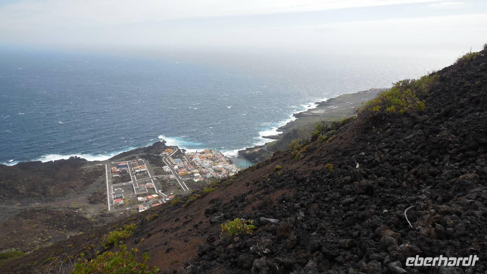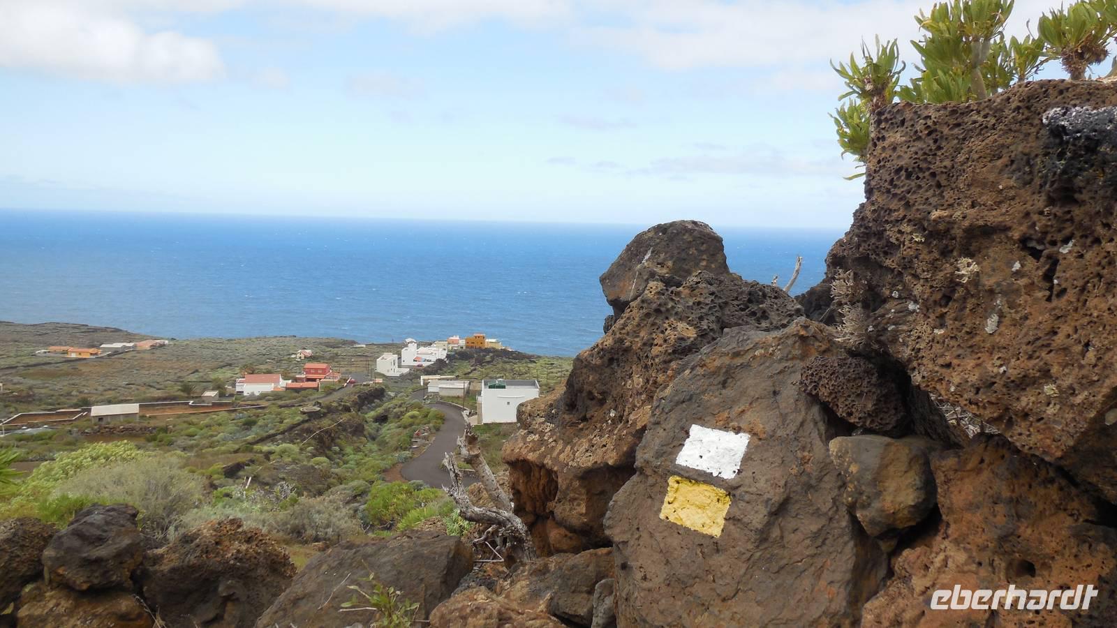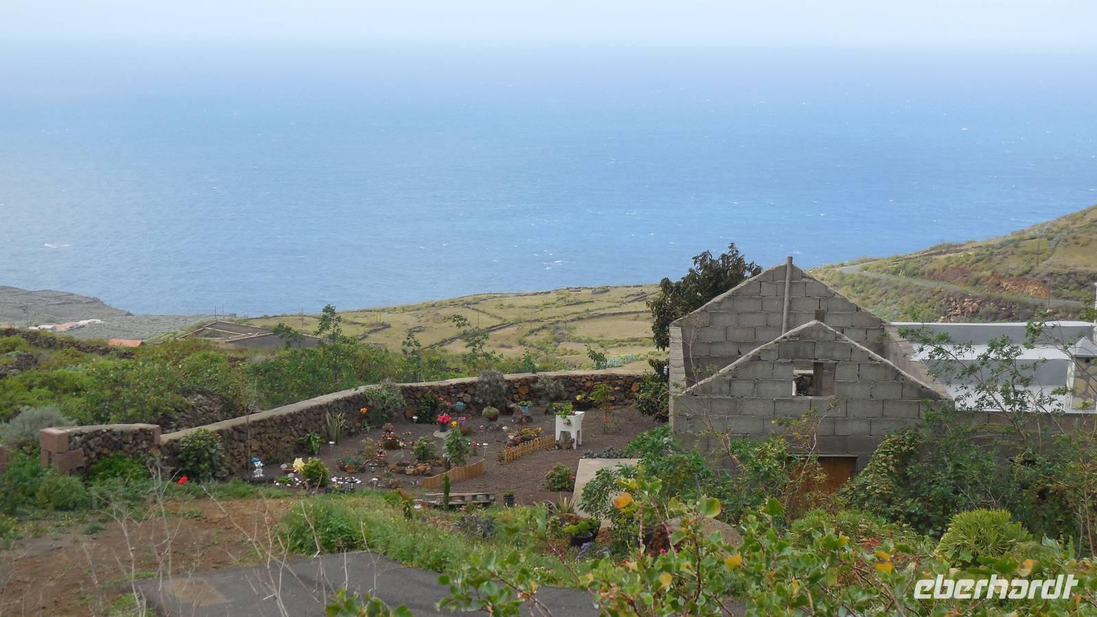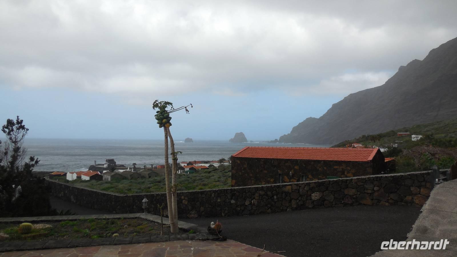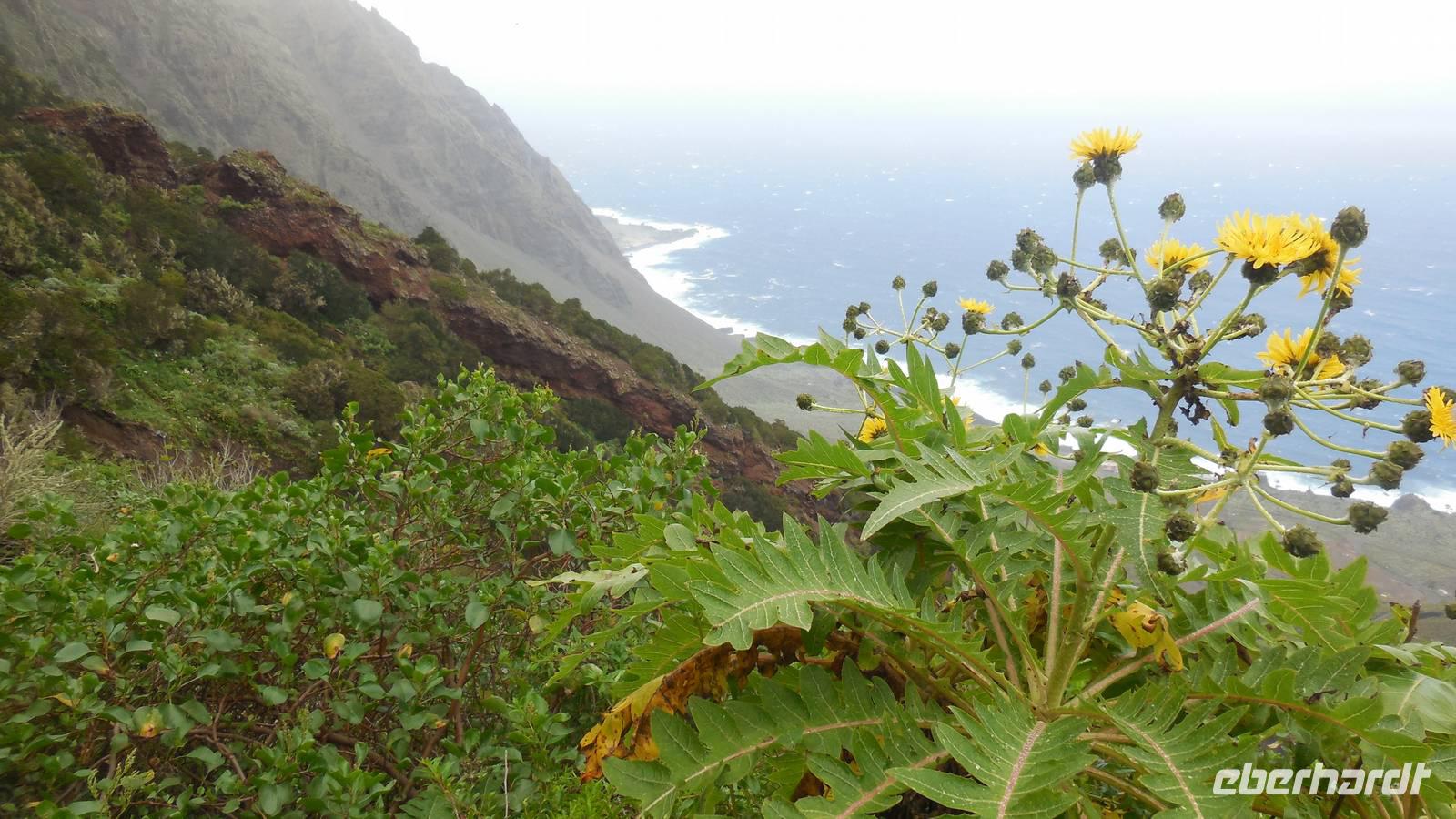 Nach einem leckeren Frühstück starten wir heute etwas später gen Küste, denn wir wollen ins Tal bis an die Badestelle bei La Caleta wandern. Heute gibt es außnahmsweise mal keinen dichten Nebel, dafür aber einen ziemlich starken Wind. Unser Weg führt uns zunächst ins idyllische Dörfchen Echedo, welches aufgrund seiner günstigen Lage und seiner fruchtbaren Erde bei Einsiedlern besonders beliebt ist. Nach einer kleinen Rast auf dem Dorfplatz an der Dorfkirche, an dem auch die Dorffeste stattfinden, geht es weiter durch die Weinterrassen in das Lavagebiet. Viele verlassene Häuschen stehen hier. Diese wurden oft von früheren Einwohnern, welche nach Venezuela ausgewandert sind, zurückgelassen. Außer Wein und Steinrosen gedeiht hier auf dem Lavagestein nicht viel. Immer tiefer kommen wir in das Lavagebiet und bald besteht unser Weg noch aus Geröll und schönen grünen Steinrosen. Wir finden hübsche Lavasteine, mitunter blau-lila-rot gefärbt. Gut aufpassen müssen wir hier, denn als wir den Bergkamm entlang gehen, gähnt links neben uns sogleich der Abgrund. El Hierro ist eine sehr steile Insel, wie wir heute deutlich bemerken. Wir haben die ganze Zeit das blaue Meer im Blick, zwischendurch sehen wir von weiten sogar die Spitze des Teide über den Wolken. Eine Mittagsrast legen wir an der Wegkreuzung zwischen Malpaso, Valverde, Echedo und Valverde ein. Hier haben wir einen tollen Blick auf das untenliegende Dörfchen Tamaduste und den Flughafen von El Hierro. Wir verschnaufen eine Weile und lassen die Aussicht auf uns wirken. Dann geht es weiter hinunter ins Tal, vorbei oberhalb von Tamaguste am Berg entlang nach La Caleta. Reiseleiter Ralf zeigt uns interessante Gewächse, wie die Wolfsmilchbäume. Merkwürdigerweise finden wir auf dieser Strecke, hoch oben auch Muscheln und große Schneckengehäuse.
