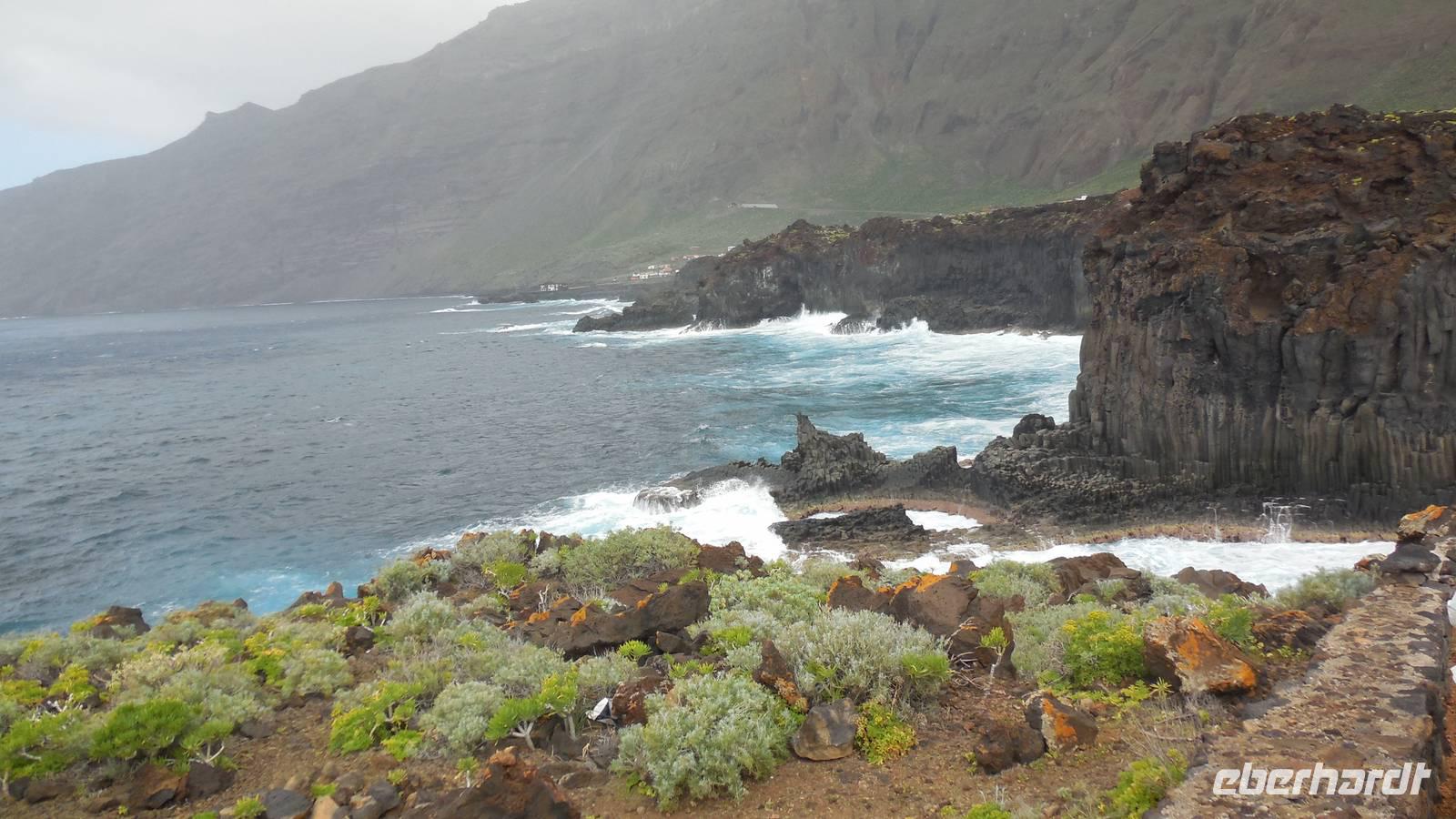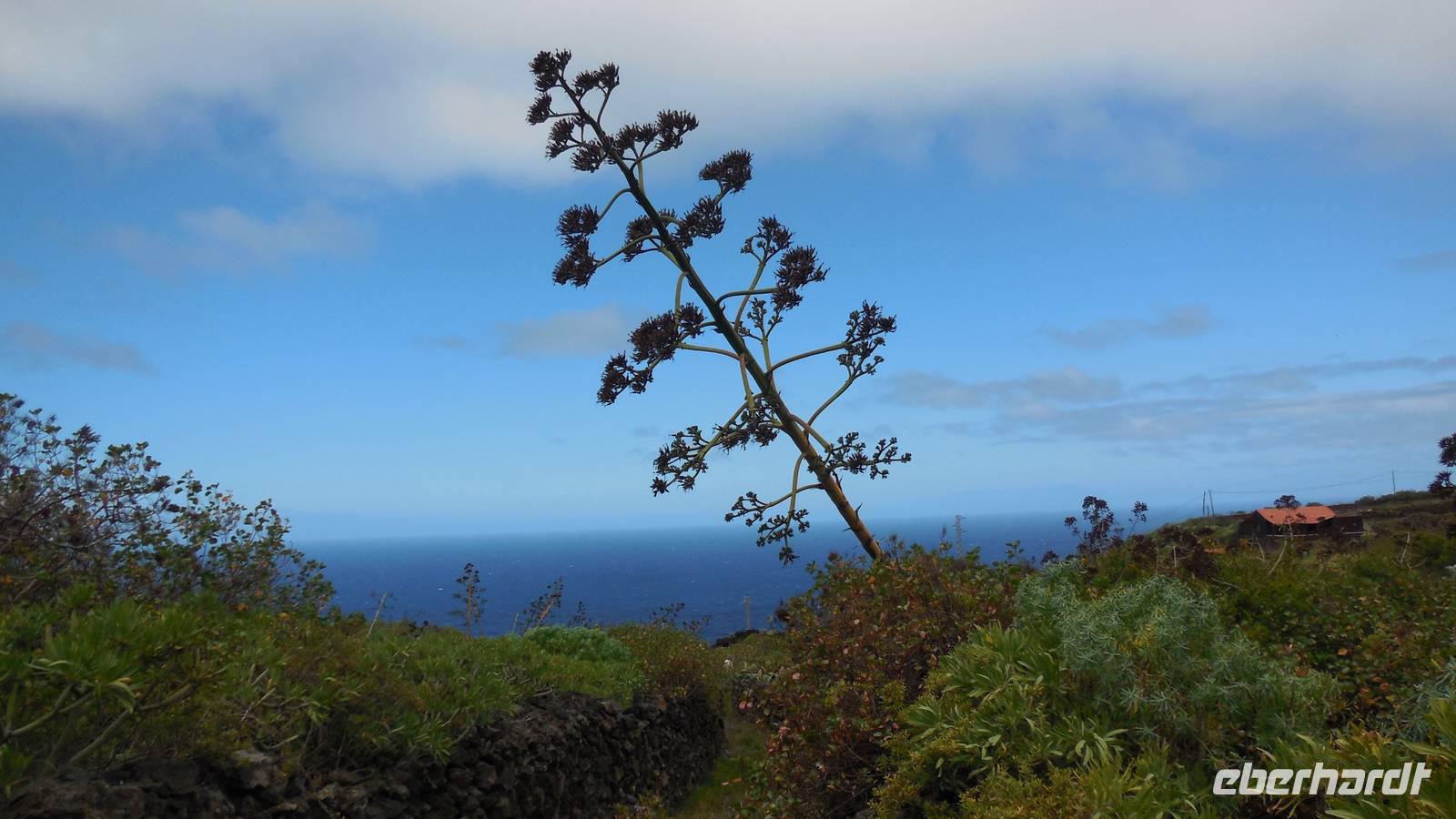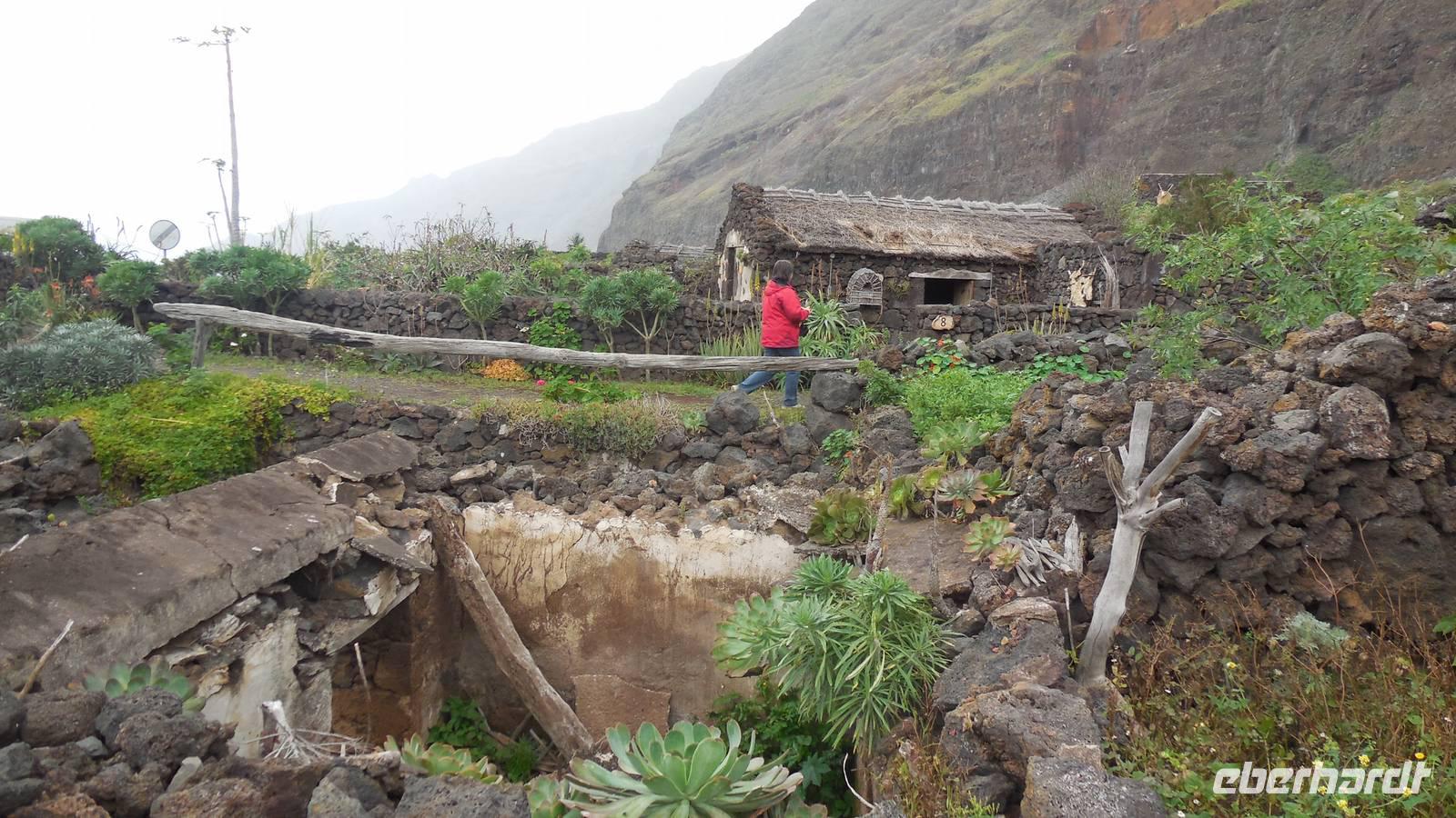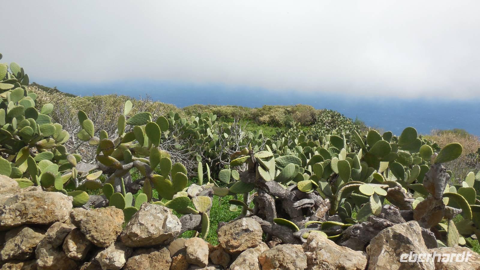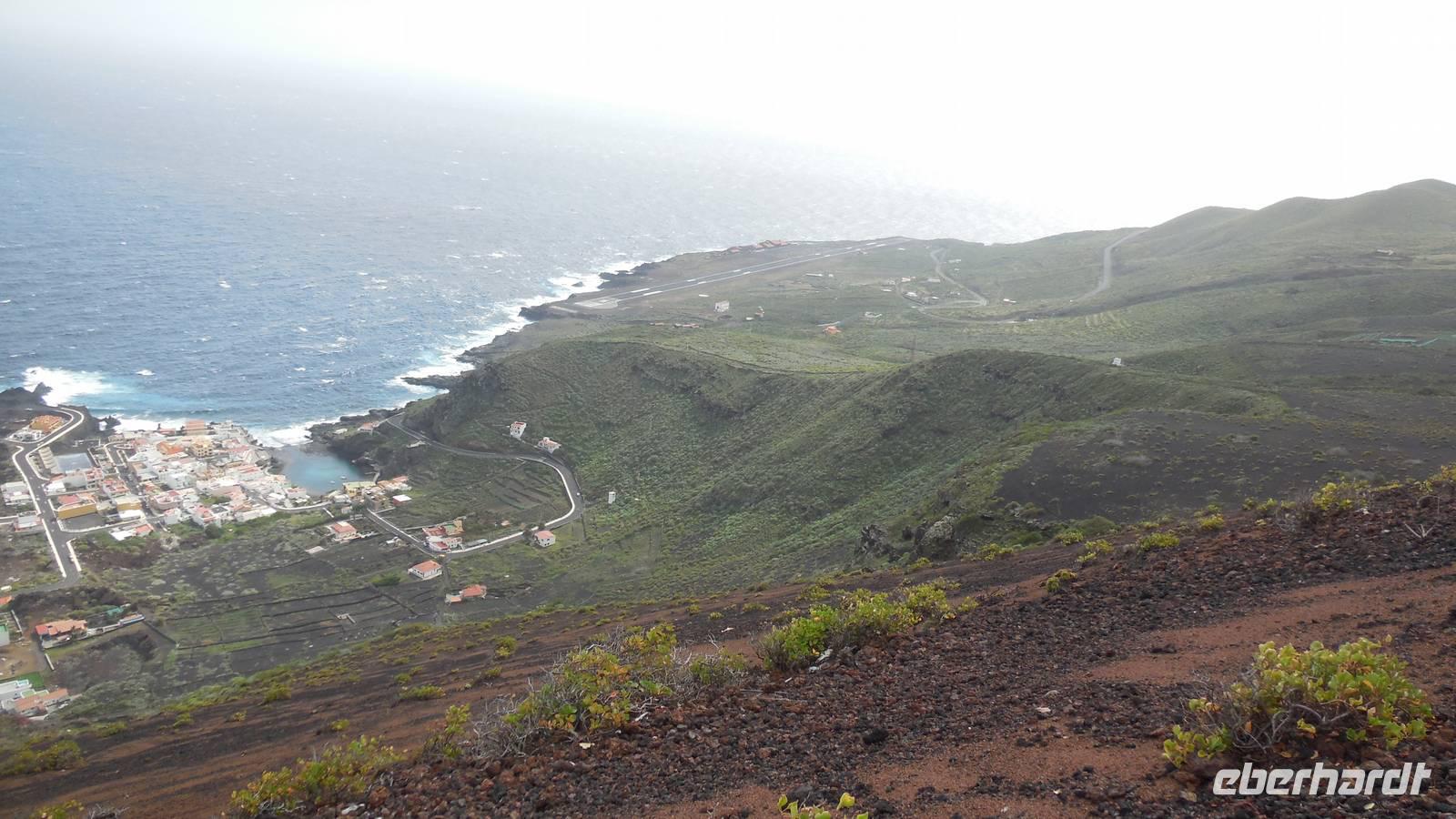 Nach einem leckeren Frühstück starten wir heute etwas später gen Küste, denn wir wollen ins Tal bis an die Badestelle bei La Caleta wandern. Heute gibt es außnahmsweise mal keinen dichten Nebel, dafür aber einen ziemlich starken Wind. Unser Weg führt uns zunächst ins idyllische Dörfchen Echedo, welches aufgrund seiner günstigen Lage und seiner fruchtbaren Erde bei Einsiedlern besonders beliebt ist. Nach einer kleinen Rast auf dem Dorfplatz an der Dorfkirche, an dem auch die Dorffeste stattfinden, geht es weiter durch die Weinterrassen in das Lavagebiet. Viele verlassene Häuschen stehen hier. Diese wurden oft von früheren Einwohnern, welche nach Venezuela ausgewandert sind, zurückgelassen. Außer Wein und Steinrosen gedeiht hier auf dem Lavagestein nicht viel. Immer tiefer kommen wir in das Lavagebiet und bald besteht unser Weg noch aus Geröll und schönen grünen Steinrosen. Wir finden hübsche Lavasteine, mitunter blau-lila-rot gefärbt. Gut aufpassen müssen wir hier, denn als wir den Bergkamm entlang gehen, gähnt links neben uns sogleich der Abgrund. El Hierro ist eine sehr steile Insel, wie wir heute deutlich bemerken. Wir haben die ganze Zeit das blaue Meer im Blick, zwischendurch sehen wir von weiten sogar die Spitze des Teide über den Wolken. Eine Mittagsrast legen wir an der Wegkreuzung zwischen Malpaso, Valverde, Echedo und Valverde ein. Hier haben wir einen tollen Blick auf das untenliegende Dörfchen Tamaduste und den Flughafen von El Hierro. Wir verschnaufen eine Weile und lassen die Aussicht auf uns wirken. Dann geht es weiter hinunter ins Tal, vorbei oberhalb von Tamaguste am Berg entlang nach La Caleta. Reiseleiter Ralf zeigt uns interessante Gewächse, wie die Wolfsmilchbäume. Merkwürdigerweise finden wir auf dieser Strecke, hoch oben auch Muscheln und große Schneckengehäuse.