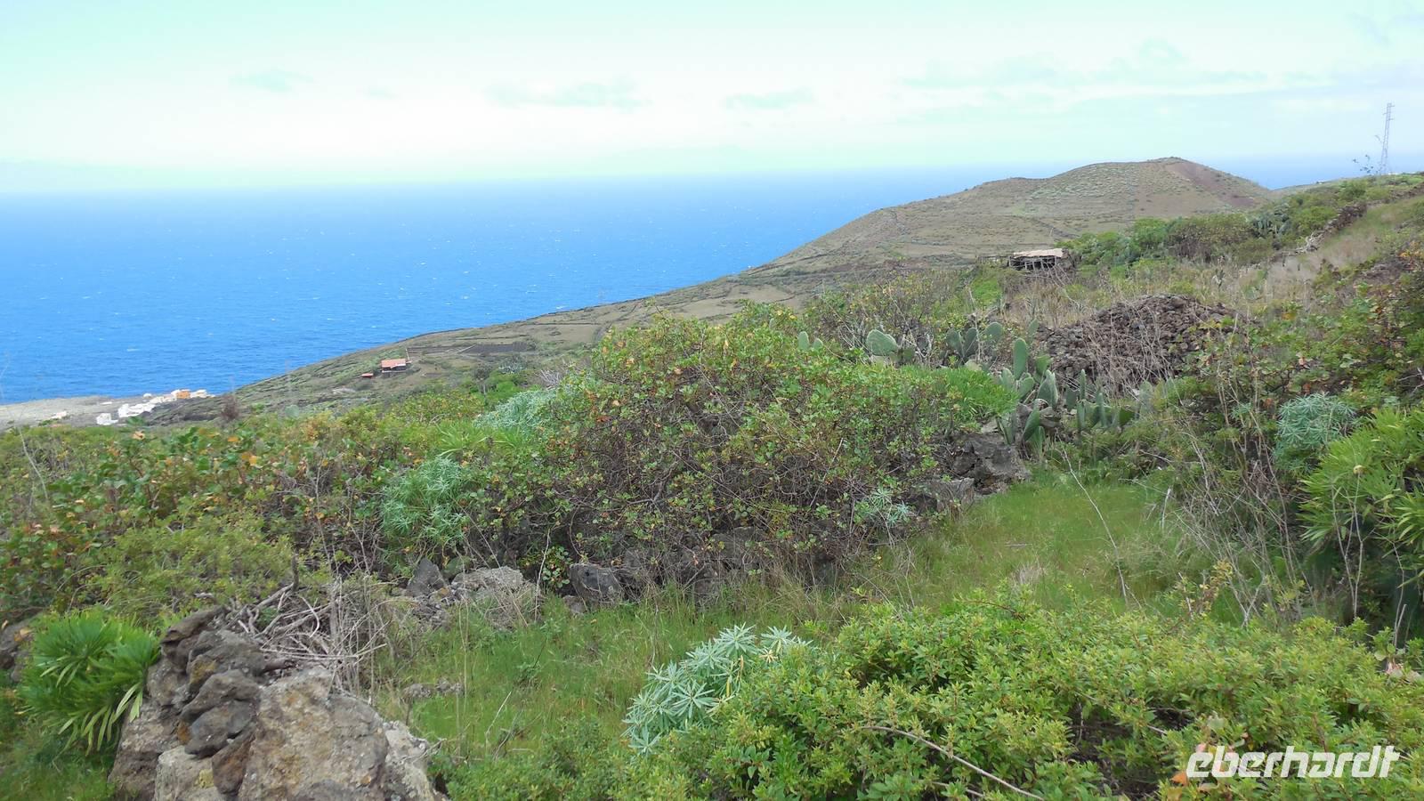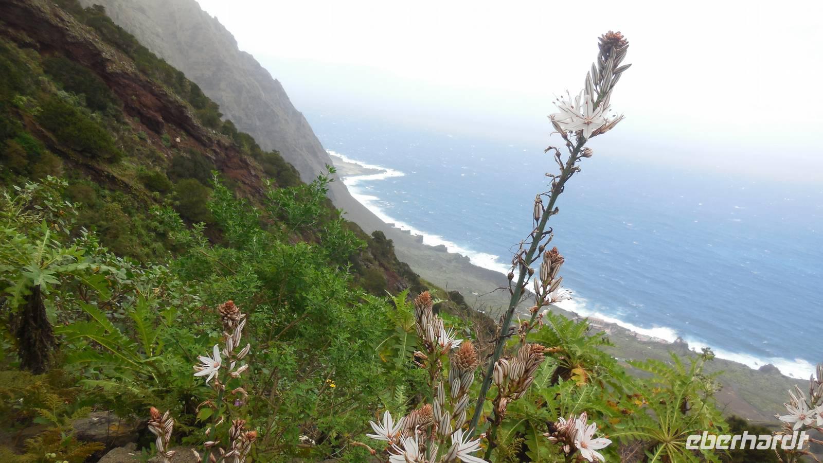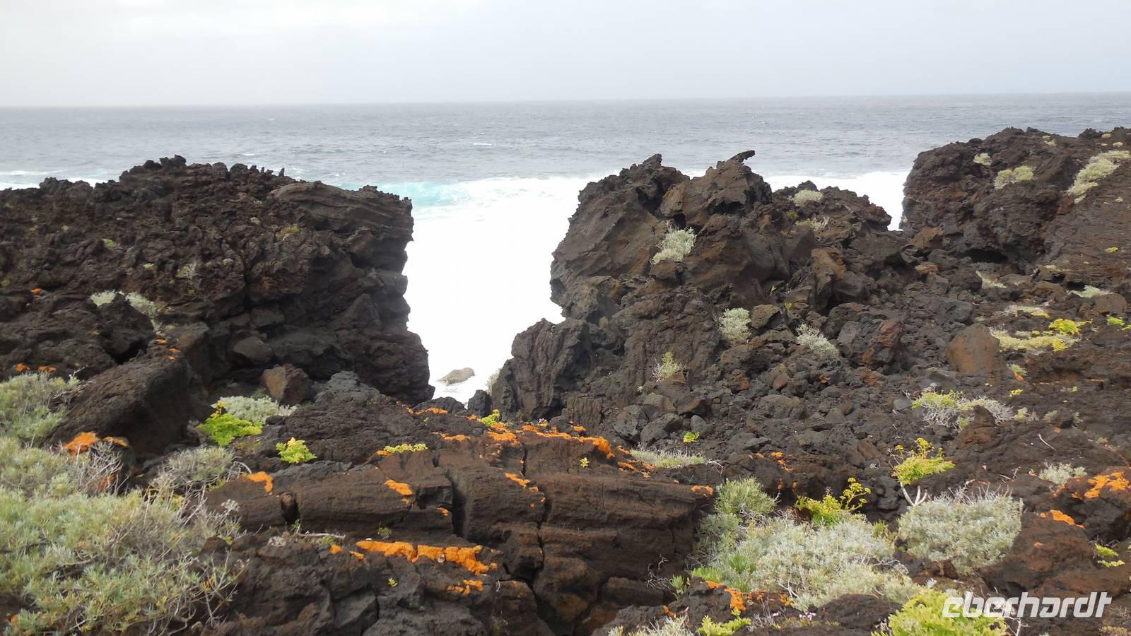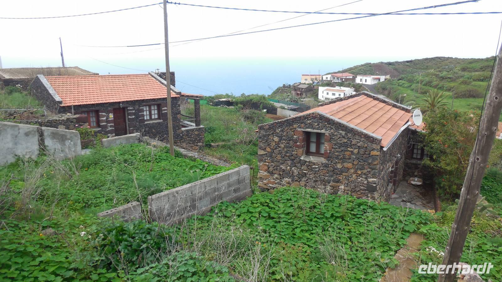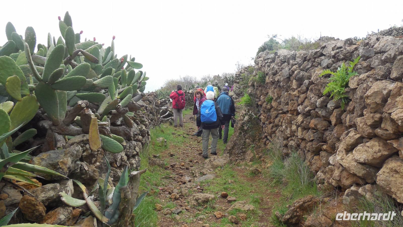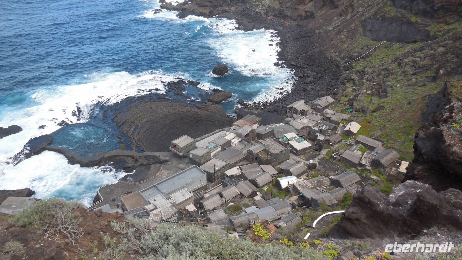 Nach einem leckeren Frühstück starten wir heute etwas später gen Küste, denn wir wollen ins Tal bis an die Badestelle bei La Caleta wandern. Heute gibt es außnahmsweise mal keinen dichten Nebel, dafür aber einen ziemlich starken Wind. Unser Weg führt uns zunächst ins idyllische Dörfchen Echedo, welches aufgrund seiner günstigen Lage und seiner fruchtbaren Erde bei Einsiedlern besonders beliebt ist. Nach einer kleinen Rast auf dem Dorfplatz an der Dorfkirche, an dem auch die Dorffeste stattfinden, geht es weiter durch die Weinterrassen in das Lavagebiet. Viele verlassene Häuschen stehen hier. Diese wurden oft von früheren Einwohnern, welche nach Venezuela ausgewandert sind, zurückgelassen. Außer Wein und Steinrosen gedeiht hier auf dem Lavagestein nicht viel. Immer tiefer kommen wir in das Lavagebiet und bald besteht unser Weg noch aus Geröll und schönen grünen Steinrosen. Wir finden hübsche Lavasteine, mitunter blau-lila-rot gefärbt. Gut aufpassen müssen wir hier, denn als wir den Bergkamm entlang gehen, gähnt links neben uns sogleich der Abgrund. El Hierro ist eine sehr steile Insel, wie wir heute deutlich bemerken. Wir haben die ganze Zeit das blaue Meer im Blick, zwischendurch sehen wir von weiten sogar die Spitze des Teide über den Wolken. Eine Mittagsrast legen wir an der Wegkreuzung zwischen Malpaso, Valverde, Echedo und Valverde ein. Hier haben wir einen tollen Blick auf das untenliegende Dörfchen Tamaduste und den Flughafen von El Hierro. Wir verschnaufen eine Weile und lassen die Aussicht auf uns wirken. Dann geht es weiter hinunter ins Tal, vorbei oberhalb von Tamaguste am Berg entlang nach La Caleta. Reiseleiter Ralf zeigt uns interessante Gewächse, wie die Wolfsmilchbäume. Merkwürdigerweise finden wir auf dieser Strecke, hoch oben auch Muscheln und große Schneckengehäuse.