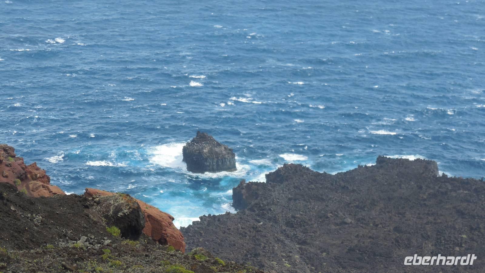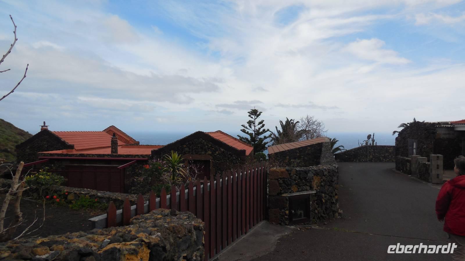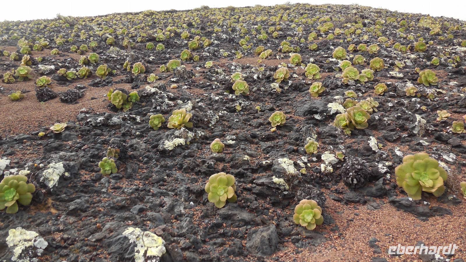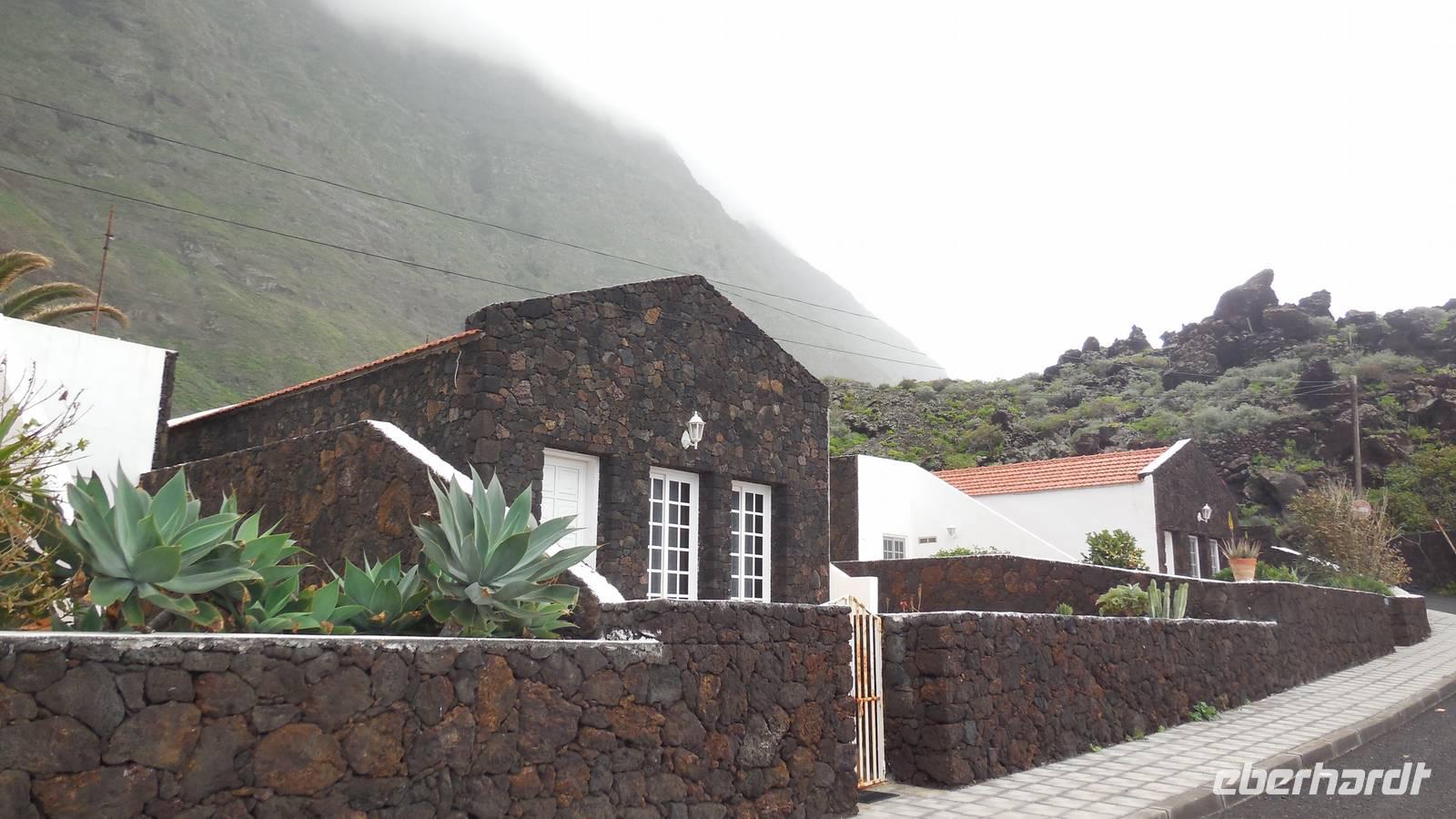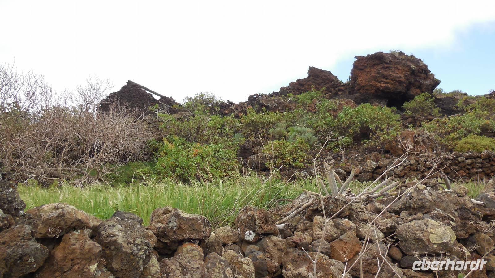 Nach einem leckeren Frühstück starten wir heute etwas später gen Küste, denn wir wollen ins Tal bis an die Badestelle bei La Caleta wandern. Heute gibt es außnahmsweise mal keinen dichten Nebel, dafür aber einen ziemlich starken Wind. Unser Weg führt uns zunächst ins idyllische Dörfchen Echedo, welches aufgrund seiner günstigen Lage und seiner fruchtbaren Erde bei Einsiedlern besonders beliebt ist. Nach einer kleinen Rast auf dem Dorfplatz an der Dorfkirche, an dem auch die Dorffeste stattfinden, geht es weiter durch die Weinterrassen in das Lavagebiet. Viele verlassene Häuschen stehen hier. Diese wurden oft von früheren Einwohnern, welche nach Venezuela ausgewandert sind, zurückgelassen. Außer Wein und Steinrosen gedeiht hier auf dem Lavagestein nicht viel. Immer tiefer kommen wir in das Lavagebiet und bald besteht unser Weg noch aus Geröll und schönen grünen Steinrosen. Wir finden hübsche Lavasteine, mitunter blau-lila-rot gefärbt. Gut aufpassen müssen wir hier, denn als wir den Bergkamm entlang gehen, gähnt links neben uns sogleich der Abgrund. El Hierro ist eine sehr steile Insel, wie wir heute deutlich bemerken. Wir haben die ganze Zeit das blaue Meer im Blick, zwischendurch sehen wir von weiten sogar die Spitze des Teide über den Wolken. Eine Mittagsrast legen wir an der Wegkreuzung zwischen Malpaso, Valverde, Echedo und Valverde ein. Hier haben wir einen tollen Blick auf das untenliegende Dörfchen Tamaduste und den Flughafen von El Hierro. Wir verschnaufen eine Weile und lassen die Aussicht auf uns wirken. Dann geht es weiter hinunter ins Tal, vorbei oberhalb von Tamaguste am Berg entlang nach La Caleta. Reiseleiter Ralf zeigt uns interessante Gewächse, wie die Wolfsmilchbäume. Merkwürdigerweise finden wir auf dieser Strecke, hoch oben auch Muscheln und große Schneckengehäuse.