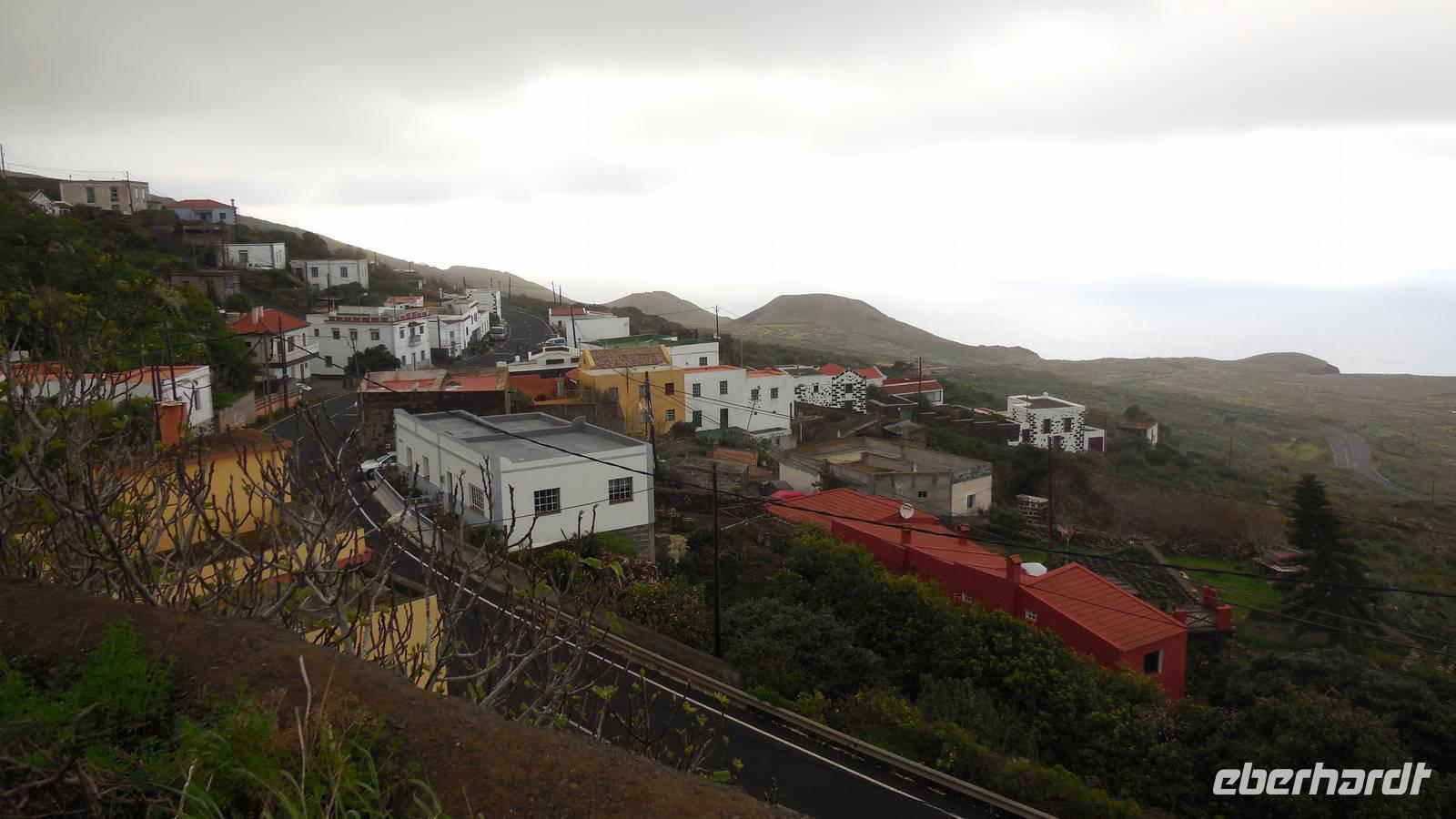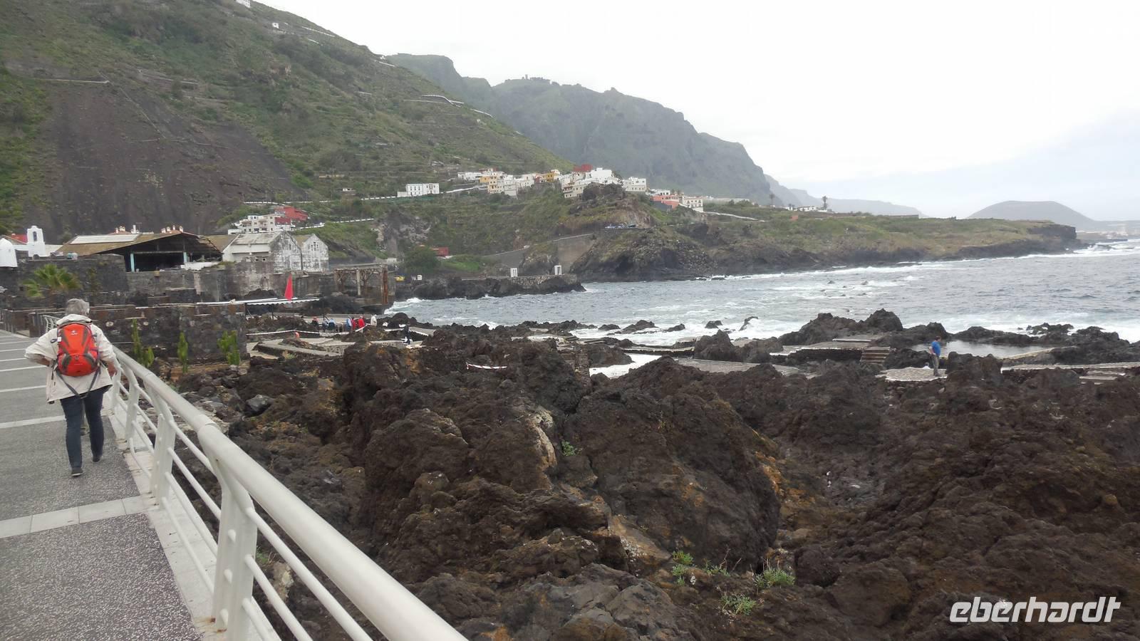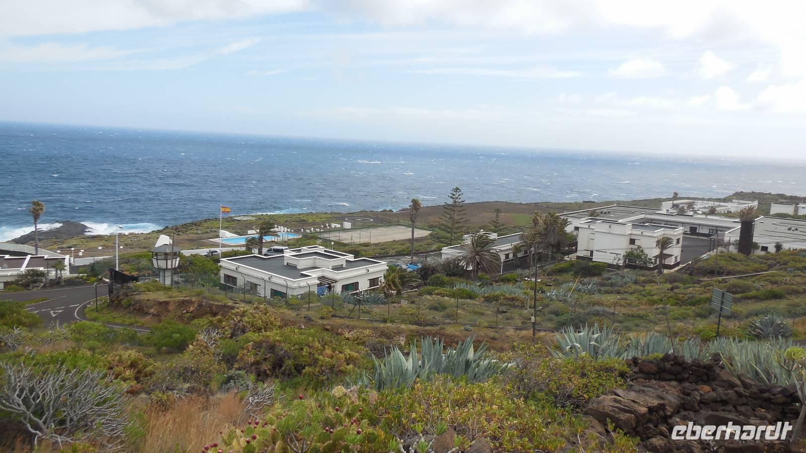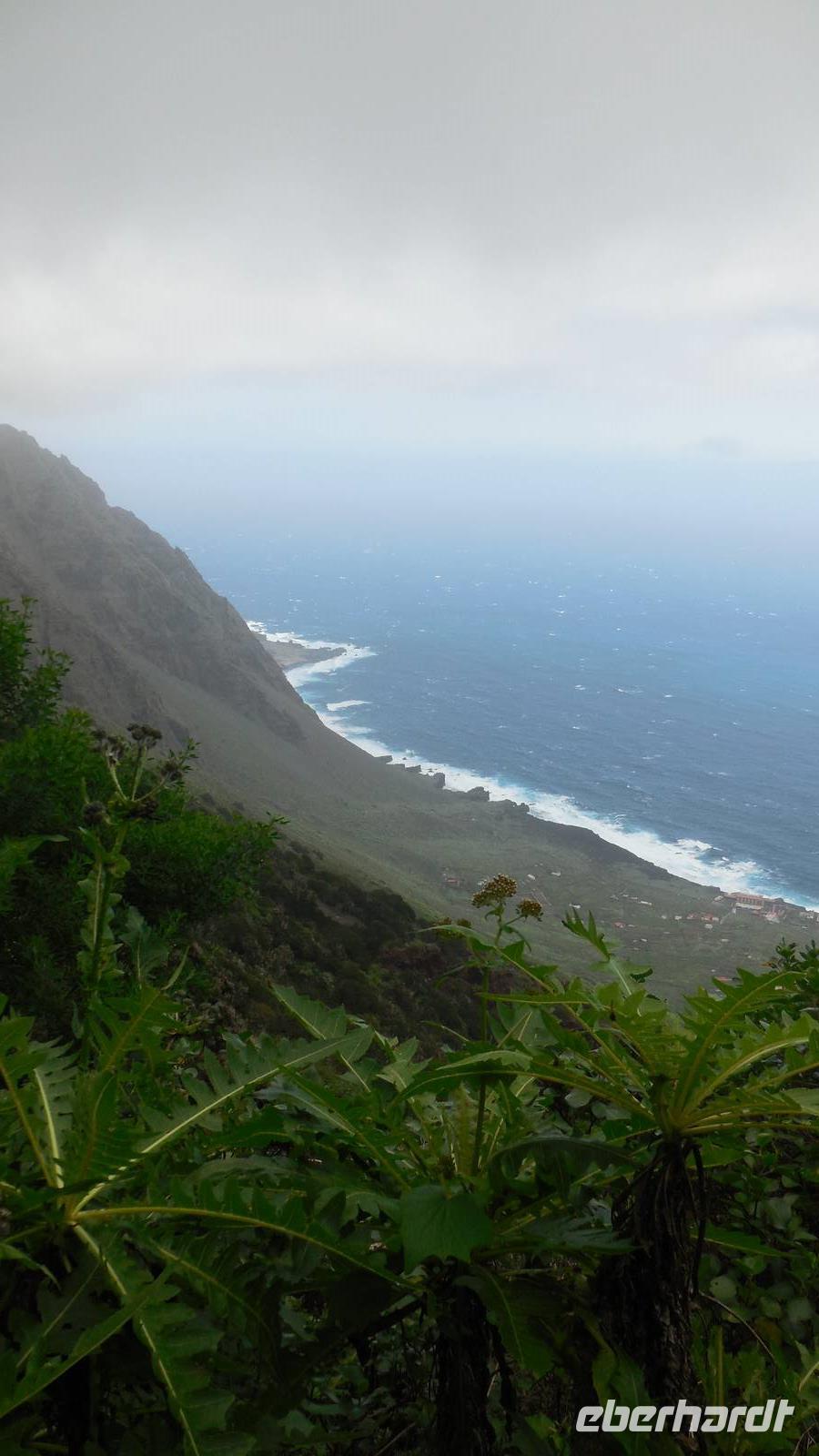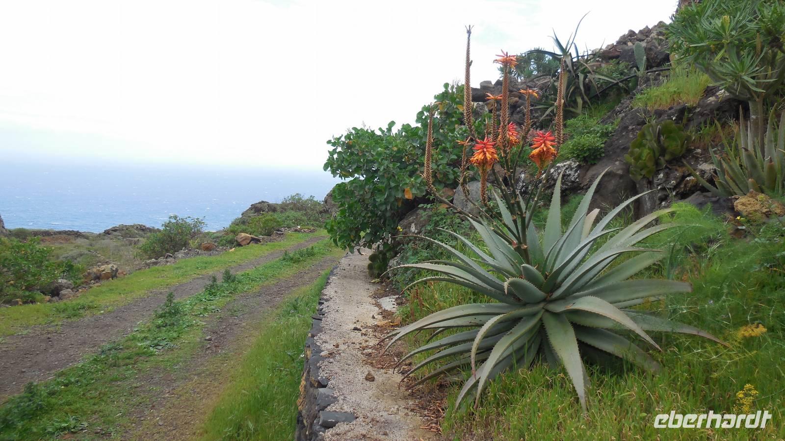 Nach einem leckeren Frühstück starten wir heute etwas später gen Küste, denn wir wollen ins Tal bis an die Badestelle bei La Caleta wandern. Heute gibt es außnahmsweise mal keinen dichten Nebel, dafür aber einen ziemlich starken Wind. Unser Weg führt uns zunächst ins idyllische Dörfchen Echedo, welches aufgrund seiner günstigen Lage und seiner fruchtbaren Erde bei Einsiedlern besonders beliebt ist. Nach einer kleinen Rast auf dem Dorfplatz an der Dorfkirche, an dem auch die Dorffeste stattfinden, geht es weiter durch die Weinterrassen in das Lavagebiet. Viele verlassene Häuschen stehen hier. Diese wurden oft von früheren Einwohnern, welche nach Venezuela ausgewandert sind, zurückgelassen. Außer Wein und Steinrosen gedeiht hier auf dem Lavagestein nicht viel. Immer tiefer kommen wir in das Lavagebiet und bald besteht unser Weg noch aus Geröll und schönen grünen Steinrosen. Wir finden hübsche Lavasteine, mitunter blau-lila-rot gefärbt. Gut aufpassen müssen wir hier, denn als wir den Bergkamm entlang gehen, gähnt links neben uns sogleich der Abgrund. El Hierro ist eine sehr steile Insel, wie wir heute deutlich bemerken. Wir haben die ganze Zeit das blaue Meer im Blick, zwischendurch sehen wir von weiten sogar die Spitze des Teide über den Wolken. Eine Mittagsrast legen wir an der Wegkreuzung zwischen Malpaso, Valverde, Echedo und Valverde ein. Hier haben wir einen tollen Blick auf das untenliegende Dörfchen Tamaduste und den Flughafen von El Hierro. Wir verschnaufen eine Weile und lassen die Aussicht auf uns wirken. Dann geht es weiter hinunter ins Tal, vorbei oberhalb von Tamaguste am Berg entlang nach La Caleta. Reiseleiter Ralf zeigt uns interessante Gewächse, wie die Wolfsmilchbäume. Merkwürdigerweise finden wir auf dieser Strecke, hoch oben auch Muscheln und große Schneckengehäuse.