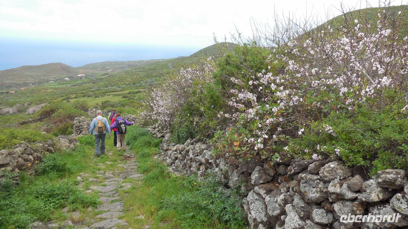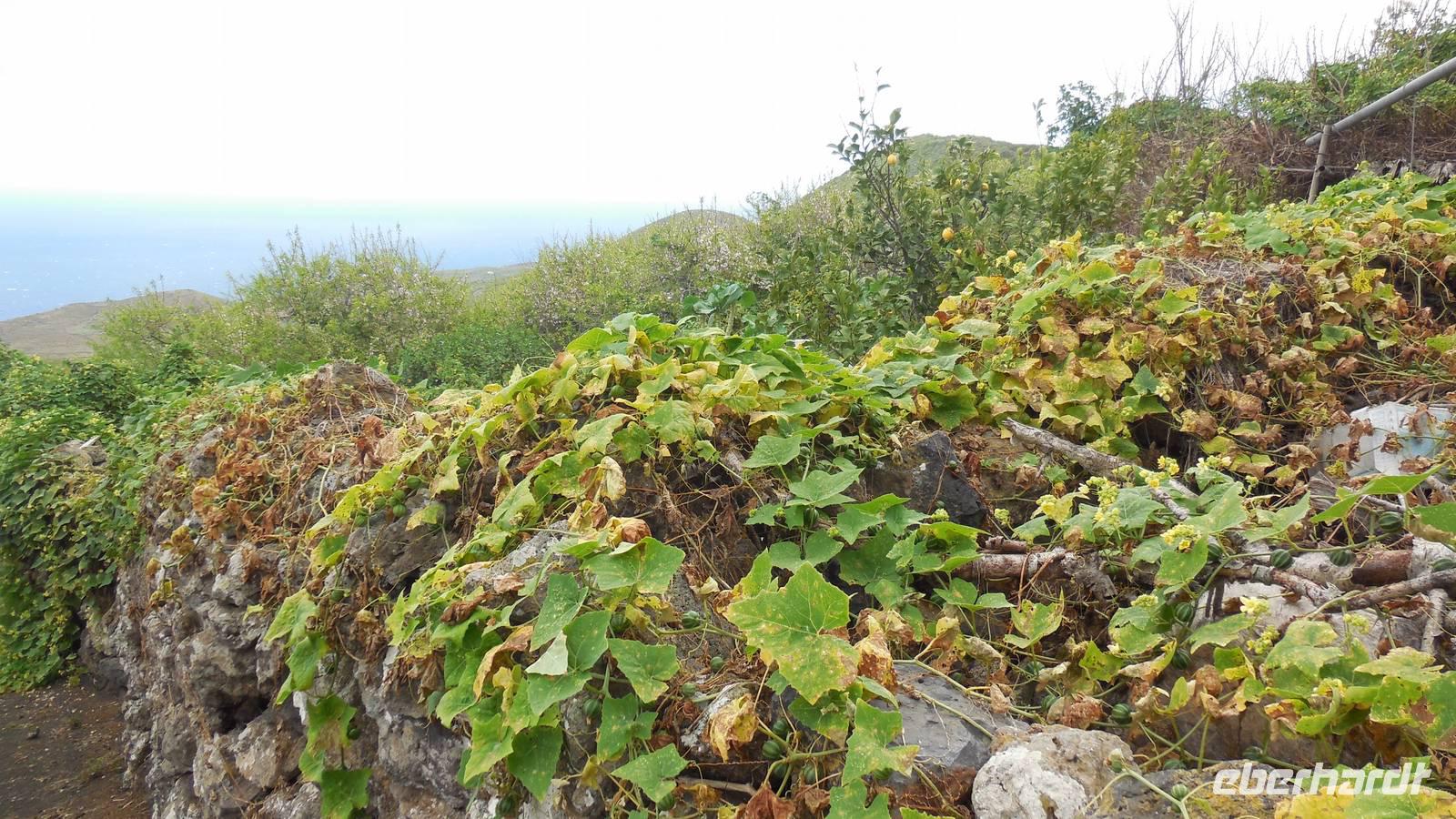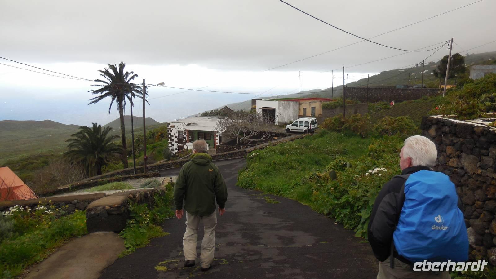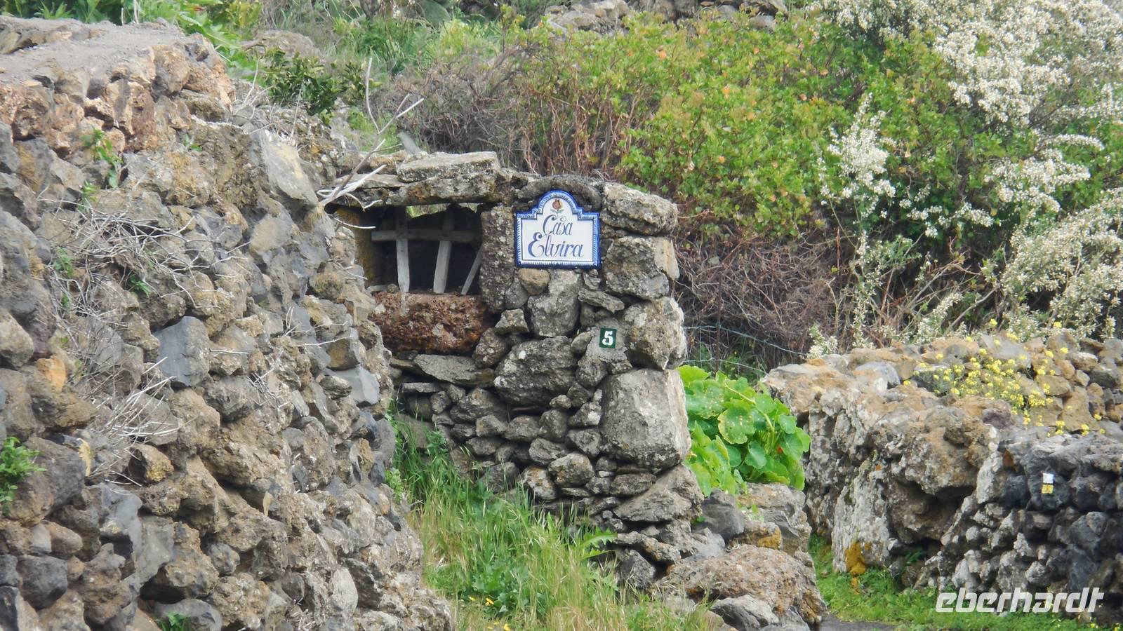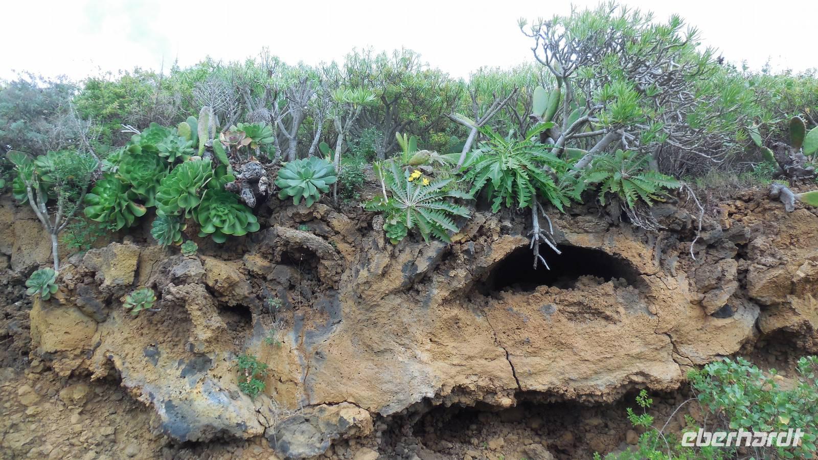 Nach einem leckeren Frühstück starten wir heute etwas später gen Küste, denn wir wollen ins Tal bis an die Badestelle bei La Caleta wandern. Heute gibt es außnahmsweise mal keinen dichten Nebel, dafür aber einen ziemlich starken Wind. Unser Weg führt uns zunächst ins idyllische Dörfchen Echedo, welches aufgrund seiner günstigen Lage und seiner fruchtbaren Erde bei Einsiedlern besonders beliebt ist. Nach einer kleinen Rast auf dem Dorfplatz an der Dorfkirche, an dem auch die Dorffeste stattfinden, geht es weiter durch die Weinterrassen in das Lavagebiet. Viele verlassene Häuschen stehen hier. Diese wurden oft von früheren Einwohnern, welche nach Venezuela ausgewandert sind, zurückgelassen. Außer Wein und Steinrosen gedeiht hier auf dem Lavagestein nicht viel. Immer tiefer kommen wir in das Lavagebiet und bald besteht unser Weg noch aus Geröll und schönen grünen Steinrosen. Wir finden hübsche Lavasteine, mitunter blau-lila-rot gefärbt. Gut aufpassen müssen wir hier, denn als wir den Bergkamm entlang gehen, gähnt links neben uns sogleich der Abgrund. El Hierro ist eine sehr steile Insel, wie wir heute deutlich bemerken. Wir haben die ganze Zeit das blaue Meer im Blick, zwischendurch sehen wir von weiten sogar die Spitze des Teide über den Wolken. Eine Mittagsrast legen wir an der Wegkreuzung zwischen Malpaso, Valverde, Echedo und Valverde ein. Hier haben wir einen tollen Blick auf das untenliegende Dörfchen Tamaduste und den Flughafen von El Hierro. Wir verschnaufen eine Weile und lassen die Aussicht auf uns wirken. Dann geht es weiter hinunter ins Tal, vorbei oberhalb von Tamaguste am Berg entlang nach La Caleta. Reiseleiter Ralf zeigt uns interessante Gewächse, wie die Wolfsmilchbäume. Merkwürdigerweise finden wir auf dieser Strecke, hoch oben auch Muscheln und große Schneckengehäuse.