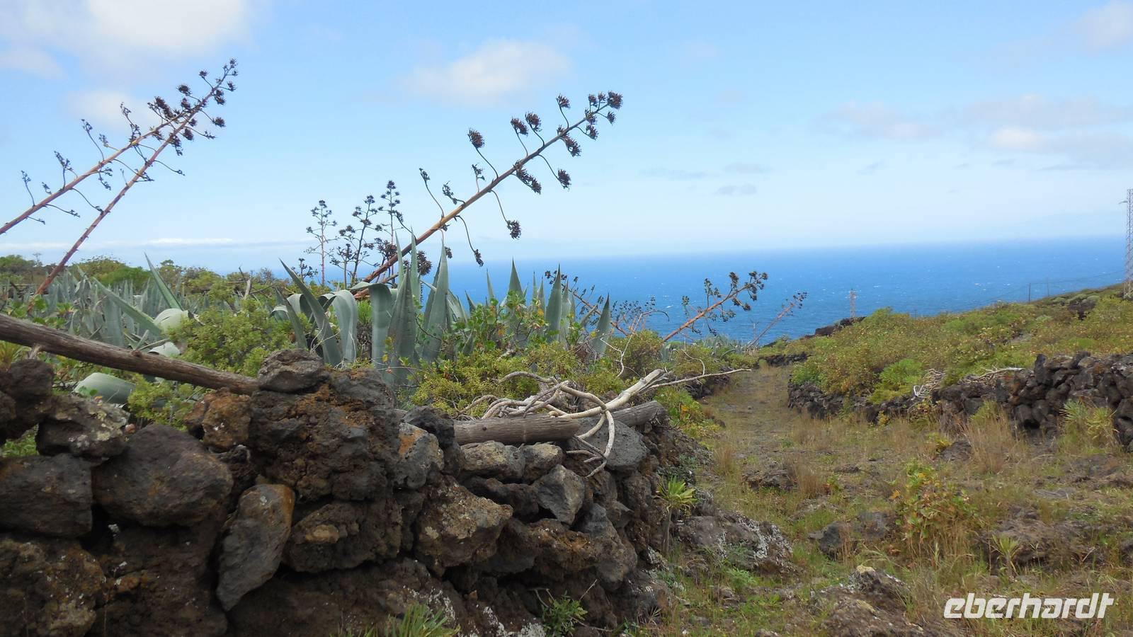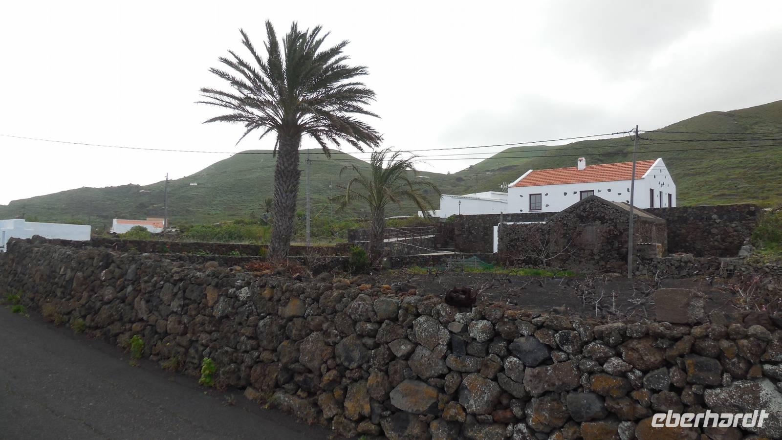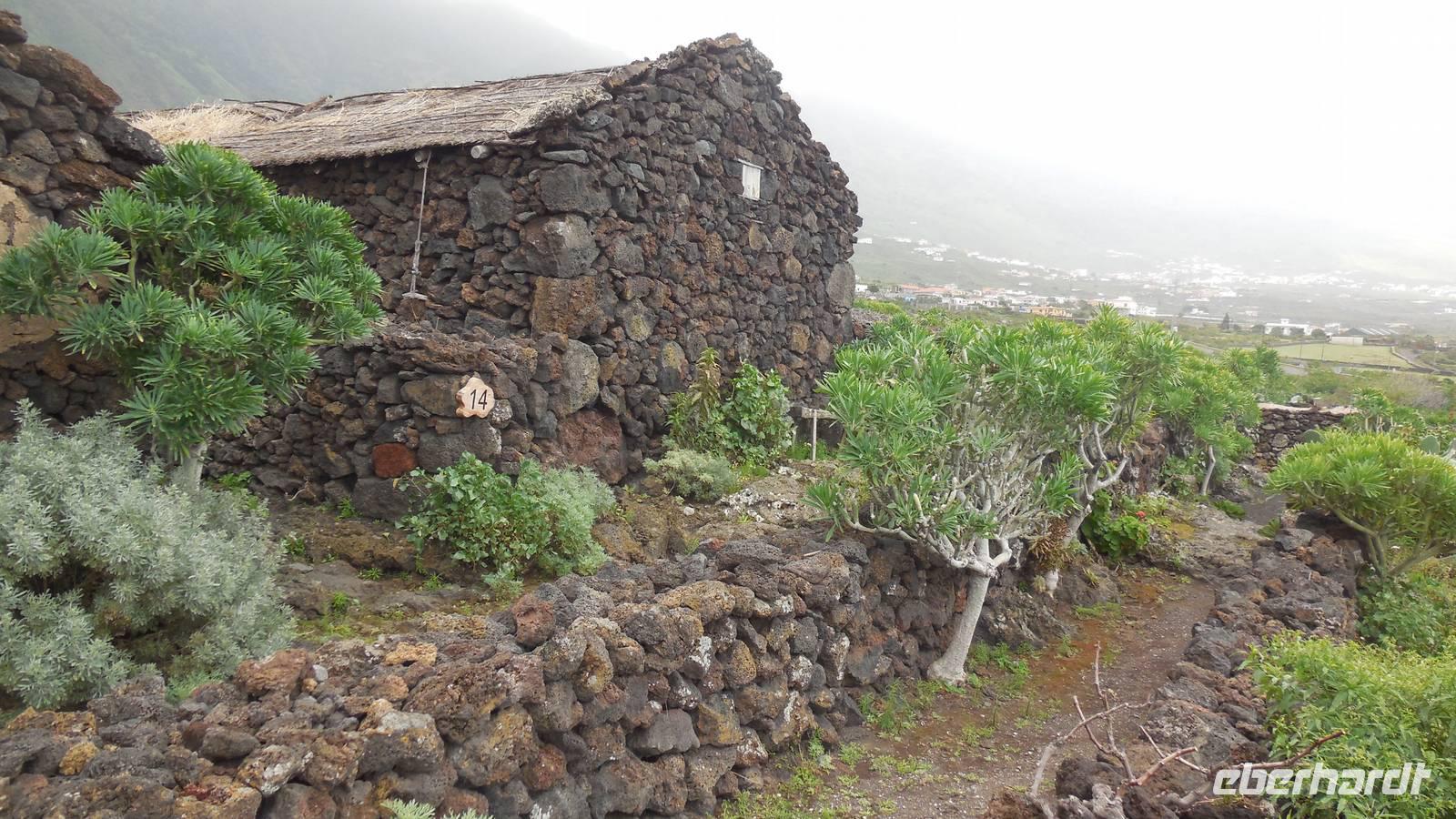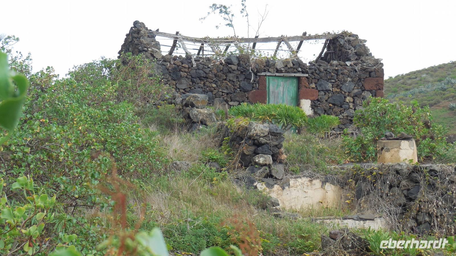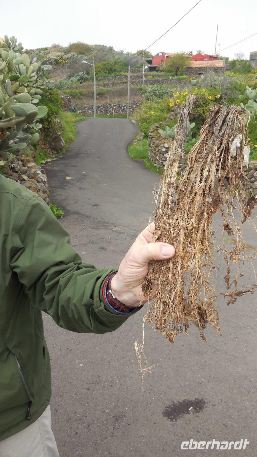 Nach einem leckeren Frühstück starten wir heute etwas später gen Küste, denn wir wollen ins Tal bis an die Badestelle bei La Caleta wandern. Heute gibt es außnahmsweise mal keinen dichten Nebel, dafür aber einen ziemlich starken Wind. Unser Weg führt uns zunächst ins idyllische Dörfchen Echedo, welches aufgrund seiner günstigen Lage und seiner fruchtbaren Erde bei Einsiedlern besonders beliebt ist. Nach einer kleinen Rast auf dem Dorfplatz an der Dorfkirche, an dem auch die Dorffeste stattfinden, geht es weiter durch die Weinterrassen in das Lavagebiet. Viele verlassene Häuschen stehen hier. Diese wurden oft von früheren Einwohnern, welche nach Venezuela ausgewandert sind, zurückgelassen. Außer Wein und Steinrosen gedeiht hier auf dem Lavagestein nicht viel. Immer tiefer kommen wir in das Lavagebiet und bald besteht unser Weg noch aus Geröll und schönen grünen Steinrosen. Wir finden hübsche Lavasteine, mitunter blau-lila-rot gefärbt. Gut aufpassen müssen wir hier, denn als wir den Bergkamm entlang gehen, gähnt links neben uns sogleich der Abgrund. El Hierro ist eine sehr steile Insel, wie wir heute deutlich bemerken. Wir haben die ganze Zeit das blaue Meer im Blick, zwischendurch sehen wir von weiten sogar die Spitze des Teide über den Wolken. Eine Mittagsrast legen wir an der Wegkreuzung zwischen Malpaso, Valverde, Echedo und Valverde ein. Hier haben wir einen tollen Blick auf das untenliegende Dörfchen Tamaduste und den Flughafen von El Hierro. Wir verschnaufen eine Weile und lassen die Aussicht auf uns wirken. Dann geht es weiter hinunter ins Tal, vorbei oberhalb von Tamaguste am Berg entlang nach La Caleta. Reiseleiter Ralf zeigt uns interessante Gewächse, wie die Wolfsmilchbäume. Merkwürdigerweise finden wir auf dieser Strecke, hoch oben auch Muscheln und große Schneckengehäuse.