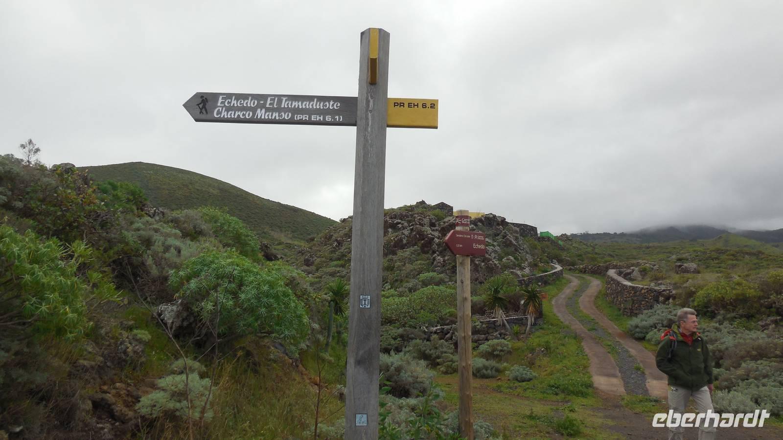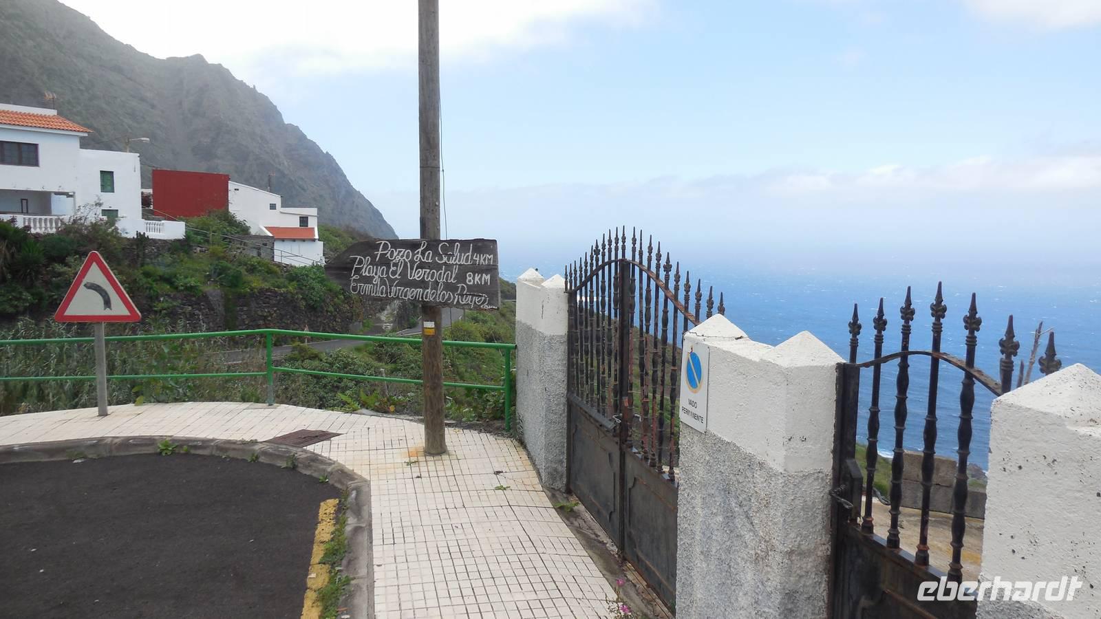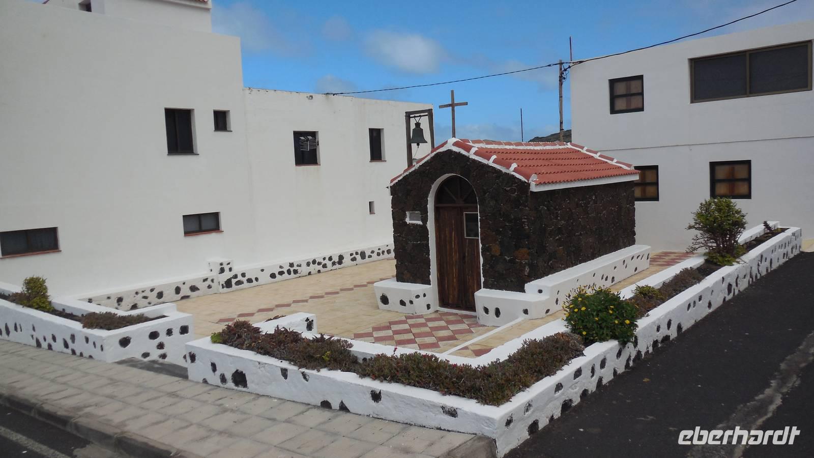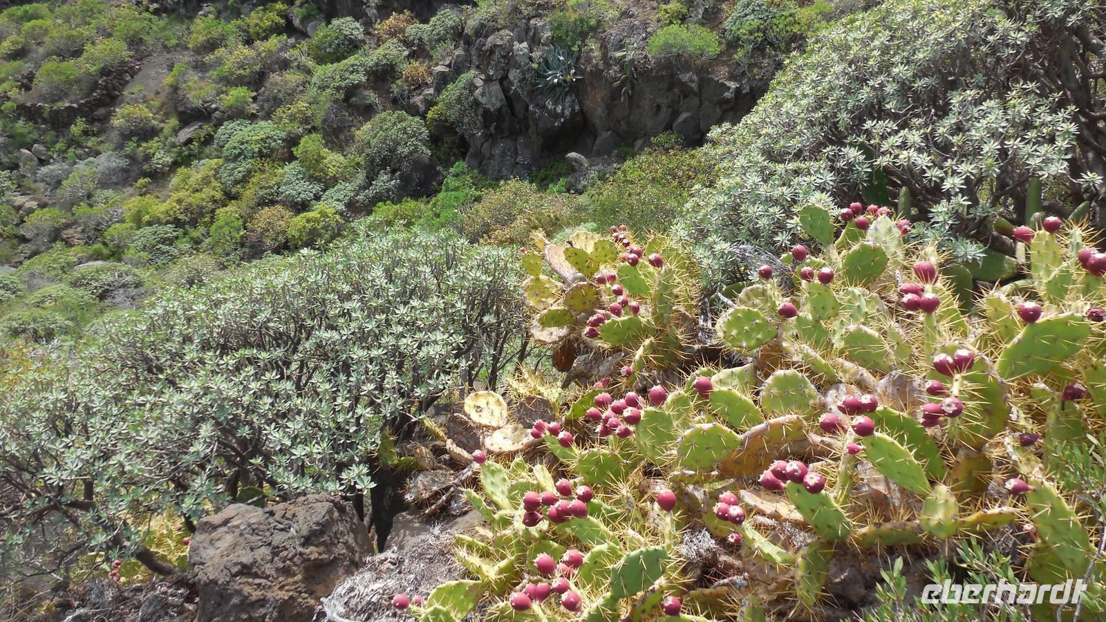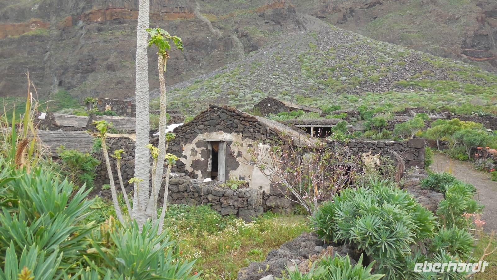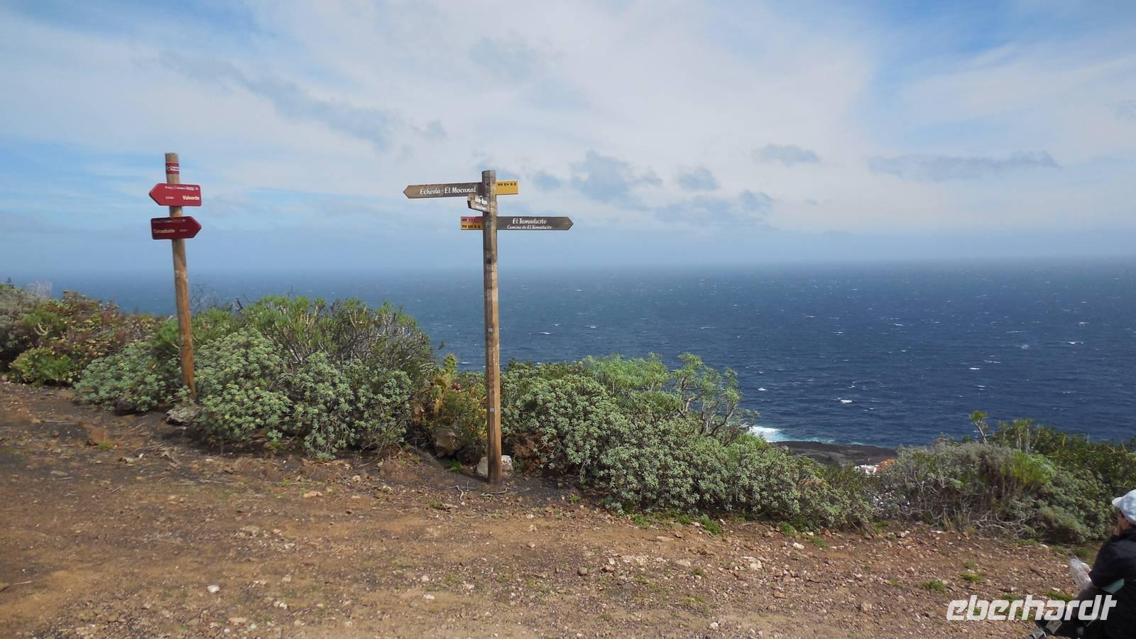 Nach einem leckeren Frühstück starten wir heute etwas später gen Küste, denn wir wollen ins Tal bis an die Badestelle bei La Caleta wandern. Heute gibt es außnahmsweise mal keinen dichten Nebel, dafür aber einen ziemlich starken Wind. Unser Weg führt uns zunächst ins idyllische Dörfchen Echedo, welches aufgrund seiner günstigen Lage und seiner fruchtbaren Erde bei Einsiedlern besonders beliebt ist. Nach einer kleinen Rast auf dem Dorfplatz an der Dorfkirche, an dem auch die Dorffeste stattfinden, geht es weiter durch die Weinterrassen in das Lavagebiet. Viele verlassene Häuschen stehen hier. Diese wurden oft von früheren Einwohnern, welche nach Venezuela ausgewandert sind, zurückgelassen. Außer Wein und Steinrosen gedeiht hier auf dem Lavagestein nicht viel. Immer tiefer kommen wir in das Lavagebiet und bald besteht unser Weg noch aus Geröll und schönen grünen Steinrosen. Wir finden hübsche Lavasteine, mitunter blau-lila-rot gefärbt. Gut aufpassen müssen wir hier, denn als wir den Bergkamm entlang gehen, gähnt links neben uns sogleich der Abgrund. El Hierro ist eine sehr steile Insel, wie wir heute deutlich bemerken. Wir haben die ganze Zeit das blaue Meer im Blick, zwischendurch sehen wir von weiten sogar die Spitze des Teide über den Wolken. Eine Mittagsrast legen wir an der Wegkreuzung zwischen Malpaso, Valverde, Echedo und Valverde ein. Hier haben wir einen tollen Blick auf das untenliegende Dörfchen Tamaduste und den Flughafen von El Hierro. Wir verschnaufen eine Weile und lassen die Aussicht auf uns wirken. Dann geht es weiter hinunter ins Tal, vorbei oberhalb von Tamaguste am Berg entlang nach La Caleta. Reiseleiter Ralf zeigt uns interessante Gewächse, wie die Wolfsmilchbäume. Merkwürdigerweise finden wir auf dieser Strecke, hoch oben auch Muscheln und große Schneckengehäuse.