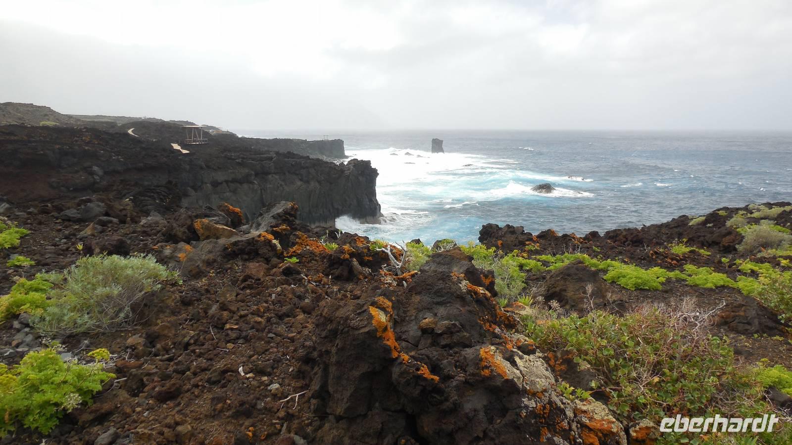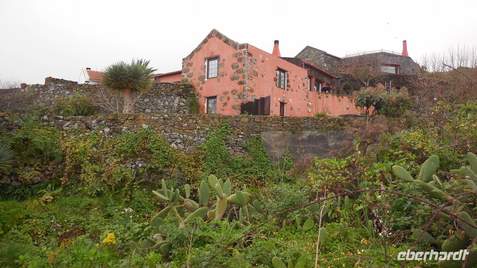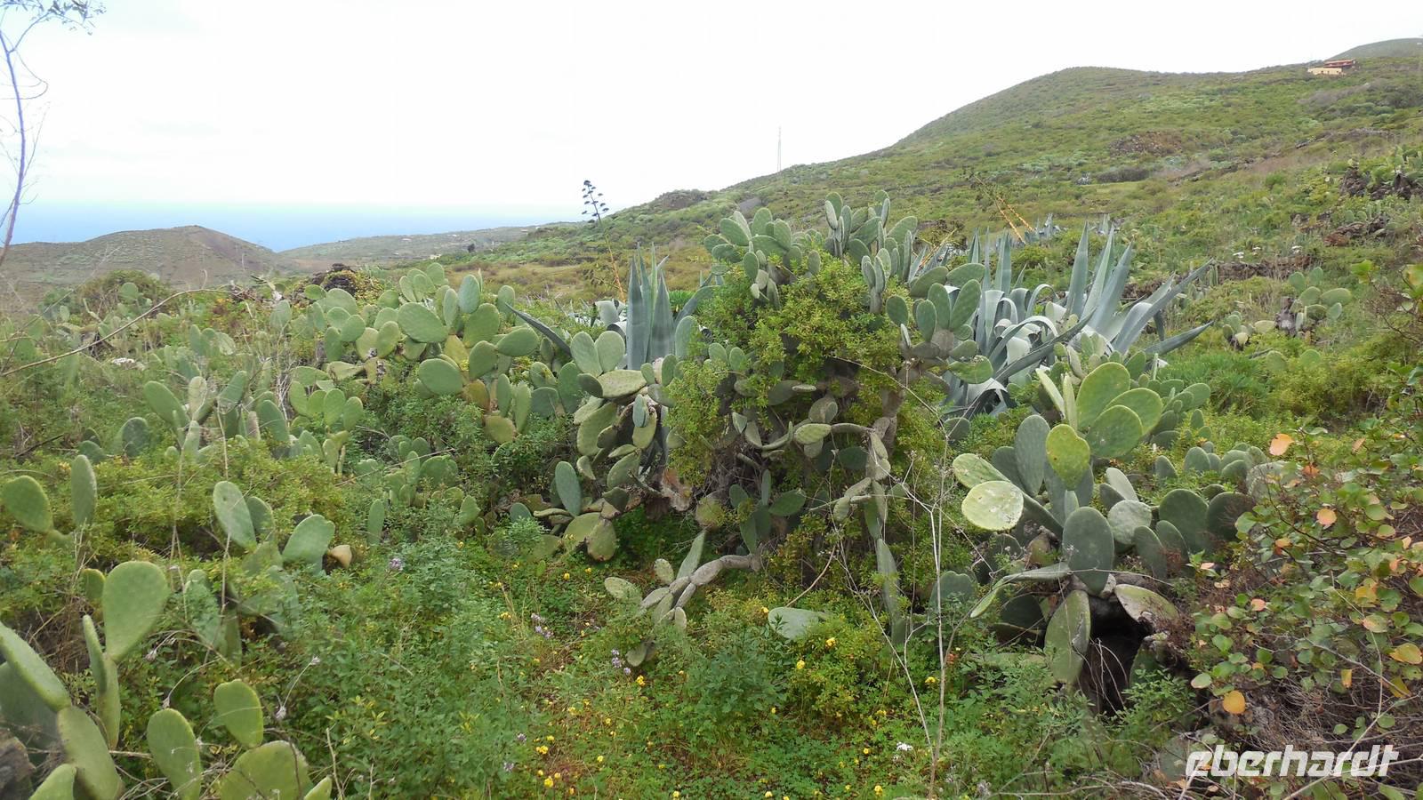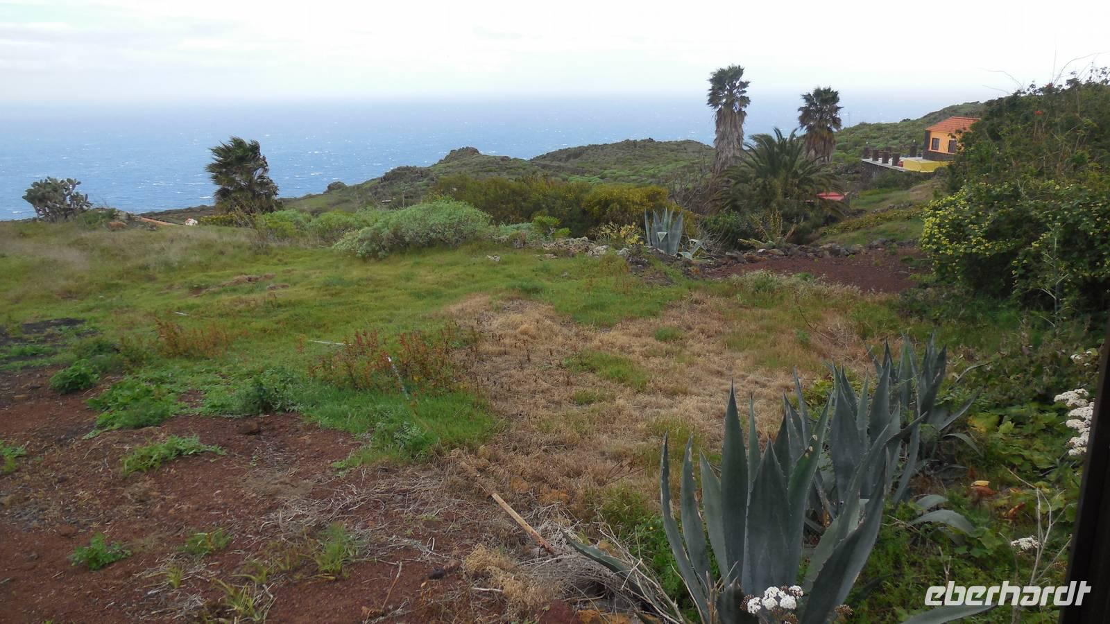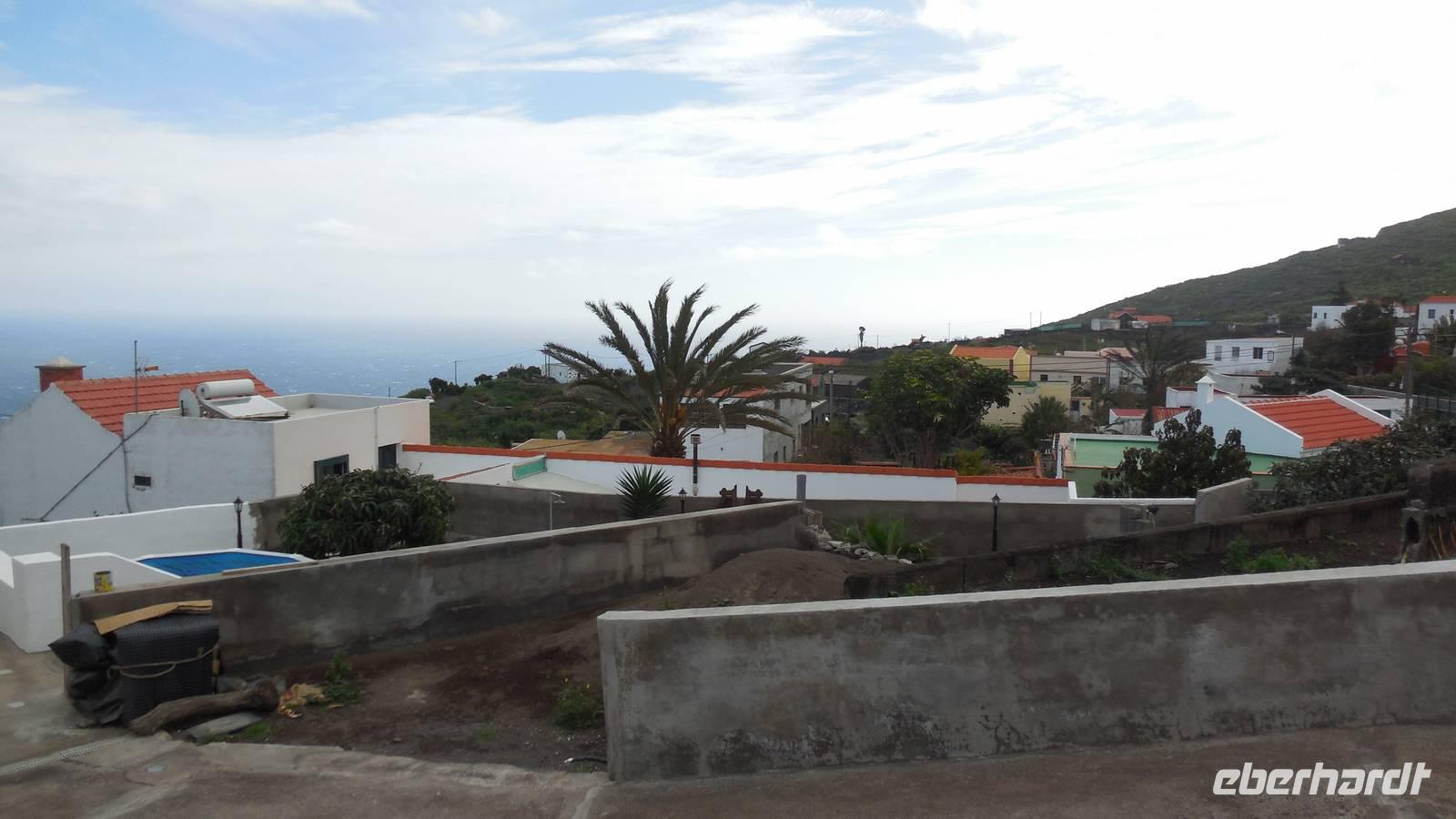 Nach einem leckeren Frühstück starten wir heute etwas später gen Küste, denn wir wollen ins Tal bis an die Badestelle bei La Caleta wandern. Heute gibt es außnahmsweise mal keinen dichten Nebel, dafür aber einen ziemlich starken Wind. Unser Weg führt uns zunächst ins idyllische Dörfchen Echedo, welches aufgrund seiner günstigen Lage und seiner fruchtbaren Erde bei Einsiedlern besonders beliebt ist. Nach einer kleinen Rast auf dem Dorfplatz an der Dorfkirche, an dem auch die Dorffeste stattfinden, geht es weiter durch die Weinterrassen in das Lavagebiet. Viele verlassene Häuschen stehen hier. Diese wurden oft von früheren Einwohnern, welche nach Venezuela ausgewandert sind, zurückgelassen. Außer Wein und Steinrosen gedeiht hier auf dem Lavagestein nicht viel. Immer tiefer kommen wir in das Lavagebiet und bald besteht unser Weg noch aus Geröll und schönen grünen Steinrosen. Wir finden hübsche Lavasteine, mitunter blau-lila-rot gefärbt. Gut aufpassen müssen wir hier, denn als wir den Bergkamm entlang gehen, gähnt links neben uns sogleich der Abgrund. El Hierro ist eine sehr steile Insel, wie wir heute deutlich bemerken. Wir haben die ganze Zeit das blaue Meer im Blick, zwischendurch sehen wir von weiten sogar die Spitze des Teide über den Wolken. Eine Mittagsrast legen wir an der Wegkreuzung zwischen Malpaso, Valverde, Echedo und Valverde ein. Hier haben wir einen tollen Blick auf das untenliegende Dörfchen Tamaduste und den Flughafen von El Hierro. Wir verschnaufen eine Weile und lassen die Aussicht auf uns wirken. Dann geht es weiter hinunter ins Tal, vorbei oberhalb von Tamaguste am Berg entlang nach La Caleta. Reiseleiter Ralf zeigt uns interessante Gewächse, wie die Wolfsmilchbäume. Merkwürdigerweise finden wir auf dieser Strecke, hoch oben auch Muscheln und große Schneckengehäuse.