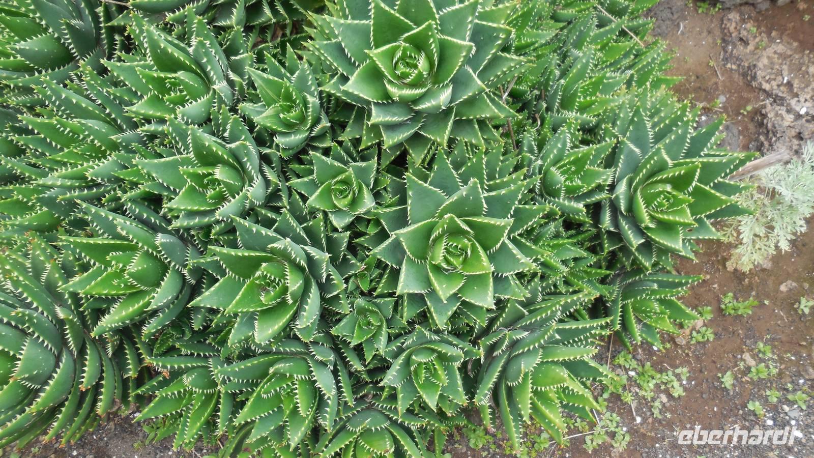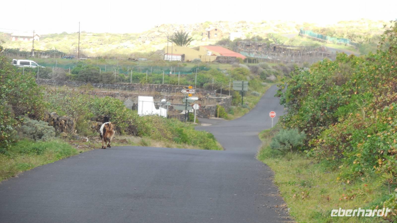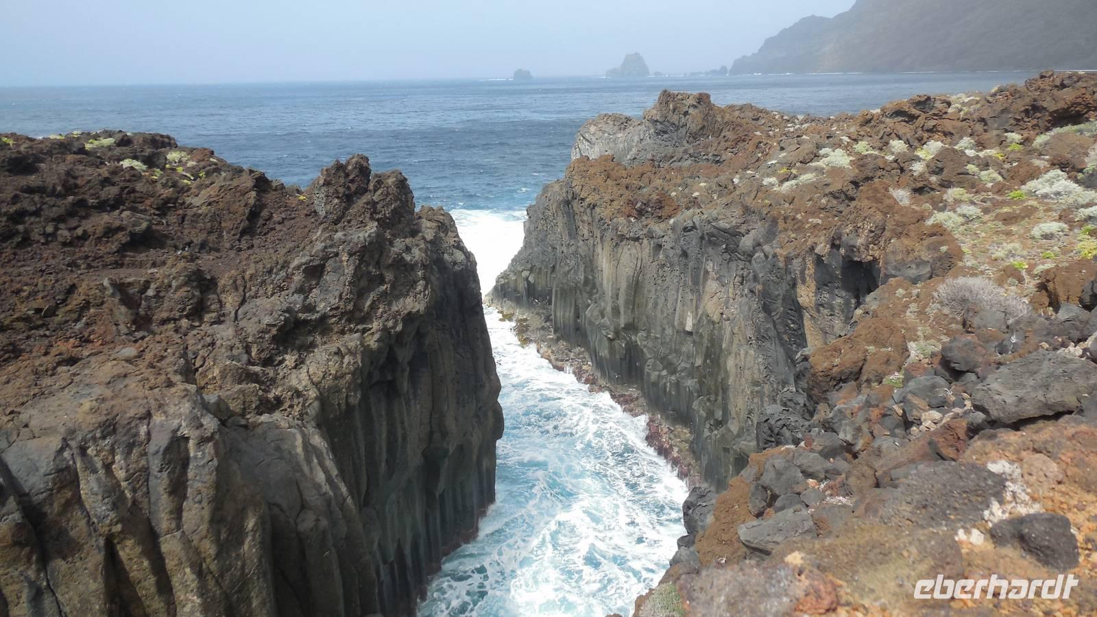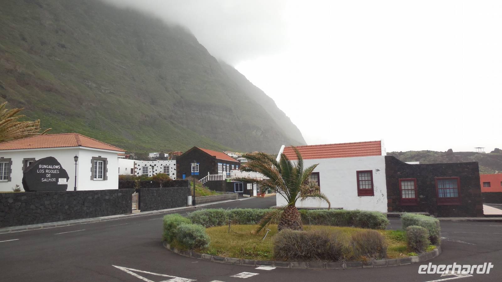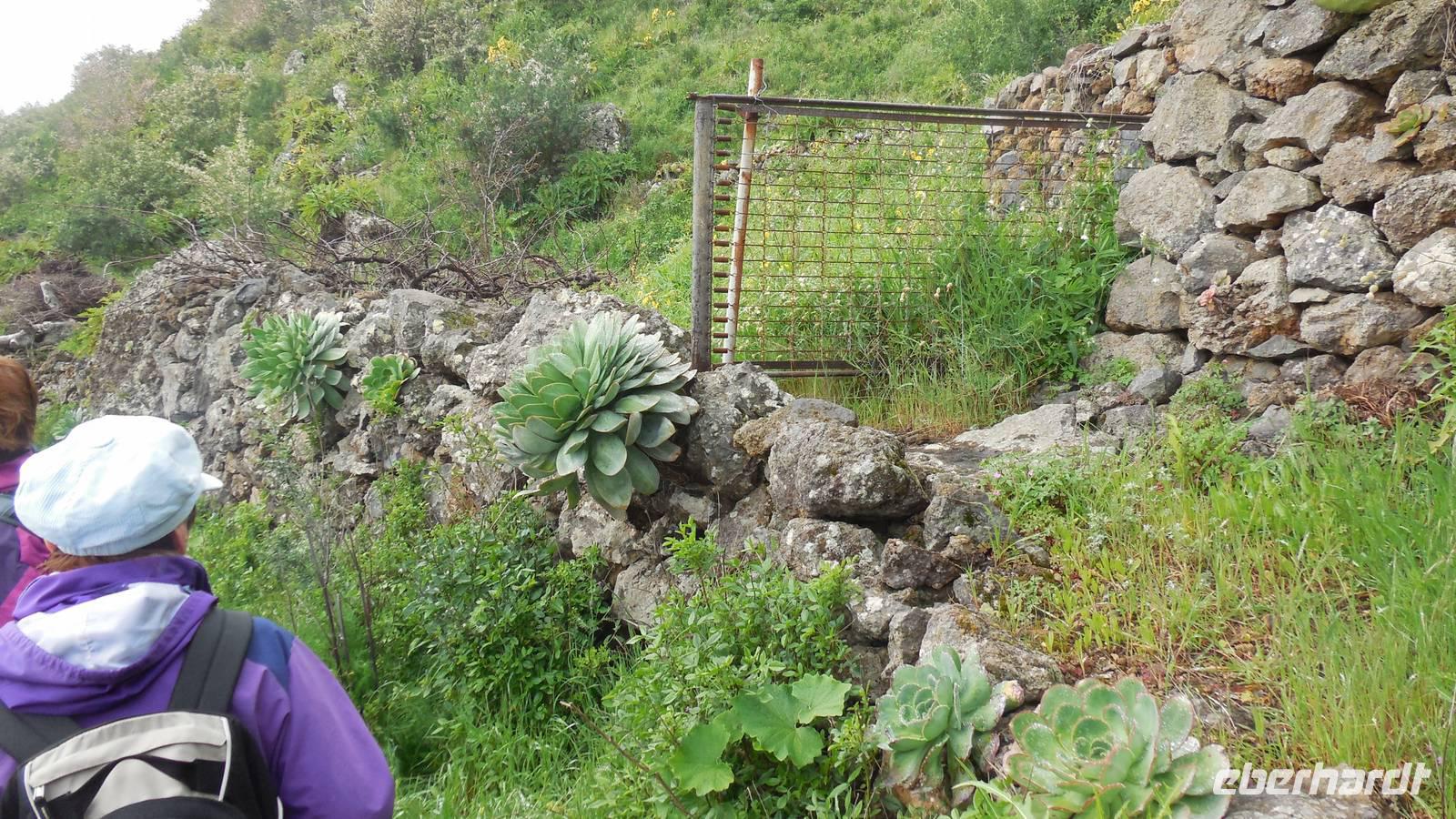 Nach einem leckeren Frühstück starten wir heute etwas später gen Küste, denn wir wollen ins Tal bis an die Badestelle bei La Caleta wandern. Heute gibt es außnahmsweise mal keinen dichten Nebel, dafür aber einen ziemlich starken Wind. Unser Weg führt uns zunächst ins idyllische Dörfchen Echedo, welches aufgrund seiner günstigen Lage und seiner fruchtbaren Erde bei Einsiedlern besonders beliebt ist. Nach einer kleinen Rast auf dem Dorfplatz an der Dorfkirche, an dem auch die Dorffeste stattfinden, geht es weiter durch die Weinterrassen in das Lavagebiet. Viele verlassene Häuschen stehen hier. Diese wurden oft von früheren Einwohnern, welche nach Venezuela ausgewandert sind, zurückgelassen. Außer Wein und Steinrosen gedeiht hier auf dem Lavagestein nicht viel. Immer tiefer kommen wir in das Lavagebiet und bald besteht unser Weg noch aus Geröll und schönen grünen Steinrosen. Wir finden hübsche Lavasteine, mitunter blau-lila-rot gefärbt. Gut aufpassen müssen wir hier, denn als wir den Bergkamm entlang gehen, gähnt links neben uns sogleich der Abgrund. El Hierro ist eine sehr steile Insel, wie wir heute deutlich bemerken. Wir haben die ganze Zeit das blaue Meer im Blick, zwischendurch sehen wir von weiten sogar die Spitze des Teide über den Wolken. Eine Mittagsrast legen wir an der Wegkreuzung zwischen Malpaso, Valverde, Echedo und Valverde ein. Hier haben wir einen tollen Blick auf das untenliegende Dörfchen Tamaduste und den Flughafen von El Hierro. Wir verschnaufen eine Weile und lassen die Aussicht auf uns wirken. Dann geht es weiter hinunter ins Tal, vorbei oberhalb von Tamaguste am Berg entlang nach La Caleta. Reiseleiter Ralf zeigt uns interessante Gewächse, wie die Wolfsmilchbäume. Merkwürdigerweise finden wir auf dieser Strecke, hoch oben auch Muscheln und große Schneckengehäuse.