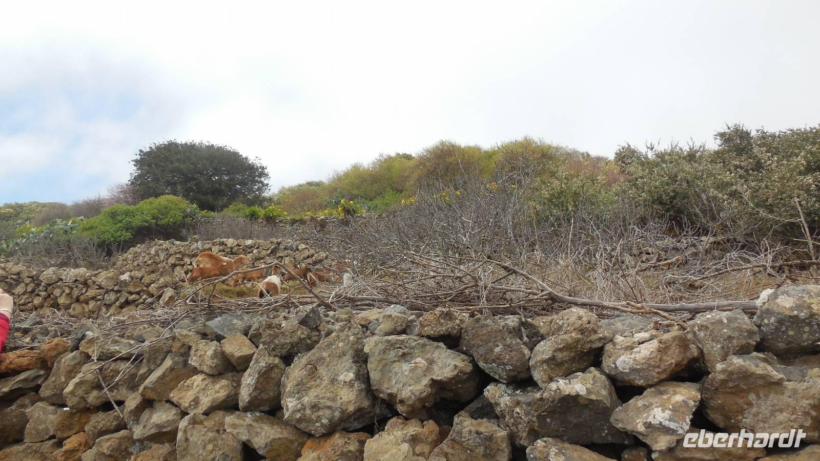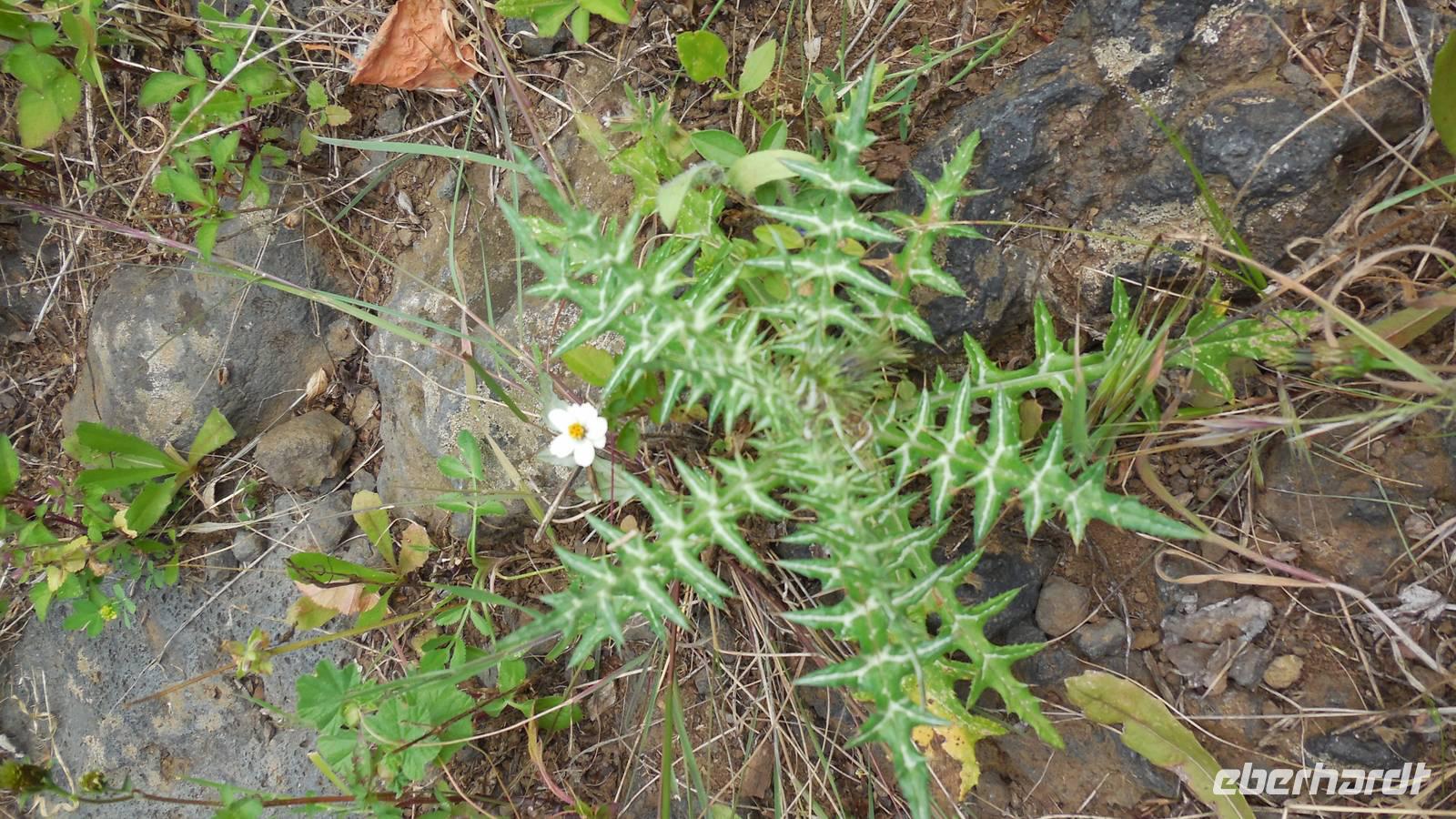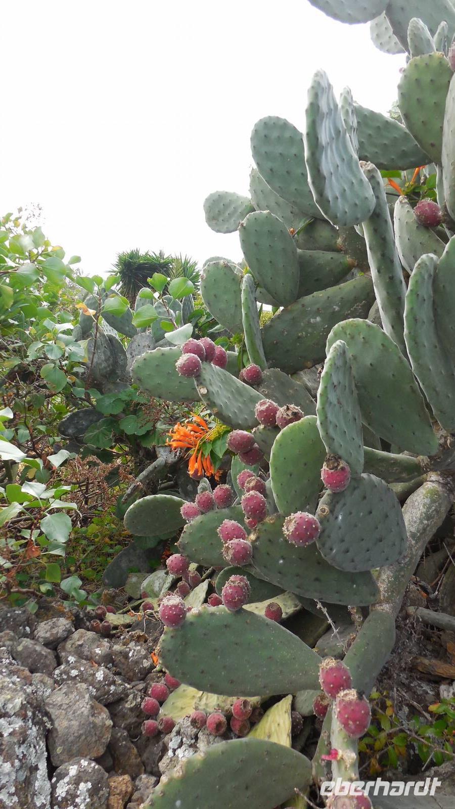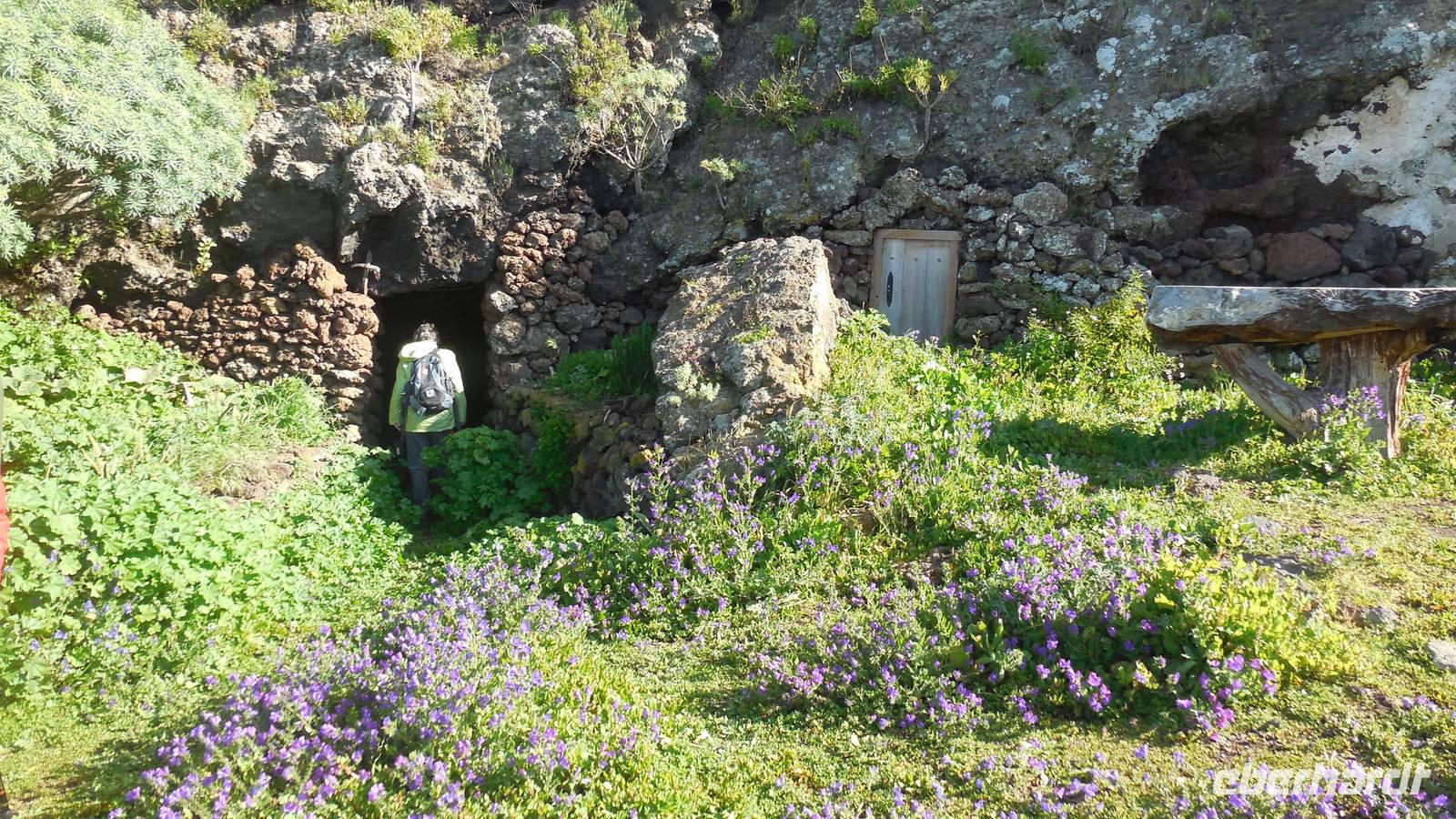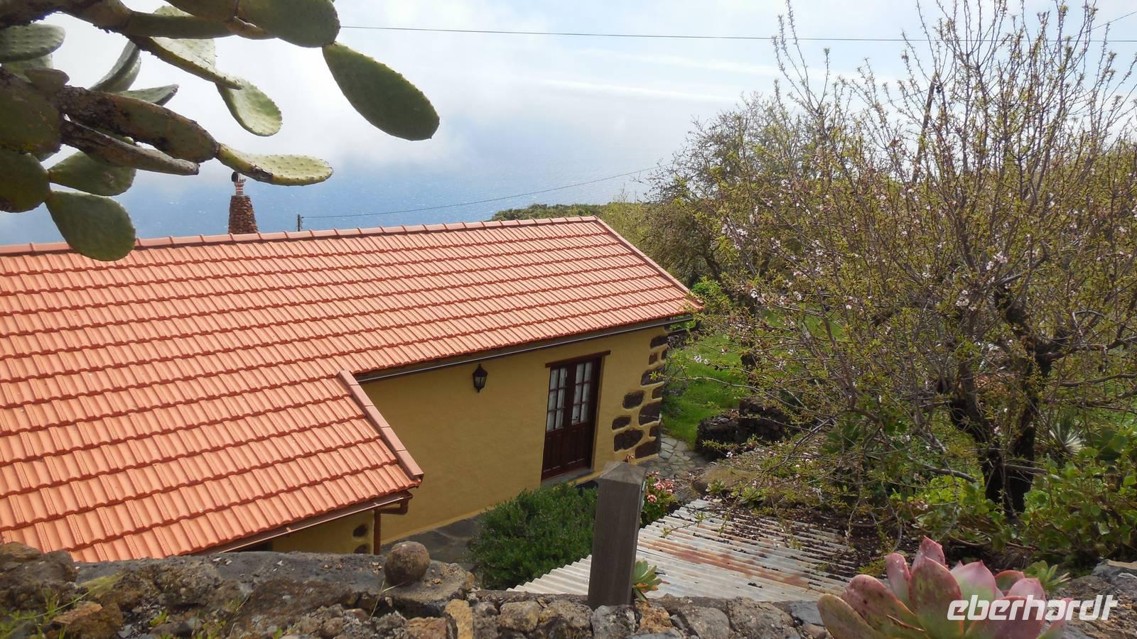 Nach einem leckeren Frühstück starten wir heute etwas später gen Küste, denn wir wollen ins Tal bis an die Badestelle bei La Caleta wandern. Heute gibt es außnahmsweise mal keinen dichten Nebel, dafür aber einen ziemlich starken Wind. Unser Weg führt uns zunächst ins idyllische Dörfchen Echedo, welches aufgrund seiner günstigen Lage und seiner fruchtbaren Erde bei Einsiedlern besonders beliebt ist. Nach einer kleinen Rast auf dem Dorfplatz an der Dorfkirche, an dem auch die Dorffeste stattfinden, geht es weiter durch die Weinterrassen in das Lavagebiet. Viele verlassene Häuschen stehen hier. Diese wurden oft von früheren Einwohnern, welche nach Venezuela ausgewandert sind, zurückgelassen. Außer Wein und Steinrosen gedeiht hier auf dem Lavagestein nicht viel. Immer tiefer kommen wir in das Lavagebiet und bald besteht unser Weg noch aus Geröll und schönen grünen Steinrosen. Wir finden hübsche Lavasteine, mitunter blau-lila-rot gefärbt. Gut aufpassen müssen wir hier, denn als wir den Bergkamm entlang gehen, gähnt links neben uns sogleich der Abgrund. El Hierro ist eine sehr steile Insel, wie wir heute deutlich bemerken. Wir haben die ganze Zeit das blaue Meer im Blick, zwischendurch sehen wir von weiten sogar die Spitze des Teide über den Wolken. Eine Mittagsrast legen wir an der Wegkreuzung zwischen Malpaso, Valverde, Echedo und Valverde ein. Hier haben wir einen tollen Blick auf das untenliegende Dörfchen Tamaduste und den Flughafen von El Hierro. Wir verschnaufen eine Weile und lassen die Aussicht auf uns wirken. Dann geht es weiter hinunter ins Tal, vorbei oberhalb von Tamaguste am Berg entlang nach La Caleta. Reiseleiter Ralf zeigt uns interessante Gewächse, wie die Wolfsmilchbäume. Merkwürdigerweise finden wir auf dieser Strecke, hoch oben auch Muscheln und große Schneckengehäuse.