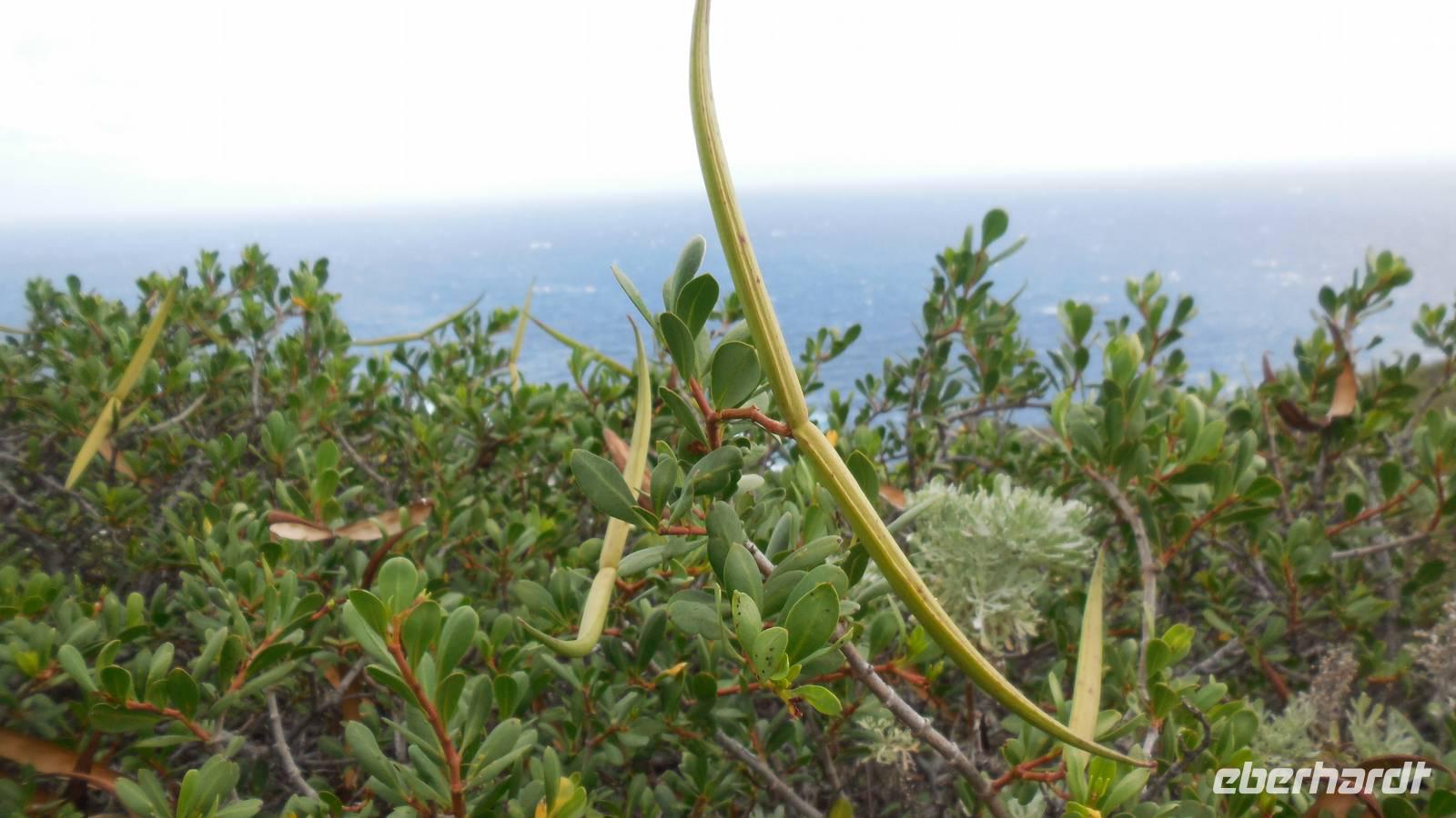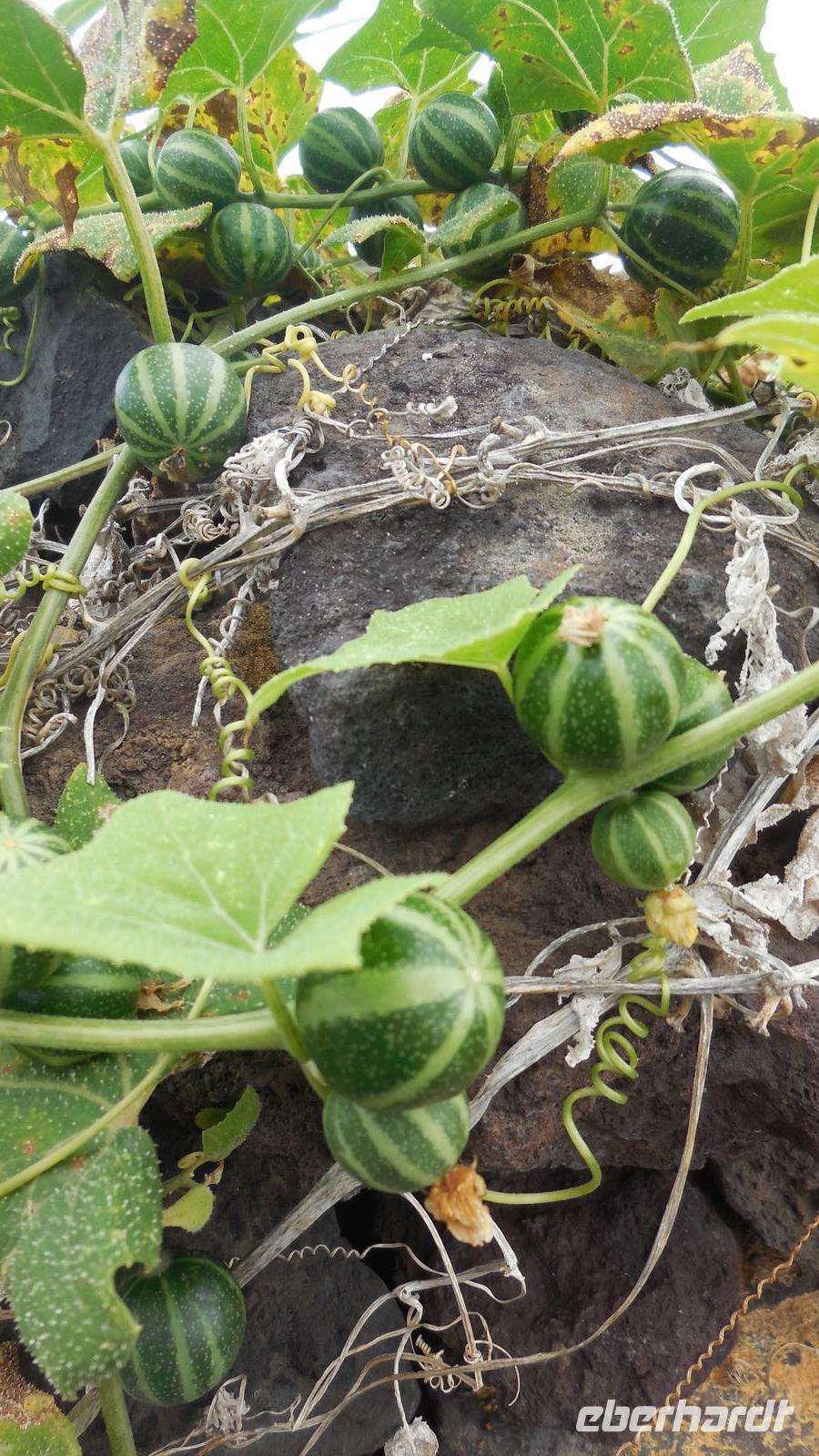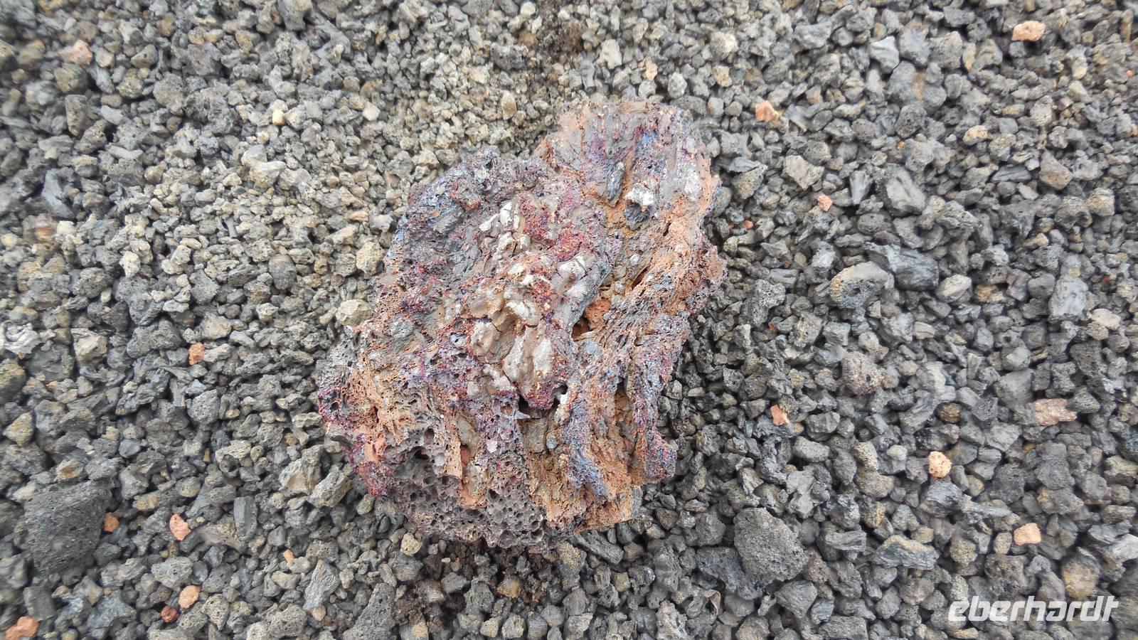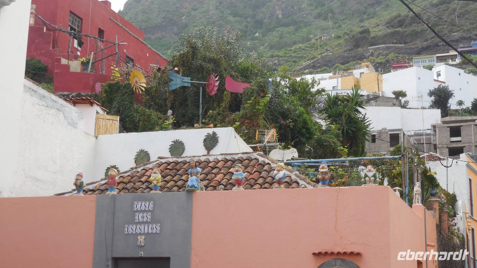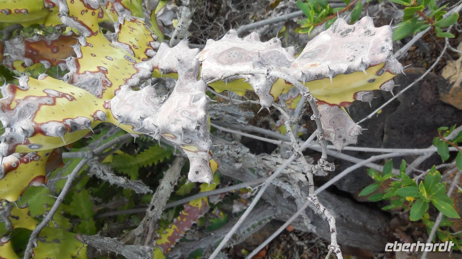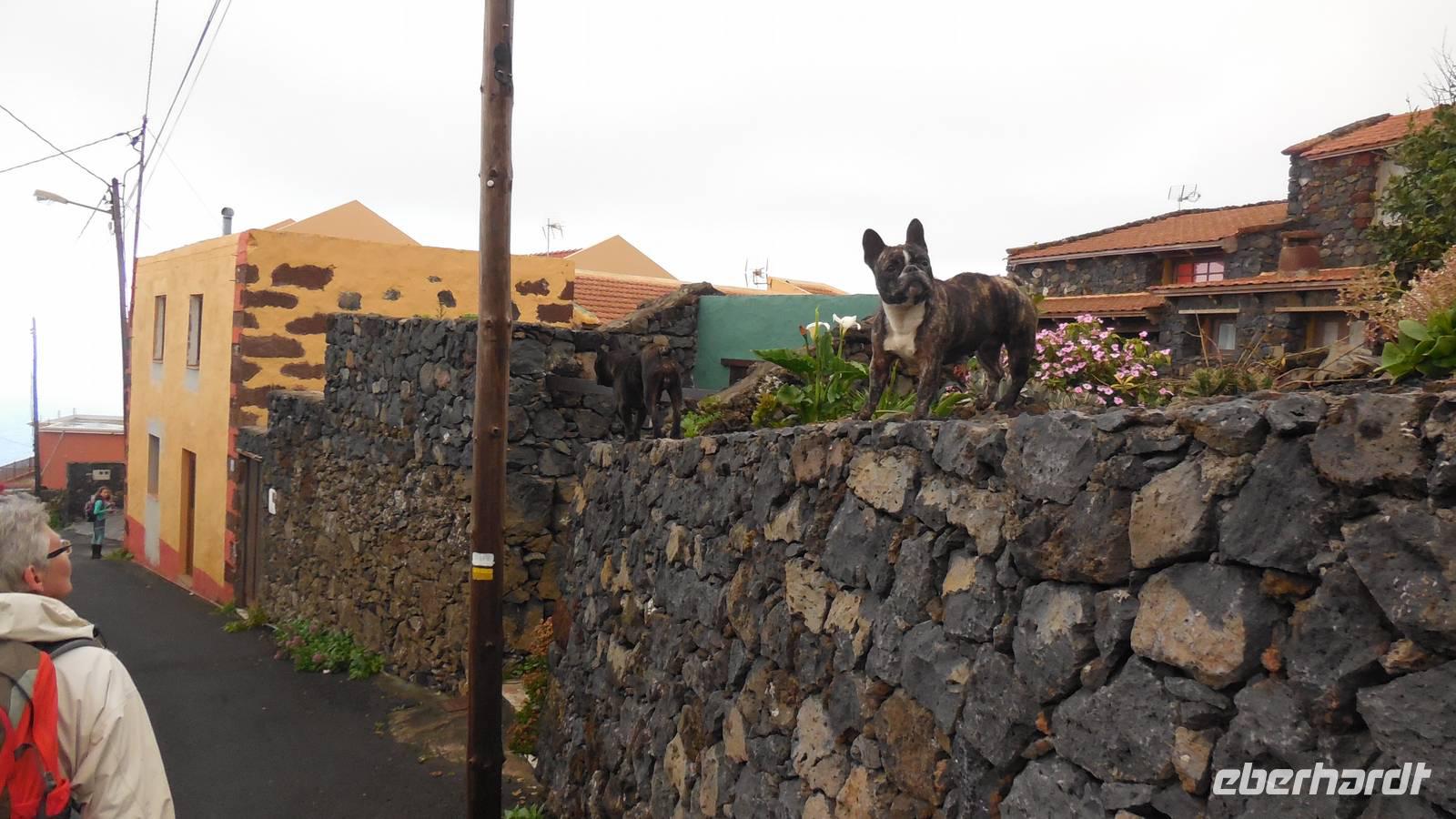 Nach einem leckeren Frühstück starten wir heute etwas später gen Küste, denn wir wollen ins Tal bis an die Badestelle bei La Caleta wandern. Heute gibt es außnahmsweise mal keinen dichten Nebel, dafür aber einen ziemlich starken Wind. Unser Weg führt uns zunächst ins idyllische Dörfchen Echedo, welches aufgrund seiner günstigen Lage und seiner fruchtbaren Erde bei Einsiedlern besonders beliebt ist. Nach einer kleinen Rast auf dem Dorfplatz an der Dorfkirche, an dem auch die Dorffeste stattfinden, geht es weiter durch die Weinterrassen in das Lavagebiet. Viele verlassene Häuschen stehen hier. Diese wurden oft von früheren Einwohnern, welche nach Venezuela ausgewandert sind, zurückgelassen. Außer Wein und Steinrosen gedeiht hier auf dem Lavagestein nicht viel. Immer tiefer kommen wir in das Lavagebiet und bald besteht unser Weg noch aus Geröll und schönen grünen Steinrosen. Wir finden hübsche Lavasteine, mitunter blau-lila-rot gefärbt. Gut aufpassen müssen wir hier, denn als wir den Bergkamm entlang gehen, gähnt links neben uns sogleich der Abgrund. El Hierro ist eine sehr steile Insel, wie wir heute deutlich bemerken. Wir haben die ganze Zeit das blaue Meer im Blick, zwischendurch sehen wir von weiten sogar die Spitze des Teide über den Wolken. Eine Mittagsrast legen wir an der Wegkreuzung zwischen Malpaso, Valverde, Echedo und Valverde ein. Hier haben wir einen tollen Blick auf das untenliegende Dörfchen Tamaduste und den Flughafen von El Hierro. Wir verschnaufen eine Weile und lassen die Aussicht auf uns wirken. Dann geht es weiter hinunter ins Tal, vorbei oberhalb von Tamaguste am Berg entlang nach La Caleta. Reiseleiter Ralf zeigt uns interessante Gewächse, wie die Wolfsmilchbäume. Merkwürdigerweise finden wir auf dieser Strecke, hoch oben auch Muscheln und große Schneckengehäuse.