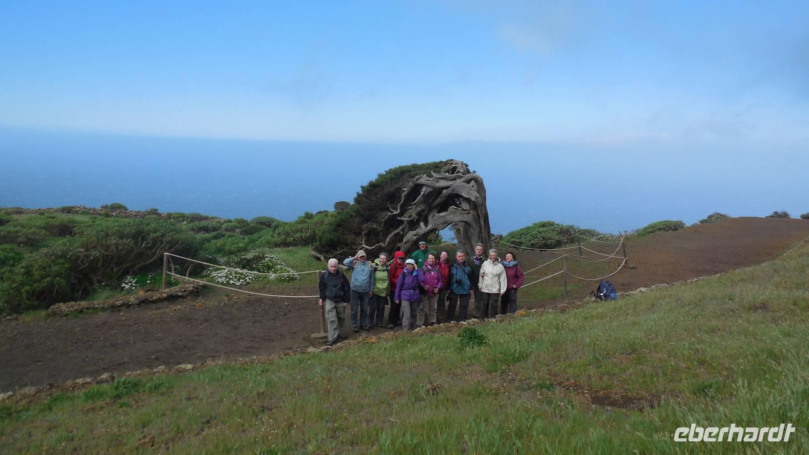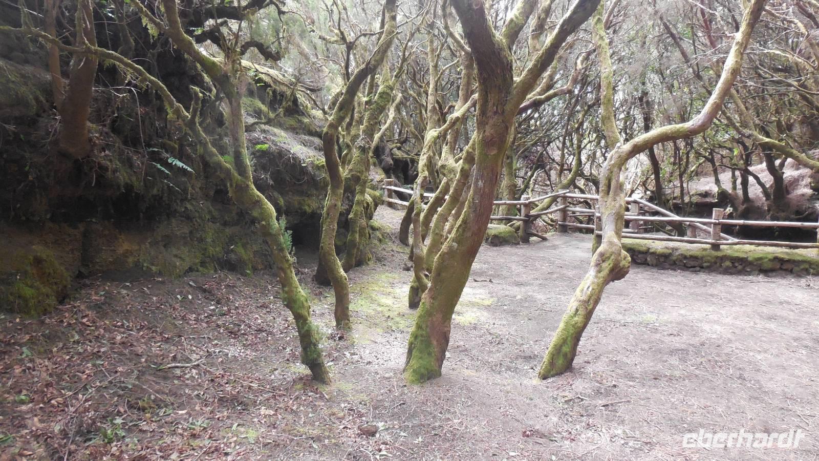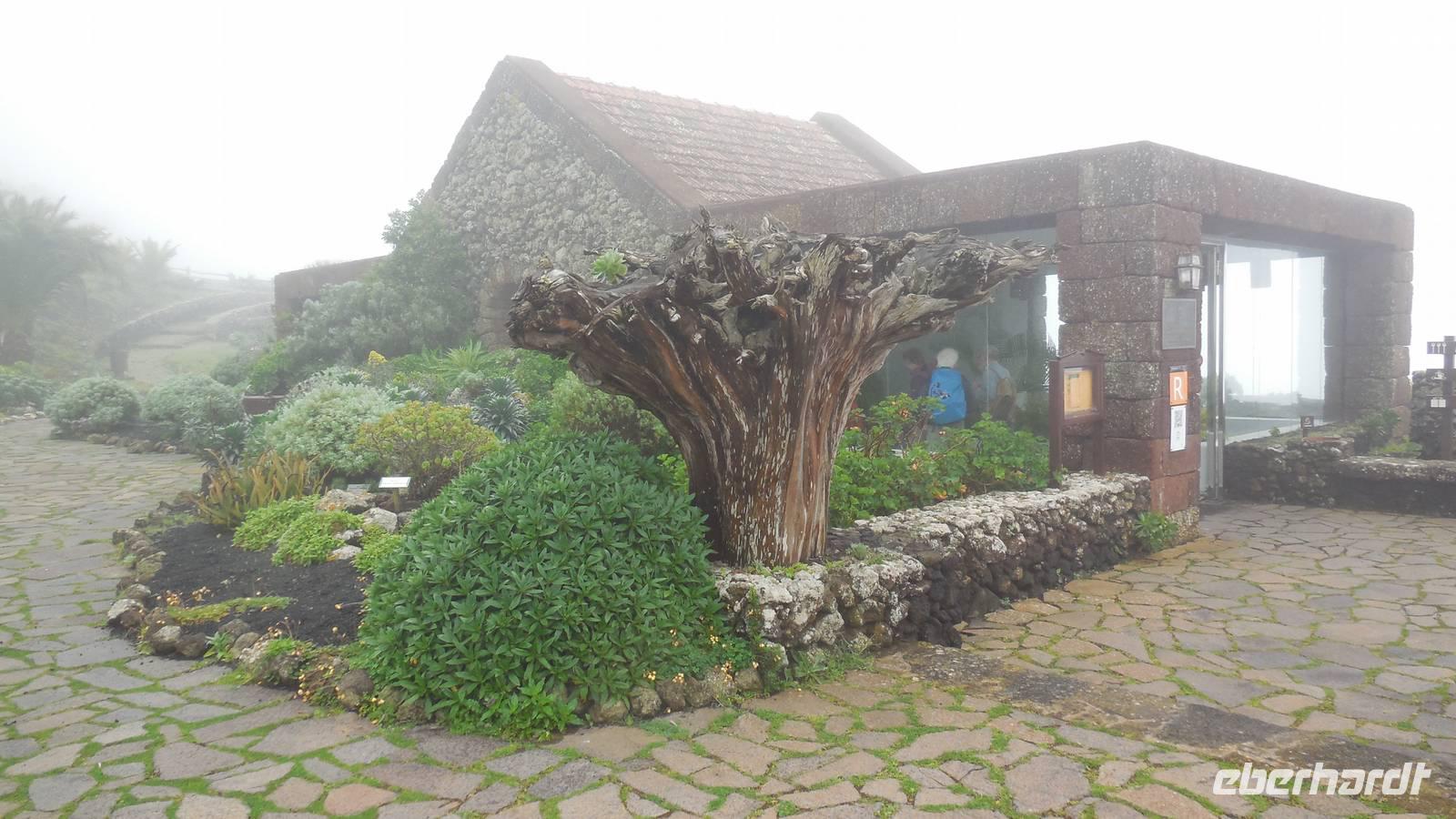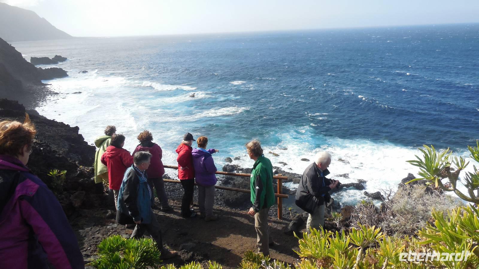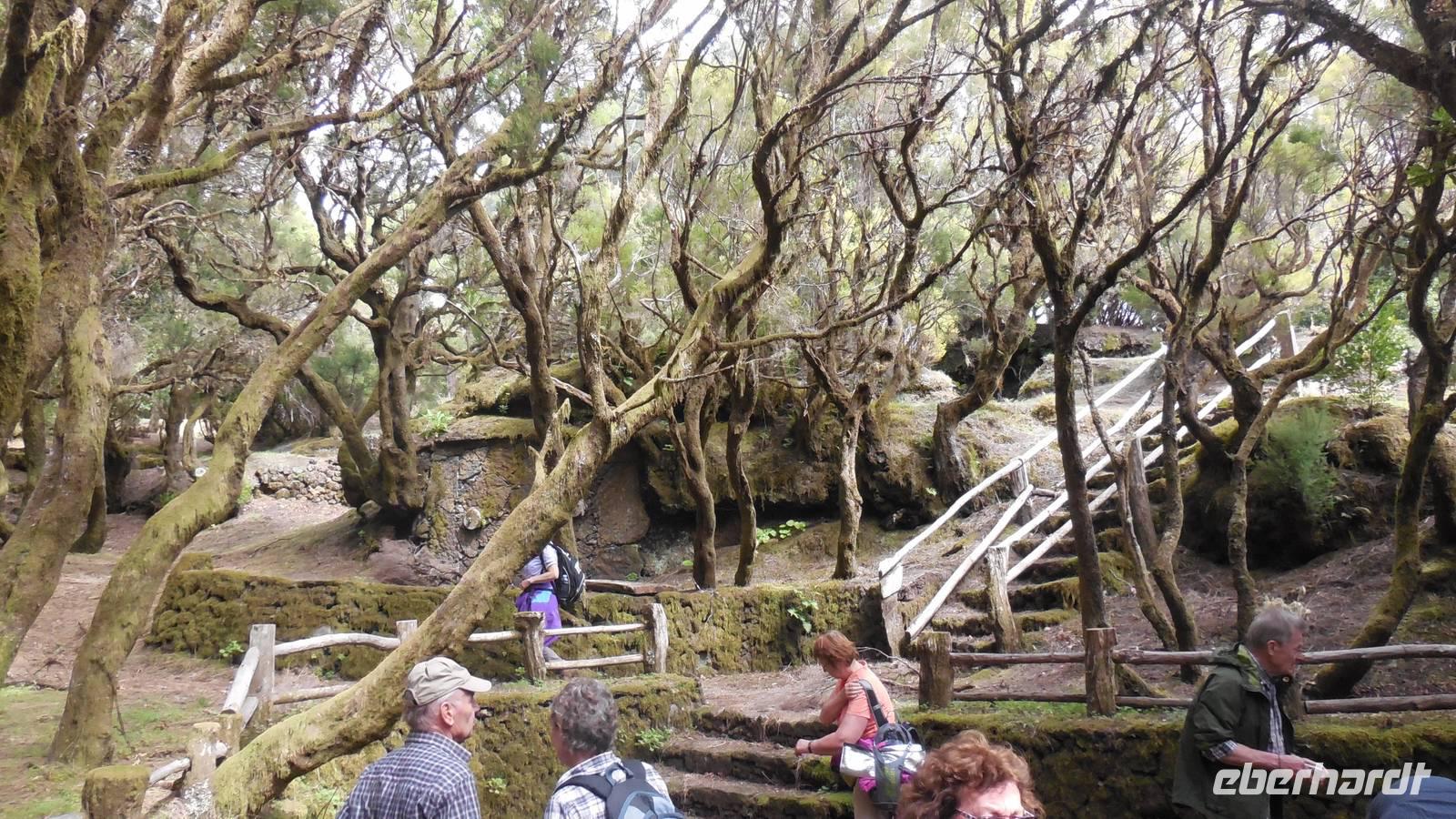 Beim Frühstück schauen wir wieder bangend gen Küste, wo das Meer tobt. Dichter Nebel umhüllt uns und wir stellen uns schon auf einen kalten Wandertag ein. Unser Fahrer bringt uns durch die Nebelwand auf einem halsbrecherischen Serpentinenweg zum Inselheiligtum. Hier auf 800 Meter Höhe geht ein ordentlicher Wind, doch wider Erwarten schauen wir bei strahlendem Sonnenschein und blauen Himmel hinunter aufs Meer. Von der Kapelle, in welcher sich die Statue der Schutzpatronin der Insel befindet, geht es auf einem Wanderweg zu den Sabinas. Hinter der Kapelle finden wir die Höhlen der Hirten vor, welche damals die Mutter Gottes bewachten. Die Sabinas (seltene Baumform) hüllen uns in Staunen - uns umgibt eine Landschaft wie im Horrorfilm! Die Baumstämme und Äste sind ineinander verwickelt und der Stamm krümmt sich in Richtung Erde, als würde der im Boden Schutz suchen. Herrliche Fotomotive bieten diese Naturfaszinationen! Hier mitten in der Natur liest uns Reiseleiter Ralf die Legende über die Ankunft der Schutzpatronin vor. Am Aussichtspunkt Los Bascos schließt ein Weg hoch hinauf in die Weiden. Die Hochweiden mit den Hirtenwegen sind in dichten Nebel gehüllt und von starkem Wind umtobt. Dieser ziemlich anstrengende Anstieg lässt uns die schwere Arbeit der damals hier lebenden Hirten am eigenen Leib erahnen. Endlich erreichen wir den Aussichtspunkt El Sabinal. Wir verschnaufen einen Augenblick und begeben uns in das nächste Landschaftsphänomen: einen dichten nebeligen und feuchten Märchenwald. Hier ist alles moosbewachsen, jeder Stein, jedes Wanderschild - nichts bleibt vom feuchten Klima verschont. Ralf verwöhnt uns mit leckeren, selbst geernteten Nispelfrüchten. Der Waldweg führt bei vielen tollen Ausblicken weiter steil den Berg hinunter bis zum Küstenort Sabinal. Hier angekommen, wäre der Camino de Dehensa endlich geschafft! Der Ort Sabinal besteht aus einen Ober- und Unterdorf, welche miteinander zerstritten sind, wie uns Ralf erzählt. Wir fahren zum Kurhotel Pozo de Salud, in welchem sich der Brunnen mit dem Heilwasser der Insel befindet. Wir kosten vom Heilwasser, welches merkwürdig salzig schmeckt und entspannen bei einem Kaffee. Auf dem Weg zum Hotel stoppen wir noch an einer interessanten Badestelle, der Charco Azul. Hier befindet sich eine Art Badehöhle, welche sich wie eine überdachte Badewanne in das Landschaftsbild einfügt. Am Abend treffen wir uns alle zu einem leckeren Abendessen wieder.