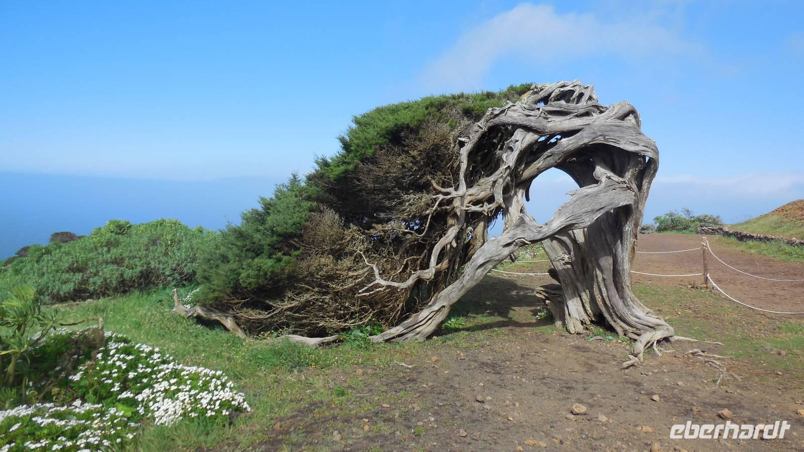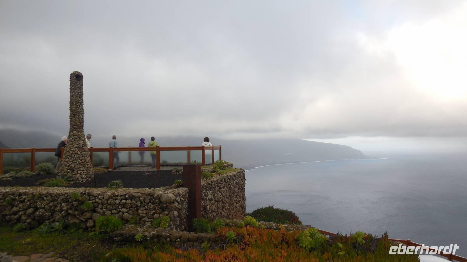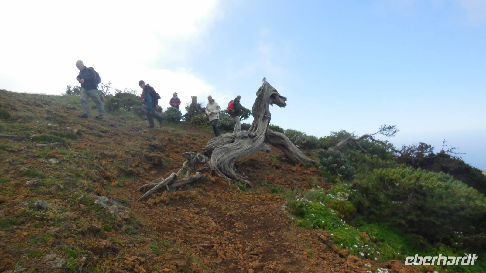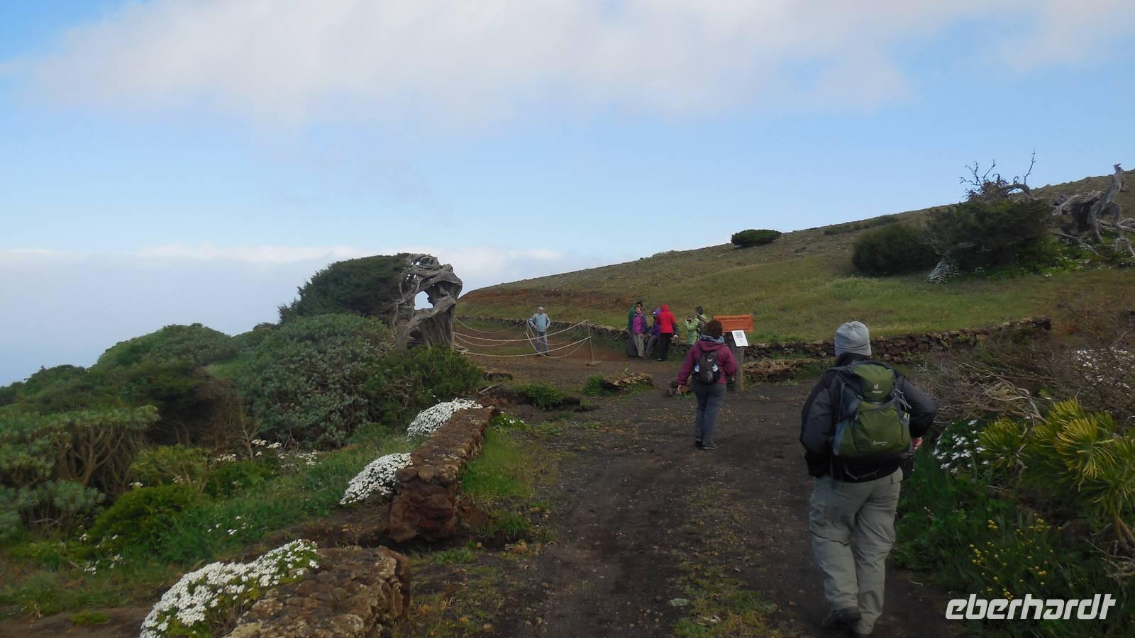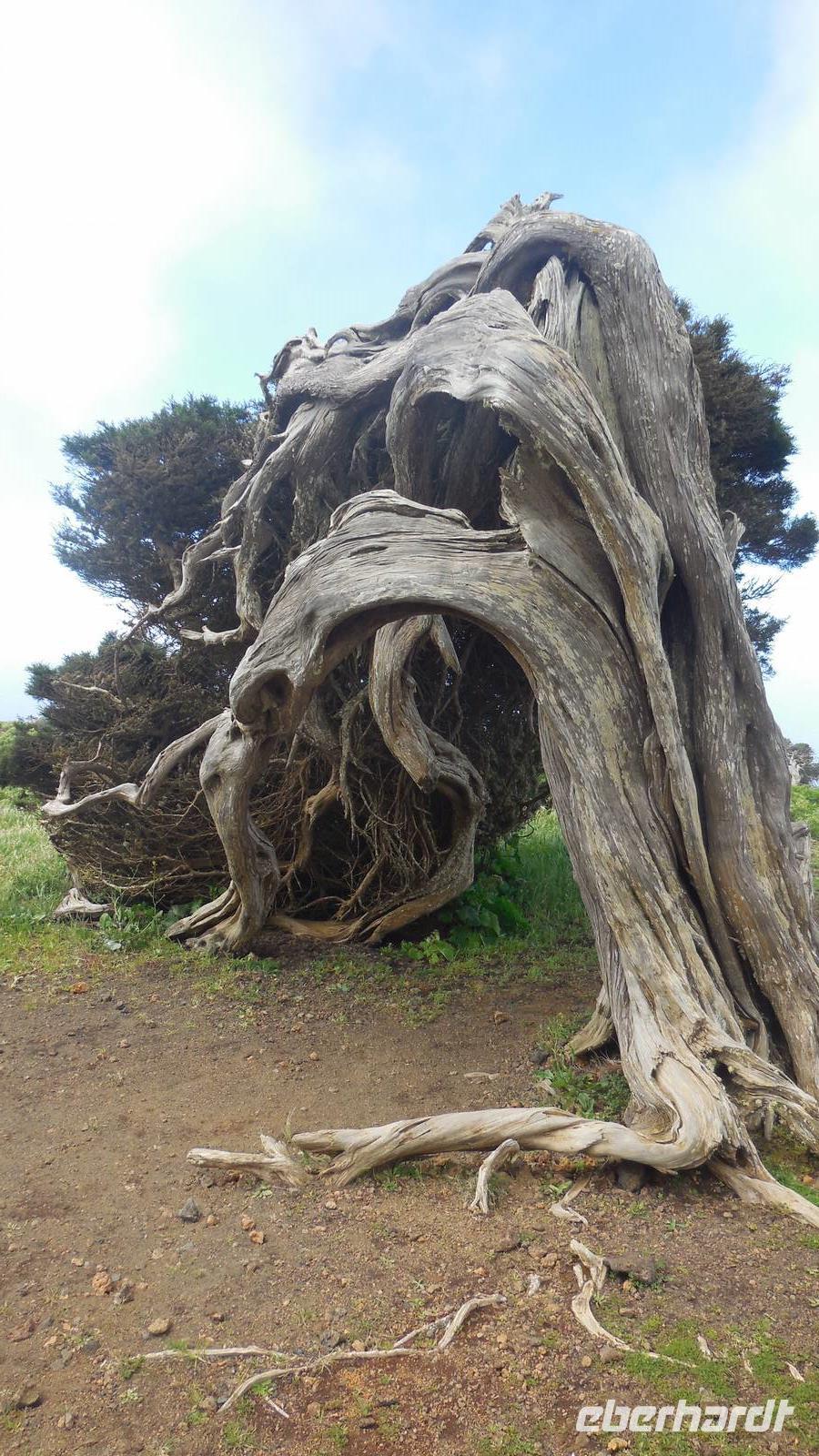 Beim Frühstück schauen wir wieder bangend gen Küste, wo das Meer tobt. Dichter Nebel umhüllt uns und wir stellen uns schon auf einen kalten Wandertag ein. Unser Fahrer bringt uns durch die Nebelwand auf einem halsbrecherischen Serpentinenweg zum Inselheiligtum. Hier auf 800 Meter Höhe geht ein ordentlicher Wind, doch wider Erwarten schauen wir bei strahlendem Sonnenschein und blauen Himmel hinunter aufs Meer. Von der Kapelle, in welcher sich die Statue der Schutzpatronin der Insel befindet, geht es auf einem Wanderweg zu den Sabinas. Hinter der Kapelle finden wir die Höhlen der Hirten vor, welche damals die Mutter Gottes bewachten. Die Sabinas (seltene Baumform) hüllen uns in Staunen - uns umgibt eine Landschaft wie im Horrorfilm! Die Baumstämme und Äste sind ineinander verwickelt und der Stamm krümmt sich in Richtung Erde, als würde der im Boden Schutz suchen. Herrliche Fotomotive bieten diese Naturfaszinationen! Hier mitten in der Natur liest uns Reiseleiter Ralf die Legende über die Ankunft der Schutzpatronin vor. Am Aussichtspunkt Los Bascos schließt ein Weg hoch hinauf in die Weiden. Die Hochweiden mit den Hirtenwegen sind in dichten Nebel gehüllt und von starkem Wind umtobt. Dieser ziemlich anstrengende Anstieg lässt uns die schwere Arbeit der damals hier lebenden Hirten am eigenen Leib erahnen. Endlich erreichen wir den Aussichtspunkt El Sabinal. Wir verschnaufen einen Augenblick und begeben uns in das nächste Landschaftsphänomen: einen dichten nebeligen und feuchten Märchenwald. Hier ist alles moosbewachsen, jeder Stein, jedes Wanderschild - nichts bleibt vom feuchten Klima verschont. Ralf verwöhnt uns mit leckeren, selbst geernteten Nispelfrüchten. Der Waldweg führt bei vielen tollen Ausblicken weiter steil den Berg hinunter bis zum Küstenort Sabinal. Hier angekommen, wäre der Camino de Dehensa endlich geschafft! Der Ort Sabinal besteht aus einen Ober- und Unterdorf, welche miteinander zerstritten sind, wie uns Ralf erzählt. Wir fahren zum Kurhotel Pozo de Salud, in welchem sich der Brunnen mit dem Heilwasser der Insel befindet. Wir kosten vom Heilwasser, welches merkwürdig salzig schmeckt und entspannen bei einem Kaffee. Auf dem Weg zum Hotel stoppen wir noch an einer interessanten Badestelle, der Charco Azul. Hier befindet sich eine Art Badehöhle, welche sich wie eine überdachte Badewanne in das Landschaftsbild einfügt. Am Abend treffen wir uns alle zu einem leckeren Abendessen wieder.
