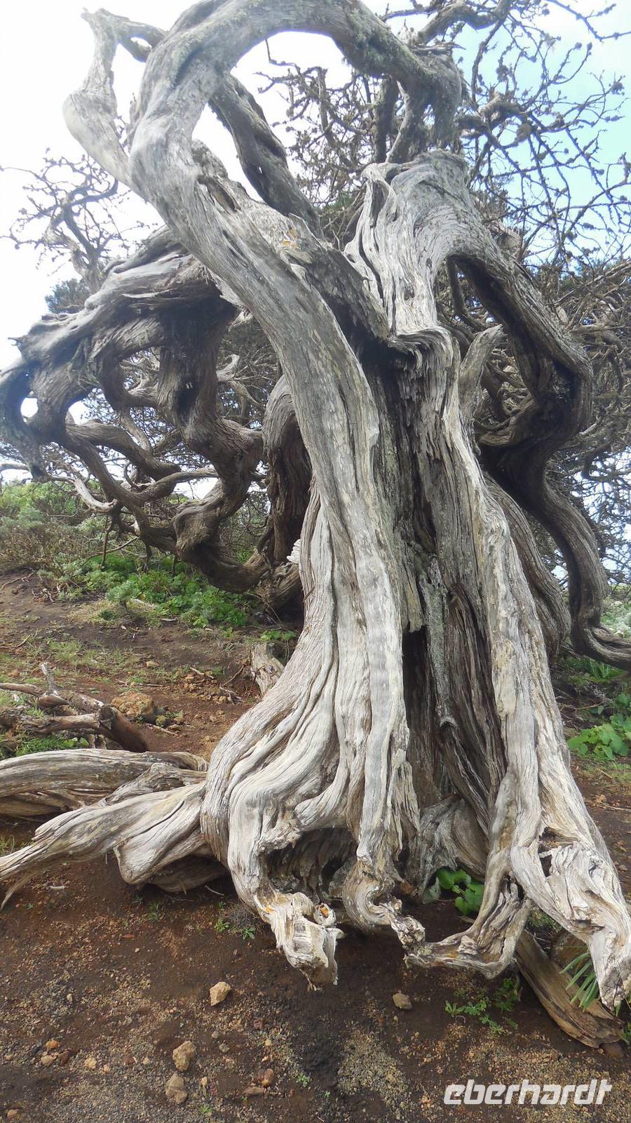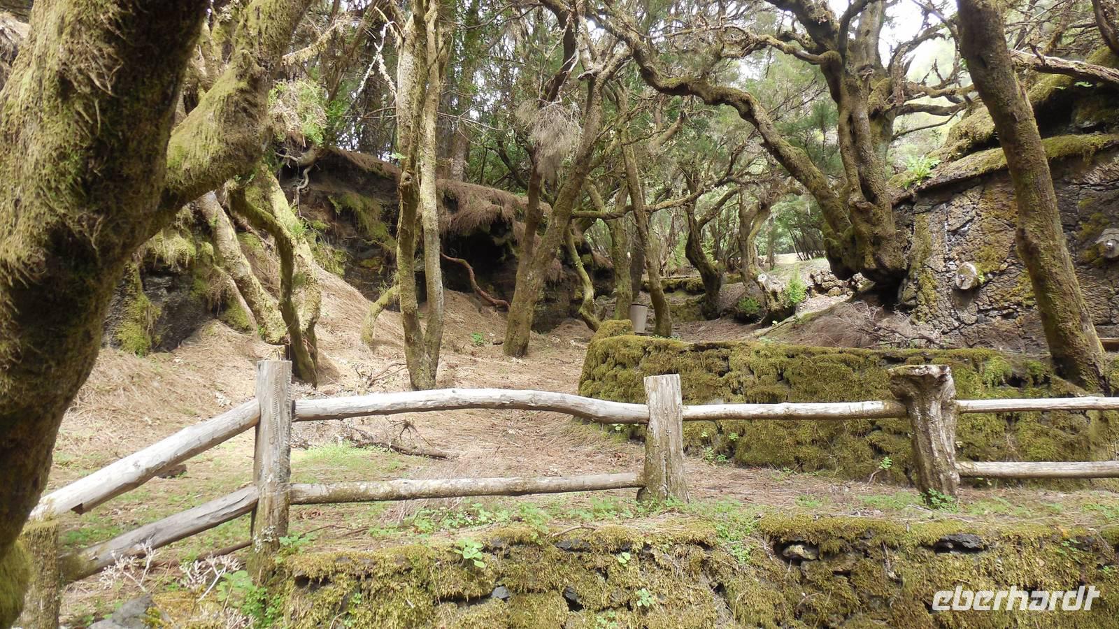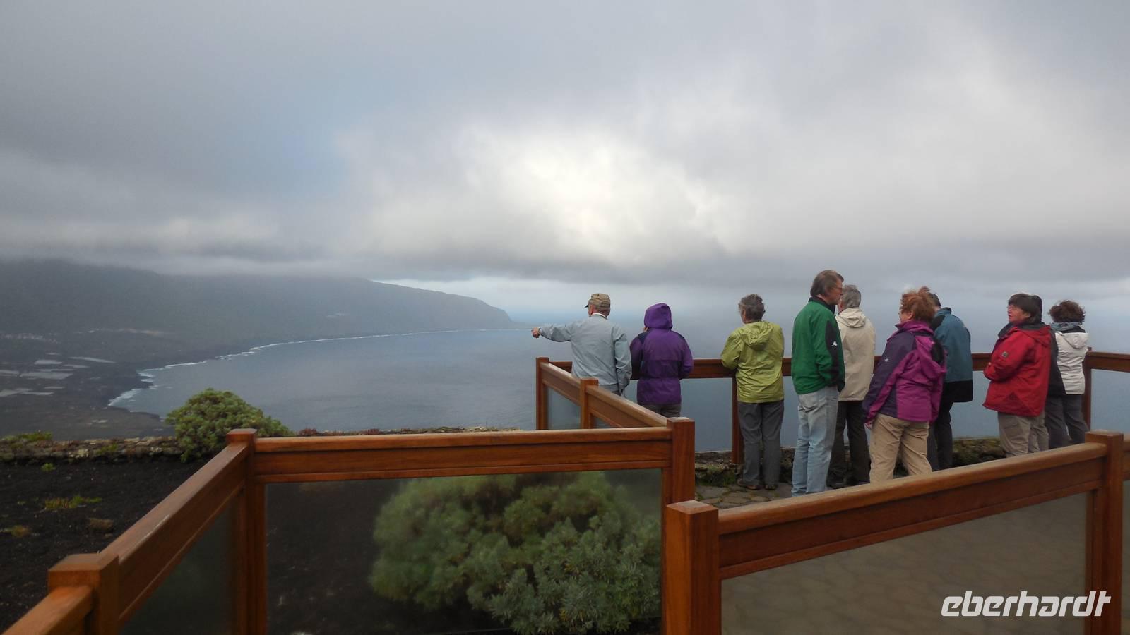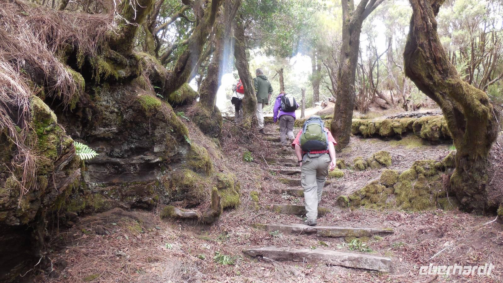 Beim Frühstück schauen wir wieder bangend gen Küste, wo das Meer tobt. Dichter Nebel umhüllt uns und wir stellen uns schon auf einen kalten Wandertag ein. Unser Fahrer bringt uns durch die Nebelwand auf einem halsbrecherischen Serpentinenweg zum Inselheiligtum. Hier auf 800 Meter Höhe geht ein ordentlicher Wind, doch wider Erwarten schauen wir bei strahlendem Sonnenschein und blauen Himmel hinunter aufs Meer. Von der Kapelle, in welcher sich die Statue der Schutzpatronin der Insel befindet, geht es auf einem Wanderweg zu den Sabinas. Hinter der Kapelle finden wir die Höhlen der Hirten vor, welche damals die Mutter Gottes bewachten. Die Sabinas (seltene Baumform) hüllen uns in Staunen - uns umgibt eine Landschaft wie im Horrorfilm! Die Baumstämme und Äste sind ineinander verwickelt und der Stamm krümmt sich in Richtung Erde, als würde der im Boden Schutz suchen. Herrliche Fotomotive bieten diese Naturfaszinationen! Hier mitten in der Natur liest uns Reiseleiter Ralf die Legende über die Ankunft der Schutzpatronin vor. Am Aussichtspunkt Los Bascos schließt ein Weg hoch hinauf in die Weiden. Die Hochweiden mit den Hirtenwegen sind in dichten Nebel gehüllt und von starkem Wind umtobt. Dieser ziemlich anstrengende Anstieg lässt uns die schwere Arbeit der damals hier lebenden Hirten am eigenen Leib erahnen. Endlich erreichen wir den Aussichtspunkt El Sabinal. Wir verschnaufen einen Augenblick und begeben uns in das nächste Landschaftsphänomen: einen dichten nebeligen und feuchten Märchenwald. Hier ist alles moosbewachsen, jeder Stein, jedes Wanderschild - nichts bleibt vom feuchten Klima verschont. Ralf verwöhnt uns mit leckeren, selbst geernteten Nispelfrüchten. Der Waldweg führt bei vielen tollen Ausblicken weiter steil den Berg hinunter bis zum Küstenort Sabinal. Hier angekommen, wäre der Camino de Dehensa endlich geschafft! Der Ort Sabinal besteht aus einen Ober- und Unterdorf, welche miteinander zerstritten sind, wie uns Ralf erzählt. Wir fahren zum Kurhotel Pozo de Salud, in welchem sich der Brunnen mit dem Heilwasser der Insel befindet. Wir kosten vom Heilwasser, welches merkwürdig salzig schmeckt und entspannen bei einem Kaffee. Auf dem Weg zum Hotel stoppen wir noch an einer interessanten Badestelle, der Charco Azul. Hier befindet sich eine Art Badehöhle, welche sich wie eine überdachte Badewanne in das Landschaftsbild einfügt. Am Abend treffen wir uns alle zu einem leckeren Abendessen wieder.