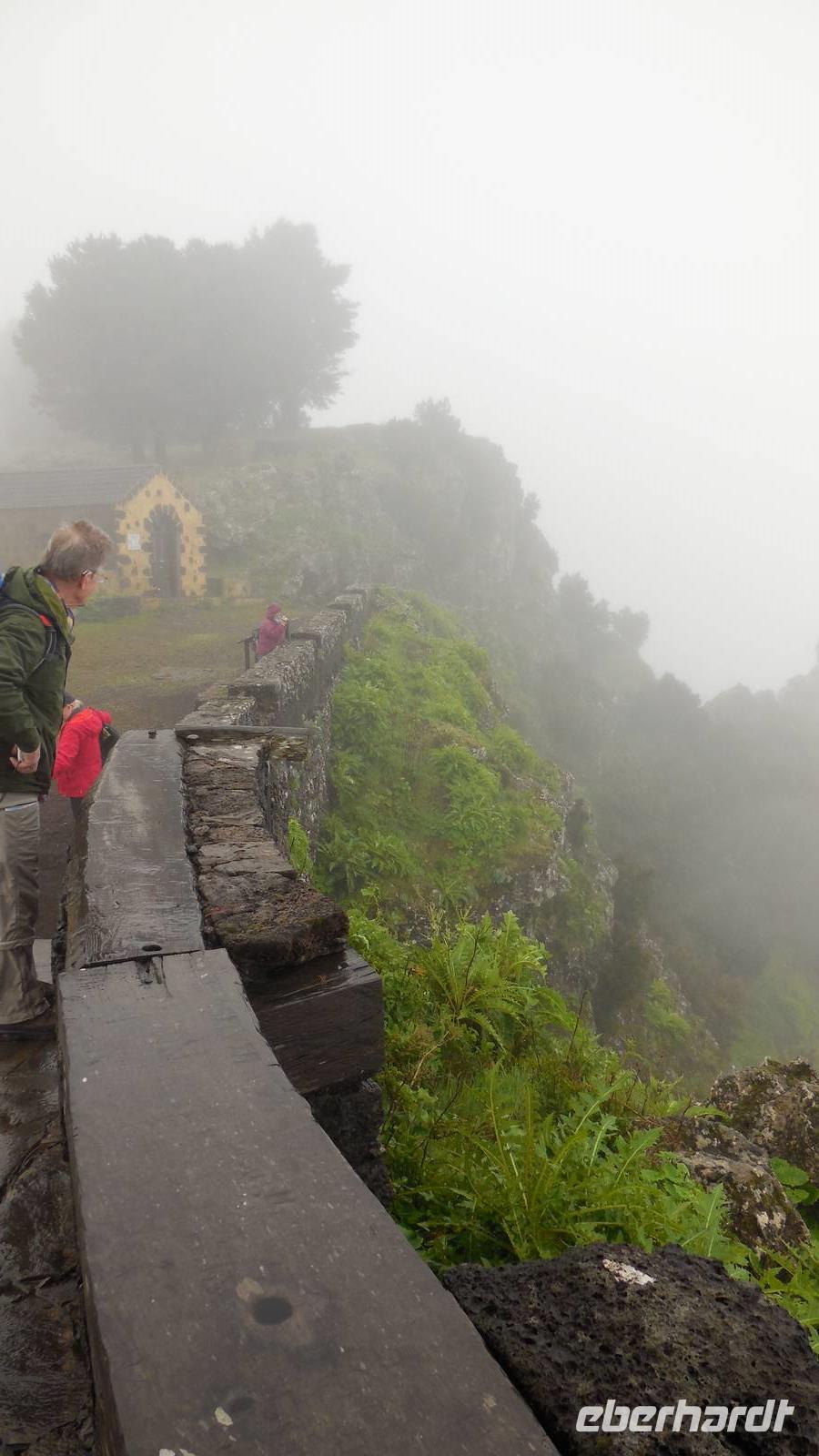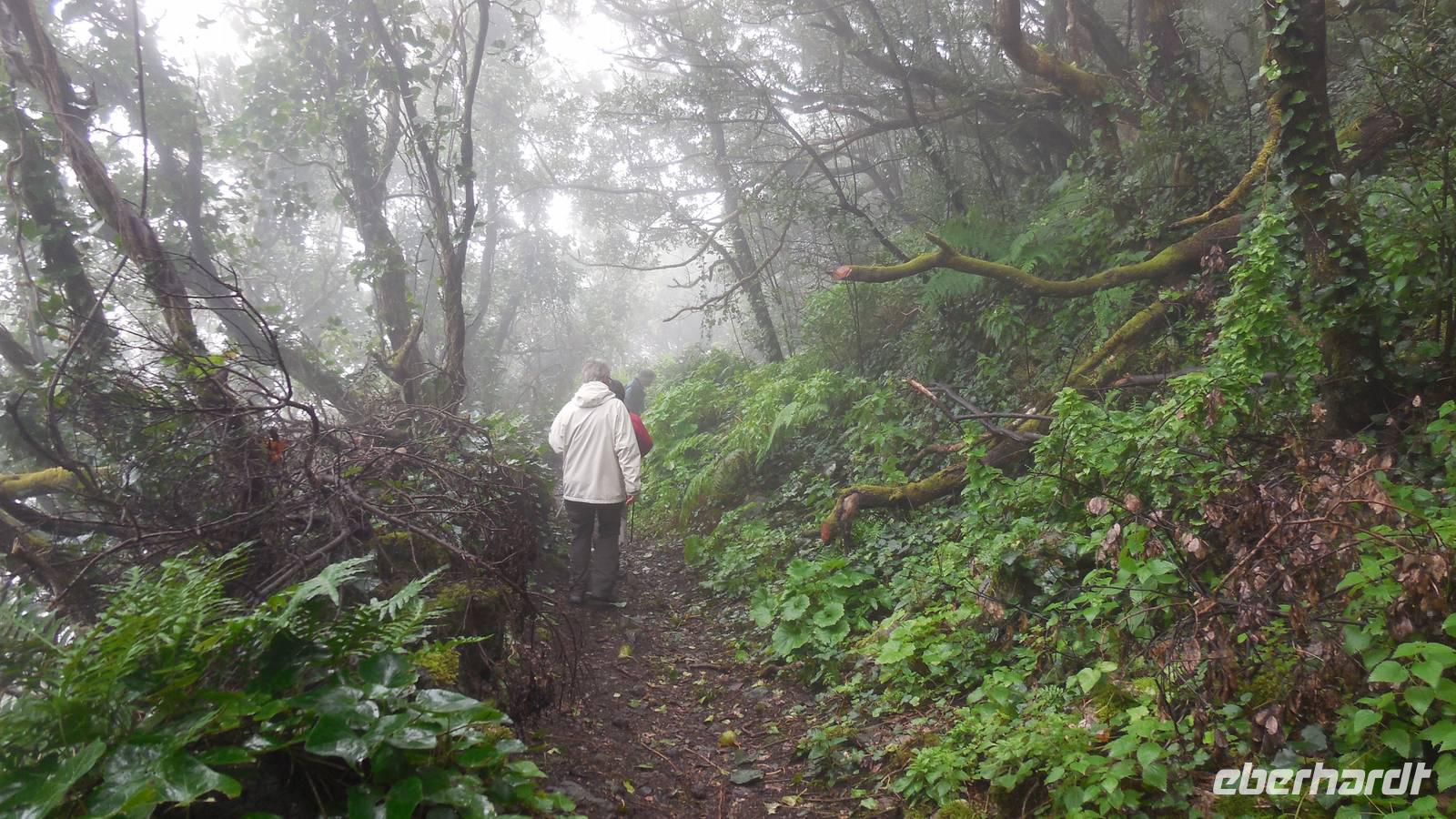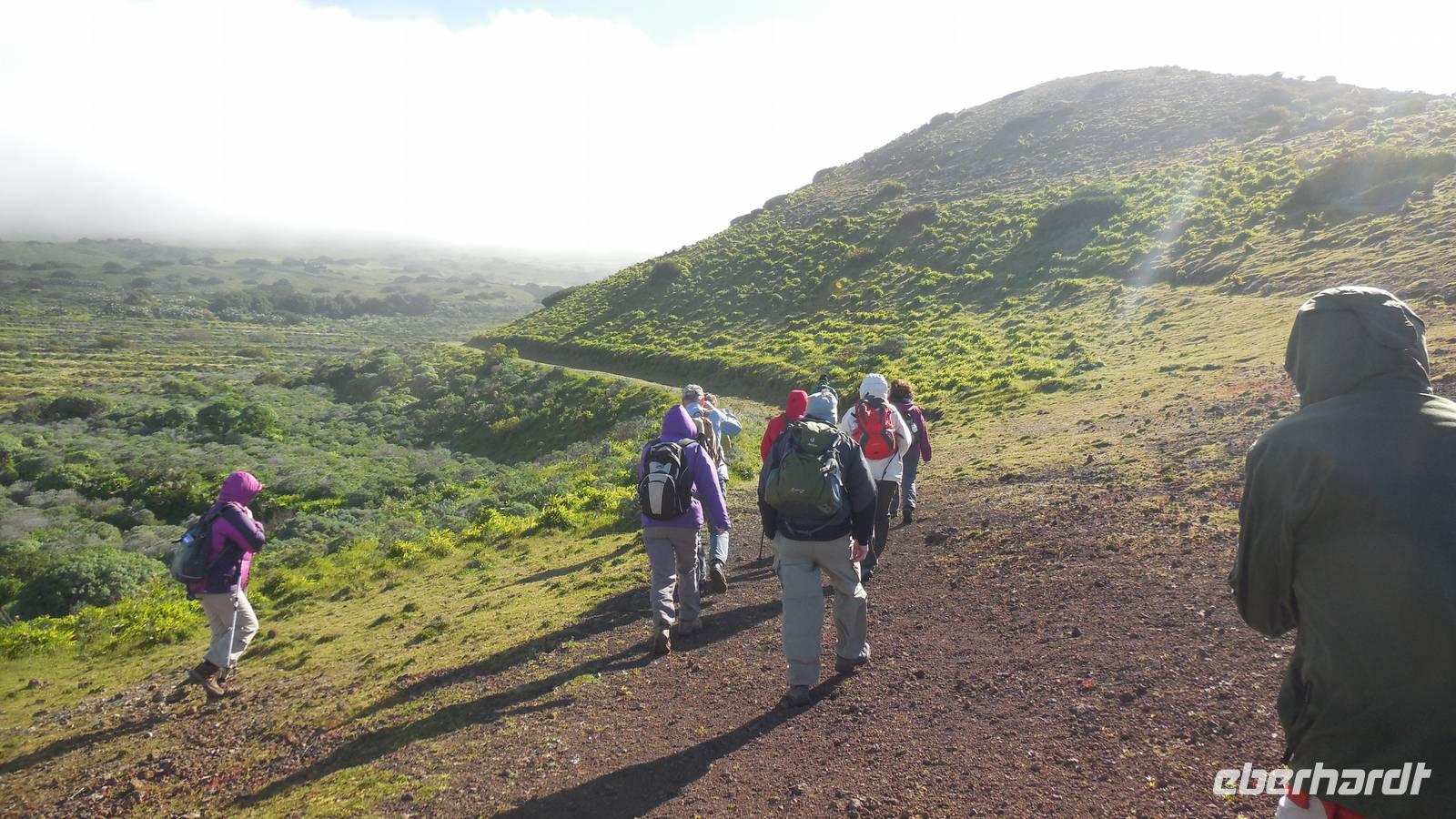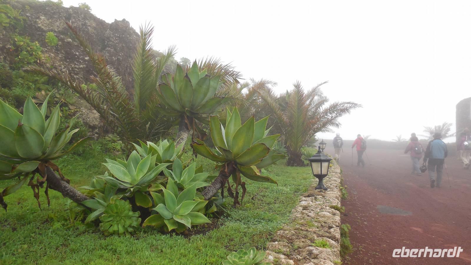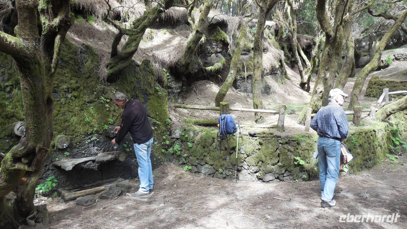 Beim Frühstück schauen wir wieder bangend gen Küste, wo das Meer tobt. Dichter Nebel umhüllt uns und wir stellen uns schon auf einen kalten Wandertag ein. Unser Fahrer bringt uns durch die Nebelwand auf einem halsbrecherischen Serpentinenweg zum Inselheiligtum. Hier auf 800 Meter Höhe geht ein ordentlicher Wind, doch wider Erwarten schauen wir bei strahlendem Sonnenschein und blauen Himmel hinunter aufs Meer. Von der Kapelle, in welcher sich die Statue der Schutzpatronin der Insel befindet, geht es auf einem Wanderweg zu den Sabinas. Hinter der Kapelle finden wir die Höhlen der Hirten vor, welche damals die Mutter Gottes bewachten. Die Sabinas (seltene Baumform) hüllen uns in Staunen - uns umgibt eine Landschaft wie im Horrorfilm! Die Baumstämme und Äste sind ineinander verwickelt und der Stamm krümmt sich in Richtung Erde, als würde der im Boden Schutz suchen. Herrliche Fotomotive bieten diese Naturfaszinationen! Hier mitten in der Natur liest uns Reiseleiter Ralf die Legende über die Ankunft der Schutzpatronin vor. Am Aussichtspunkt Los Bascos schließt ein Weg hoch hinauf in die Weiden. Die Hochweiden mit den Hirtenwegen sind in dichten Nebel gehüllt und von starkem Wind umtobt. Dieser ziemlich anstrengende Anstieg lässt uns die schwere Arbeit der damals hier lebenden Hirten am eigenen Leib erahnen. Endlich erreichen wir den Aussichtspunkt El Sabinal. Wir verschnaufen einen Augenblick und begeben uns in das nächste Landschaftsphänomen: einen dichten nebeligen und feuchten Märchenwald. Hier ist alles moosbewachsen, jeder Stein, jedes Wanderschild - nichts bleibt vom feuchten Klima verschont. Ralf verwöhnt uns mit leckeren, selbst geernteten Nispelfrüchten. Der Waldweg führt bei vielen tollen Ausblicken weiter steil den Berg hinunter bis zum Küstenort Sabinal. Hier angekommen, wäre der Camino de Dehensa endlich geschafft! Der Ort Sabinal besteht aus einen Ober- und Unterdorf, welche miteinander zerstritten sind, wie uns Ralf erzählt. Wir fahren zum Kurhotel Pozo de Salud, in welchem sich der Brunnen mit dem Heilwasser der Insel befindet. Wir kosten vom Heilwasser, welches merkwürdig salzig schmeckt und entspannen bei einem Kaffee. Auf dem Weg zum Hotel stoppen wir noch an einer interessanten Badestelle, der Charco Azul. Hier befindet sich eine Art Badehöhle, welche sich wie eine überdachte Badewanne in das Landschaftsbild einfügt. Am Abend treffen wir uns alle zu einem leckeren Abendessen wieder.