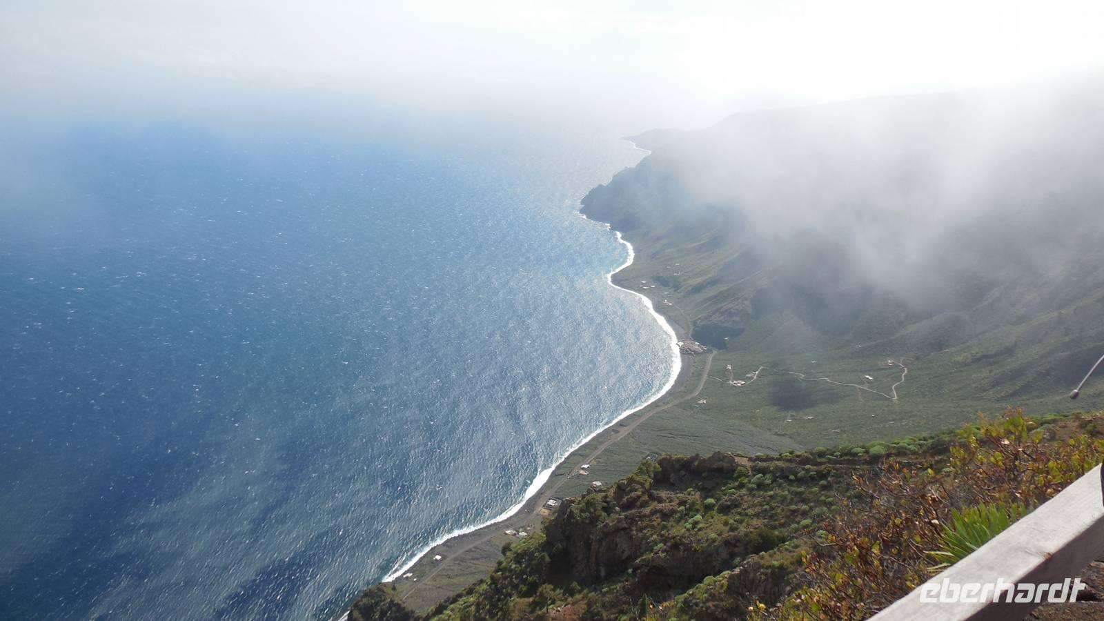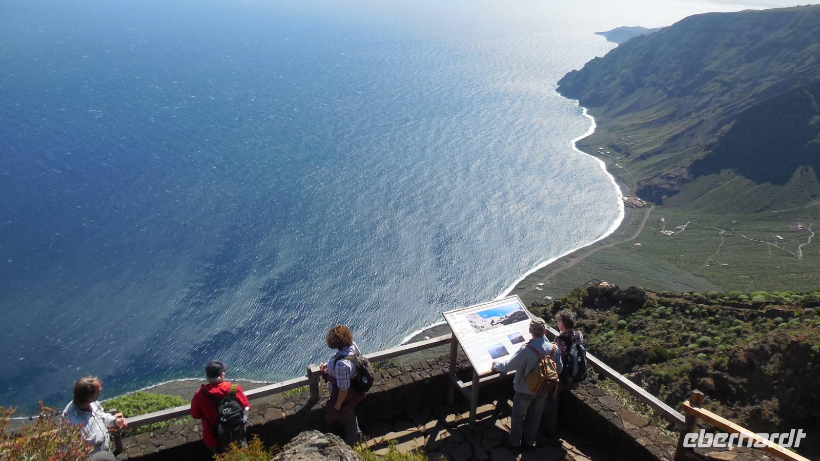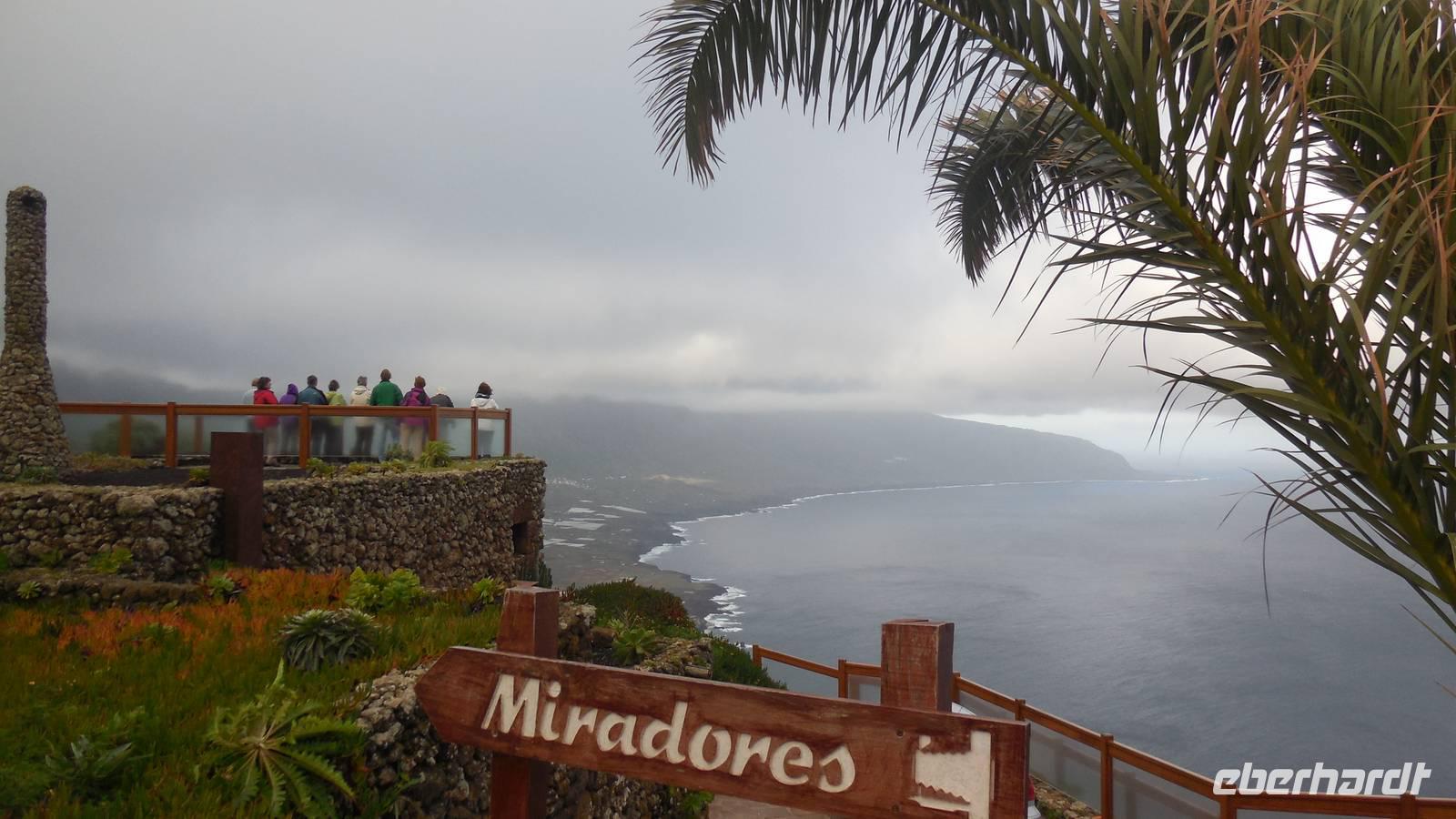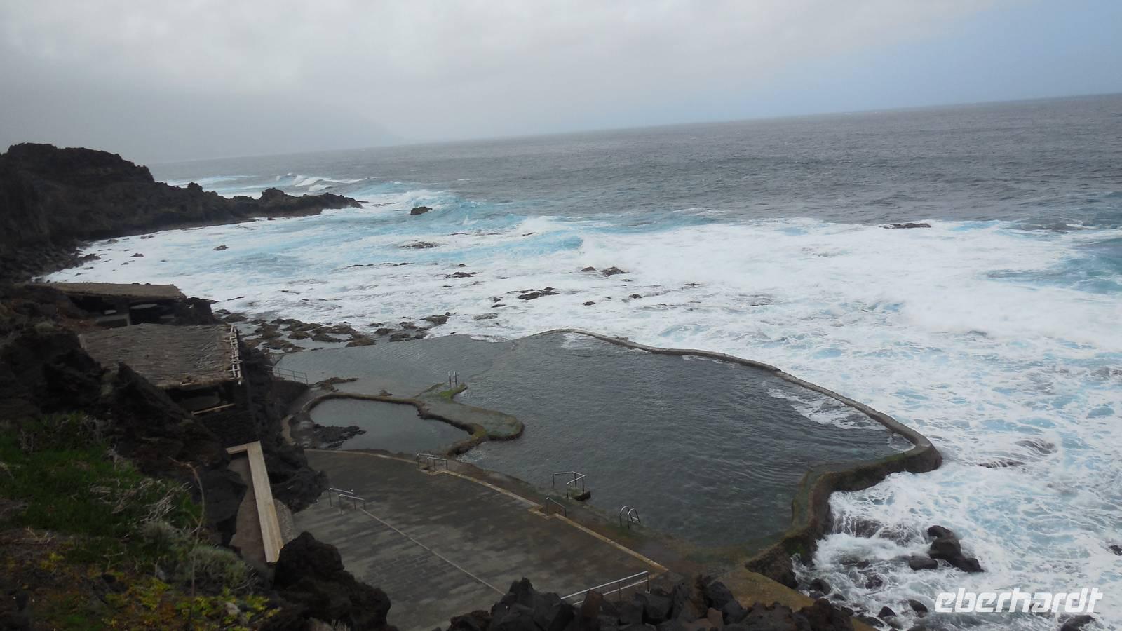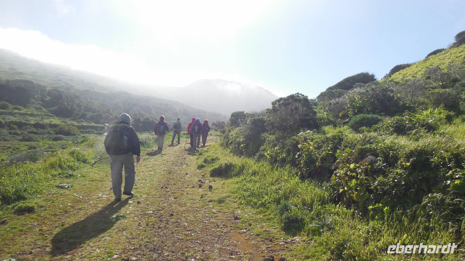 Beim Frühstück schauen wir wieder bangend gen Küste, wo das Meer tobt. Dichter Nebel umhüllt uns und wir stellen uns schon auf einen kalten Wandertag ein. Unser Fahrer bringt uns durch die Nebelwand auf einem halsbrecherischen Serpentinenweg zum Inselheiligtum. Hier auf 800 Meter Höhe geht ein ordentlicher Wind, doch wider Erwarten schauen wir bei strahlendem Sonnenschein und blauen Himmel hinunter aufs Meer. Von der Kapelle, in welcher sich die Statue der Schutzpatronin der Insel befindet, geht es auf einem Wanderweg zu den Sabinas. Hinter der Kapelle finden wir die Höhlen der Hirten vor, welche damals die Mutter Gottes bewachten. Die Sabinas (seltene Baumform) hüllen uns in Staunen - uns umgibt eine Landschaft wie im Horrorfilm! Die Baumstämme und Äste sind ineinander verwickelt und der Stamm krümmt sich in Richtung Erde, als würde der im Boden Schutz suchen. Herrliche Fotomotive bieten diese Naturfaszinationen! Hier mitten in der Natur liest uns Reiseleiter Ralf die Legende über die Ankunft der Schutzpatronin vor. Am Aussichtspunkt Los Bascos schließt ein Weg hoch hinauf in die Weiden. Die Hochweiden mit den Hirtenwegen sind in dichten Nebel gehüllt und von starkem Wind umtobt. Dieser ziemlich anstrengende Anstieg lässt uns die schwere Arbeit der damals hier lebenden Hirten am eigenen Leib erahnen. Endlich erreichen wir den Aussichtspunkt El Sabinal. Wir verschnaufen einen Augenblick und begeben uns in das nächste Landschaftsphänomen: einen dichten nebeligen und feuchten Märchenwald. Hier ist alles moosbewachsen, jeder Stein, jedes Wanderschild - nichts bleibt vom feuchten Klima verschont. Ralf verwöhnt uns mit leckeren, selbst geernteten Nispelfrüchten. Der Waldweg führt bei vielen tollen Ausblicken weiter steil den Berg hinunter bis zum Küstenort Sabinal. Hier angekommen, wäre der Camino de Dehensa endlich geschafft! Der Ort Sabinal besteht aus einen Ober- und Unterdorf, welche miteinander zerstritten sind, wie uns Ralf erzählt. Wir fahren zum Kurhotel Pozo de Salud, in welchem sich der Brunnen mit dem Heilwasser der Insel befindet. Wir kosten vom Heilwasser, welches merkwürdig salzig schmeckt und entspannen bei einem Kaffee. Auf dem Weg zum Hotel stoppen wir noch an einer interessanten Badestelle, der Charco Azul. Hier befindet sich eine Art Badehöhle, welche sich wie eine überdachte Badewanne in das Landschaftsbild einfügt. Am Abend treffen wir uns alle zu einem leckeren Abendessen wieder.