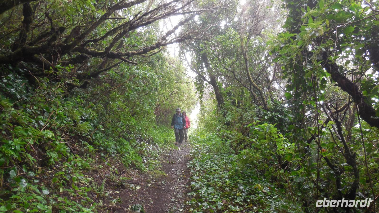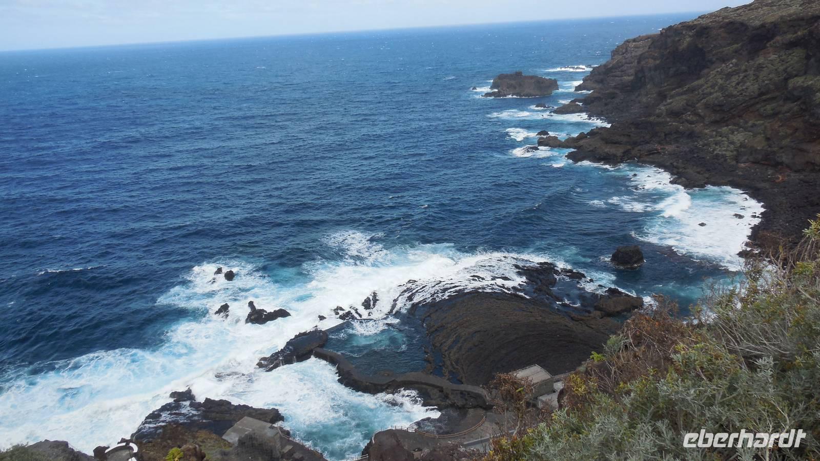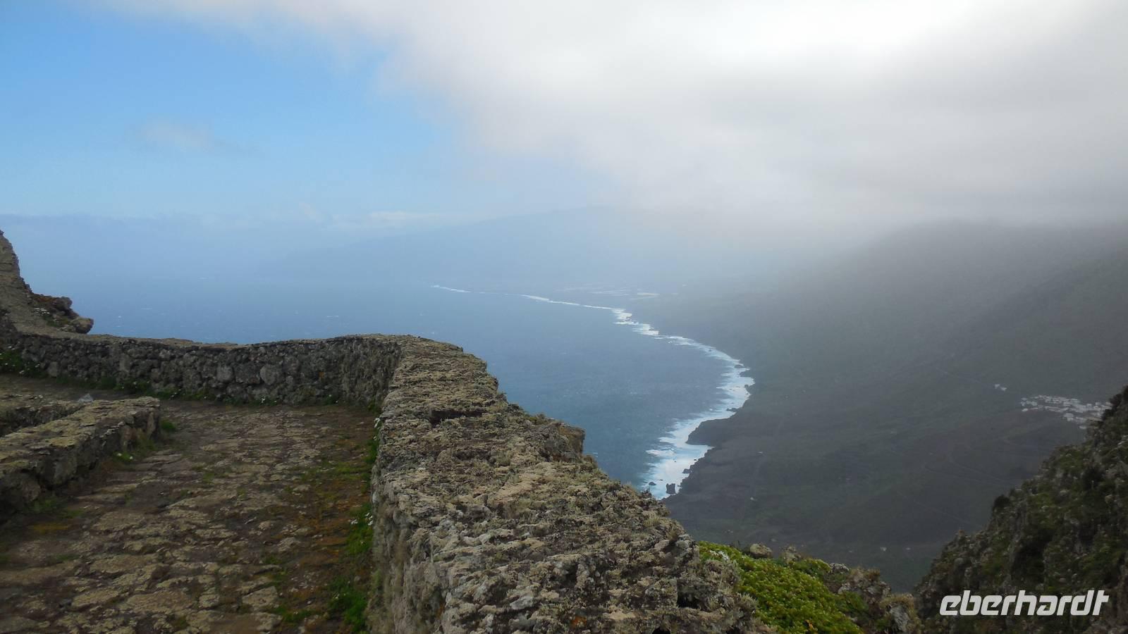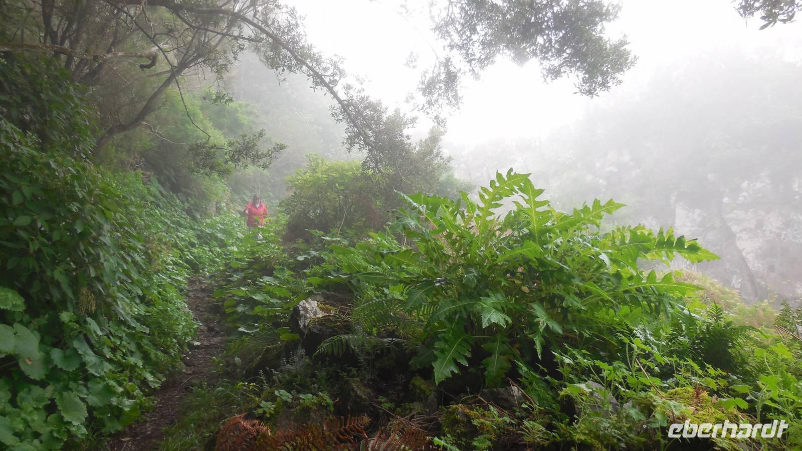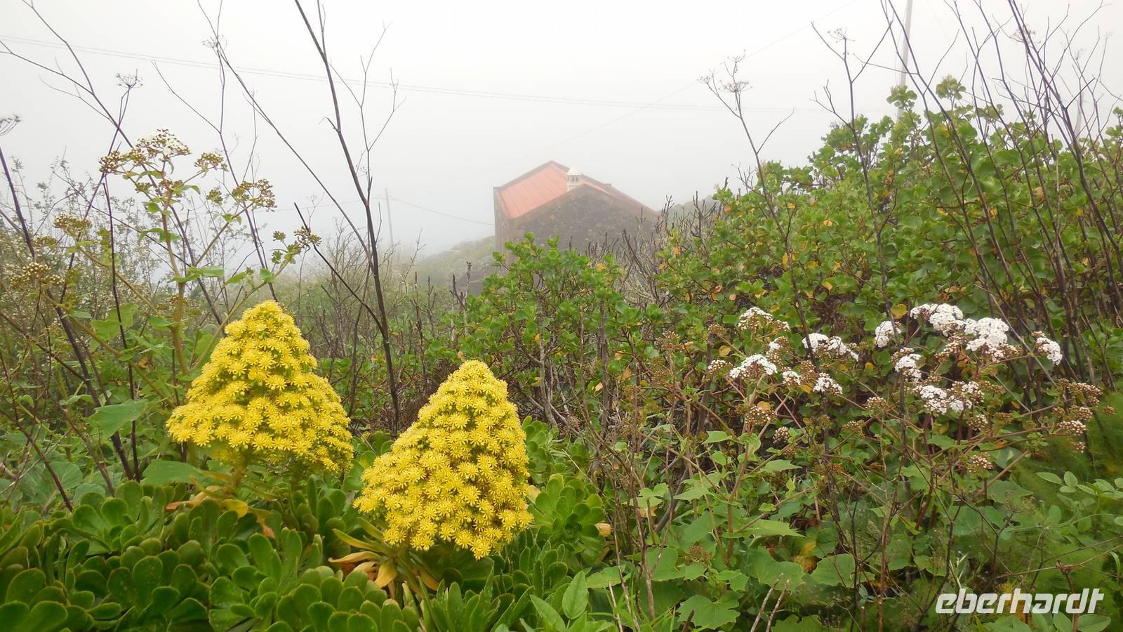 Beim Frühstück schauen wir wieder bangend gen Küste, wo das Meer tobt. Dichter Nebel umhüllt uns und wir stellen uns schon auf einen kalten Wandertag ein. Unser Fahrer bringt uns durch die Nebelwand auf einem halsbrecherischen Serpentinenweg zum Inselheiligtum. Hier auf 800 Meter Höhe geht ein ordentlicher Wind, doch wider Erwarten schauen wir bei strahlendem Sonnenschein und blauen Himmel hinunter aufs Meer. Von der Kapelle, in welcher sich die Statue der Schutzpatronin der Insel befindet, geht es auf einem Wanderweg zu den Sabinas. Hinter der Kapelle finden wir die Höhlen der Hirten vor, welche damals die Mutter Gottes bewachten. Die Sabinas (seltene Baumform) hüllen uns in Staunen - uns umgibt eine Landschaft wie im Horrorfilm! Die Baumstämme und Äste sind ineinander verwickelt und der Stamm krümmt sich in Richtung Erde, als würde der im Boden Schutz suchen. Herrliche Fotomotive bieten diese Naturfaszinationen! Hier mitten in der Natur liest uns Reiseleiter Ralf die Legende über die Ankunft der Schutzpatronin vor. Am Aussichtspunkt Los Bascos schließt ein Weg hoch hinauf in die Weiden. Die Hochweiden mit den Hirtenwegen sind in dichten Nebel gehüllt und von starkem Wind umtobt. Dieser ziemlich anstrengende Anstieg lässt uns die schwere Arbeit der damals hier lebenden Hirten am eigenen Leib erahnen. Endlich erreichen wir den Aussichtspunkt El Sabinal. Wir verschnaufen einen Augenblick und begeben uns in das nächste Landschaftsphänomen: einen dichten nebeligen und feuchten Märchenwald. Hier ist alles moosbewachsen, jeder Stein, jedes Wanderschild - nichts bleibt vom feuchten Klima verschont. Ralf verwöhnt uns mit leckeren, selbst geernteten Nispelfrüchten. Der Waldweg führt bei vielen tollen Ausblicken weiter steil den Berg hinunter bis zum Küstenort Sabinal. Hier angekommen, wäre der Camino de Dehensa endlich geschafft! Der Ort Sabinal besteht aus einen Ober- und Unterdorf, welche miteinander zerstritten sind, wie uns Ralf erzählt. Wir fahren zum Kurhotel Pozo de Salud, in welchem sich der Brunnen mit dem Heilwasser der Insel befindet. Wir kosten vom Heilwasser, welches merkwürdig salzig schmeckt und entspannen bei einem Kaffee. Auf dem Weg zum Hotel stoppen wir noch an einer interessanten Badestelle, der Charco Azul. Hier befindet sich eine Art Badehöhle, welche sich wie eine überdachte Badewanne in das Landschaftsbild einfügt. Am Abend treffen wir uns alle zu einem leckeren Abendessen wieder.