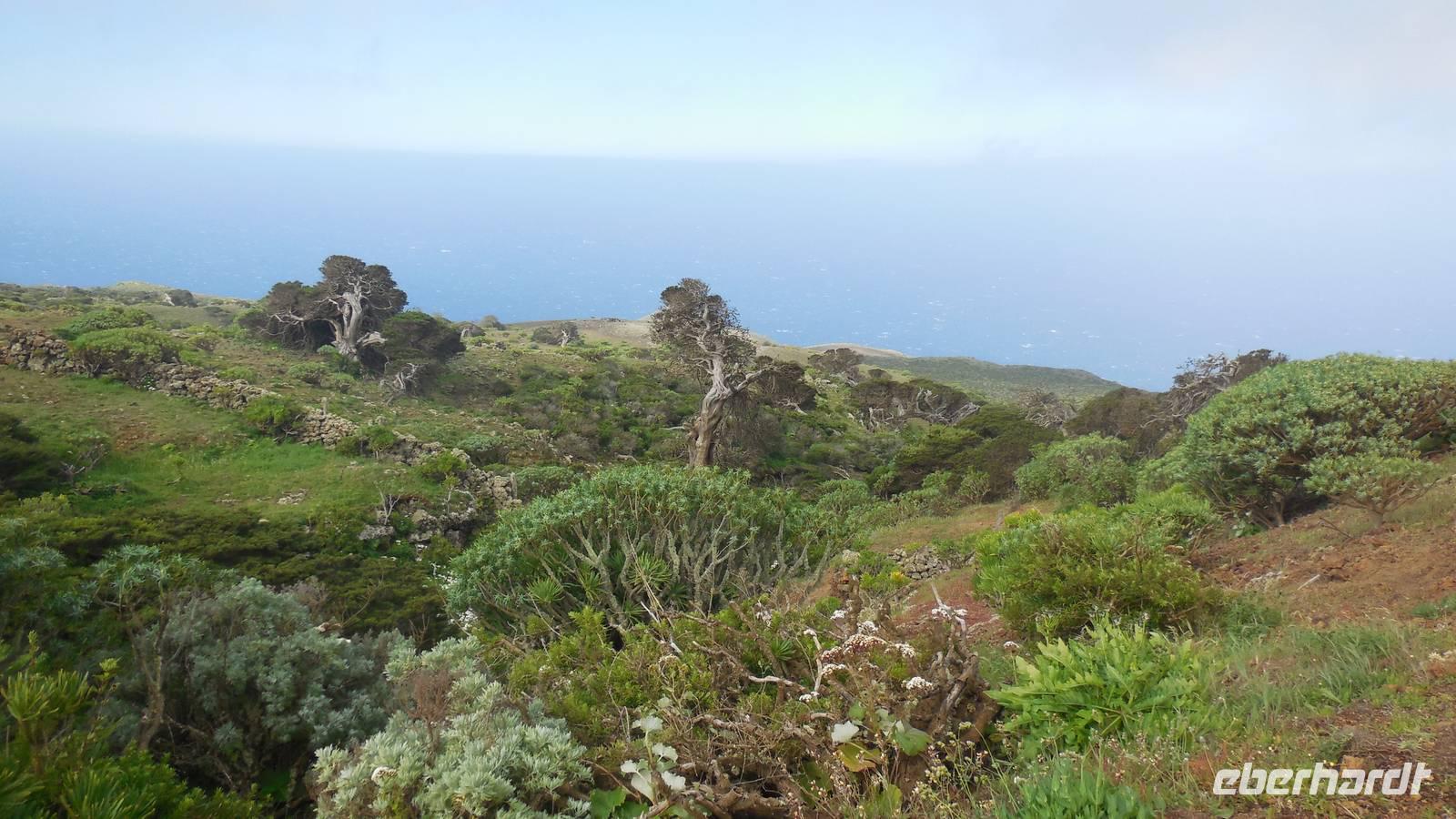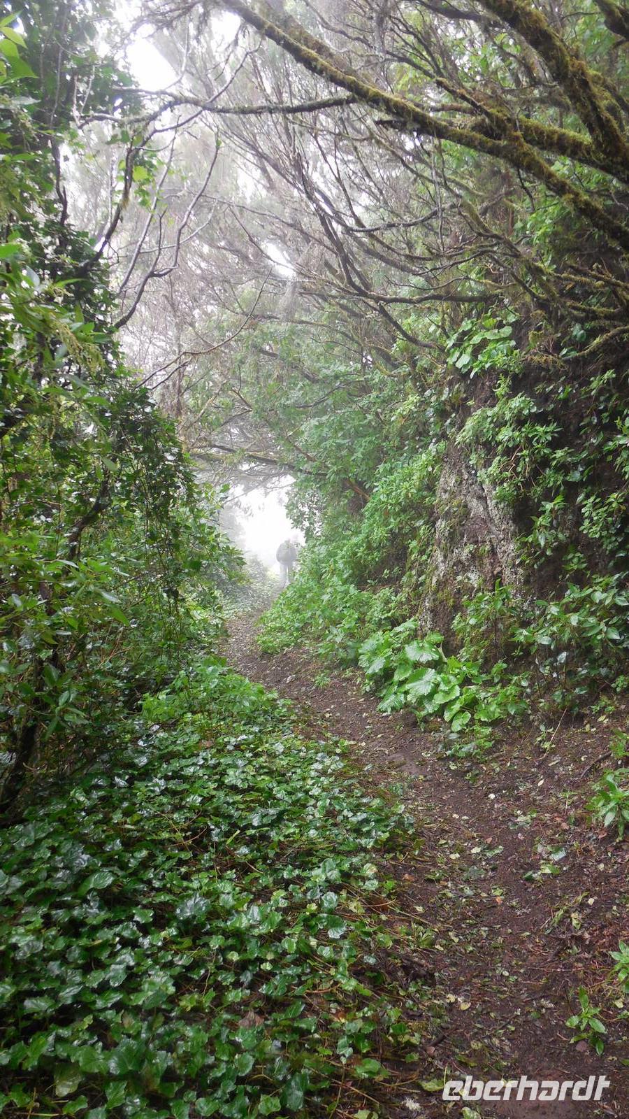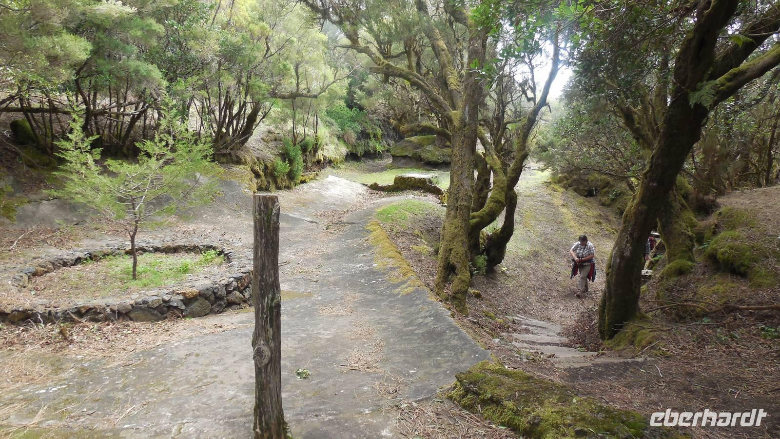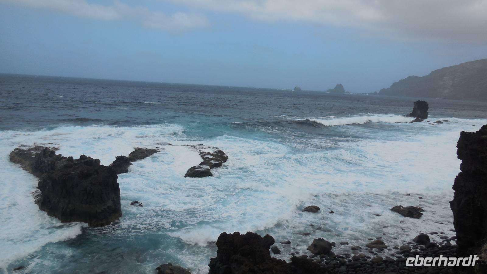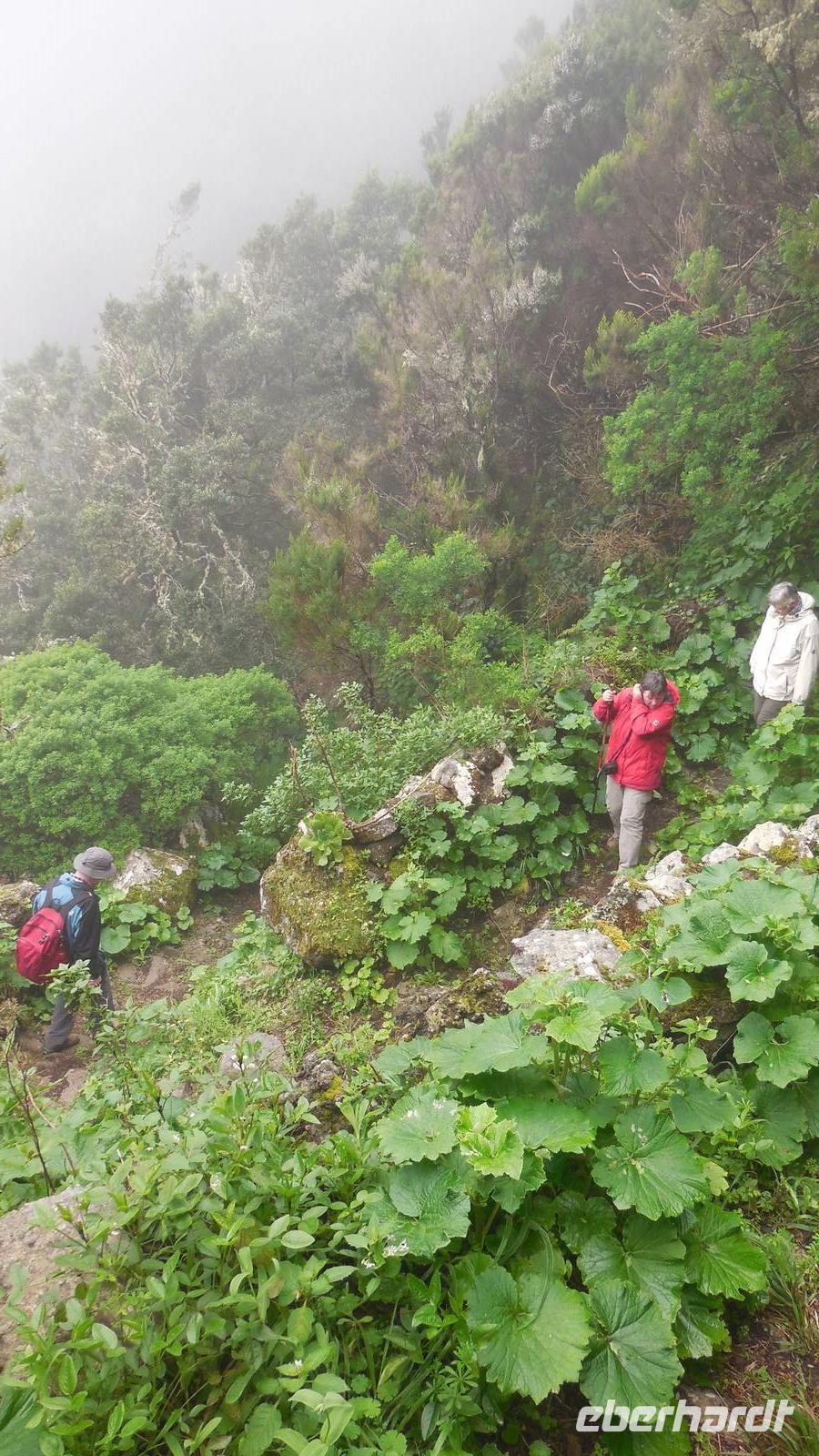 Beim Frühstück schauen wir wieder bangend gen Küste, wo das Meer tobt. Dichter Nebel umhüllt uns und wir stellen uns schon auf einen kalten Wandertag ein. Unser Fahrer bringt uns durch die Nebelwand auf einem halsbrecherischen Serpentinenweg zum Inselheiligtum. Hier auf 800 Meter Höhe geht ein ordentlicher Wind, doch wider Erwarten schauen wir bei strahlendem Sonnenschein und blauen Himmel hinunter aufs Meer. Von der Kapelle, in welcher sich die Statue der Schutzpatronin der Insel befindet, geht es auf einem Wanderweg zu den Sabinas. Hinter der Kapelle finden wir die Höhlen der Hirten vor, welche damals die Mutter Gottes bewachten. Die Sabinas (seltene Baumform) hüllen uns in Staunen - uns umgibt eine Landschaft wie im Horrorfilm! Die Baumstämme und Äste sind ineinander verwickelt und der Stamm krümmt sich in Richtung Erde, als würde der im Boden Schutz suchen. Herrliche Fotomotive bieten diese Naturfaszinationen! Hier mitten in der Natur liest uns Reiseleiter Ralf die Legende über die Ankunft der Schutzpatronin vor. Am Aussichtspunkt Los Bascos schließt ein Weg hoch hinauf in die Weiden. Die Hochweiden mit den Hirtenwegen sind in dichten Nebel gehüllt und von starkem Wind umtobt. Dieser ziemlich anstrengende Anstieg lässt uns die schwere Arbeit der damals hier lebenden Hirten am eigenen Leib erahnen. Endlich erreichen wir den Aussichtspunkt El Sabinal. Wir verschnaufen einen Augenblick und begeben uns in das nächste Landschaftsphänomen: einen dichten nebeligen und feuchten Märchenwald. Hier ist alles moosbewachsen, jeder Stein, jedes Wanderschild - nichts bleibt vom feuchten Klima verschont. Ralf verwöhnt uns mit leckeren, selbst geernteten Nispelfrüchten. Der Waldweg führt bei vielen tollen Ausblicken weiter steil den Berg hinunter bis zum Küstenort Sabinal. Hier angekommen, wäre der Camino de Dehensa endlich geschafft! Der Ort Sabinal besteht aus einen Ober- und Unterdorf, welche miteinander zerstritten sind, wie uns Ralf erzählt. Wir fahren zum Kurhotel Pozo de Salud, in welchem sich der Brunnen mit dem Heilwasser der Insel befindet. Wir kosten vom Heilwasser, welches merkwürdig salzig schmeckt und entspannen bei einem Kaffee. Auf dem Weg zum Hotel stoppen wir noch an einer interessanten Badestelle, der Charco Azul. Hier befindet sich eine Art Badehöhle, welche sich wie eine überdachte Badewanne in das Landschaftsbild einfügt. Am Abend treffen wir uns alle zu einem leckeren Abendessen wieder.