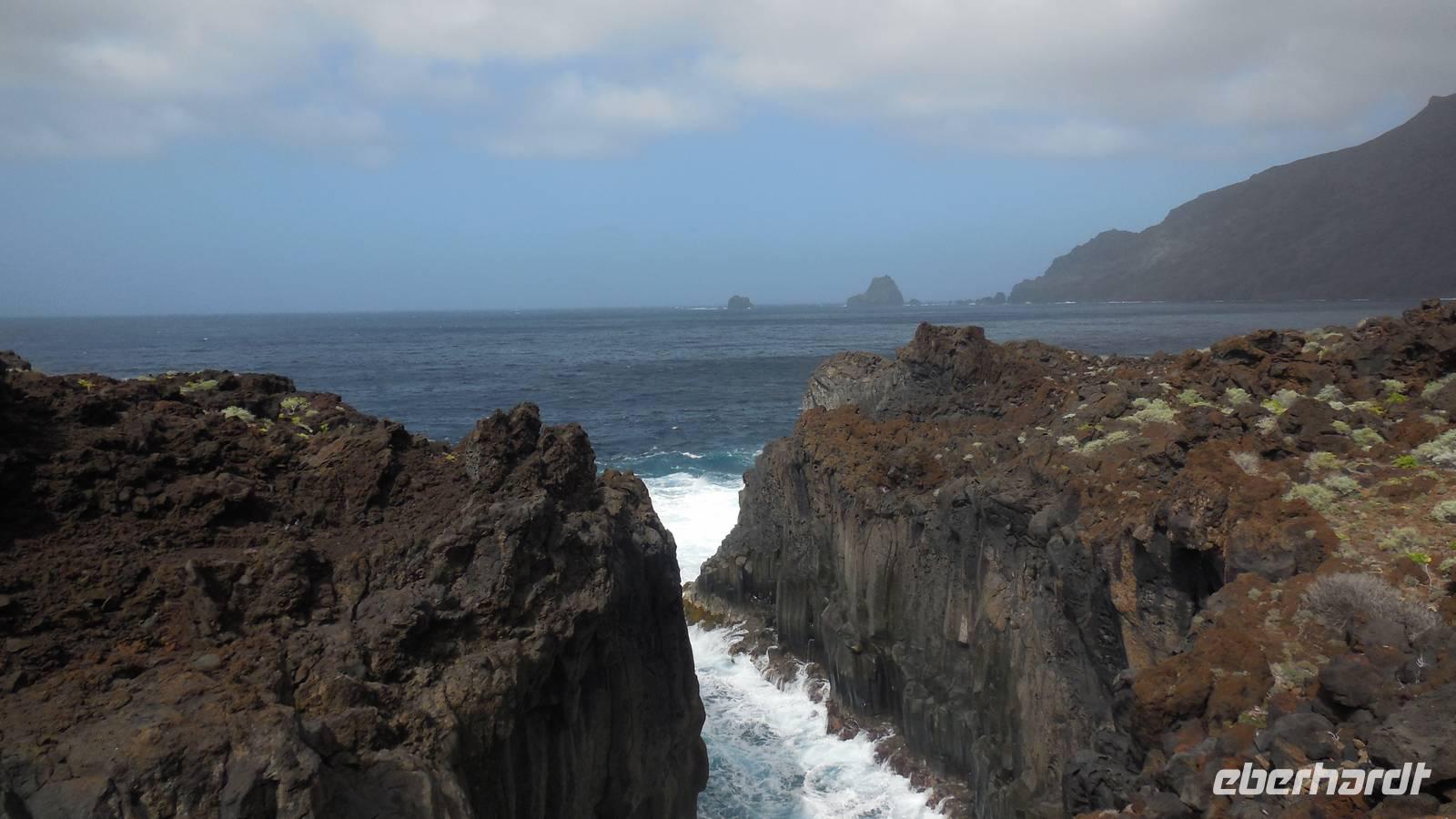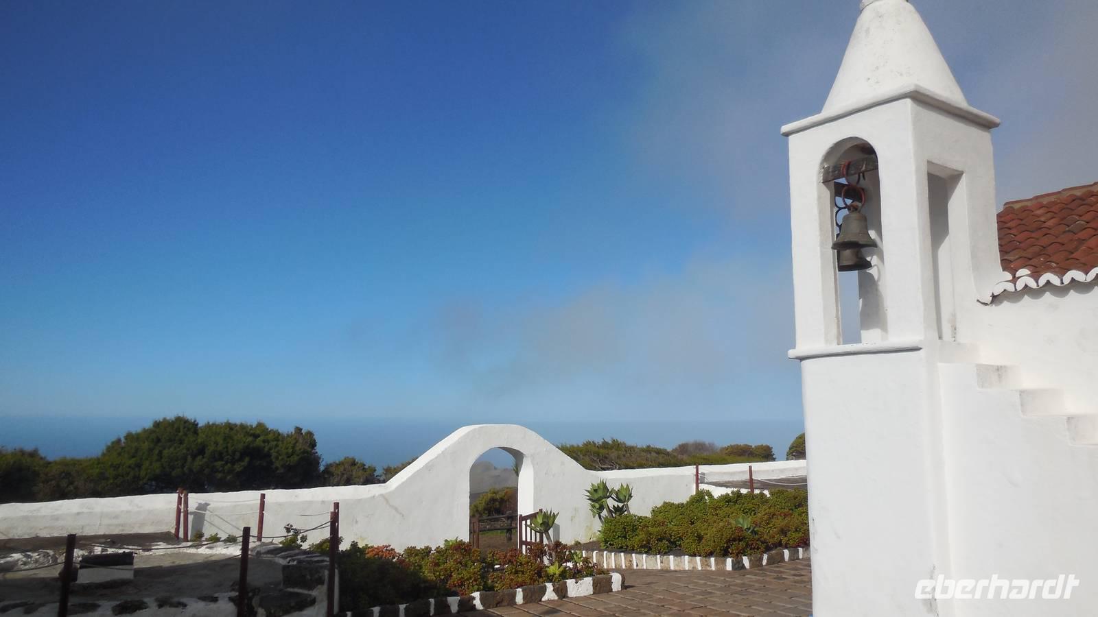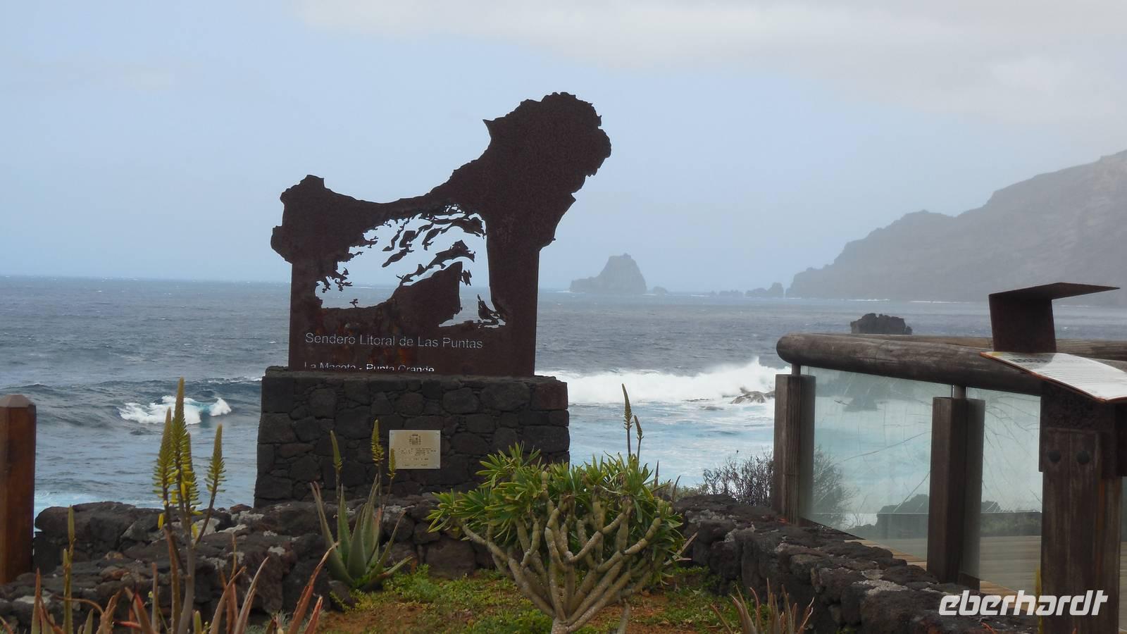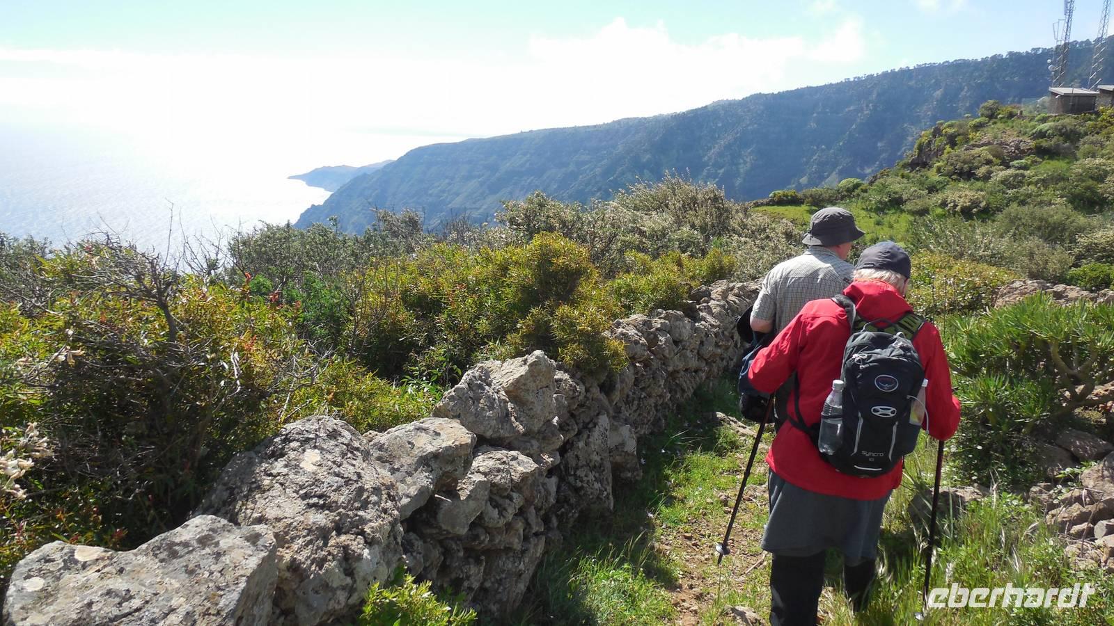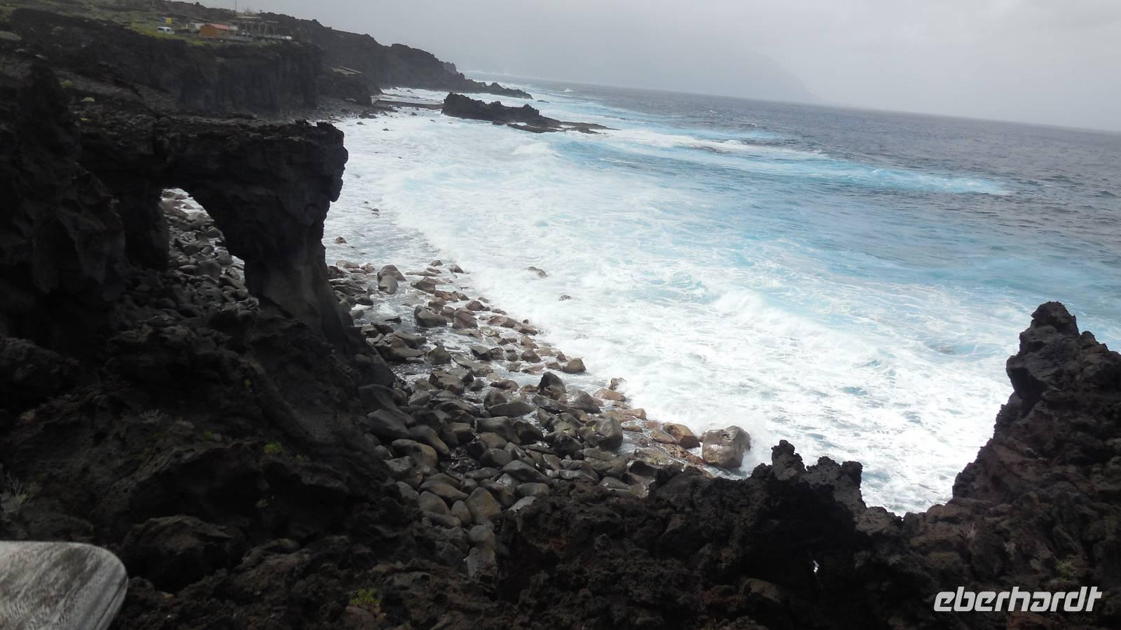 Beim Frühstück schauen wir wieder bangend gen Küste, wo das Meer tobt. Dichter Nebel umhüllt uns und wir stellen uns schon auf einen kalten Wandertag ein. Unser Fahrer bringt uns durch die Nebelwand auf einem halsbrecherischen Serpentinenweg zum Inselheiligtum. Hier auf 800 Meter Höhe geht ein ordentlicher Wind, doch wider Erwarten schauen wir bei strahlendem Sonnenschein und blauen Himmel hinunter aufs Meer. Von der Kapelle, in welcher sich die Statue der Schutzpatronin der Insel befindet, geht es auf einem Wanderweg zu den Sabinas. Hinter der Kapelle finden wir die Höhlen der Hirten vor, welche damals die Mutter Gottes bewachten. Die Sabinas (seltene Baumform) hüllen uns in Staunen - uns umgibt eine Landschaft wie im Horrorfilm! Die Baumstämme und Äste sind ineinander verwickelt und der Stamm krümmt sich in Richtung Erde, als würde der im Boden Schutz suchen. Herrliche Fotomotive bieten diese Naturfaszinationen! Hier mitten in der Natur liest uns Reiseleiter Ralf die Legende über die Ankunft der Schutzpatronin vor. Am Aussichtspunkt Los Bascos schließt ein Weg hoch hinauf in die Weiden. Die Hochweiden mit den Hirtenwegen sind in dichten Nebel gehüllt und von starkem Wind umtobt. Dieser ziemlich anstrengende Anstieg lässt uns die schwere Arbeit der damals hier lebenden Hirten am eigenen Leib erahnen. Endlich erreichen wir den Aussichtspunkt El Sabinal. Wir verschnaufen einen Augenblick und begeben uns in das nächste Landschaftsphänomen: einen dichten nebeligen und feuchten Märchenwald. Hier ist alles moosbewachsen, jeder Stein, jedes Wanderschild - nichts bleibt vom feuchten Klima verschont. Ralf verwöhnt uns mit leckeren, selbst geernteten Nispelfrüchten. Der Waldweg führt bei vielen tollen Ausblicken weiter steil den Berg hinunter bis zum Küstenort Sabinal. Hier angekommen, wäre der Camino de Dehensa endlich geschafft! Der Ort Sabinal besteht aus einen Ober- und Unterdorf, welche miteinander zerstritten sind, wie uns Ralf erzählt. Wir fahren zum Kurhotel Pozo de Salud, in welchem sich der Brunnen mit dem Heilwasser der Insel befindet. Wir kosten vom Heilwasser, welches merkwürdig salzig schmeckt und entspannen bei einem Kaffee. Auf dem Weg zum Hotel stoppen wir noch an einer interessanten Badestelle, der Charco Azul. Hier befindet sich eine Art Badehöhle, welche sich wie eine überdachte Badewanne in das Landschaftsbild einfügt. Am Abend treffen wir uns alle zu einem leckeren Abendessen wieder.