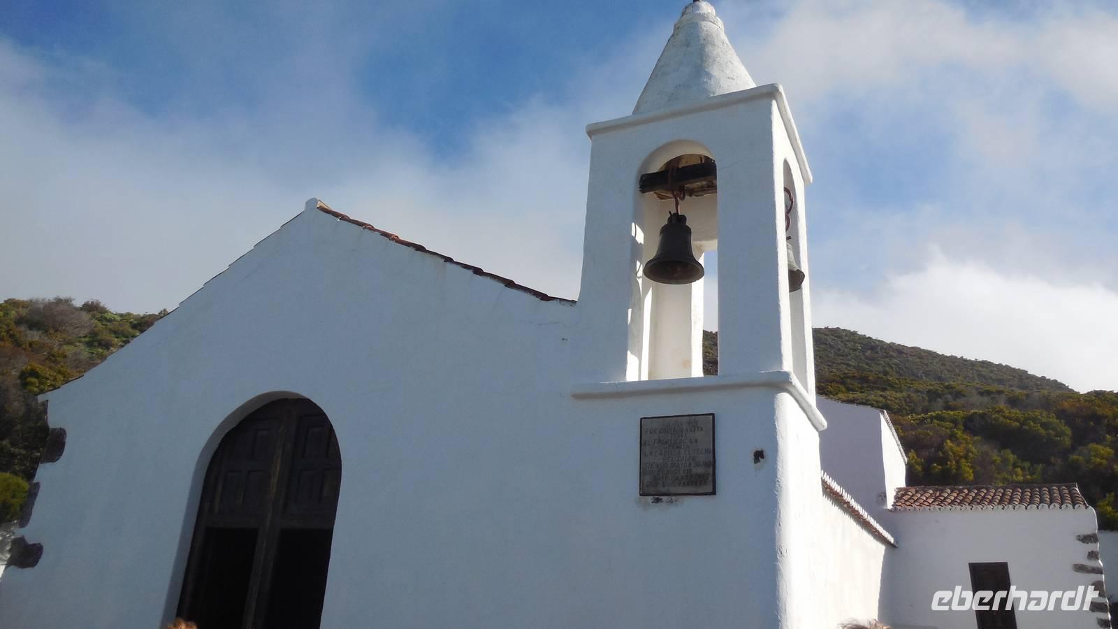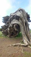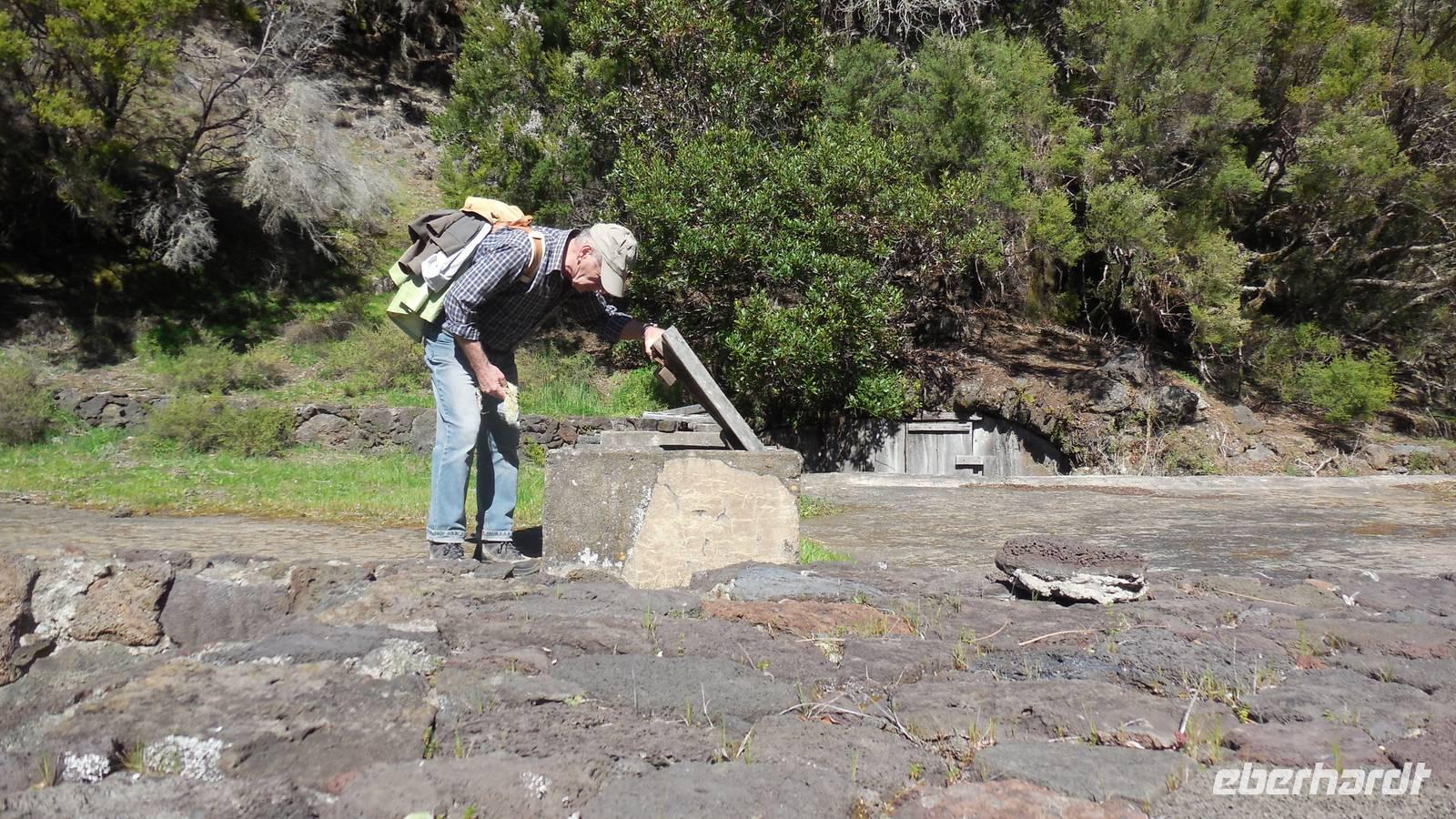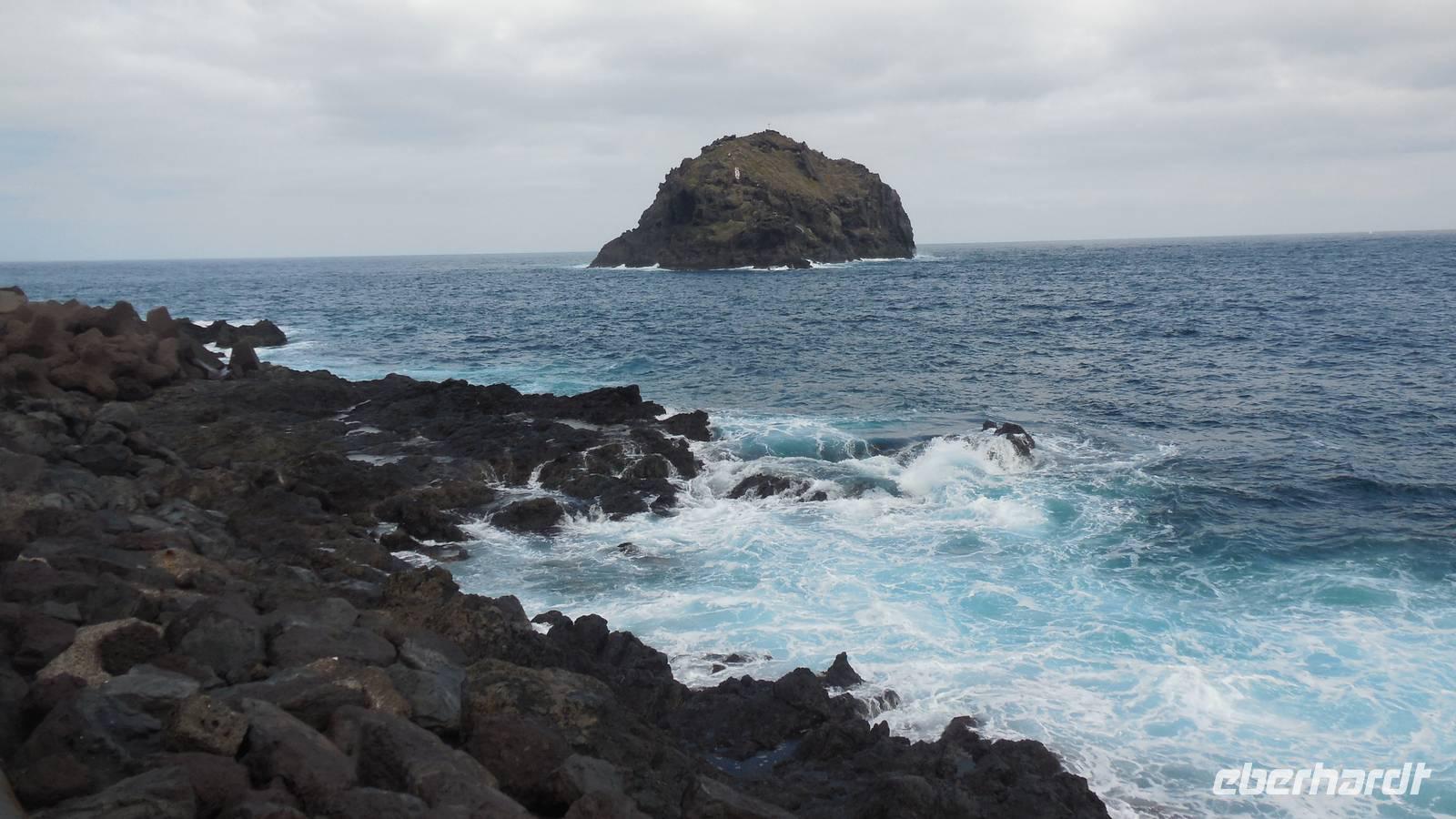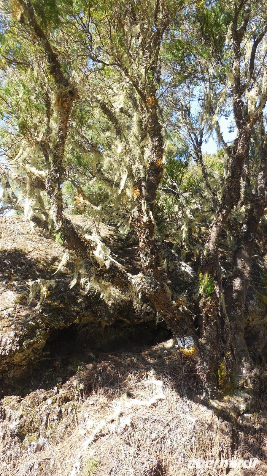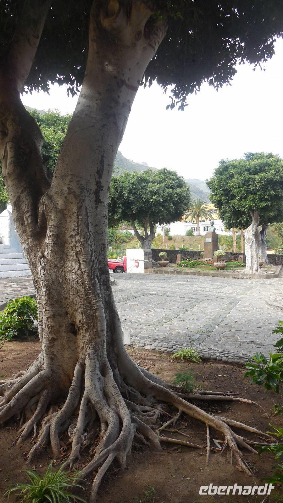 Beim Frühstück schauen wir wieder bangend gen Küste, wo das Meer tobt. Dichter Nebel umhüllt uns und wir stellen uns schon auf einen kalten Wandertag ein. Unser Fahrer bringt uns durch die Nebelwand auf einem halsbrecherischen Serpentinenweg zum Inselheiligtum. Hier auf 800 Meter Höhe geht ein ordentlicher Wind, doch wider Erwarten schauen wir bei strahlendem Sonnenschein und blauen Himmel hinunter aufs Meer. Von der Kapelle, in welcher sich die Statue der Schutzpatronin der Insel befindet, geht es auf einem Wanderweg zu den Sabinas. Hinter der Kapelle finden wir die Höhlen der Hirten vor, welche damals die Mutter Gottes bewachten. Die Sabinas (seltene Baumform) hüllen uns in Staunen - uns umgibt eine Landschaft wie im Horrorfilm! Die Baumstämme und Äste sind ineinander verwickelt und der Stamm krümmt sich in Richtung Erde, als würde der im Boden Schutz suchen. Herrliche Fotomotive bieten diese Naturfaszinationen! Hier mitten in der Natur liest uns Reiseleiter Ralf die Legende über die Ankunft der Schutzpatronin vor. Am Aussichtspunkt Los Bascos schließt ein Weg hoch hinauf in die Weiden. Die Hochweiden mit den Hirtenwegen sind in dichten Nebel gehüllt und von starkem Wind umtobt. Dieser ziemlich anstrengende Anstieg lässt uns die schwere Arbeit der damals hier lebenden Hirten am eigenen Leib erahnen. Endlich erreichen wir den Aussichtspunkt El Sabinal. Wir verschnaufen einen Augenblick und begeben uns in das nächste Landschaftsphänomen: einen dichten nebeligen und feuchten Märchenwald. Hier ist alles moosbewachsen, jeder Stein, jedes Wanderschild - nichts bleibt vom feuchten Klima verschont. Ralf verwöhnt uns mit leckeren, selbst geernteten Nispelfrüchten. Der Waldweg führt bei vielen tollen Ausblicken weiter steil den Berg hinunter bis zum Küstenort Sabinal. Hier angekommen, wäre der Camino de Dehensa endlich geschafft! Der Ort Sabinal besteht aus einen Ober- und Unterdorf, welche miteinander zerstritten sind, wie uns Ralf erzählt. Wir fahren zum Kurhotel Pozo de Salud, in welchem sich der Brunnen mit dem Heilwasser der Insel befindet. Wir kosten vom Heilwasser, welches merkwürdig salzig schmeckt und entspannen bei einem Kaffee. Auf dem Weg zum Hotel stoppen wir noch an einer interessanten Badestelle, der Charco Azul. Hier befindet sich eine Art Badehöhle, welche sich wie eine überdachte Badewanne in das Landschaftsbild einfügt. Am Abend treffen wir uns alle zu einem leckeren Abendessen wieder.