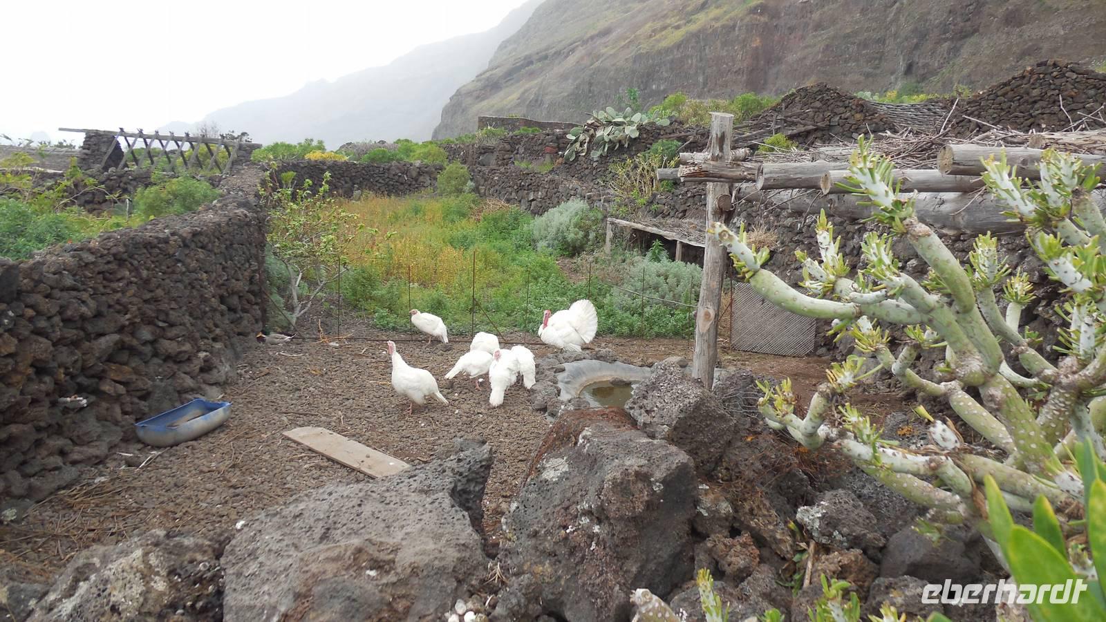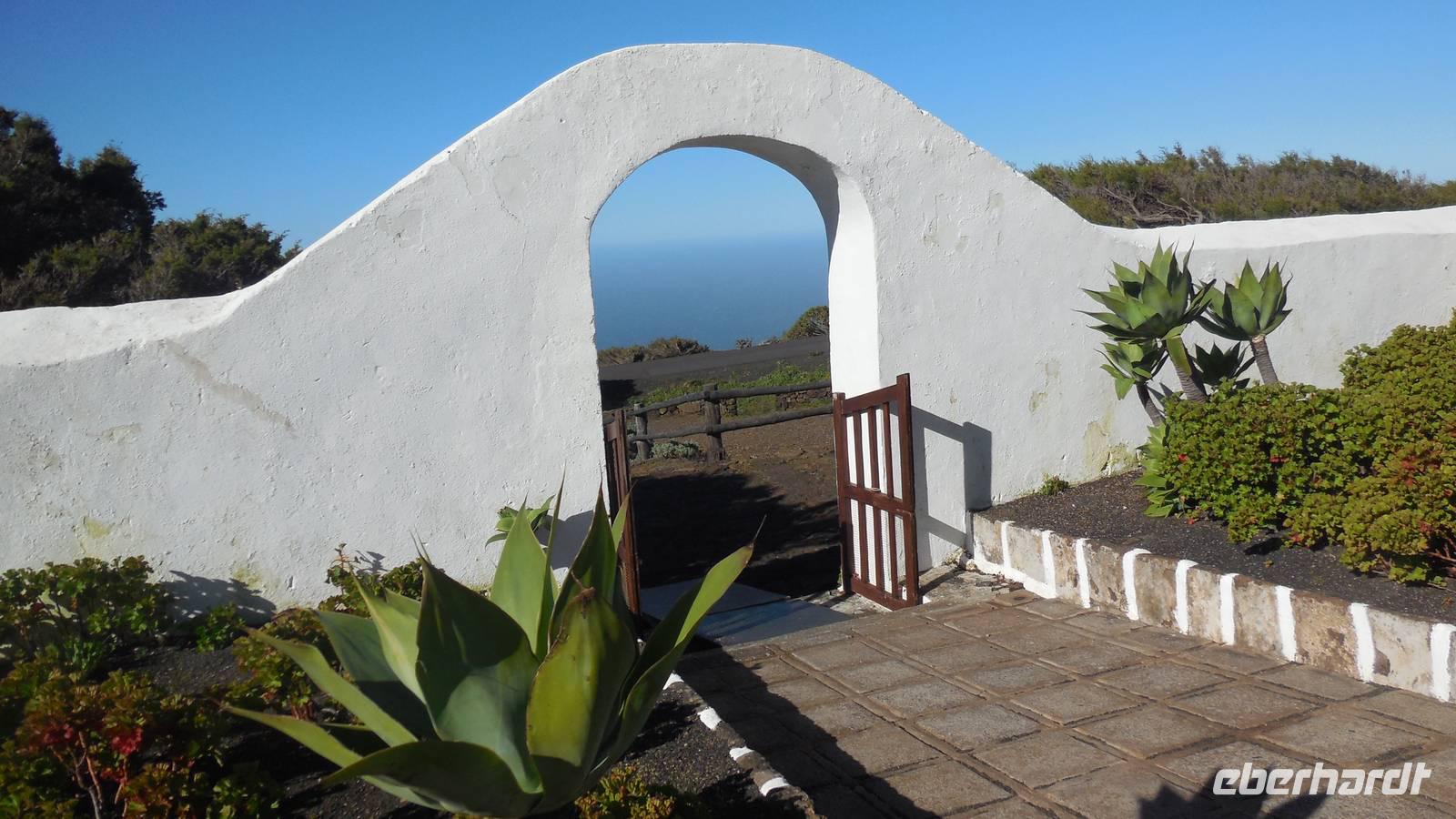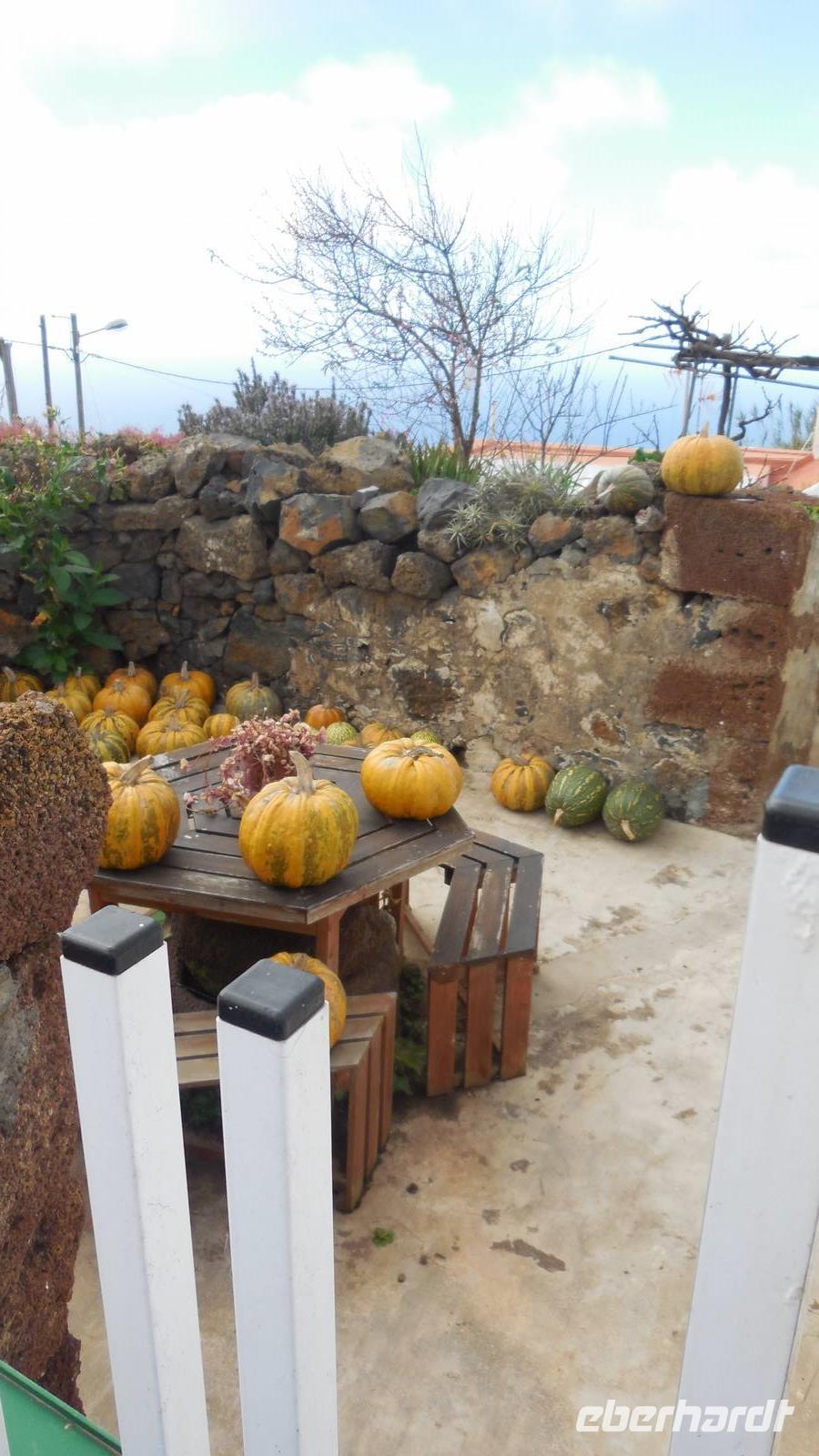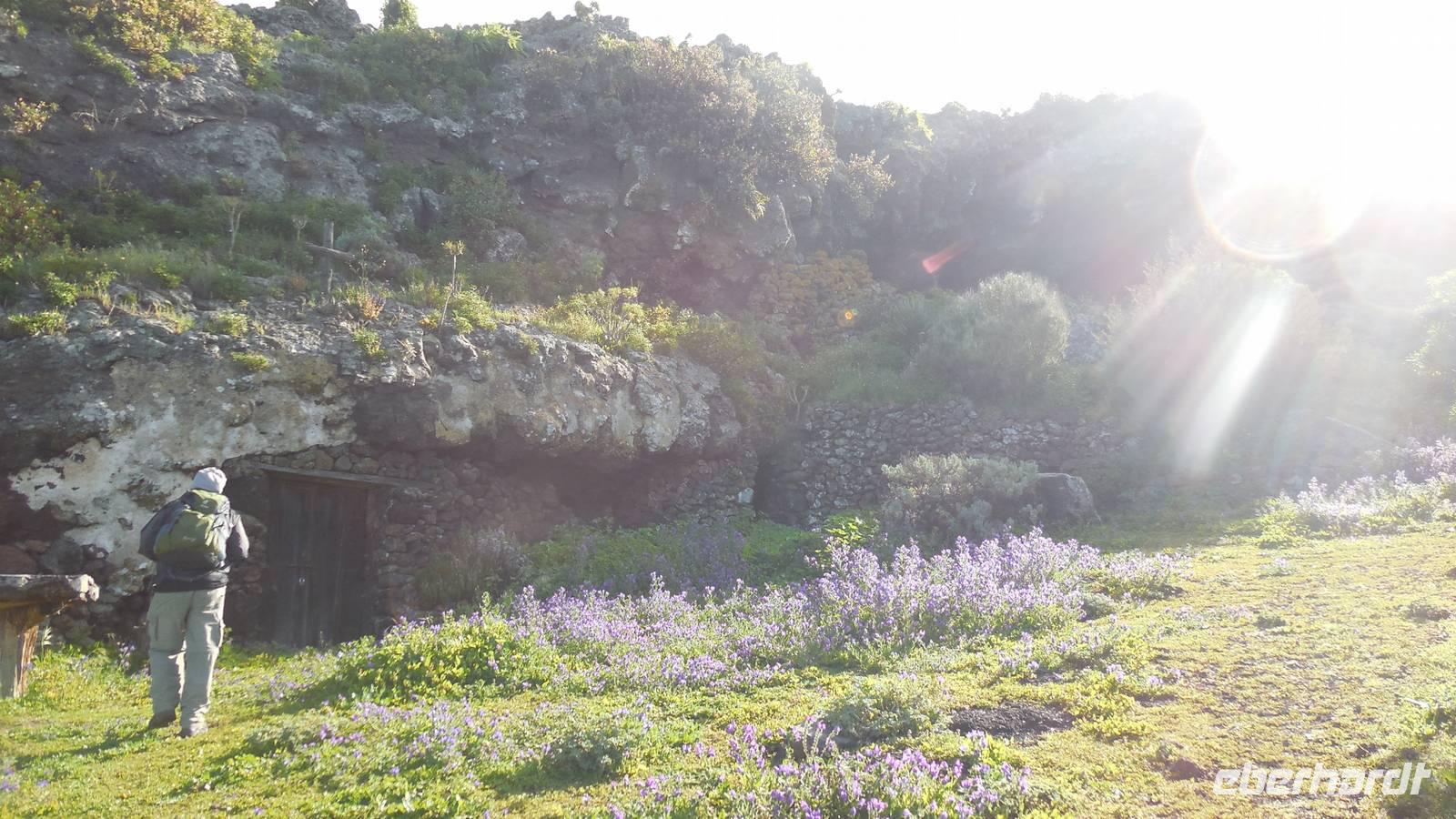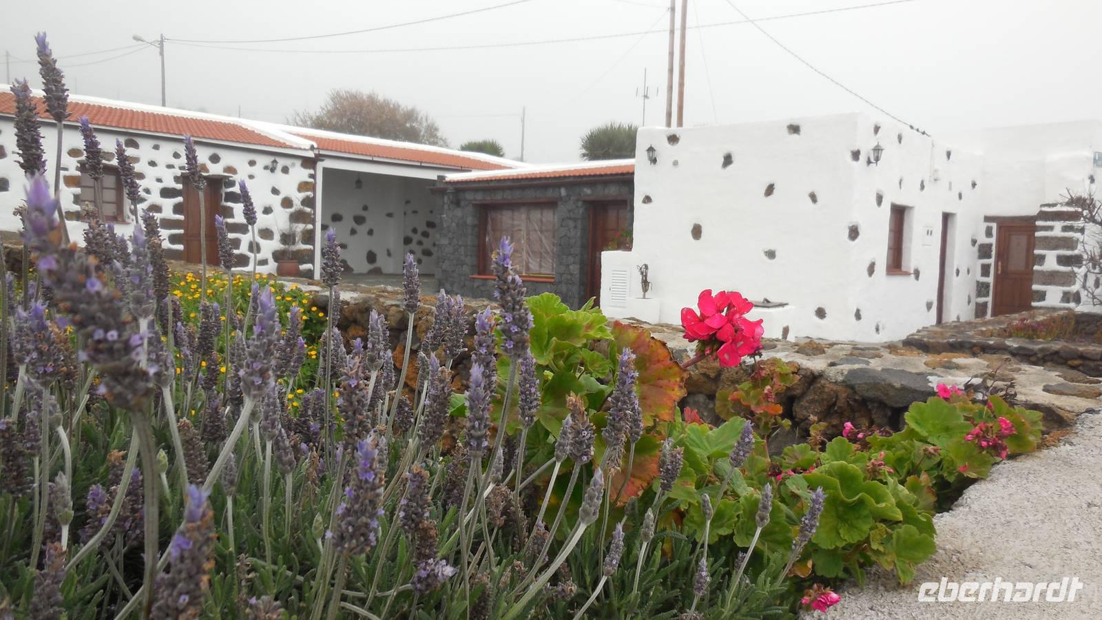 Nach circa 1 ½ Stunden typisch spanischer Verspätung heben wir ab. Als wir die Wolkendecke durchbrechen, erwartet uns ein unvergesslicher Anblick: der Teide, umgeben von einem weißen Wolkenmeer. Anschließend fliegen wir über La Palma hinweg und erreichen in ca. 40 Minuten El Hierro. Die kleine Insel empfängt uns mit einem frischen Wind und Nebelschwaden. Unser Wanderreiseleiter Ralf empfängt uns am Flughafen und erzählt uns auf dem Weg zum Hotel schon etwas über die feuchtgrüne Wanderinsel. Die Insel lebt hauptsächlich von der Landwirtschaft und ist ein riesiges Biosphärenreservat. Interessant ist, dass die ganze Insel vom selbst erzeugtem Strom versorgt wird. Diesen gewinnt man hier mit Hilfe von fünf riesigen Windrädern, an denen wir ebenfalls vorbeifahren. Damit ist es die erste Insel weltweit, welche nur vom eigenen erzeugten Strom lebt. Weitere Ökoprojekte sind schon geplant, zum Beispiel soll es bald nur noch Elektroautos auf der Insel geben. Schließlich erreichen wir unser Hotel im verschlafenen Ort El Mocanal. Neben einer unglaublichen Aussicht, die wir von unseren Zimmern aus genießen, gibt es hier im Ort nur zwei Bars, ein Restaurant, ein Landhotel und zwei kleine Tante Emma ähnliche Supermärkte. Unsere Zimmer sind schon bezugsfertig und wir finden ein gesundes, bäuerliches Frühstück vor. Abenteuerlustig entscheiden wir uns für den heutigen freien Nachmittag für eine Wanderung hinunter an die Küste zum Meerwasserbecken Pozo de las Calcosas. Der Weg ist beschwerlich und besteht fast nur aus Kopfsteinplastersteinen. Doch die unberührte Natur und der Ausblick hinunter auf die Küste lohnt alle Anstrengungen. Wir sehen seltene, schöne Blumen und wandern vorbei an vielen Agavenstauden - immer mit dem Blick gen Meer. Von einer Mitreisenden lernen wir, dass die Agaven ihre charakteristische riesige Blüte entwickeln, bevor es mit der Pflanze zu Ende geht. Dann stirbt die Pflanze ab und die „Kinder" wachsen nach. Wir durchwandern einen regelrechten „Agavenfriedhof" und sehen neben verlassenen alleinstehenden Steinhäuschen auch viele hübsche kleine Schmetterlinge. Ca. 500 Meter bergab geht es in das kleine Dörfchen. Am Aussichtspunkt belohnt uns ein fantastischer Blick auf die Wellen, welche am Meerwasserbecken brechen. Die Badelagune grenzt an ein kleines Dörfchen, bestehend aus Steinhäusern mit Strohdächern. Den Weg, ca. 100 weitere Meter nach unten, ersparen wir uns jedoch. Da am Sonntag keine Busse mehr fahren, laufen wir zurück nach oben - was sich jedoch viel anstrengender als der Abstieg erweist. Somit schlagen wir einen anderen Weg ein, und gelangen über eine langwierige Serpentinienstraße zurück ins Hotel. Auf dem Weg begegnen uns Bergziegen auf der Straße und faszinierende Gewächse wie Riesenlöwenzahn und eigenartige Mini-Melonen-Kürbisse, welche wie Partylampions an den Zäunen hängen. Jetzt haben wir uns wahrlich ein Bierchen in der Hotellobby verdient - wieder bei atemberaubenden Ausblick. Um sechs Uhr abends treffen wir uns wieder mit Ralf. Bei einem Glas typischen Weins von El Hierro lauschen wir seinen Berichten von der Insel und erfahren mehr über die bevorstehenden Tage und Wanderrouten. Seit 16 Jahren lebt er hier und es ist unschwer zu erkennen, dass für diese Insel sein Herz schlägt. Anschließend essen wir gemeinsam zu Abend. Heute werden Hühnchen mit traditionellen Papas arrugadas und den dazugehörenden Mojo Saußen serviert.