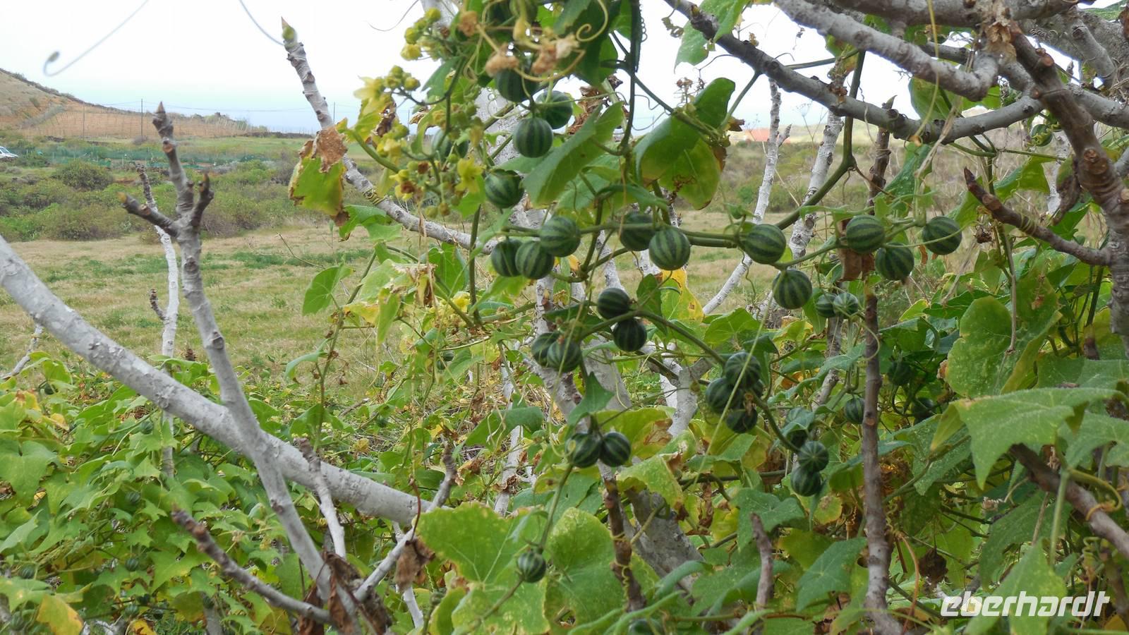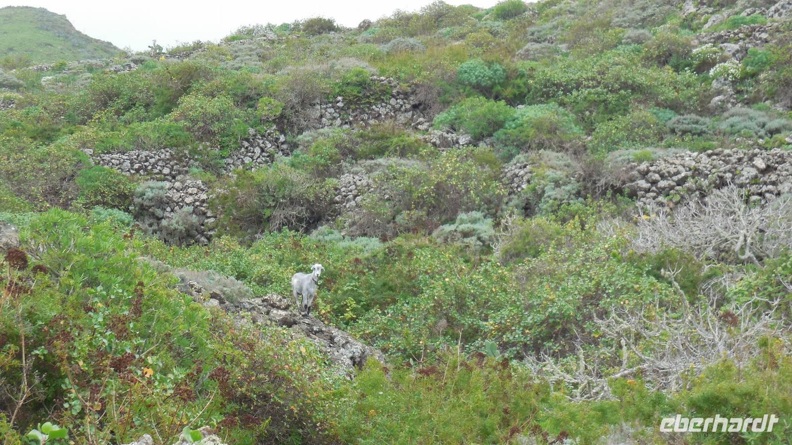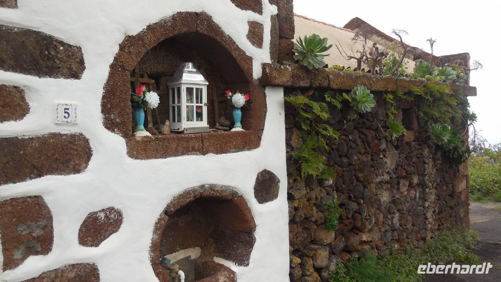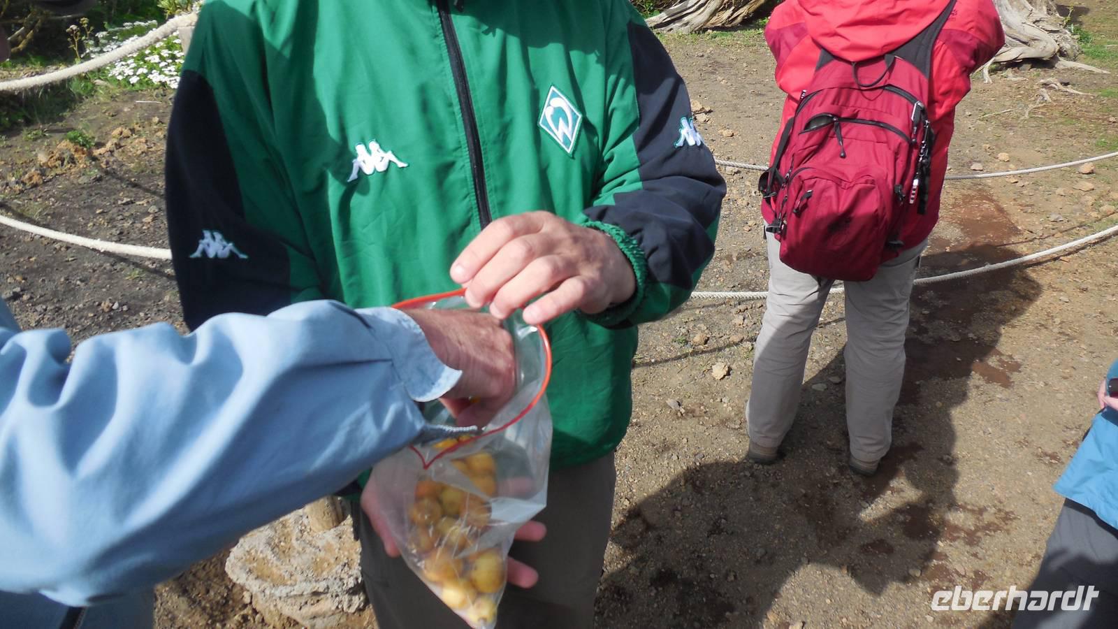 Nach circa 1 ½ Stunden typisch spanischer Verspätung heben wir ab. Als wir die Wolkendecke durchbrechen, erwartet uns ein unvergesslicher Anblick: der Teide, umgeben von einem weißen Wolkenmeer. Anschließend fliegen wir über La Palma hinweg und erreichen in ca. 40 Minuten El Hierro. Die kleine Insel empfängt uns mit einem frischen Wind und Nebelschwaden. Unser Wanderreiseleiter Ralf empfängt uns am Flughafen und erzählt uns auf dem Weg zum Hotel schon etwas über die feuchtgrüne Wanderinsel. Die Insel lebt hauptsächlich von der Landwirtschaft und ist ein riesiges Biosphärenreservat. Interessant ist, dass die ganze Insel vom selbst erzeugtem Strom versorgt wird. Diesen gewinnt man hier mit Hilfe von fünf riesigen Windrädern, an denen wir ebenfalls vorbeifahren. Damit ist es die erste Insel weltweit, welche nur vom eigenen erzeugten Strom lebt. Weitere Ökoprojekte sind schon geplant, zum Beispiel soll es bald nur noch Elektroautos auf der Insel geben. Schließlich erreichen wir unser Hotel im verschlafenen Ort El Mocanal. Neben einer unglaublichen Aussicht, die wir von unseren Zimmern aus genießen, gibt es hier im Ort nur zwei Bars, ein Restaurant, ein Landhotel und zwei kleine Tante Emma ähnliche Supermärkte. Unsere Zimmer sind schon bezugsfertig und wir finden ein gesundes, bäuerliches Frühstück vor. Abenteuerlustig entscheiden wir uns für den heutigen freien Nachmittag für eine Wanderung hinunter an die Küste zum Meerwasserbecken Pozo de las Calcosas. Der Weg ist beschwerlich und besteht fast nur aus Kopfsteinplastersteinen. Doch die unberührte Natur und der Ausblick hinunter auf die Küste lohnt alle Anstrengungen. Wir sehen seltene, schöne Blumen und wandern vorbei an vielen Agavenstauden - immer mit dem Blick gen Meer. Von einer Mitreisenden lernen wir, dass die Agaven ihre charakteristische riesige Blüte entwickeln, bevor es mit der Pflanze zu Ende geht. Dann stirbt die Pflanze ab und die „Kinder" wachsen nach. Wir durchwandern einen regelrechten „Agavenfriedhof" und sehen neben verlassenen alleinstehenden Steinhäuschen auch viele hübsche kleine Schmetterlinge. Ca. 500 Meter bergab geht es in das kleine Dörfchen. Am Aussichtspunkt belohnt uns ein fantastischer Blick auf die Wellen, welche am Meerwasserbecken brechen. Die Badelagune grenzt an ein kleines Dörfchen, bestehend aus Steinhäusern mit Strohdächern. Den Weg, ca. 100 weitere Meter nach unten, ersparen wir uns jedoch. Da am Sonntag keine Busse mehr fahren, laufen wir zurück nach oben - was sich jedoch viel anstrengender als der Abstieg erweist. Somit schlagen wir einen anderen Weg ein, und gelangen über eine langwierige Serpentinienstraße zurück ins Hotel. Auf dem Weg begegnen uns Bergziegen auf der Straße und faszinierende Gewächse wie Riesenlöwenzahn und eigenartige Mini-Melonen-Kürbisse, welche wie Partylampions an den Zäunen hängen. Jetzt haben wir uns wahrlich ein Bierchen in der Hotellobby verdient - wieder bei atemberaubenden Ausblick. Um sechs Uhr abends treffen wir uns wieder mit Ralf. Bei einem Glas typischen Weins von El Hierro lauschen wir seinen Berichten von der Insel und erfahren mehr über die bevorstehenden Tage und Wanderrouten. Seit 16 Jahren lebt er hier und es ist unschwer zu erkennen, dass für diese Insel sein Herz schlägt. Anschließend essen wir gemeinsam zu Abend. Heute werden Hühnchen mit traditionellen Papas arrugadas und den dazugehörenden Mojo Saußen serviert.