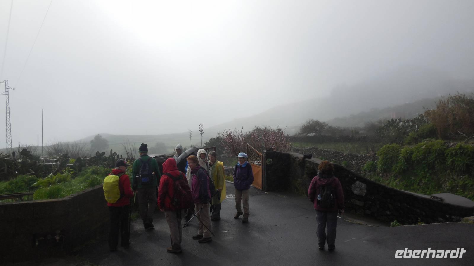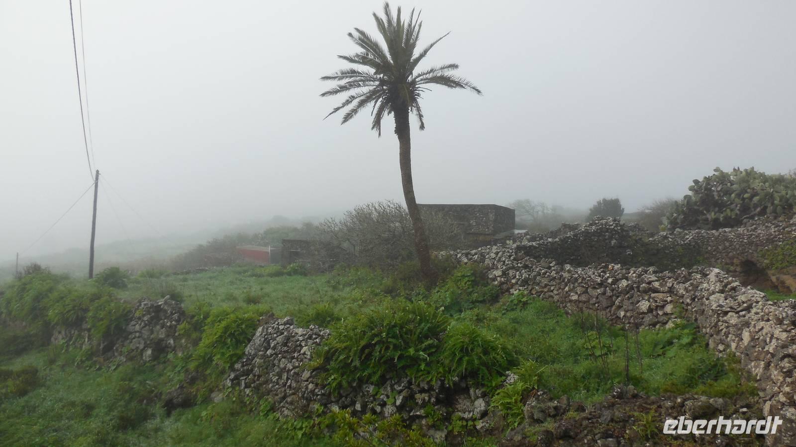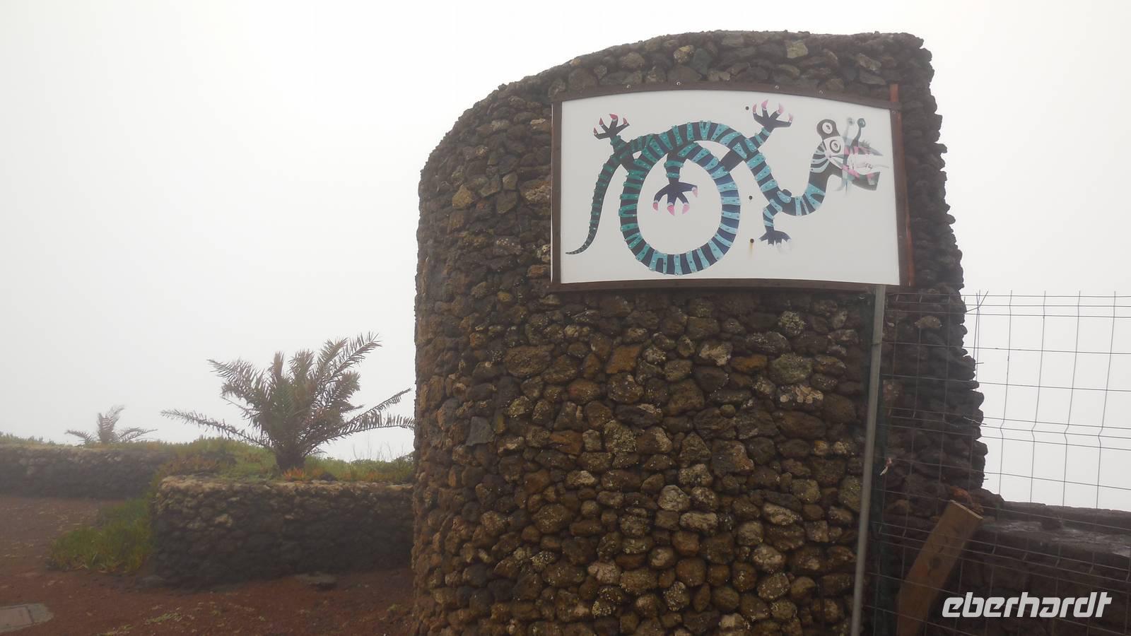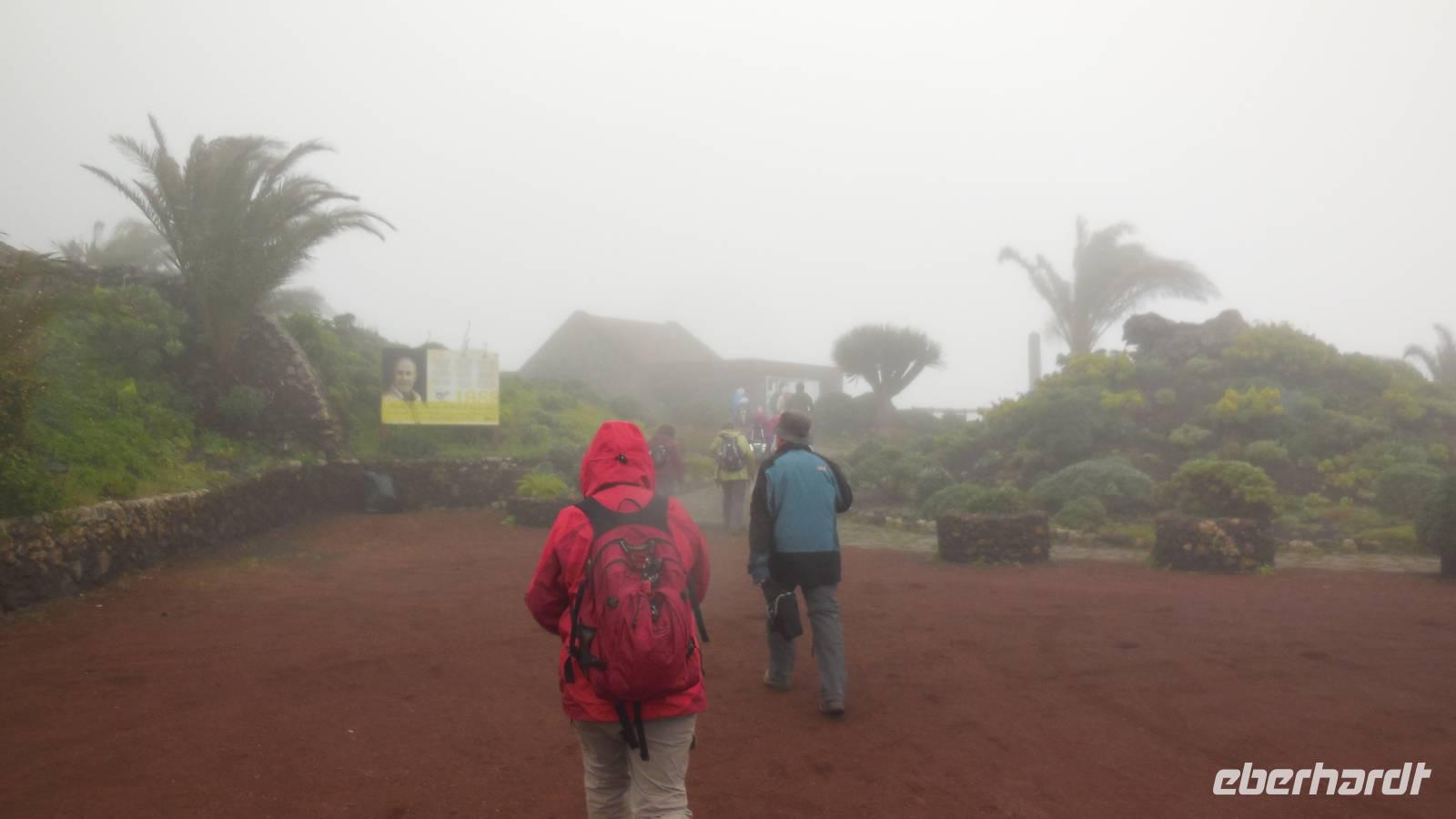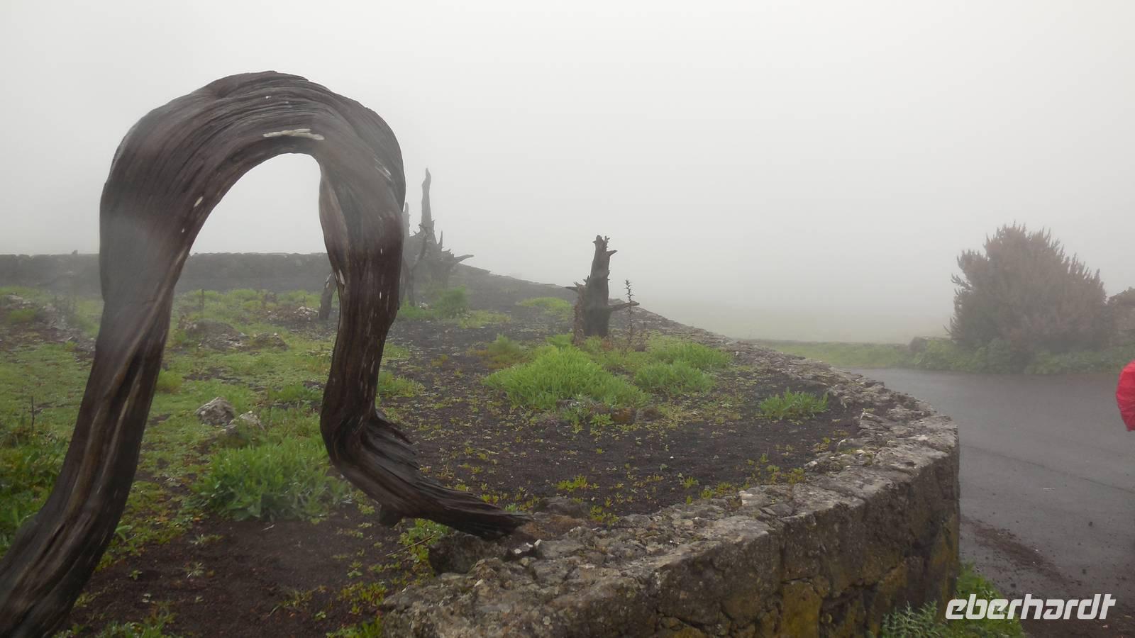 El Mocanal ist von dicken Nebelschwaden umgeben und die Straßen sind nass vom gewöhnlichen nächtlichen Regen. Nach einem leckeren Frühstück mit Dreimilchkäse und viel Obst, werden wir von Ralf empfangen und fahren durch den dichten Nebel zum Mirador de Jinama in 1200 Meter Höhe. Mirador, bedeutet auf spanisch Aussichtspunkt. Bei diesem für El Hierro nicht ungewöhnlichen, feucht-nebligen Morgen, sehen wir jedoch gerade mal die Hand vor Augen. Daher verweilen wir hier nicht lange und machen uns auf den Weg durch die Hochweiden nach San Andres. Diese Weiden erinnern an Irlands und Schottlands grüne Ebenen. Feuchte und saftig, grüne Wiesen werden hier von Mauern aus Lavabrocken geteilt. Hier ist Vorsicht geboten, denn die vielen Steine der Straßen sind glitschig und wer nicht aufpasst, kann schnell einmal ausrutschen. Tiefe Ruhe umfängt das Tal, hier fühlen wir uns wirklich etwas wie am Ende der Welt. Im Nieselregen bleibt keiner trocken, doch merkwürdigerweise ist es trotzdem nicht sehr kalt. Schließlich erreichen wir das kleine Städtchen San Andres, wo wir in einer Bar zum Trocknen einkehren. Während wir uns einen traditionellen Barraquito mit Gofiokuchen schmecken lassen, gibt Ralf eine Märchenstunde und liest uns die Legende von der schönen Tochter des Oberhauptes von Guarazoca und dem Regenbaum vor. Der Regenbaum spielte auf der trinkwasserarmen Insel eine besonders wichtige Rolle.