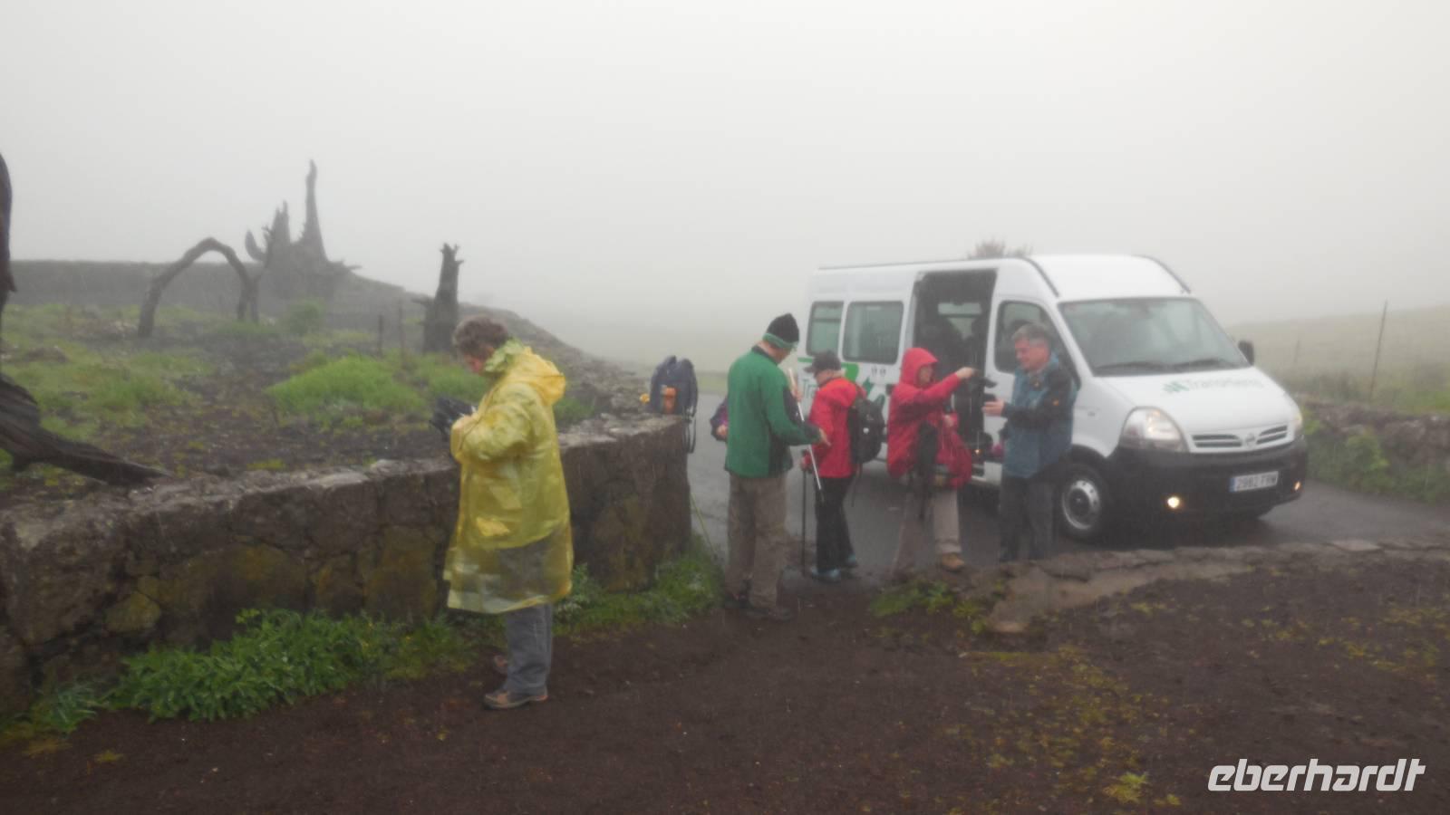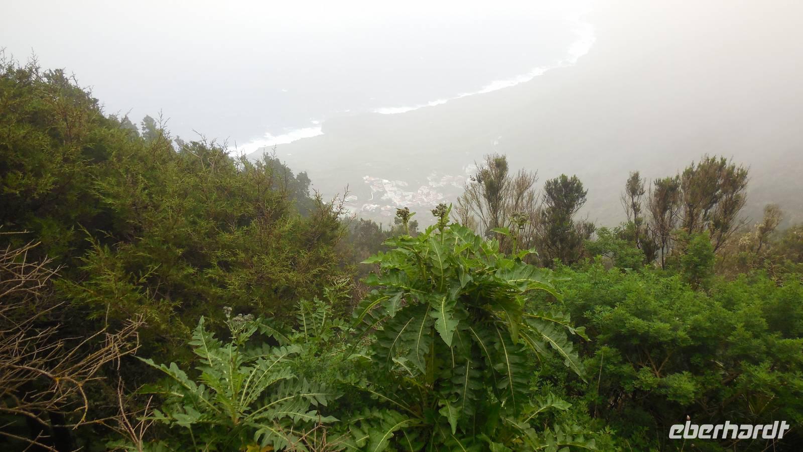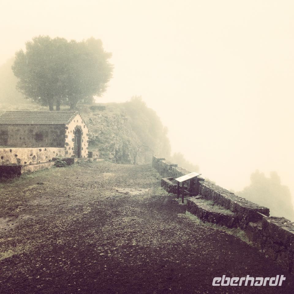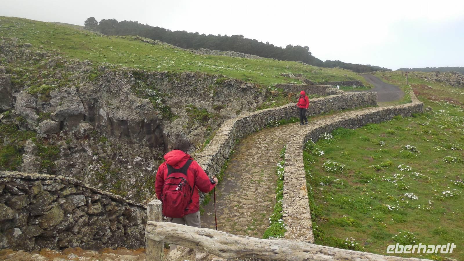 El Mocanal ist von dicken Nebelschwaden umgeben und die Straßen sind nass vom gewöhnlichen nächtlichen Regen. Nach einem leckeren Frühstück mit Dreimilchkäse und viel Obst, werden wir von Ralf empfangen und fahren durch den dichten Nebel zum Mirador de Jinama in 1200 Meter Höhe. Mirador, bedeutet auf spanisch Aussichtspunkt. Bei diesem für El Hierro nicht ungewöhnlichen, feucht-nebligen Morgen, sehen wir jedoch gerade mal die Hand vor Augen. Daher verweilen wir hier nicht lange und machen uns auf den Weg durch die Hochweiden nach San Andres. Diese Weiden erinnern an Irlands und Schottlands grüne Ebenen. Feuchte und saftig, grüne Wiesen werden hier von Mauern aus Lavabrocken geteilt. Hier ist Vorsicht geboten, denn die vielen Steine der Straßen sind glitschig und wer nicht aufpasst, kann schnell einmal ausrutschen. Tiefe Ruhe umfängt das Tal, hier fühlen wir uns wirklich etwas wie am Ende der Welt. Im Nieselregen bleibt keiner trocken, doch merkwürdigerweise ist es trotzdem nicht sehr kalt. Schließlich erreichen wir das kleine Städtchen San Andres, wo wir in einer Bar zum Trocknen einkehren. Während wir uns einen traditionellen Barraquito mit Gofiokuchen schmecken lassen, gibt Ralf eine Märchenstunde und liest uns die Legende von der schönen Tochter des Oberhauptes von Guarazoca und dem Regenbaum vor. Der Regenbaum spielte auf der trinkwasserarmen Insel eine besonders wichtige Rolle.