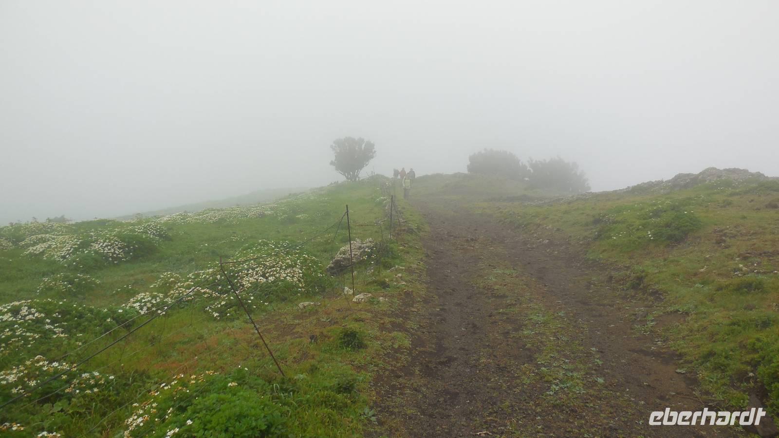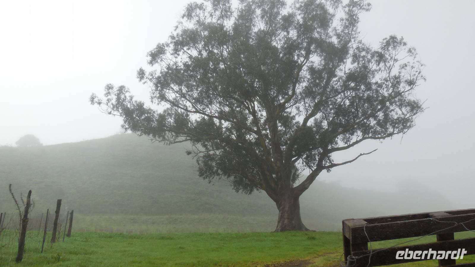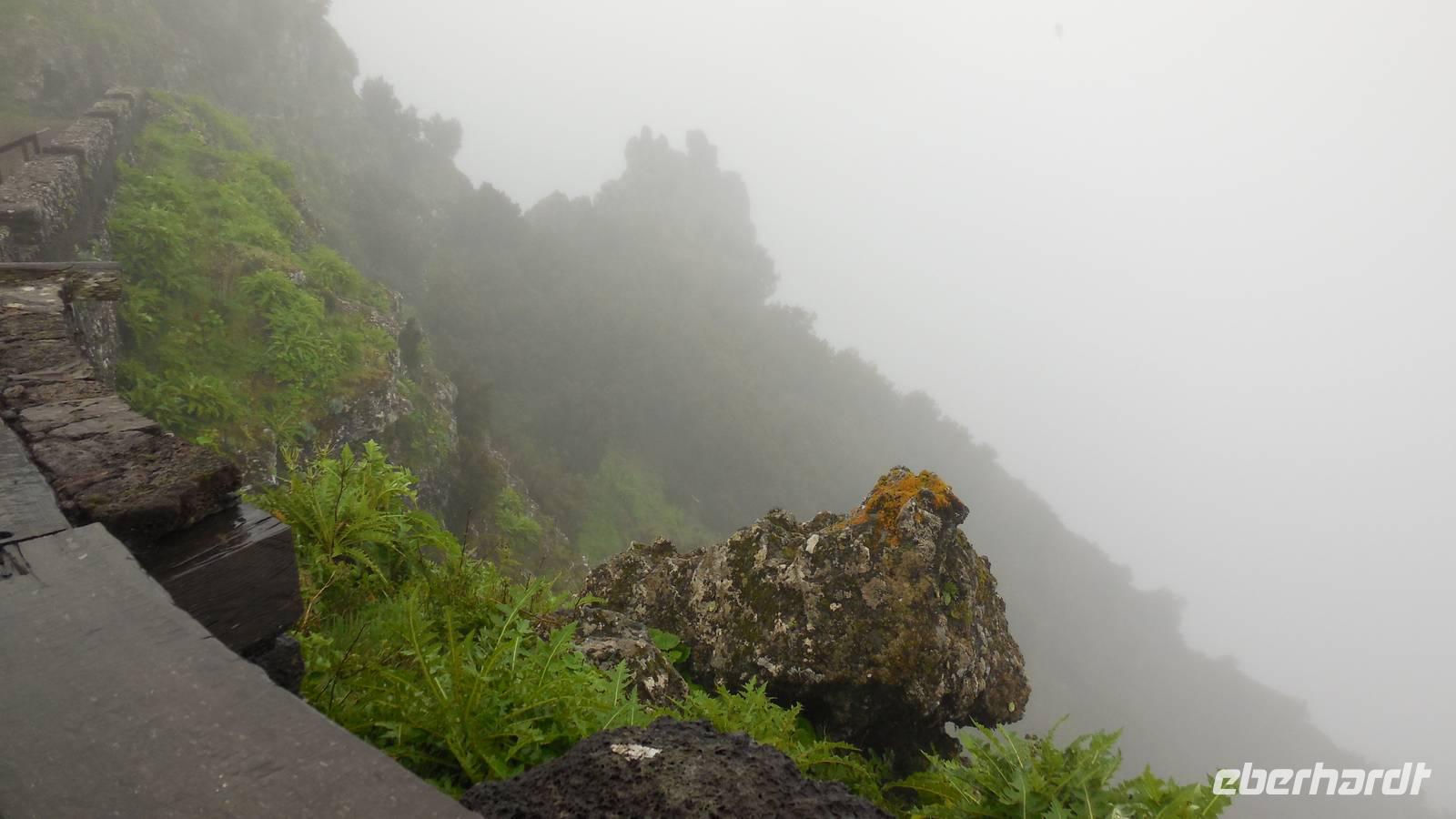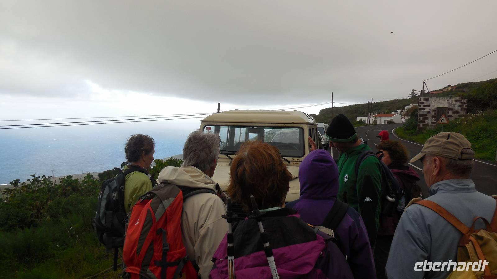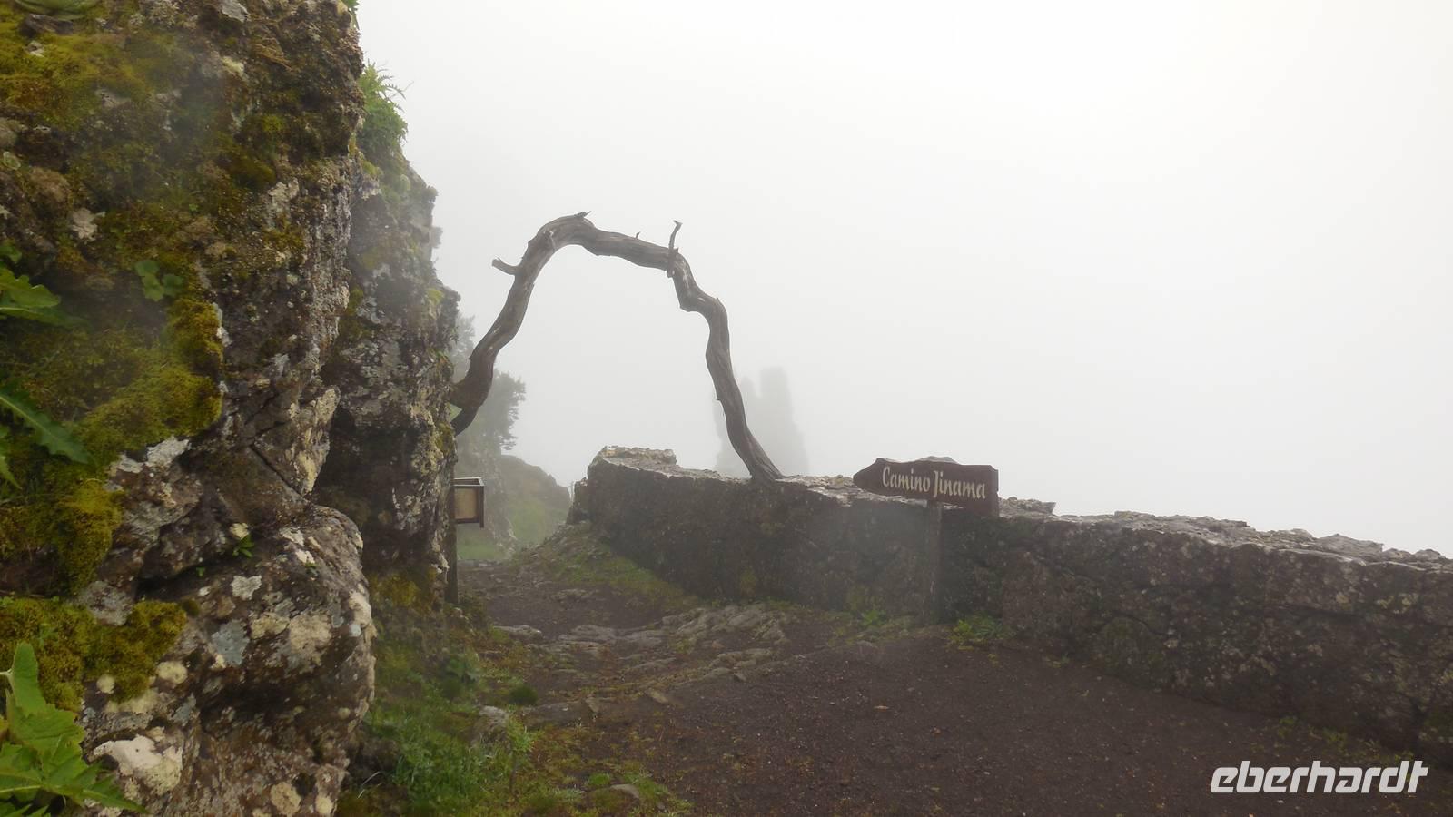 El Mocanal ist von dicken Nebelschwaden umgeben und die Straßen sind nass vom gewöhnlichen nächtlichen Regen. Nach einem leckeren Frühstück mit Dreimilchkäse und viel Obst, werden wir von Ralf empfangen und fahren durch den dichten Nebel zum Mirador de Jinama in 1200 Meter Höhe. Mirador, bedeutet auf spanisch Aussichtspunkt. Bei diesem für El Hierro nicht ungewöhnlichen, feucht-nebligen Morgen, sehen wir jedoch gerade mal die Hand vor Augen. Daher verweilen wir hier nicht lange und machen uns auf den Weg durch die Hochweiden nach San Andres. Diese Weiden erinnern an Irlands und Schottlands grüne Ebenen. Feuchte und saftig, grüne Wiesen werden hier von Mauern aus Lavabrocken geteilt. Hier ist Vorsicht geboten, denn die vielen Steine der Straßen sind glitschig und wer nicht aufpasst, kann schnell einmal ausrutschen. Tiefe Ruhe umfängt das Tal, hier fühlen wir uns wirklich etwas wie am Ende der Welt. Im Nieselregen bleibt keiner trocken, doch merkwürdigerweise ist es trotzdem nicht sehr kalt. Schließlich erreichen wir das kleine Städtchen San Andres, wo wir in einer Bar zum Trocknen einkehren. Während wir uns einen traditionellen Barraquito mit Gofiokuchen schmecken lassen, gibt Ralf eine Märchenstunde und liest uns die Legende von der schönen Tochter des Oberhauptes von Guarazoca und dem Regenbaum vor. Der Regenbaum spielte auf der trinkwasserarmen Insel eine besonders wichtige Rolle.