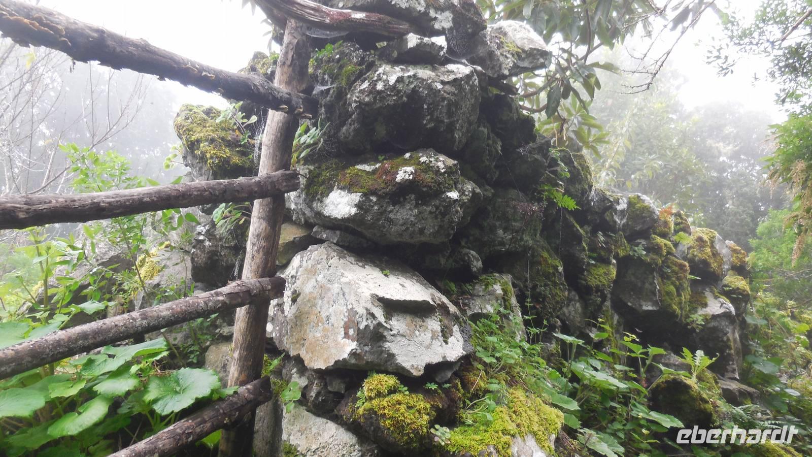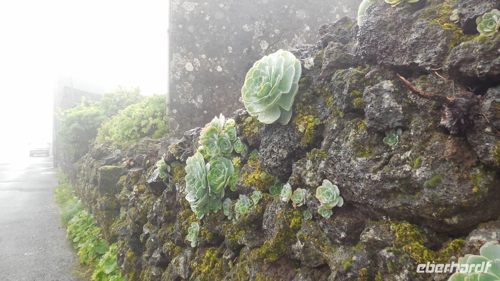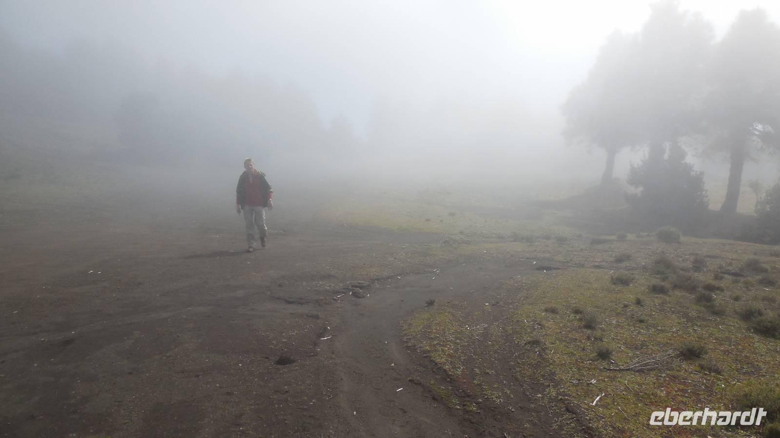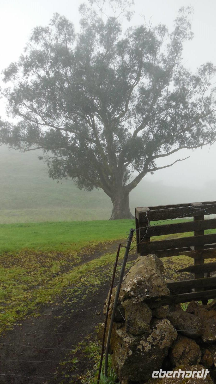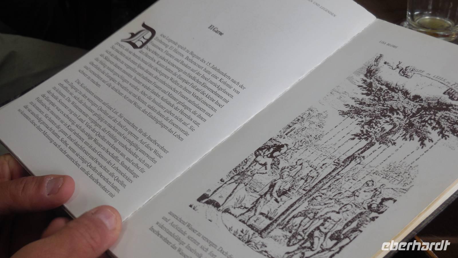El Mocanal ist von dicken Nebelschwaden umgeben und die Straßen sind nass vom gewöhnlichen nächtlichen Regen. Nach einem leckeren Frühstück mit Dreimilchkäse und viel Obst, werden wir von Ralf empfangen und fahren durch den dichten Nebel zum Mirador de Jinama in 1200 Meter Höhe. Mirador, bedeutet auf spanisch Aussichtspunkt. Bei diesem für El Hierro nicht ungewöhnlichen, feucht-nebligen Morgen, sehen wir jedoch gerade mal die Hand vor Augen. Daher verweilen wir hier nicht lange und machen uns auf den Weg durch die Hochweiden nach San Andres. Diese Weiden erinnern an Irlands und Schottlands grüne Ebenen. Feuchte und saftig, grüne Wiesen werden hier von Mauern aus Lavabrocken geteilt. Hier ist Vorsicht geboten, denn die vielen Steine der Straßen sind glitschig und wer nicht aufpasst, kann schnell einmal ausrutschen. Tiefe Ruhe umfängt das Tal, hier fühlen wir uns wirklich etwas wie am Ende der Welt. Im Nieselregen bleibt keiner trocken, doch merkwürdigerweise ist es trotzdem nicht sehr kalt. Schließlich erreichen wir das kleine Städtchen San Andres, wo wir in einer Bar zum Trocknen einkehren. Während wir uns einen traditionellen Barraquito mit Gofiokuchen schmecken lassen, gibt Ralf eine Märchenstunde und liest uns die Legende von der schönen Tochter des Oberhauptes von Guarazoca und dem Regenbaum vor. Der Regenbaum spielte auf der trinkwasserarmen Insel eine besonders wichtige Rolle.
