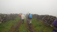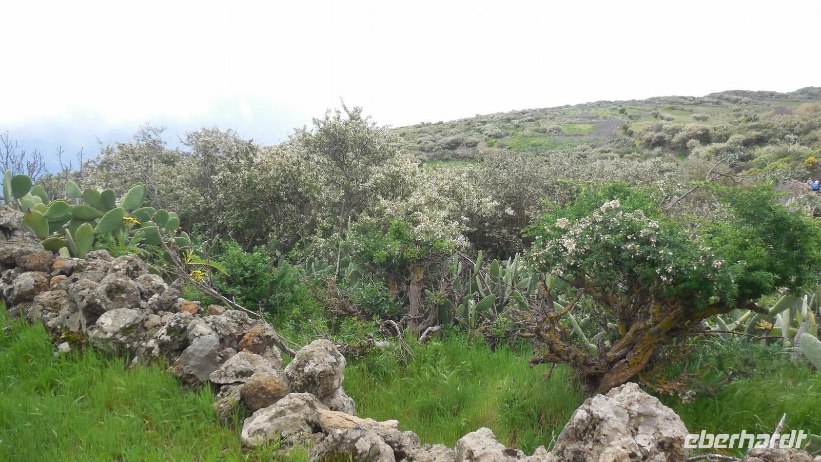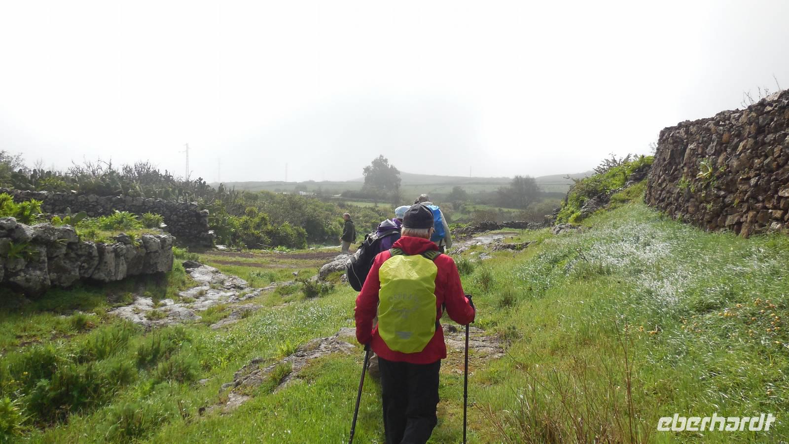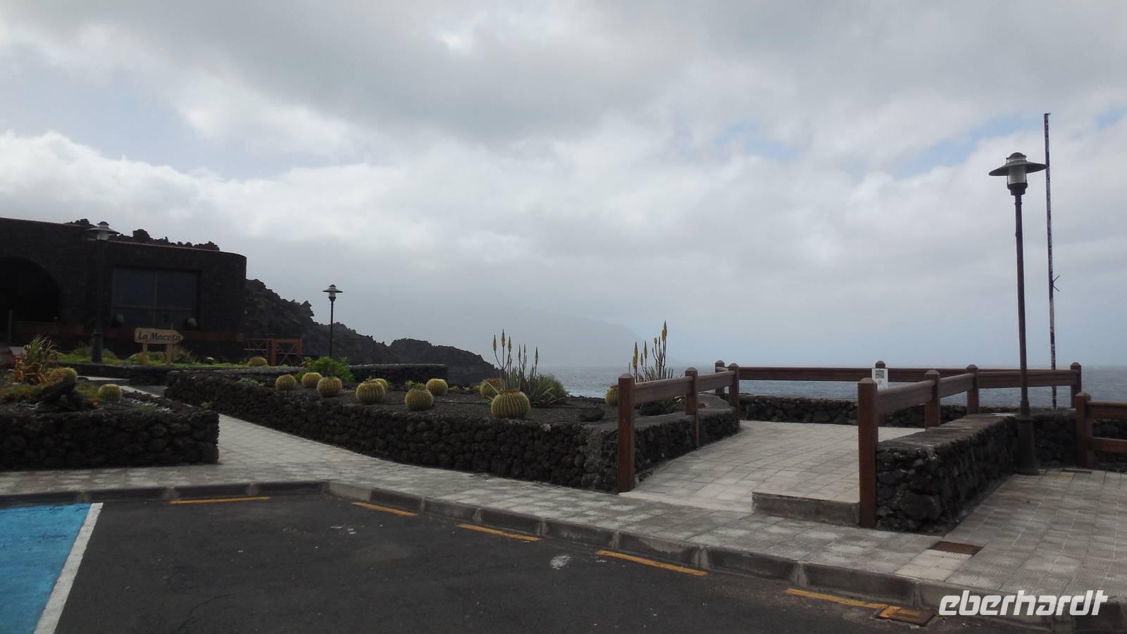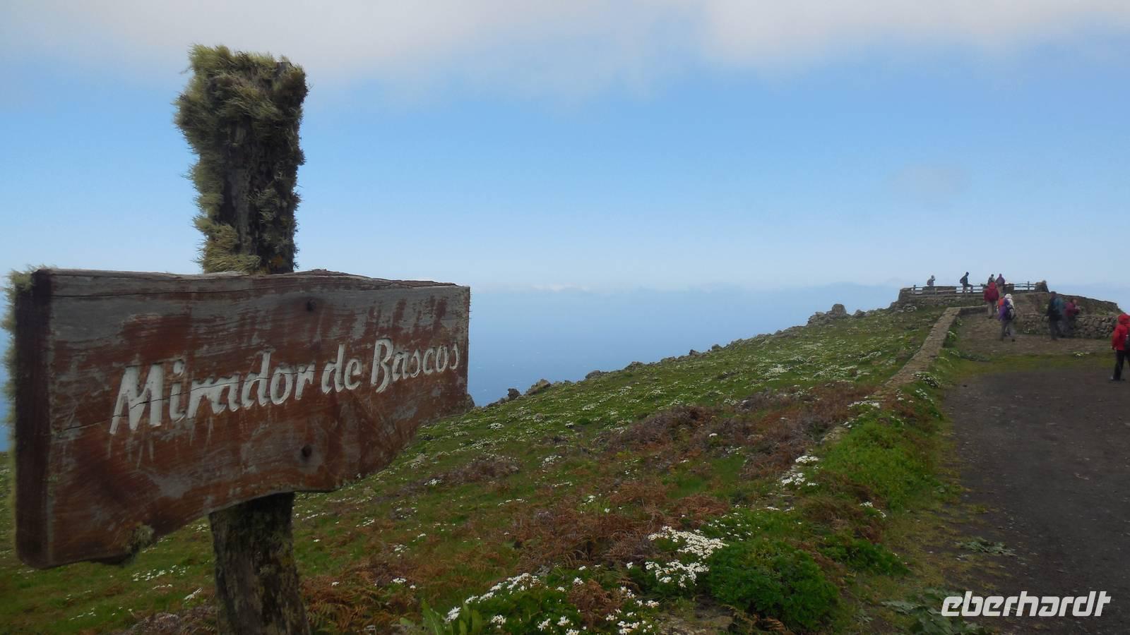 El Mocanal ist von dicken Nebelschwaden umgeben und die Straßen sind nass vom gewöhnlichen nächtlichen Regen. Nach einem leckeren Frühstück mit Dreimilchkäse und viel Obst, werden wir von Ralf empfangen und fahren durch den dichten Nebel zum Mirador de Jinama in 1200 Meter Höhe. Mirador, bedeutet auf spanisch Aussichtspunkt. Bei diesem für El Hierro nicht ungewöhnlichen, feucht-nebligen Morgen, sehen wir jedoch gerade mal die Hand vor Augen. Daher verweilen wir hier nicht lange und machen uns auf den Weg durch die Hochweiden nach San Andres. Diese Weiden erinnern an Irlands und Schottlands grüne Ebenen. Feuchte und saftig, grüne Wiesen werden hier von Mauern aus Lavabrocken geteilt. Hier ist Vorsicht geboten, denn die vielen Steine der Straßen sind glitschig und wer nicht aufpasst, kann schnell einmal ausrutschen. Tiefe Ruhe umfängt das Tal, hier fühlen wir uns wirklich etwas wie am Ende der Welt. Im Nieselregen bleibt keiner trocken, doch merkwürdigerweise ist es trotzdem nicht sehr kalt. Schließlich erreichen wir das kleine Städtchen San Andres, wo wir in einer Bar zum Trocknen einkehren. Während wir uns einen traditionellen Barraquito mit Gofiokuchen schmecken lassen, gibt Ralf eine Märchenstunde und liest uns die Legende von der schönen Tochter des Oberhauptes von Guarazoca und dem Regenbaum vor. Der Regenbaum spielte auf der trinkwasserarmen Insel eine besonders wichtige Rolle.