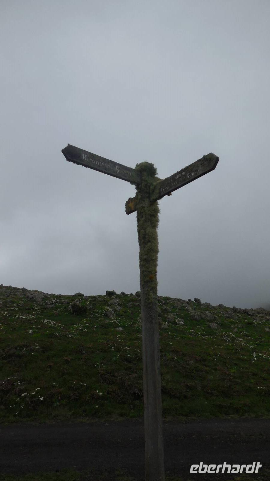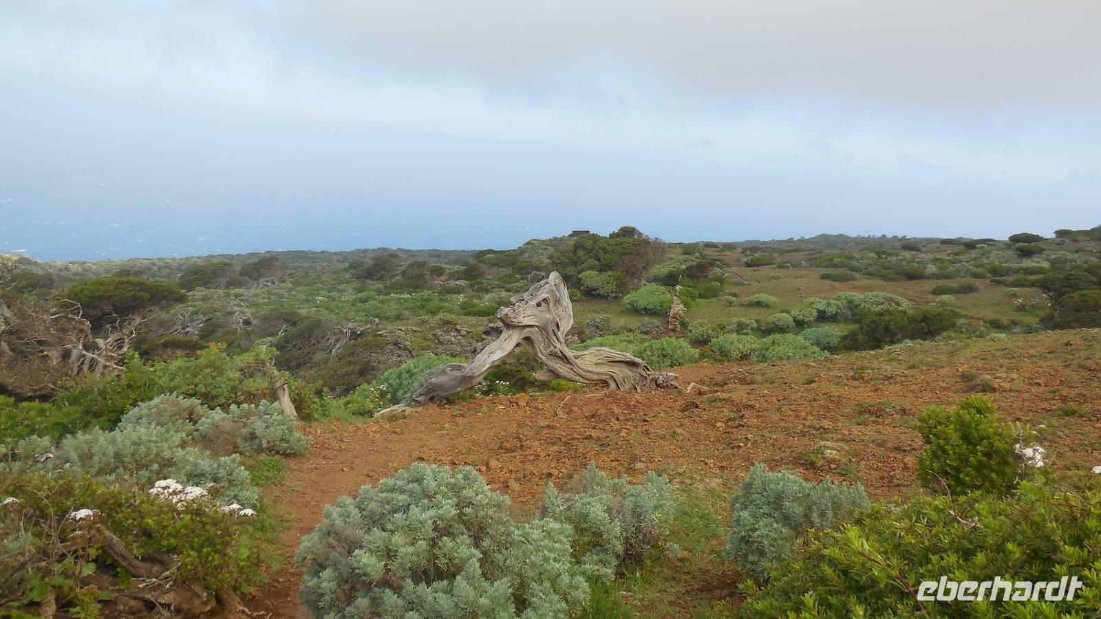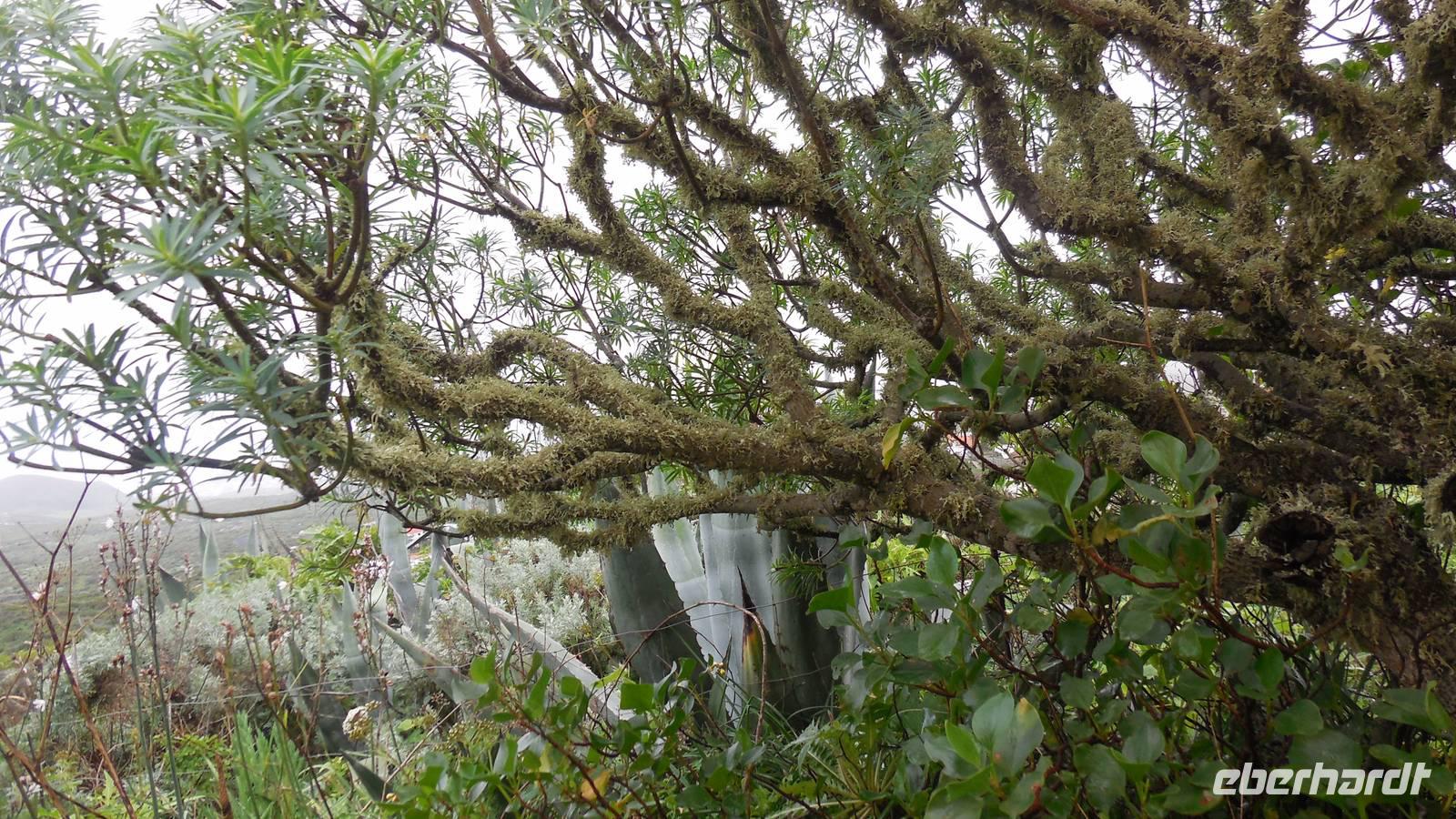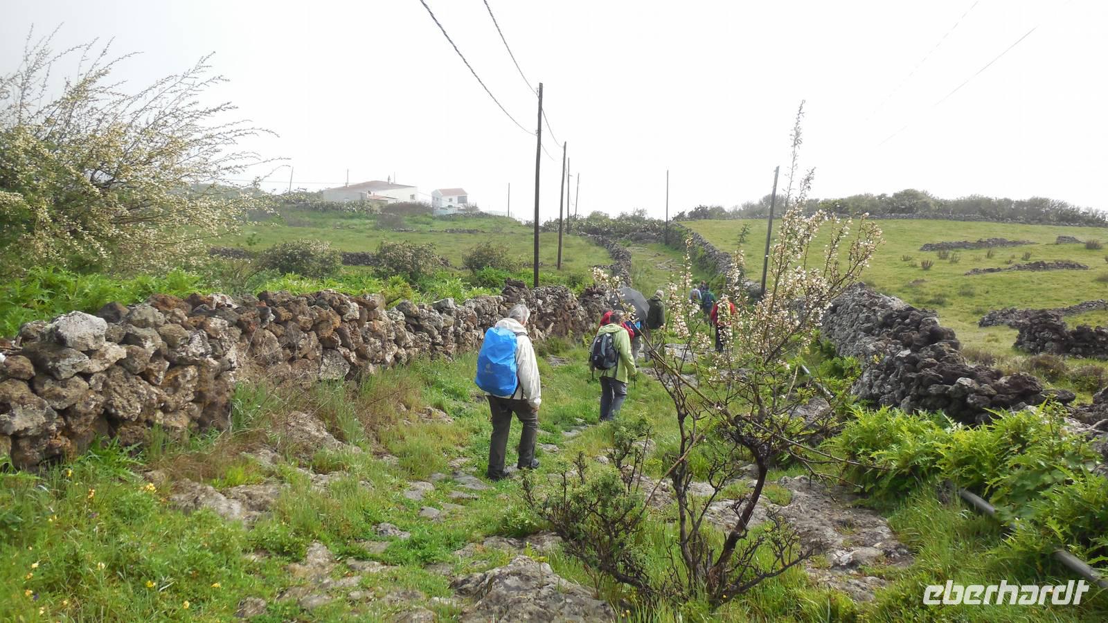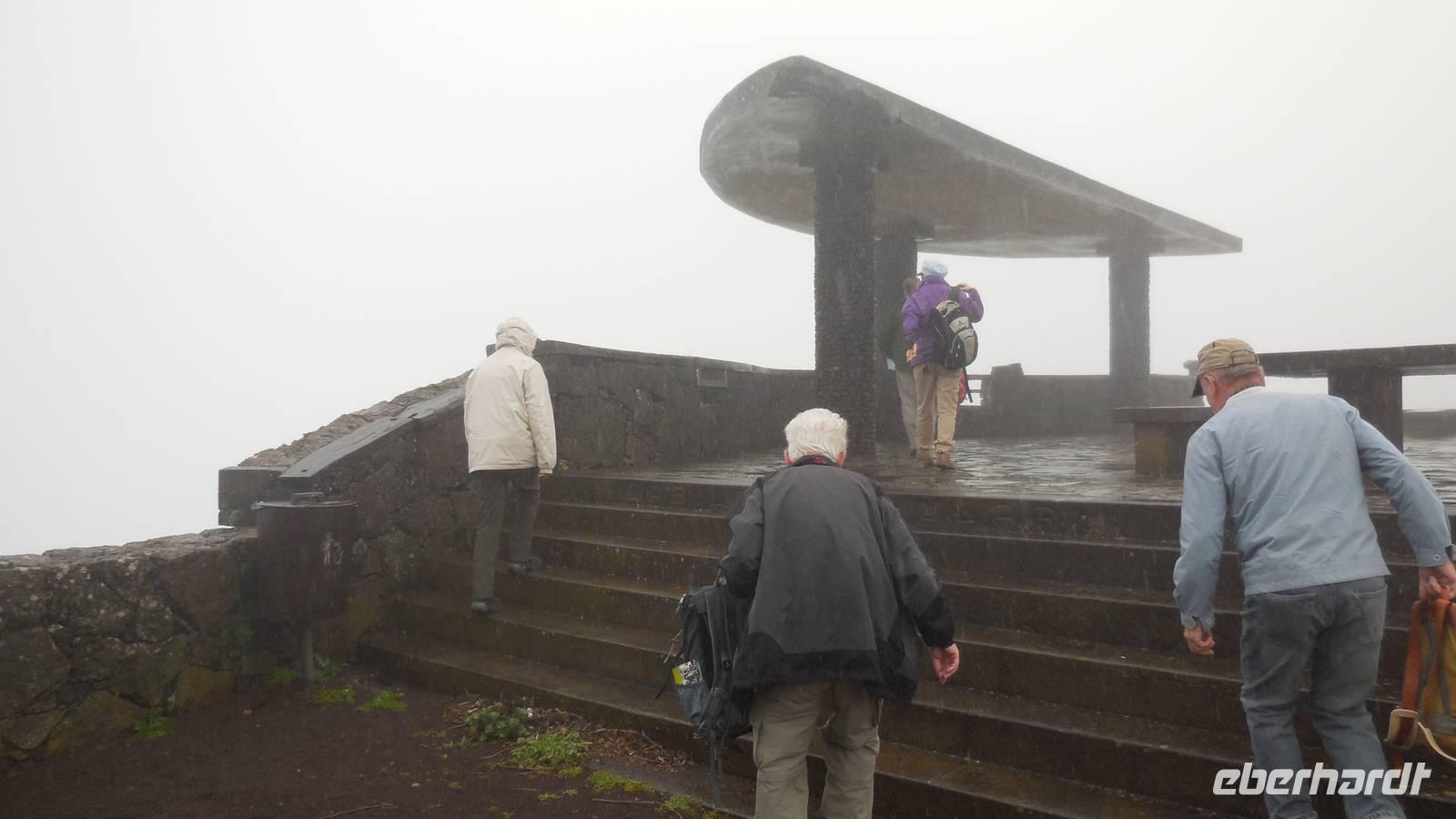 El Mocanal ist von dicken Nebelschwaden umgeben und die Straßen sind nass vom gewöhnlichen nächtlichen Regen. Nach einem leckeren Frühstück mit Dreimilchkäse und viel Obst, werden wir von Ralf empfangen und fahren durch den dichten Nebel zum Mirador de Jinama in 1200 Meter Höhe. Mirador, bedeutet auf spanisch Aussichtspunkt. Bei diesem für El Hierro nicht ungewöhnlichen, feucht-nebligen Morgen, sehen wir jedoch gerade mal die Hand vor Augen. Daher verweilen wir hier nicht lange und machen uns auf den Weg durch die Hochweiden nach San Andres. Diese Weiden erinnern an Irlands und Schottlands grüne Ebenen. Feuchte und saftig, grüne Wiesen werden hier von Mauern aus Lavabrocken geteilt. Hier ist Vorsicht geboten, denn die vielen Steine der Straßen sind glitschig und wer nicht aufpasst, kann schnell einmal ausrutschen. Tiefe Ruhe umfängt das Tal, hier fühlen wir uns wirklich etwas wie am Ende der Welt. Im Nieselregen bleibt keiner trocken, doch merkwürdigerweise ist es trotzdem nicht sehr kalt. Schließlich erreichen wir das kleine Städtchen San Andres, wo wir in einer Bar zum Trocknen einkehren. Während wir uns einen traditionellen Barraquito mit Gofiokuchen schmecken lassen, gibt Ralf eine Märchenstunde und liest uns die Legende von der schönen Tochter des Oberhauptes von Guarazoca und dem Regenbaum vor. Der Regenbaum spielte auf der trinkwasserarmen Insel eine besonders wichtige Rolle.