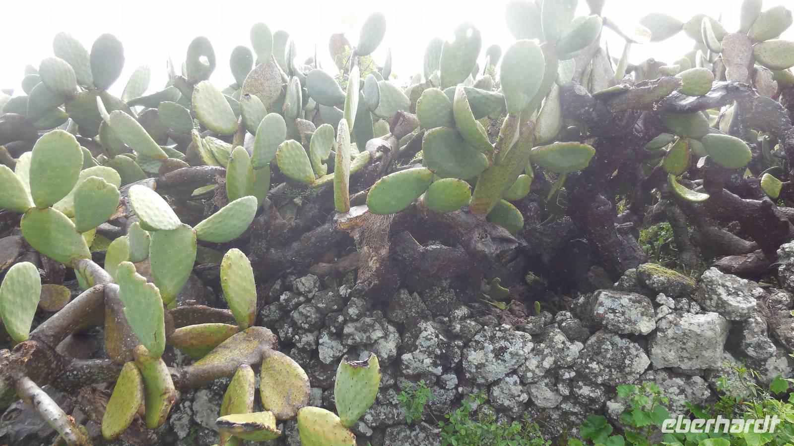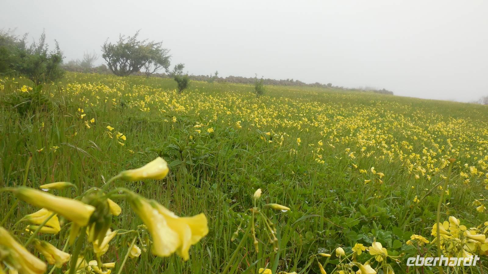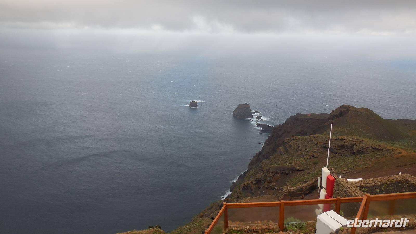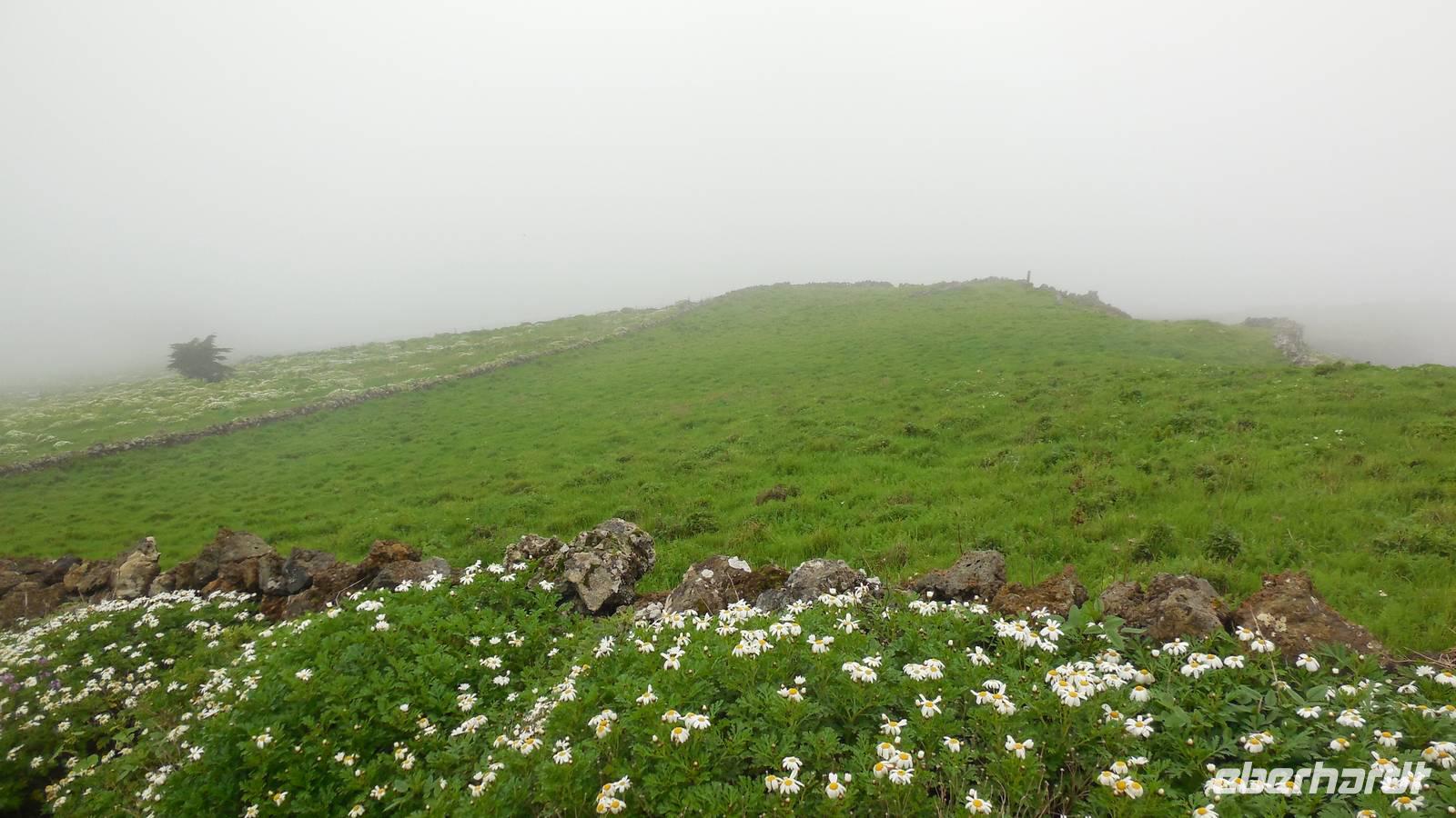 El Mocanal ist von dicken Nebelschwaden umgeben und die Straßen sind nass vom gewöhnlichen nächtlichen Regen. Nach einem leckeren Frühstück mit Dreimilchkäse und viel Obst, werden wir von Ralf empfangen und fahren durch den dichten Nebel zum Mirador de Jinama in 1200 Meter Höhe. Mirador, bedeutet auf spanisch Aussichtspunkt. Bei diesem für El Hierro nicht ungewöhnlichen, feucht-nebligen Morgen, sehen wir jedoch gerade mal die Hand vor Augen. Daher verweilen wir hier nicht lange und machen uns auf den Weg durch die Hochweiden nach San Andres. Diese Weiden erinnern an Irlands und Schottlands grüne Ebenen. Feuchte und saftig, grüne Wiesen werden hier von Mauern aus Lavabrocken geteilt. Hier ist Vorsicht geboten, denn die vielen Steine der Straßen sind glitschig und wer nicht aufpasst, kann schnell einmal ausrutschen. Tiefe Ruhe umfängt das Tal, hier fühlen wir uns wirklich etwas wie am Ende der Welt. Im Nieselregen bleibt keiner trocken, doch merkwürdigerweise ist es trotzdem nicht sehr kalt. Schließlich erreichen wir das kleine Städtchen San Andres, wo wir in einer Bar zum Trocknen einkehren. Während wir uns einen traditionellen Barraquito mit Gofiokuchen schmecken lassen, gibt Ralf eine Märchenstunde und liest uns die Legende von der schönen Tochter des Oberhauptes von Guarazoca und dem Regenbaum vor. Der Regenbaum spielte auf der trinkwasserarmen Insel eine besonders wichtige Rolle.