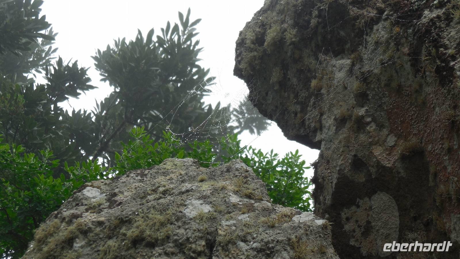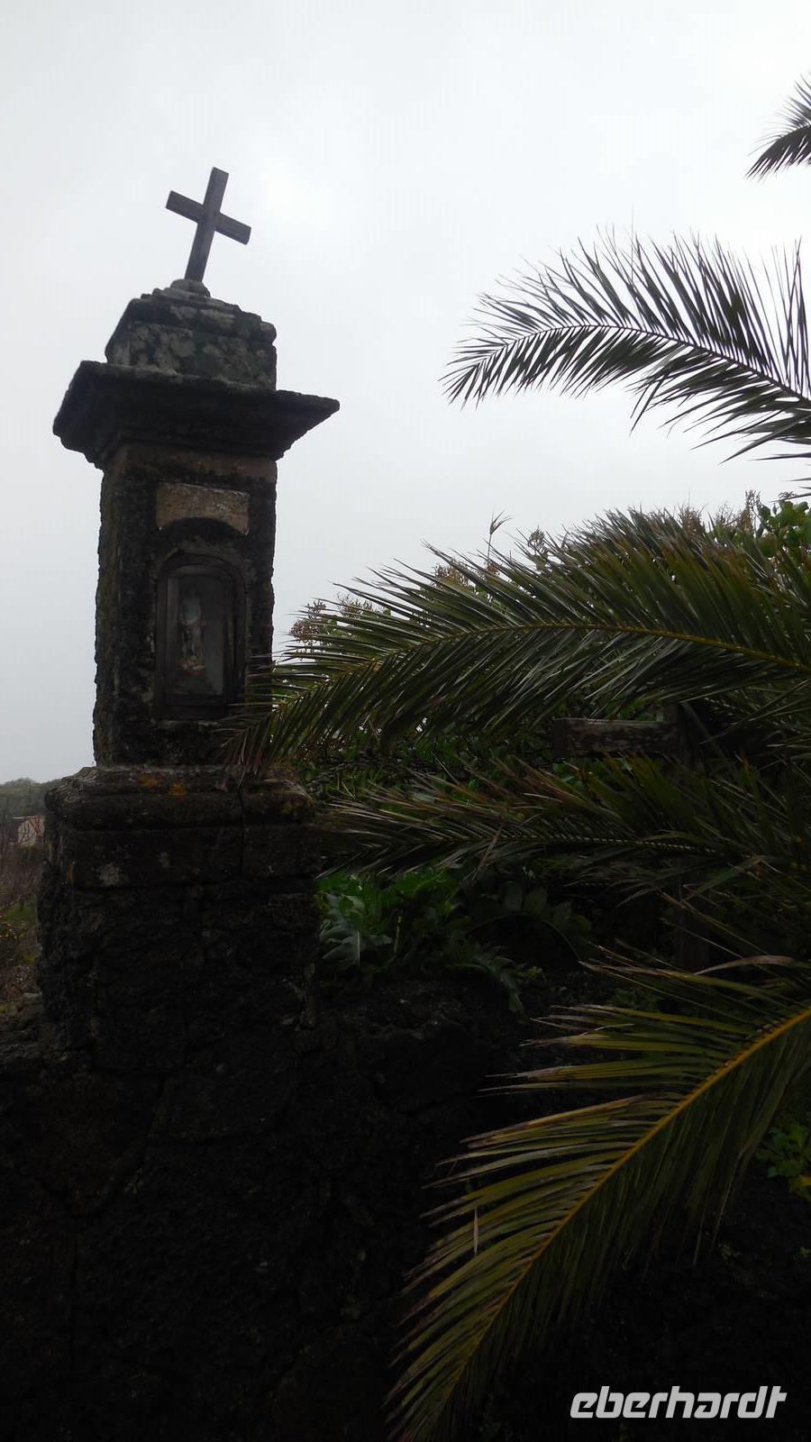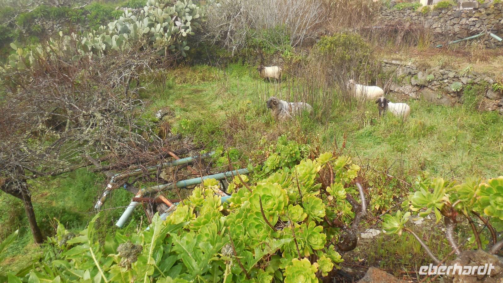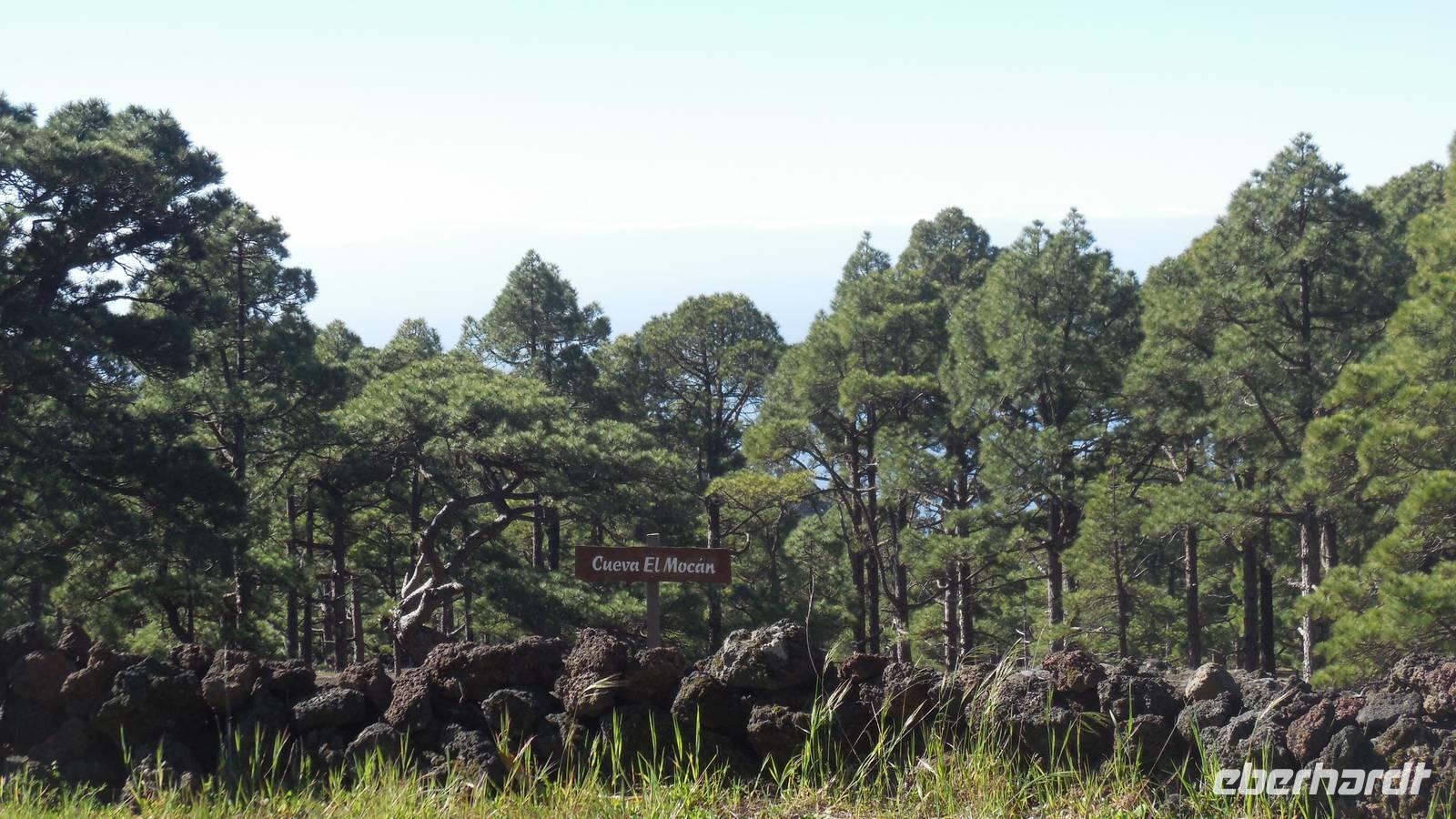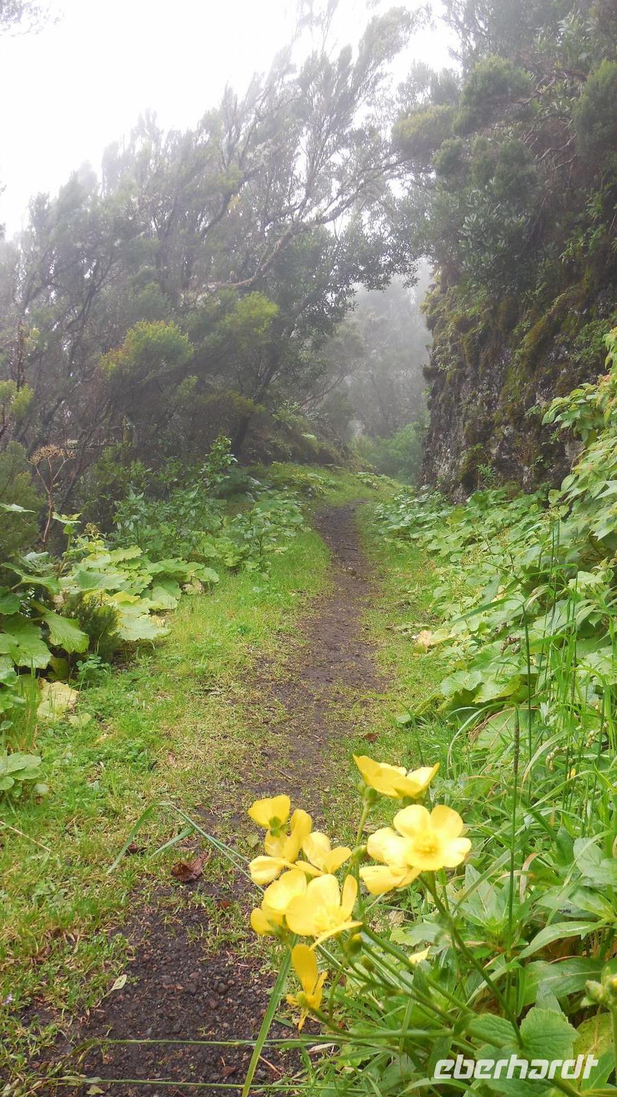 El Mocanal ist von dicken Nebelschwaden umgeben und die Straßen sind nass vom gewöhnlichen nächtlichen Regen. Nach einem leckeren Frühstück mit Dreimilchkäse und viel Obst, werden wir von Ralf empfangen und fahren durch den dichten Nebel zum Mirador de Jinama in 1200 Meter Höhe. Mirador, bedeutet auf spanisch Aussichtspunkt. Bei diesem für El Hierro nicht ungewöhnlichen, feucht-nebligen Morgen, sehen wir jedoch gerade mal die Hand vor Augen. Daher verweilen wir hier nicht lange und machen uns auf den Weg durch die Hochweiden nach San Andres. Diese Weiden erinnern an Irlands und Schottlands grüne Ebenen. Feuchte und saftig, grüne Wiesen werden hier von Mauern aus Lavabrocken geteilt. Hier ist Vorsicht geboten, denn die vielen Steine der Straßen sind glitschig und wer nicht aufpasst, kann schnell einmal ausrutschen. Tiefe Ruhe umfängt das Tal, hier fühlen wir uns wirklich etwas wie am Ende der Welt. Im Nieselregen bleibt keiner trocken, doch merkwürdigerweise ist es trotzdem nicht sehr kalt. Schließlich erreichen wir das kleine Städtchen San Andres, wo wir in einer Bar zum Trocknen einkehren. Während wir uns einen traditionellen Barraquito mit Gofiokuchen schmecken lassen, gibt Ralf eine Märchenstunde und liest uns die Legende von der schönen Tochter des Oberhauptes von Guarazoca und dem Regenbaum vor. Der Regenbaum spielte auf der trinkwasserarmen Insel eine besonders wichtige Rolle.