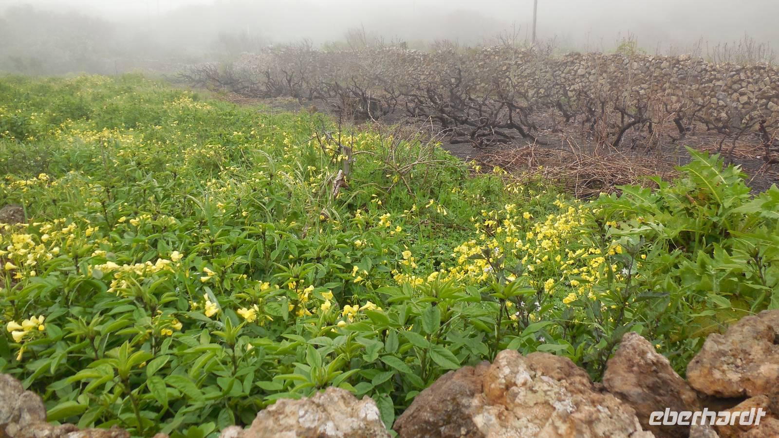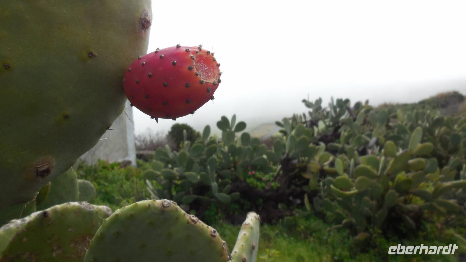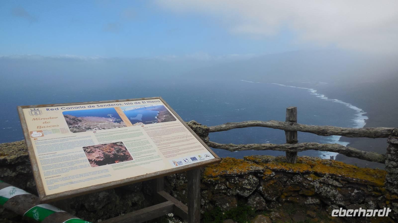 Da sich das Wetter nicht wirklich geändert hat, entscheiden wir die für heute geplante Tour etwas abzuändern und wandern weiter gen Ostküste, anstatt weiter durch die Hochweiden. Hier erhoffen wir uns Sonnenstrahlen. Unterwegs legen wir im Dörfchen La Cuesta eine Pause ein, wo wir frische Maracuja auch Ralf's Garten kosten - lecker und erfrischend! Dann klärt der Himmel tatsächlich auf und wir wandern auf den Küstenwiesen zwischen Gingster, Kakteen und Kanarenkrokussen bei Blick auf das endlose Meer gen Aussichtspunkt Isora. In einem der kleinen Dörfchen kennt Ralf eine alte Dame, die noch auf alte Art mitunter mit Webstuhl und Spindel Teppiche und Hirtentaschen webt. Sie zeigt uns ihre Werke und erklärt uns ihre Werkzeuge. Am Mirador de Isora legen wir, auf tausend Meter Höhe und bei tollen Blick auf die Ostküste mit den Felsen im Meer, wieder eine Pause ein. Wir genießen die Sonnenstrahlen und verkosten diesmal einen typisch kanarischen Ron Miel - bester, kanarischer Honigrum! Gerade als wir aufbrechen, zieht wieder Nebel über den Hang und wenige Augenblicke später, sehen wir wieder nur eine dichte Nebelwand. Wir ziehen weiter gen Isora, wo wir mit dem öffentlichen Bus zur Kaffeepause fahren wollen. Da wir noch auf den Bus warten müssen, schauen wir uns das Ökologiemuseum von El Hierro an. Hier sehen wir zum Beispiel einen Film über die Energiegewinnung auf der Insel und einen über den unterirdischen Vulkanausbruch im Meer im Jahre 2011 an. Wenig später kommt der Bus, ein kleiner 17-Sitzer, doch wir passen mit den übrigen Passagieren alle irgendwie rein. Am Mirador La Pena, einem bekannten Kunstwerk von Cesar Manrique empfängt uns wieder dichter Nebel, der uns leider nicht mal die Kontur einer Landschaft erahnen lässt. Daher entspannen wir bei einer Tasse Kaffee und probieren den bekannten Käsekuchen (Quesadilla) der Insel, ebenso Kürbiskuchen und andere Leckereien. Dann heißt es noch etwas Sport treiben, denn wir haben noch ein Stündchen Gehzeit bis zum Hotel vor uns. Nach wenigen Metern Abstieg durchbrechen wir die Wolkendecke, vor uns liegt das schöne Tal und wir haben wieder Blick auf das blaue Meer. Am frühen Abend erreichen wir unser Hotel, wo wir zum Abendessen heute richtig verwöhnt werden: geräuchterter Ziegenkäse, Thunfischfilet und ein Schokodessert. Selten hat man solch ein riesiges Thunfischfilet gesehen, den enormen Fisch können wir schon förmlich vor uns sehen. Nach einem lustigen Abend gehen wir müde ins Bett. Heute haben wir wirklich eine weite Strecke zurückgelegt und dürfen uns auf die Schulter klopfen.