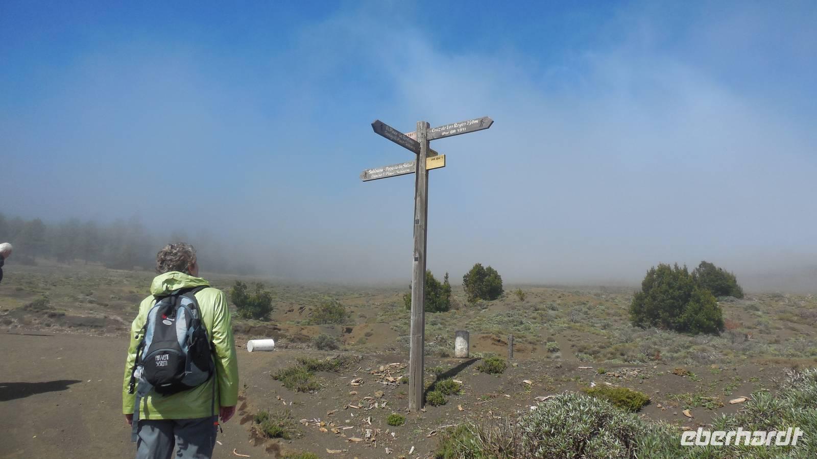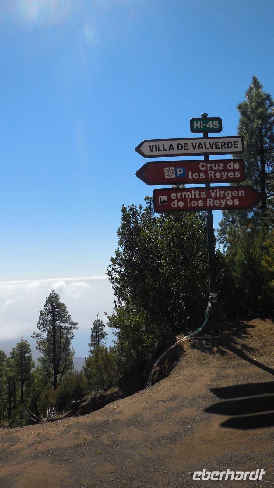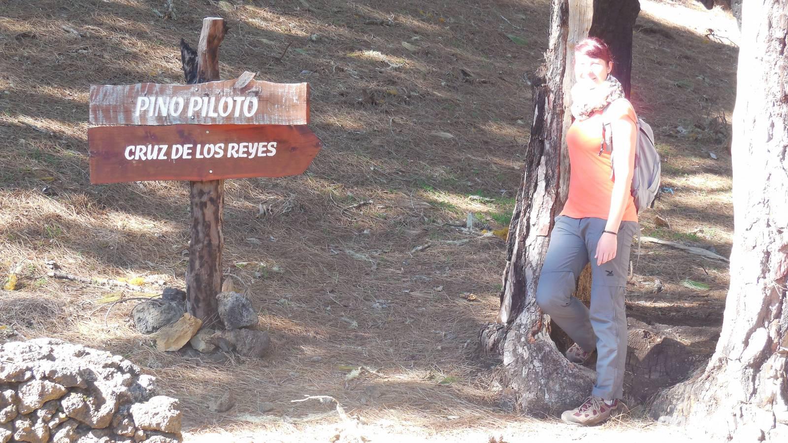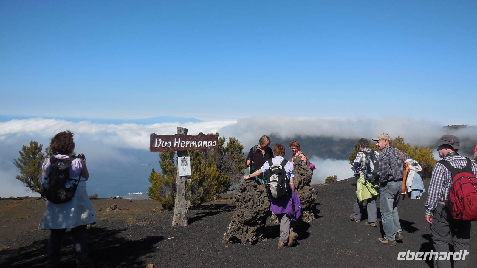 Bei gewohnten Morgennebel verlassen wir Mocanal und begeben uns auf die Südseite der Insel. Zwischendurch halten wir nochmals bei Cesar Manriques Aussichtspunkt La Pena - heute mit relativ guter Sicht auf El Golfo. Dann schlängelt sich unser Weg weiter den Berg hinauf. Sonne empfängt uns mit einem unglaublich strahlend blauen Himmel. Das hebt die Laune bemerkbar. Am höchstgelegenen Grill- und Campingplatz der Insel, der Hoja de Mocillo, starten wir unseren Weg zum Gipfel Malpaso in 1501 Meter Höhe. Wir wandern durch Kiefernwälder und genießen dabei die wärmenden Sonnenstrahlen. An einem Steinkreis verweilen wir. Ralf lässt uns mitgebrachten Käsekuchen aus dem leckeren 3-Milch-Käse der Insel kosten. Der Steinkreis bei der Cueva el Mocán birgt eigenartigerweise kein mystisches Geheimnis, hier befand sich früher nur ein Dreschplatz. Beim Blick auf den in 1330 Metern Höhe gelegenen Wachturm, erklärt uns Ralf das immens wichtige Frühwarnsystem der Insel. Im Sommer wird es hier gefährlich heiß und in den Kieferwäldern brennt es oft. Die kanarische Kiefer kann sich bis zu 45 Minuten im Feuer selbst schützen, erfahren wir. Beim Weitergehen verwandelt sich die Landschaft. Überall sehen wir jetzt viel Baumerika. Wir wandern nun durch einen Nebelwald, in dem sich eine versteckte Wasserquelle befindet. Hier legen wir eine kurze Pause ein und gelangen dann wieder auf eine Piste mit Vulkangestein. Auf dem Prozessionsweg Camino de la Virgen geht es weiter. Ein Schild vor uns zeigt nach Binto. In diesem Ort aus, so erzählt man, kann man aller 40 Jahre eine mysteriöse achte Insel sehen: San Borondón. Die Geschichte zu dieser Insel, zu der es sogar Augenzeugenberichte gibt, erfährt man jedoch nur vor Ort. ;) Am frühen Nachmittag erreichen wir nach einer Wanderung mit vielen tollen Ausblicken endlich den Malpaso auf 1500 Metern Höhe. Hier bietet sich uns bei einer Pause ein herrlicher Blick auf die vorgelagerten Inseln La Palma und Teneriffa. Oben wärmt die Sonne ordentlich, endlich - dieses Kaiserwetter haben wir uns jetzt redlich verdient. Anschließend geht es den Berg wieder hinab bis zum großen Kreuz Cruz de los Reyes, wo wir den nächsten Stopp einlegen. An dieser Stelle wird bei der großen Prozession immer die Mittagsmesse gehalten und die Frauen rutschen auf nackten Knien den Berg hinauf. Bevor wir um 16.30 Uhr wieder am Grillplatz ankommen, durchwandern wir nochmals Lavafelder, einen großen Kiefernwald und stoppen auch an der Stelle mit dem Stein der zwei Schwestern (Dos hermanas). Bei tollem Blick auf La Palma und El Golfo lassen sich hier bei den „dos hermanas" viele Gleitfallschirmspringer ins Tal hinabfallen. Am Abend werden wir mit Fischsuppe und einer gemischten, heimischen Fischplatte verwöhnt. Die Fähre konnte nach dem Sturm der vergangenen Tage endlich wieder anlegen und so gibt es wieder Fisch auf der Insel.