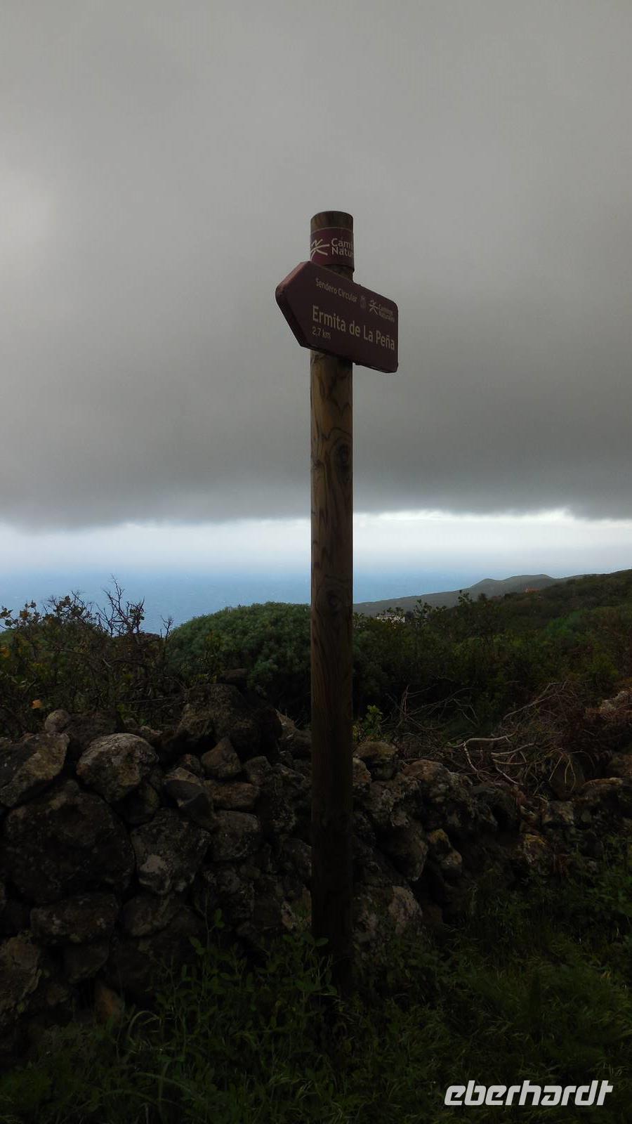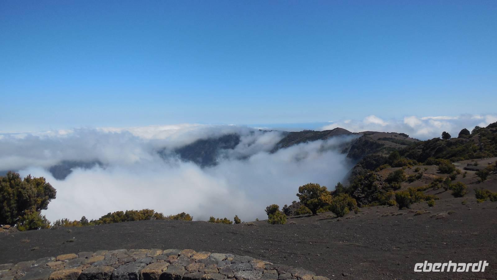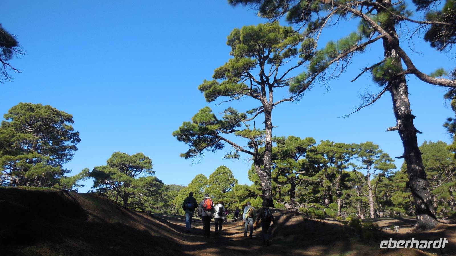 Bei gewohnten Morgennebel verlassen wir Mocanal und begeben uns auf die Südseite der Insel. Zwischendurch halten wir nochmals bei Cesar Manriques Aussichtspunkt La Pena - heute mit relativ guter Sicht auf El Golfo. Dann schlängelt sich unser Weg weiter den Berg hinauf. Sonne empfängt uns mit einem unglaublich strahlend blauen Himmel. Das hebt die Laune bemerkbar. Am höchstgelegenen Grill- und Campingplatz der Insel, der Hoja de Mocillo, starten wir unseren Weg zum Gipfel Malpaso in 1501 Meter Höhe. Wir wandern durch Kiefernwälder und genießen dabei die wärmenden Sonnenstrahlen. An einem Steinkreis verweilen wir. Ralf lässt uns mitgebrachten Käsekuchen aus dem leckeren 3-Milch-Käse der Insel kosten. Der Steinkreis bei der Cueva el Mocán birgt eigenartigerweise kein mystisches Geheimnis, hier befand sich früher nur ein Dreschplatz. Beim Blick auf den in 1330 Metern Höhe gelegenen Wachturm, erklärt uns Ralf das immens wichtige Frühwarnsystem der Insel. Im Sommer wird es hier gefährlich heiß und in den Kieferwäldern brennt es oft. Die kanarische Kiefer kann sich bis zu 45 Minuten im Feuer selbst schützen, erfahren wir. Beim Weitergehen verwandelt sich die Landschaft. Überall sehen wir jetzt viel Baumerika. Wir wandern nun durch einen Nebelwald, in dem sich eine versteckte Wasserquelle befindet. Hier legen wir eine kurze Pause ein und gelangen dann wieder auf eine Piste mit Vulkangestein. Auf dem Prozessionsweg Camino de la Virgen geht es weiter. Ein Schild vor uns zeigt nach Binto. In diesem Ort aus, so erzählt man, kann man aller 40 Jahre eine mysteriöse achte Insel sehen: San Borondón. Die Geschichte zu dieser Insel, zu der es sogar Augenzeugenberichte gibt, erfährt man jedoch nur vor Ort. ;) Am frühen Nachmittag erreichen wir nach einer Wanderung mit vielen tollen Ausblicken endlich den Malpaso auf 1500 Metern Höhe. Hier bietet sich uns bei einer Pause ein herrlicher Blick auf die vorgelagerten Inseln La Palma und Teneriffa. Oben wärmt die Sonne ordentlich, endlich - dieses Kaiserwetter haben wir uns jetzt redlich verdient. Anschließend geht es den Berg wieder hinab bis zum großen Kreuz Cruz de los Reyes, wo wir den nächsten Stopp einlegen. An dieser Stelle wird bei der großen Prozession immer die Mittagsmesse gehalten und die Frauen rutschen auf nackten Knien den Berg hinauf. Bevor wir um 16.30 Uhr wieder am Grillplatz ankommen, durchwandern wir nochmals Lavafelder, einen großen Kiefernwald und stoppen auch an der Stelle mit dem Stein der zwei Schwestern (Dos hermanas). Bei tollem Blick auf La Palma und El Golfo lassen sich hier bei den „dos hermanas" viele Gleitfallschirmspringer ins Tal hinabfallen. Am Abend werden wir mit Fischsuppe und einer gemischten, heimischen Fischplatte verwöhnt. Die Fähre konnte nach dem Sturm der vergangenen Tage endlich wieder anlegen und so gibt es wieder Fisch auf der Insel.