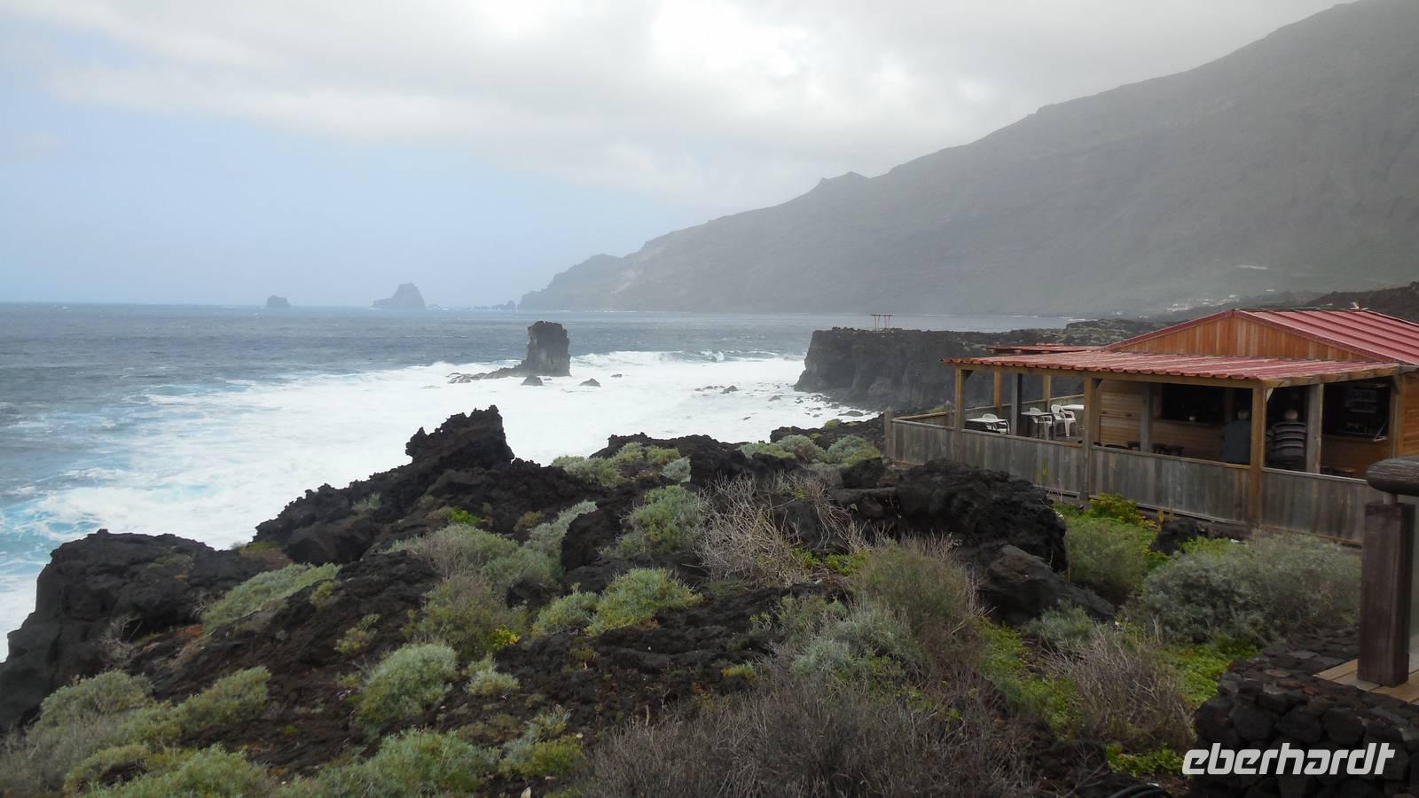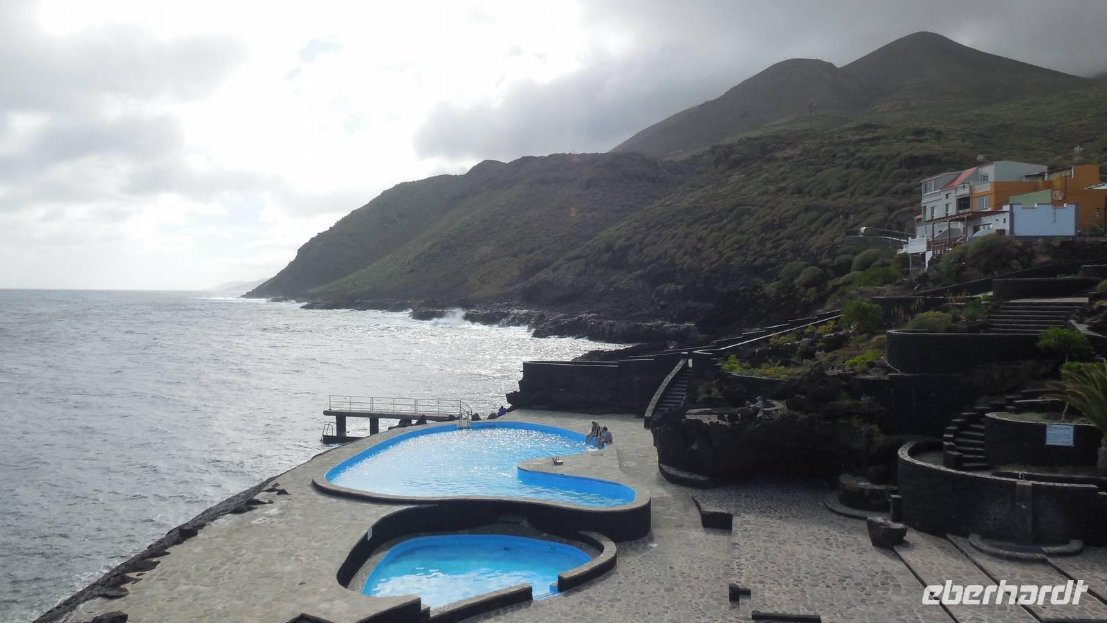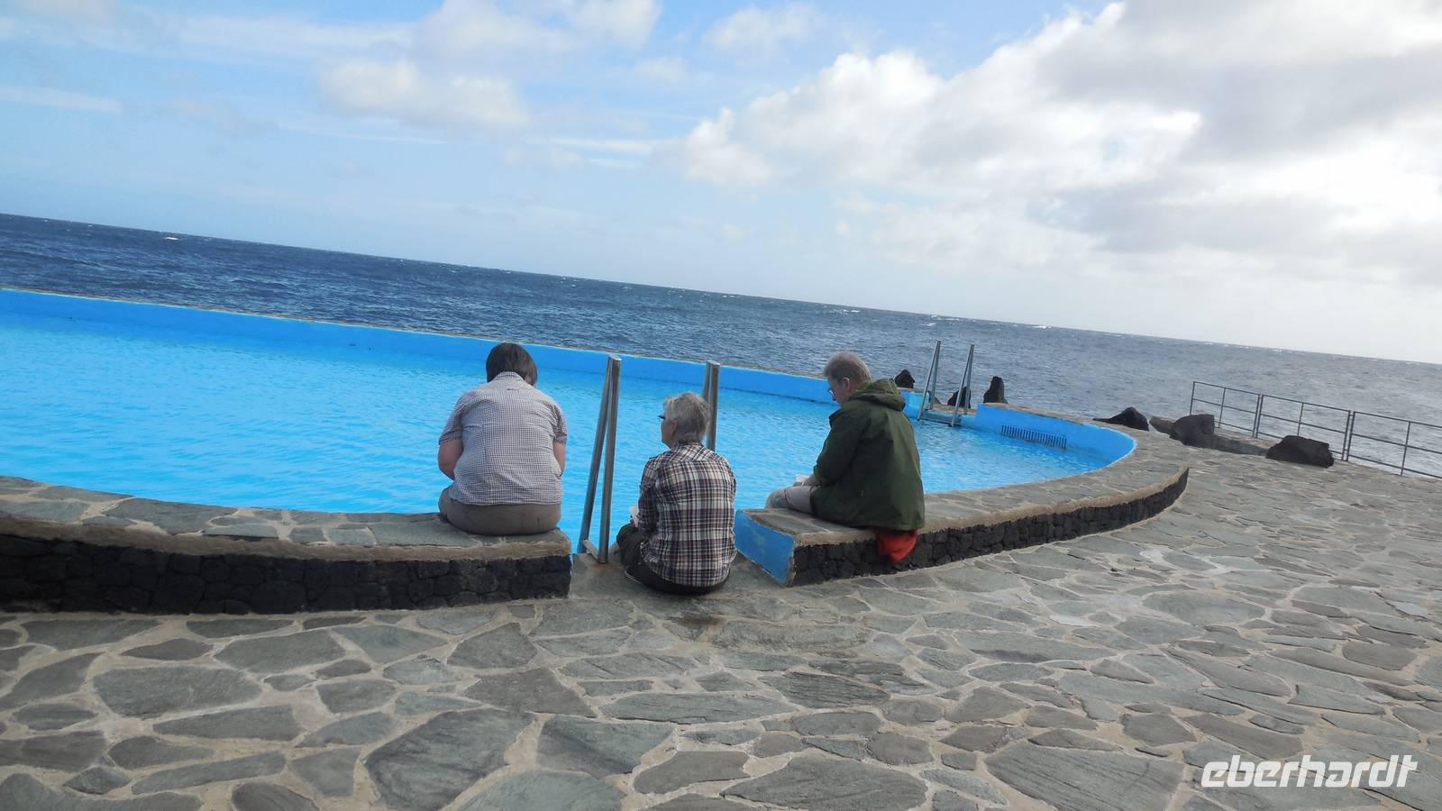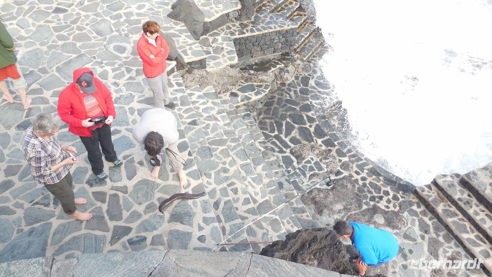 Gegen drei erreichen wir den Küstenort La Caleta und kehren in einer typisch kanarischen Bar ein, wo wir traditionelle Tapas kosten: Croquetas, Arepas, Sandwiches mit Avocado und natürlich die Papas arrugadas mit verschiedenen Mojosaußen. Nach einem herzhaften Mahl geht es weiter ans Ende des Dörfchens, zu den Meerwasserbädern.Obwohl der hellblaue Pool verlockend aussieht, geht von uns niemand ins Wasser, denn der Wind ist ziemlich stark. Bei schönstem Meerblick belohnen wir uns wieder mit einem Gläschen Ron Miel. Wir entspannen in der angenehm, warmen Sonne und lauschen einer neuen Legende, welche uns Ralf vorliest. Diese handelt von Untergang der Guanchen, ihrem letzten großen Kampf. Nebenan zeigt uns ein Fischer hocherfreut seine gefangene Muräne. Schließlich fahren wir zurück ins Hotel in Mocanal, wo wir zum Abend heute gemischten Paella essen und typischen Wein von El Hierro trinken.